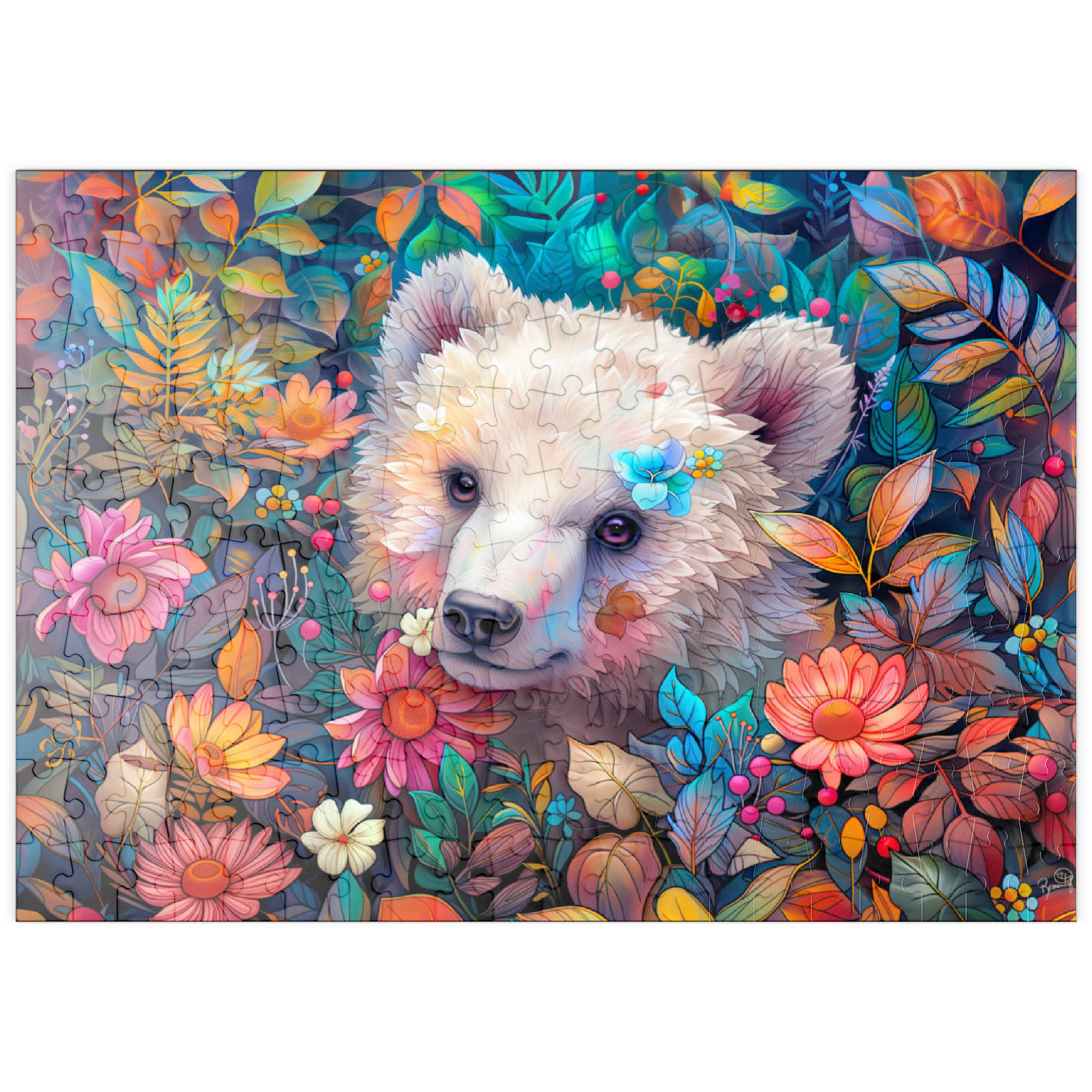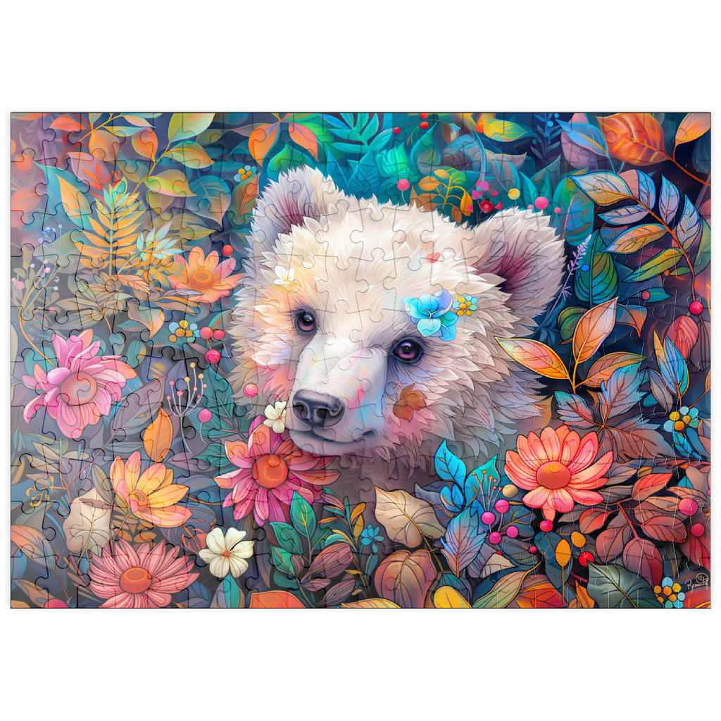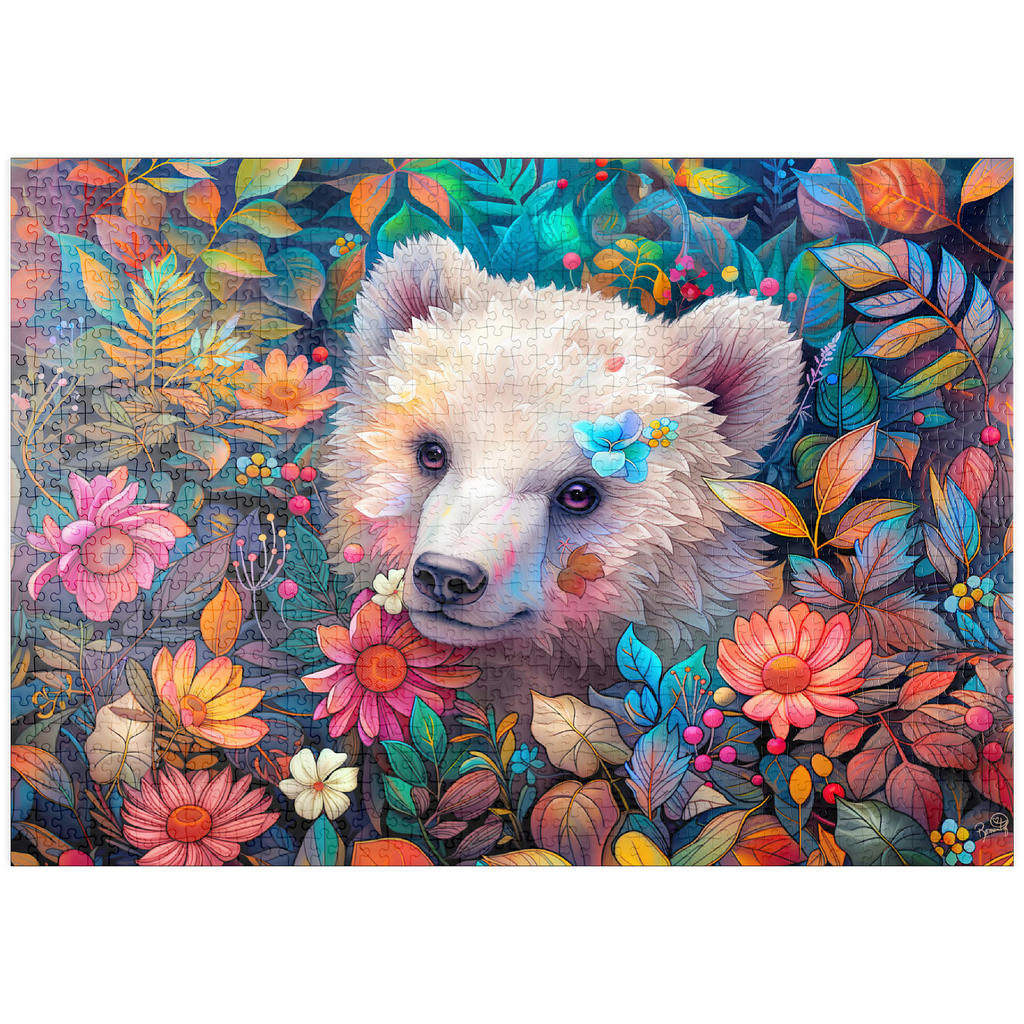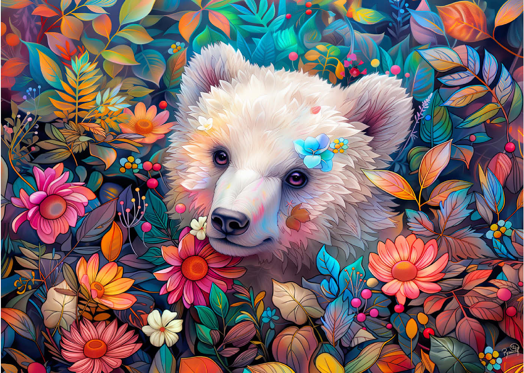 Ein bezauberndes digitales Kunstwerk, das ein entzückendes weißes Bärenjunges zeigt, das durch eine üppige Blumenlandschaft späht. Der sanfte Ausdruck und das weiche Fell des Jungtieres werden durch farbenfrohe Blüten und Blätter in Rosa-, Orange-, Gelb- und Blautönen hervorgehoben. Zarte Blumen stecken in seinem Fell und verleihen ihm einen verspielten Touch. Der satte, lebendige Hintergrund mit detaillierten Blättern, Beeren und Blütenblättern schafft eine magische Waldatmosphäre. Dieses bezaubernde Kunstwerk ist perfekt für Naturliebhaber, Tierfreunde und Fans von fantasievollen Tierporträts. Ideal als Wanddekoration, Dekoration für Kinderzimmer oder als Blickfang in jedem gemütlichen Raum.