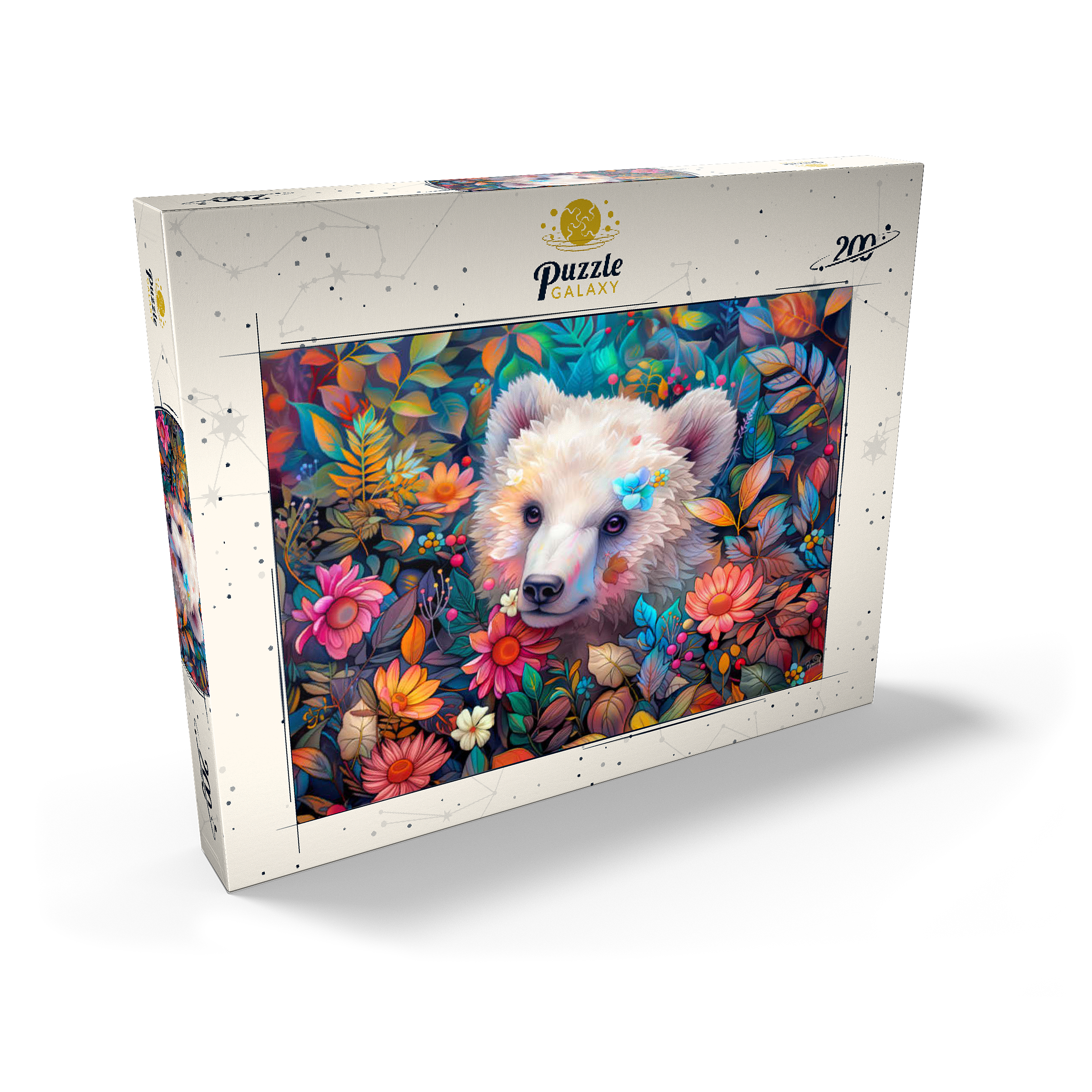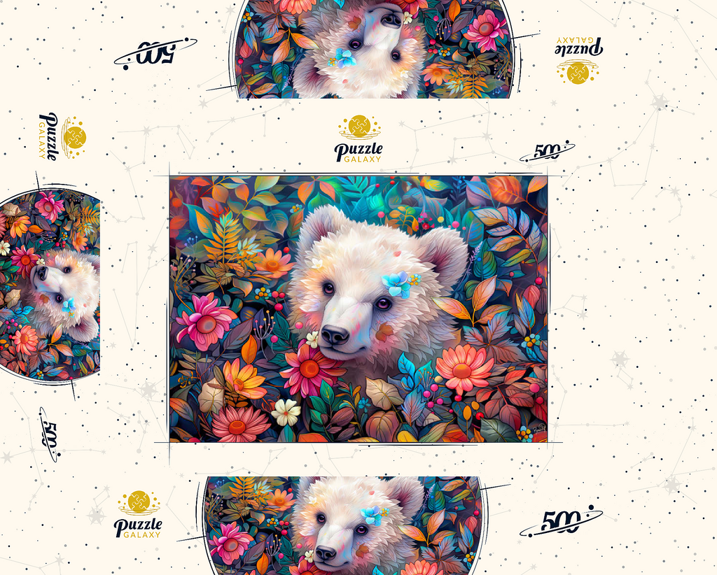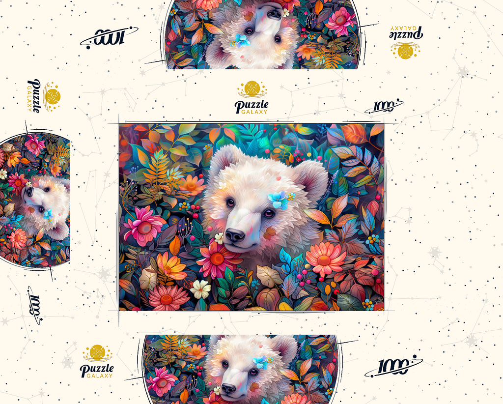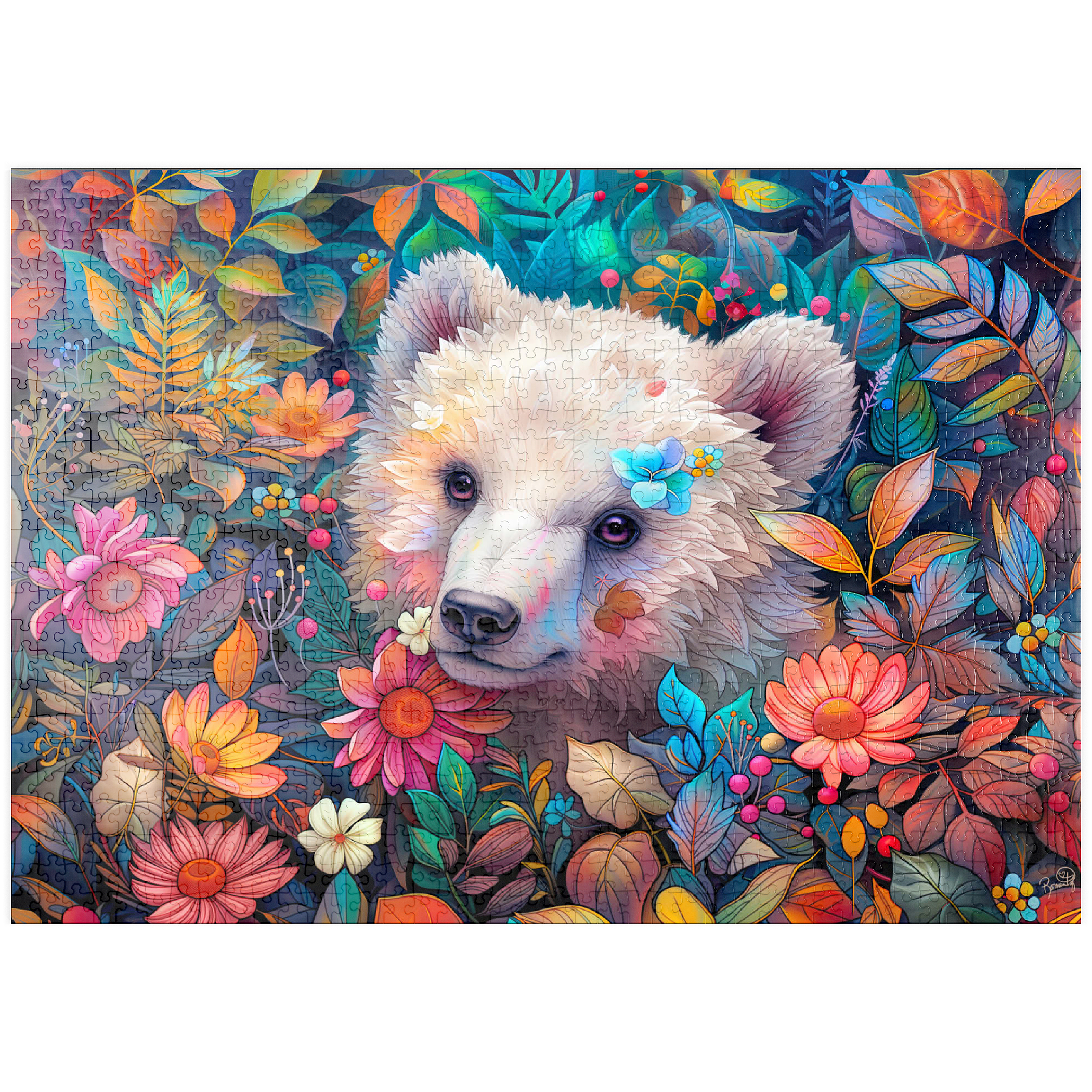 Ein bezauberndes digitales Kunstwerk, das ein entzückendes weißes Bärenjunges zeigt, das durch eine üppige Blumenlandschaft späht. Der sanfte Ausdruck und das weiche Fell des Jungtieres werden durch farbenfrohe Blüten und Blätter in Rosa-, Orange-, Gelb- und Blautönen hervorgehoben. Zarte Blumen stecken in seinem Fell und verleihen ihm einen verspielten Touch. Der satte, lebendige Hintergrund mit detaillierten Blättern, Beeren und Blütenblättern schafft eine magische Waldatmosphäre. Dieses bezaubernde Kunstwerk ist perfekt für Naturliebhaber, Tierfreunde und Fans von fantasievollen Tierporträts. Ideal als Wanddekoration, Dekoration für Kinderzimmer oder als Blickfang in jedem gemütlichen Raum.