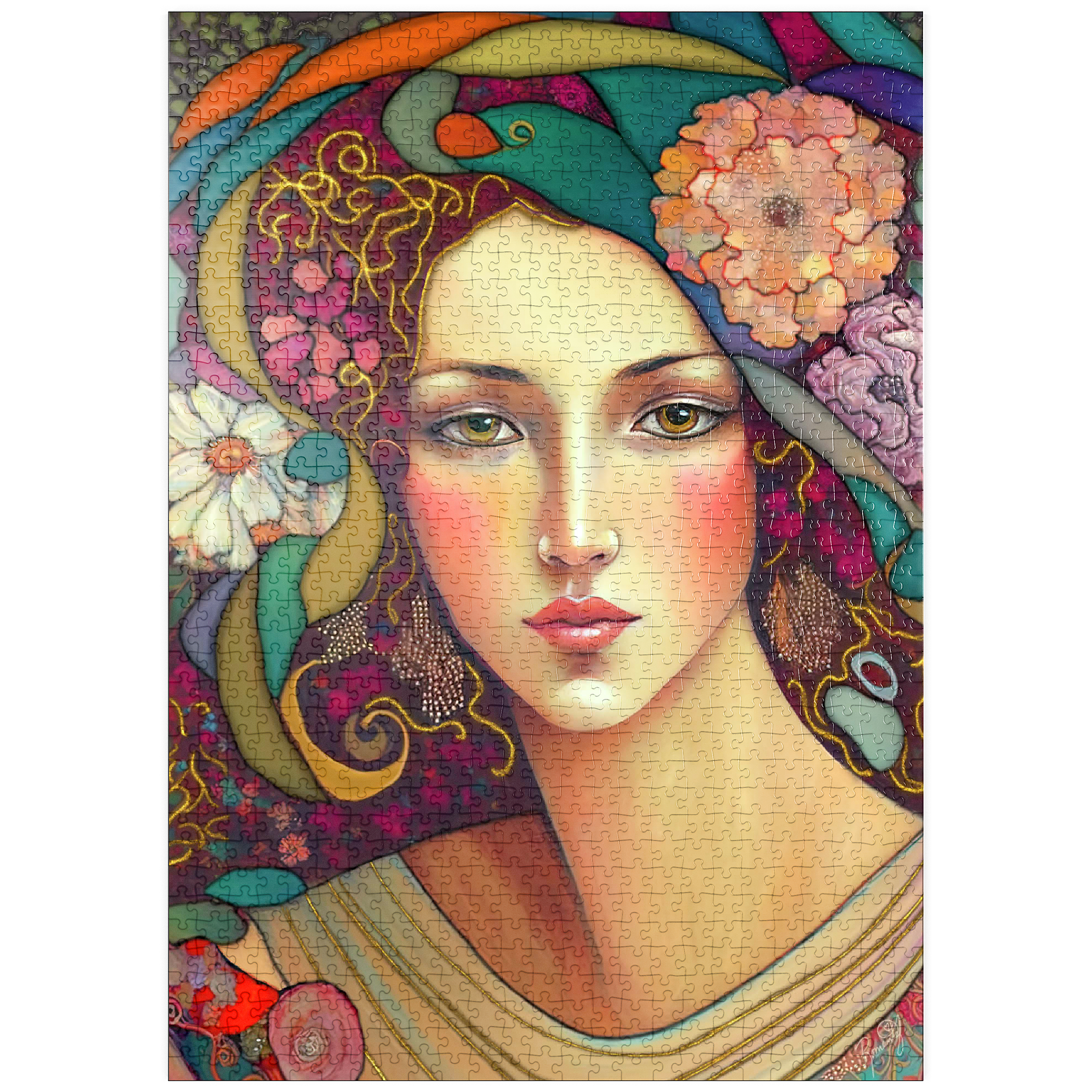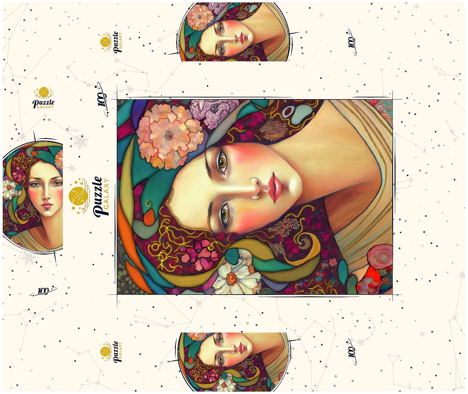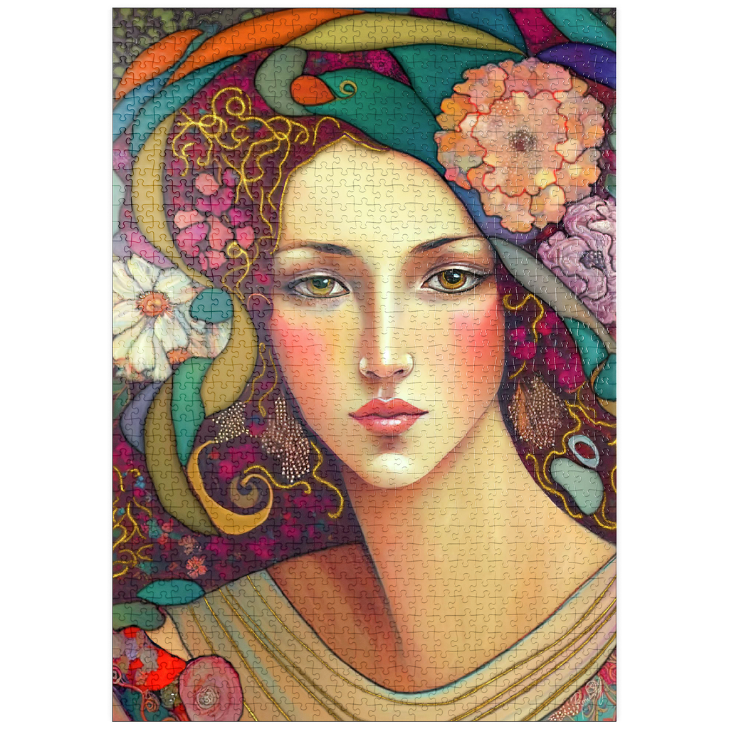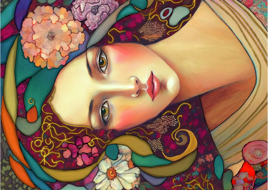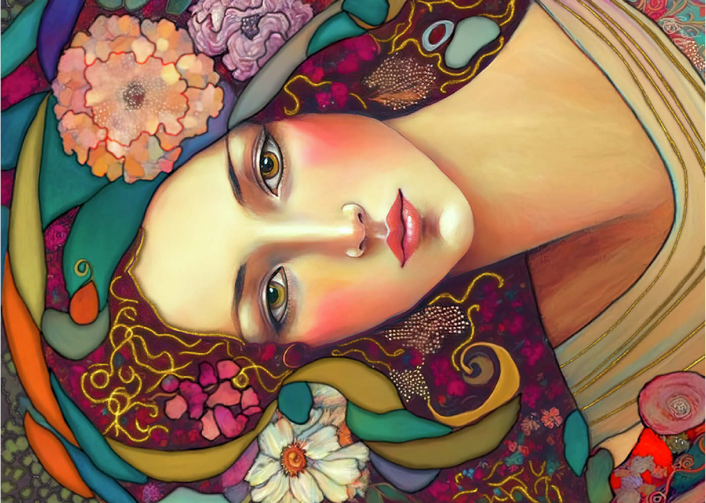 Ein faszinierendes digitales Kunstwerk im Art-Nouveau-Stil, das eine ruhige Frau mit sanften, ausdrucksstarken Augen und zarten Gesichtszügen zeigt. Ihr wallendes Haar ist mit goldenen Wirbeln verflochten und mit blühenden Blumen in Weiß-, Pfirsich- und Lavendeltönen geschmückt. Satte Juwelenfarben wie Blaugrün, Gold und Burgunderrot bilden einen luxuriösen, dekorativen Hintergrund. Die filigranen Blumenmuster und eleganten Verzierungen erinnern an die zeitlose Schönheit klassischer Jugendstil-Porträts. Dieses Werk ist ideal für Liebhaber von Vintage-Kunst, floraler Ästhetik und dekorativer Eleganz und eine atemberaubende Ergänzung für jede Kunstsammlung oder jeden Wohnraum.