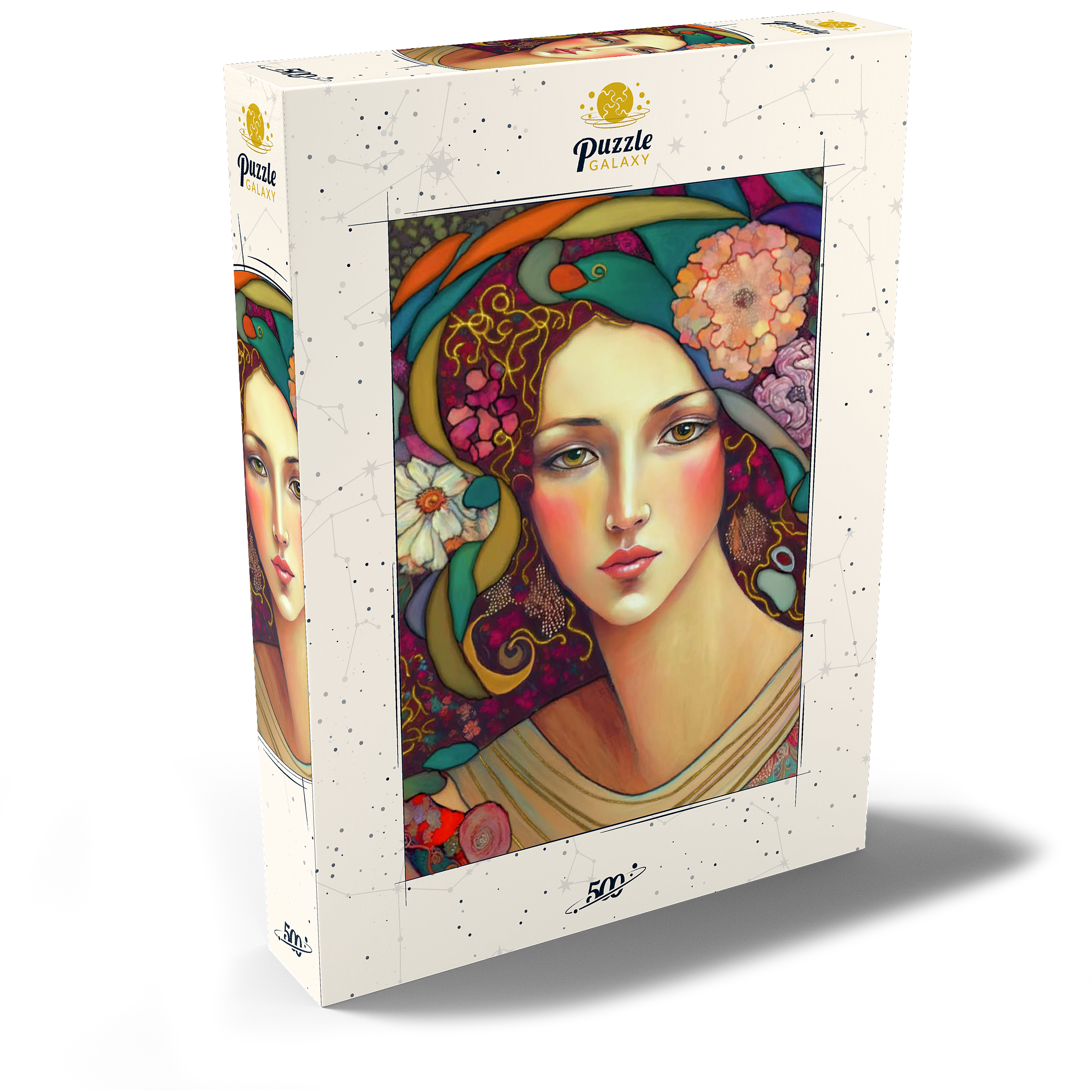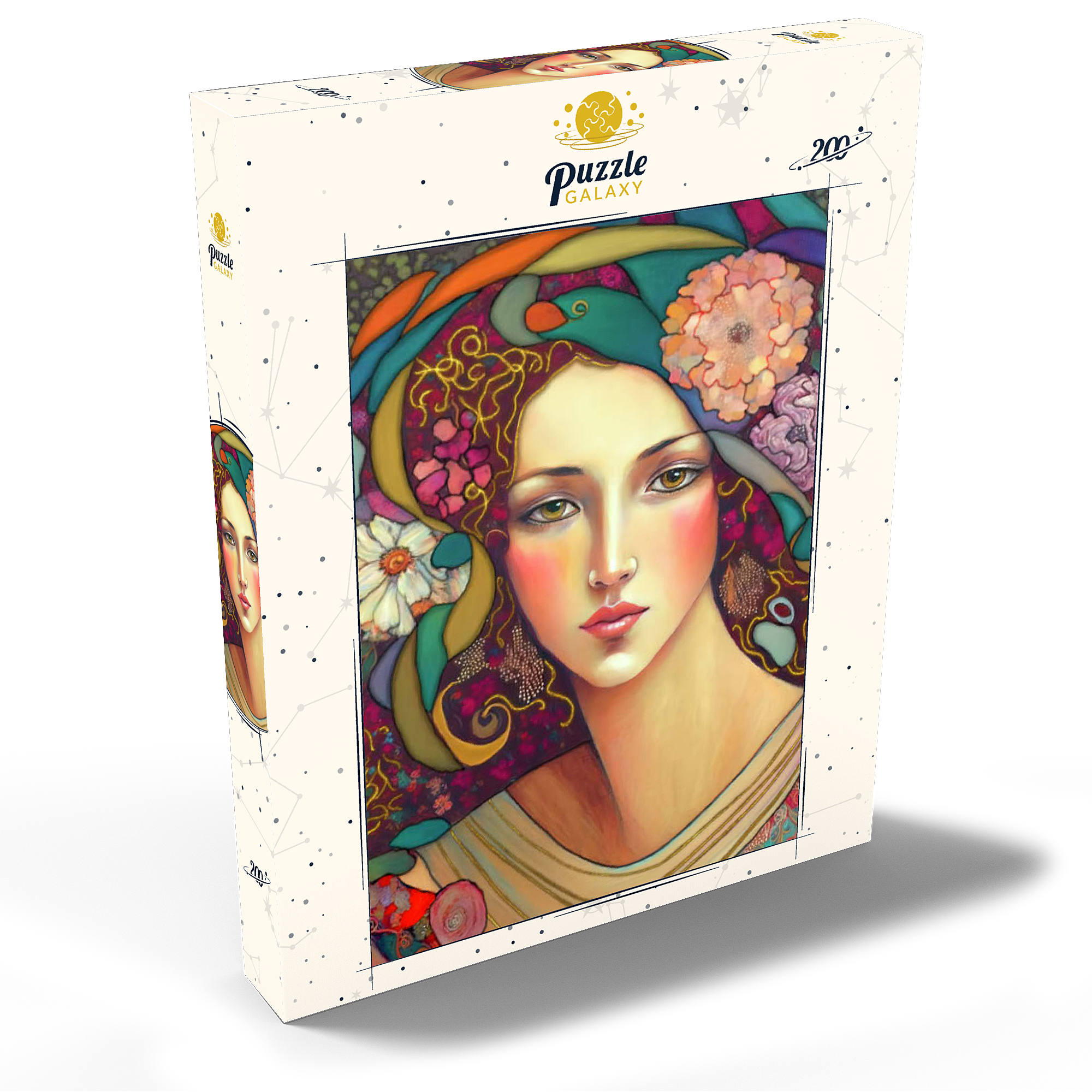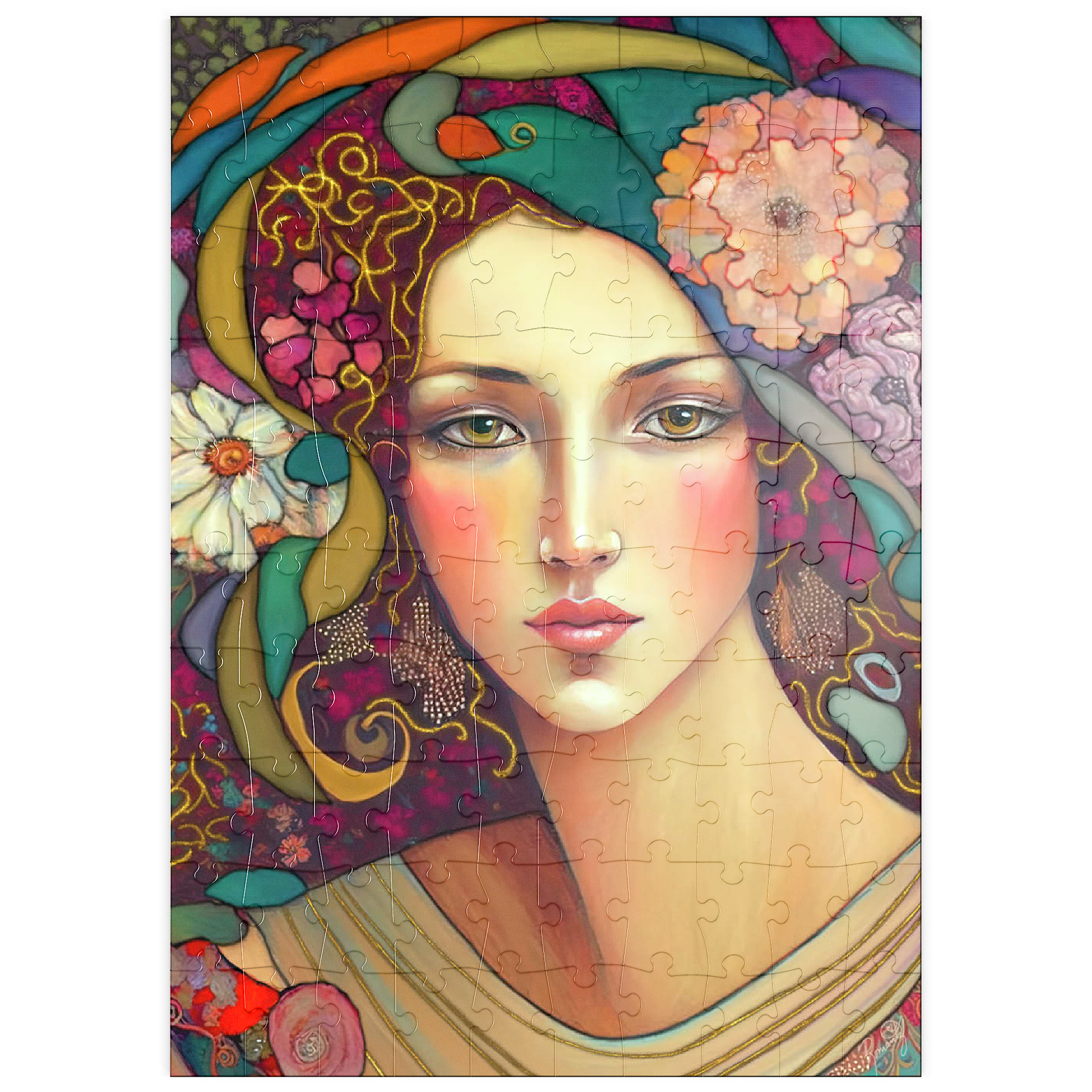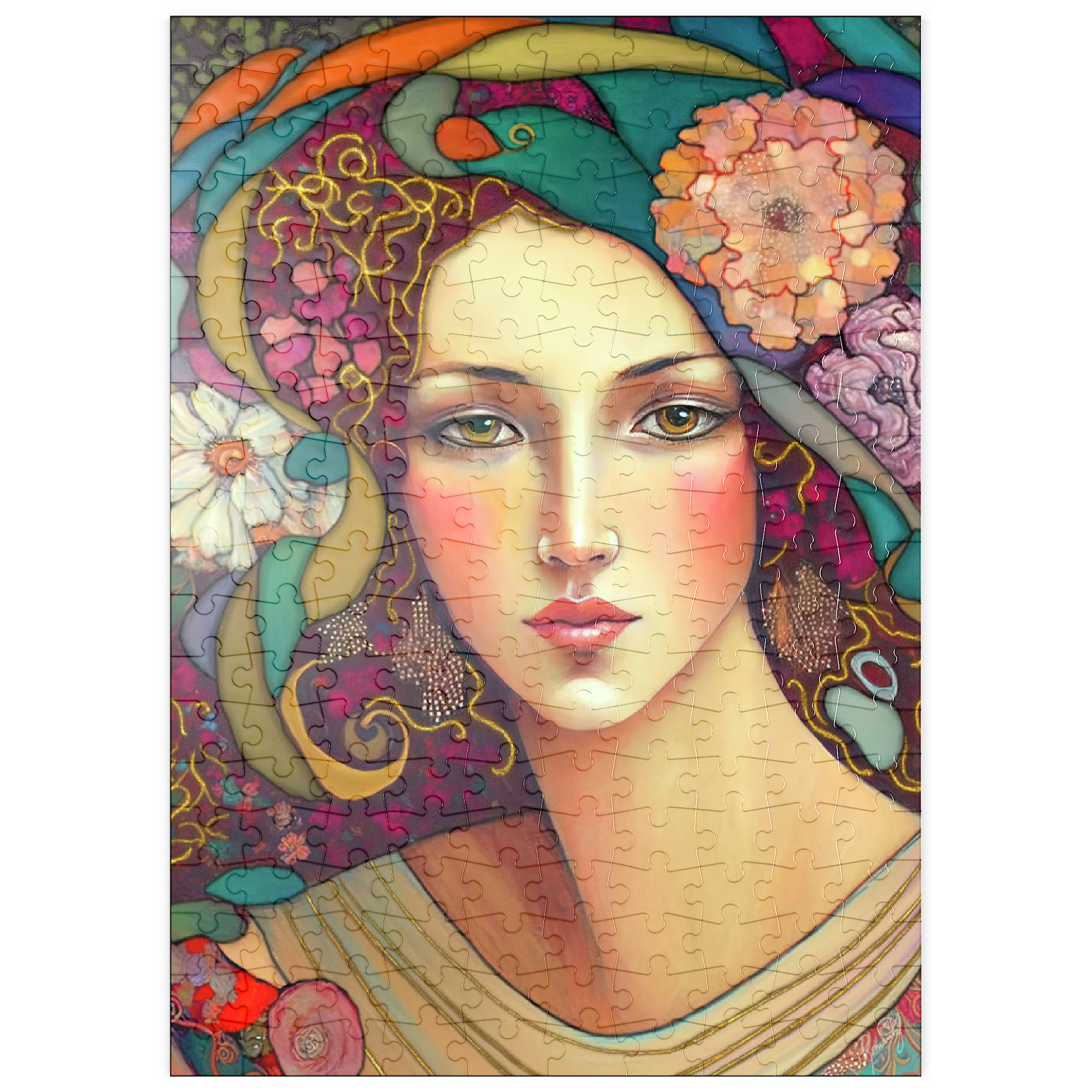 Ein faszinierendes digitales Kunstwerk im Art-Nouveau-Stil, das eine ruhige Frau mit sanften, ausdrucksstarken Augen und zarten Gesichtszügen zeigt. Ihr wallendes Haar ist mit goldenen Wirbeln verflochten und mit blühenden Blumen in Weiß-, Pfirsich- und Lavendeltönen geschmückt. Satte Juwelenfarben wie Blaugrün, Gold und Burgunderrot bilden einen luxuriösen, dekorativen Hintergrund. Die filigranen Blumenmuster und eleganten Verzierungen erinnern an die zeitlose Schönheit klassischer Jugendstil-Porträts. Dieses Werk ist ideal für Liebhaber von Vintage-Kunst, floraler Ästhetik und dekorativer Eleganz und eine atemberaubende Ergänzung für jede Kunstsammlung oder jeden Wohnraum.