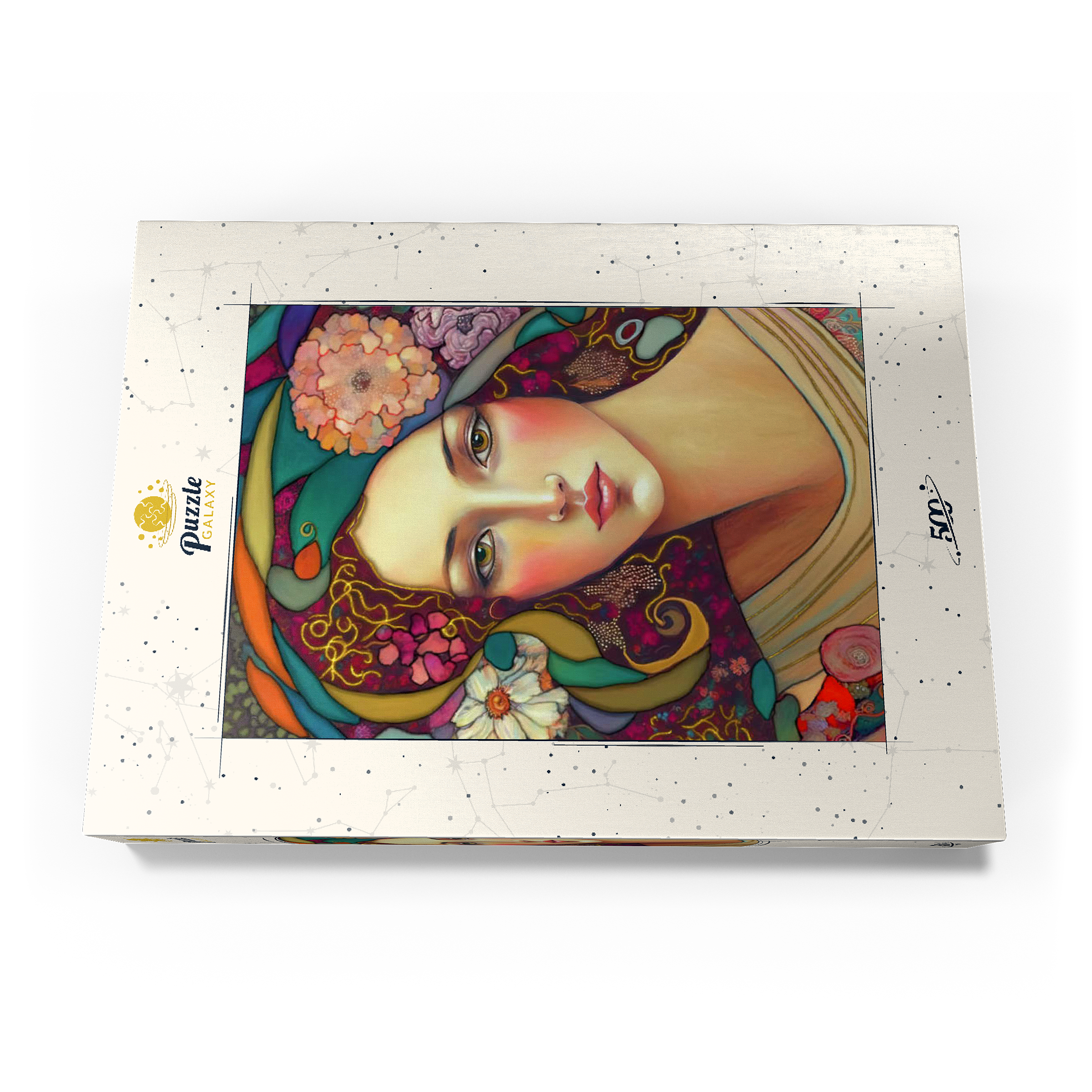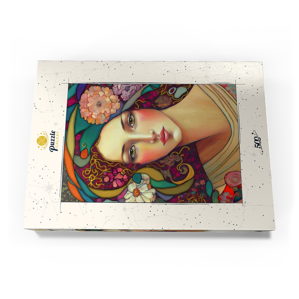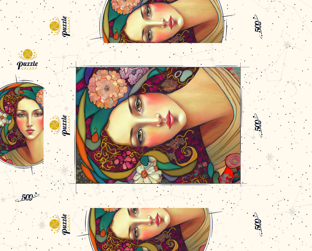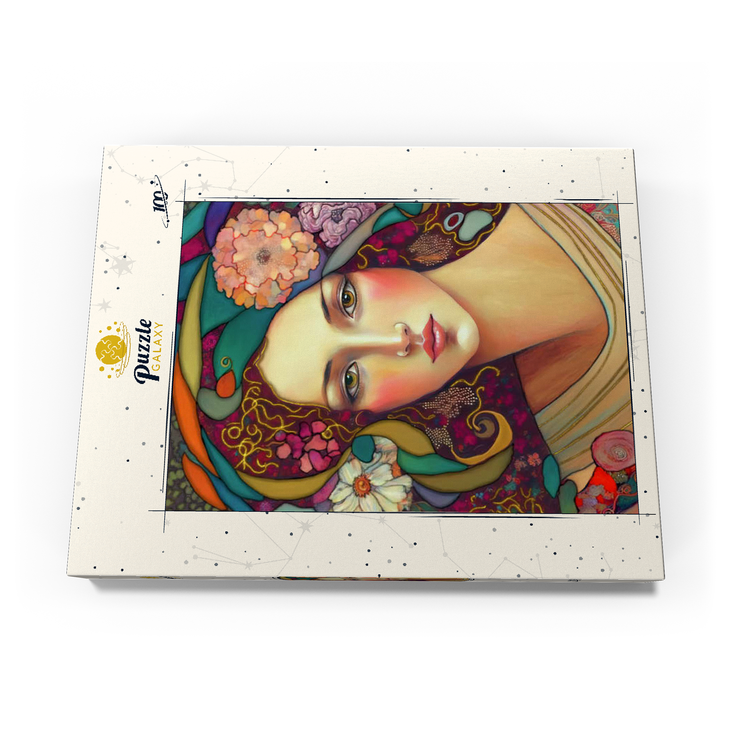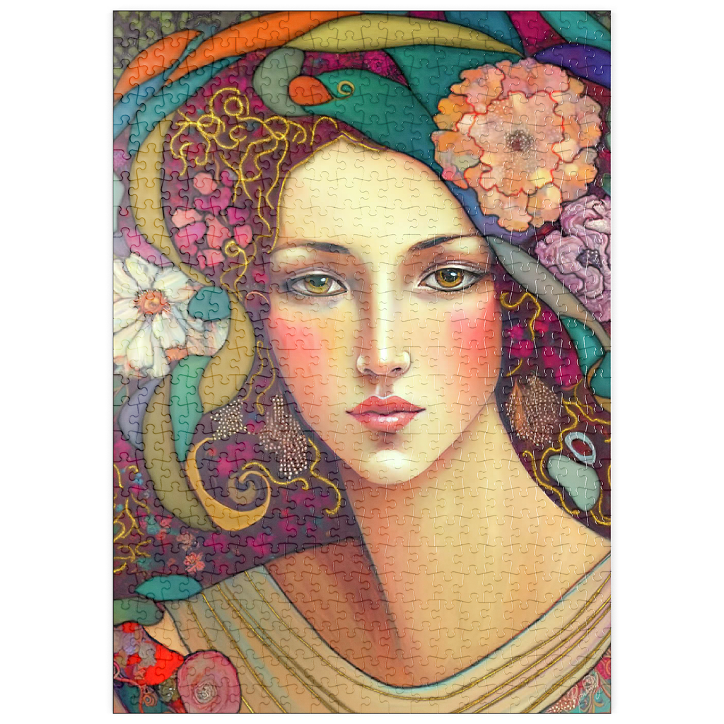 Ein faszinierendes digitales Kunstwerk im Art-Nouveau-Stil, das eine ruhige Frau mit sanften, ausdrucksstarken Augen und zarten Gesichtszügen zeigt. Ihr wallendes Haar ist mit goldenen Wirbeln verflochten und mit blühenden Blumen in Weiß-, Pfirsich- und Lavendeltönen geschmückt. Satte Juwelenfarben wie Blaugrün, Gold und Burgunderrot bilden einen luxuriösen, dekorativen Hintergrund. Die filigranen Blumenmuster und eleganten Verzierungen erinnern an die zeitlose Schönheit klassischer Jugendstil-Porträts. Dieses Werk ist ideal für Liebhaber von Vintage-Kunst, floraler Ästhetik und dekorativer Eleganz und eine atemberaubende Ergänzung für jede Kunstsammlung oder jeden Wohnraum.