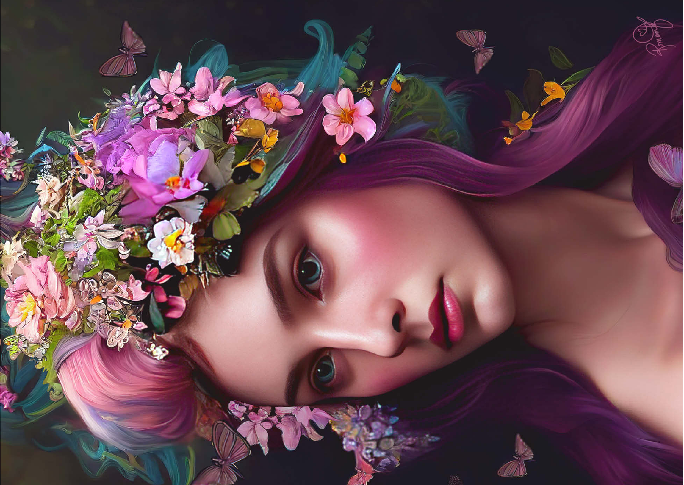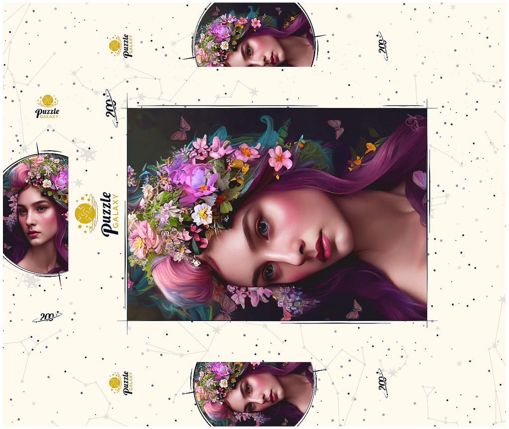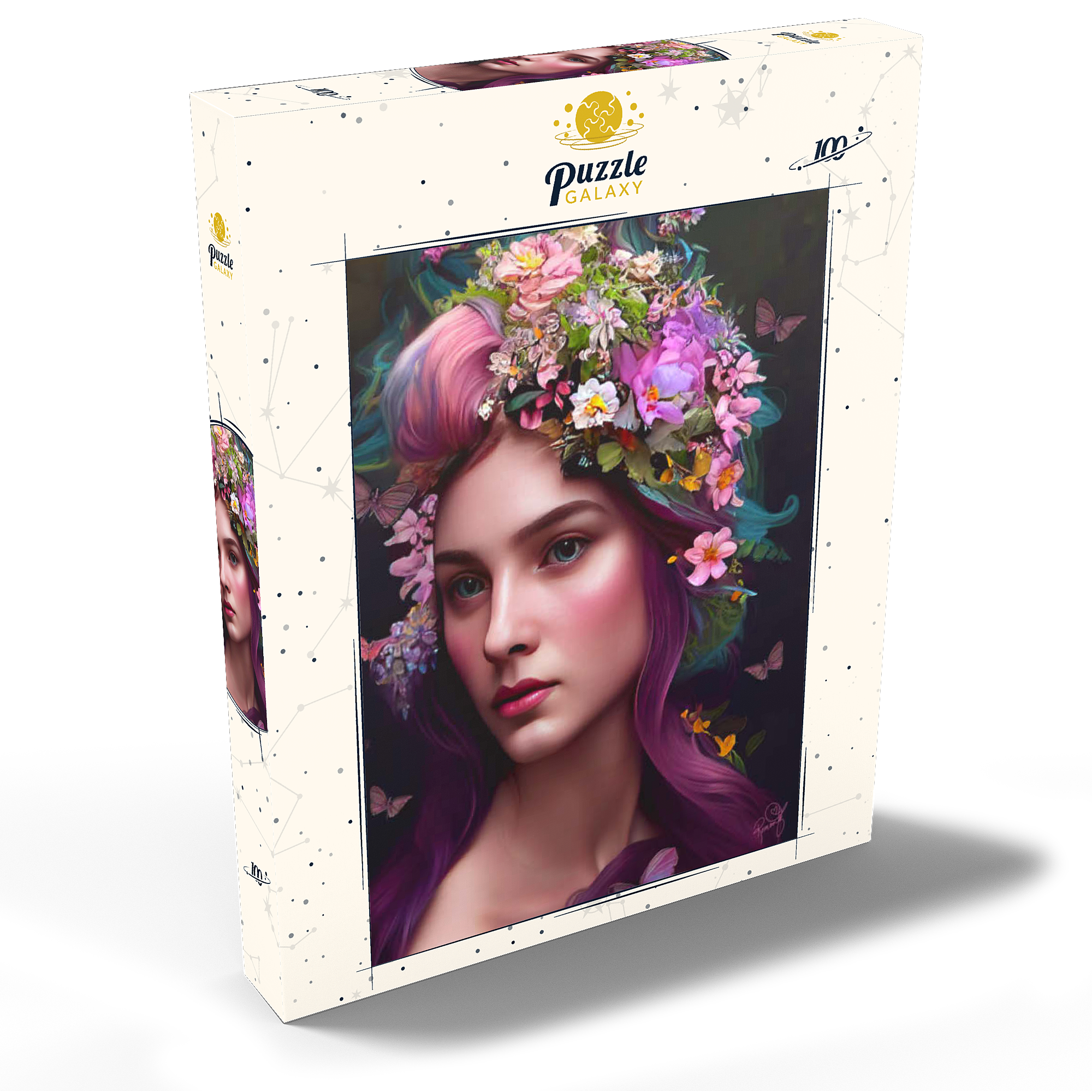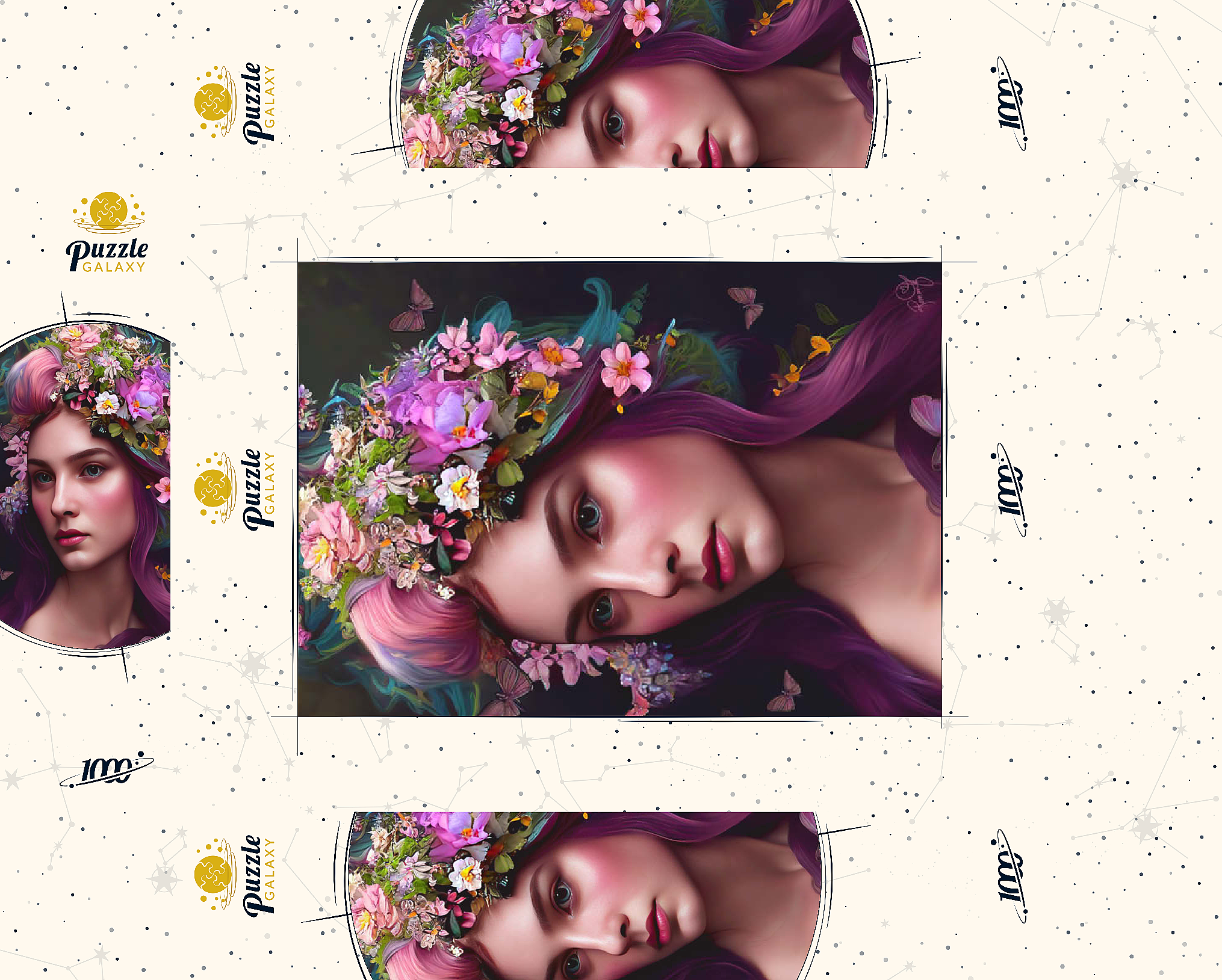 Ein faszinierendes digitales Kunstwerk, das eine elegante Frau zeigt, die mit einer üppigen Blumenkrone aus zarten rosa, violetten und weißen Blüten geschmückt ist, die sich mit grünem Laub verflechten. Schmetterlinge flattern um sie herum und verleihen der bezaubernden Szene einen Hauch von Leichtigkeit. Ihr tief violett- und rosa-getöntes Haar fällt in sanften Wellen herab und unterstreicht ihre strahlende Haut und ihre auffälligen blauen Augen. Die filigranen Details und die lebendige Farbpalette schaffen eine romantische und von der Natur inspirierte Ästhetik. Dieses Werk ist ideal für Fans von Fantasy-Porträts, botanischer Kunst und femininer Eleganz und eine faszinierende Ergänzung für jede Kunstsammlung oder jeden dekorativen Raum.