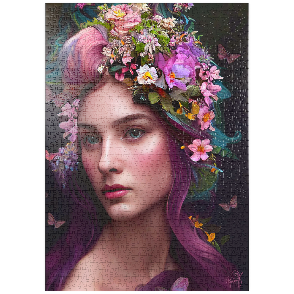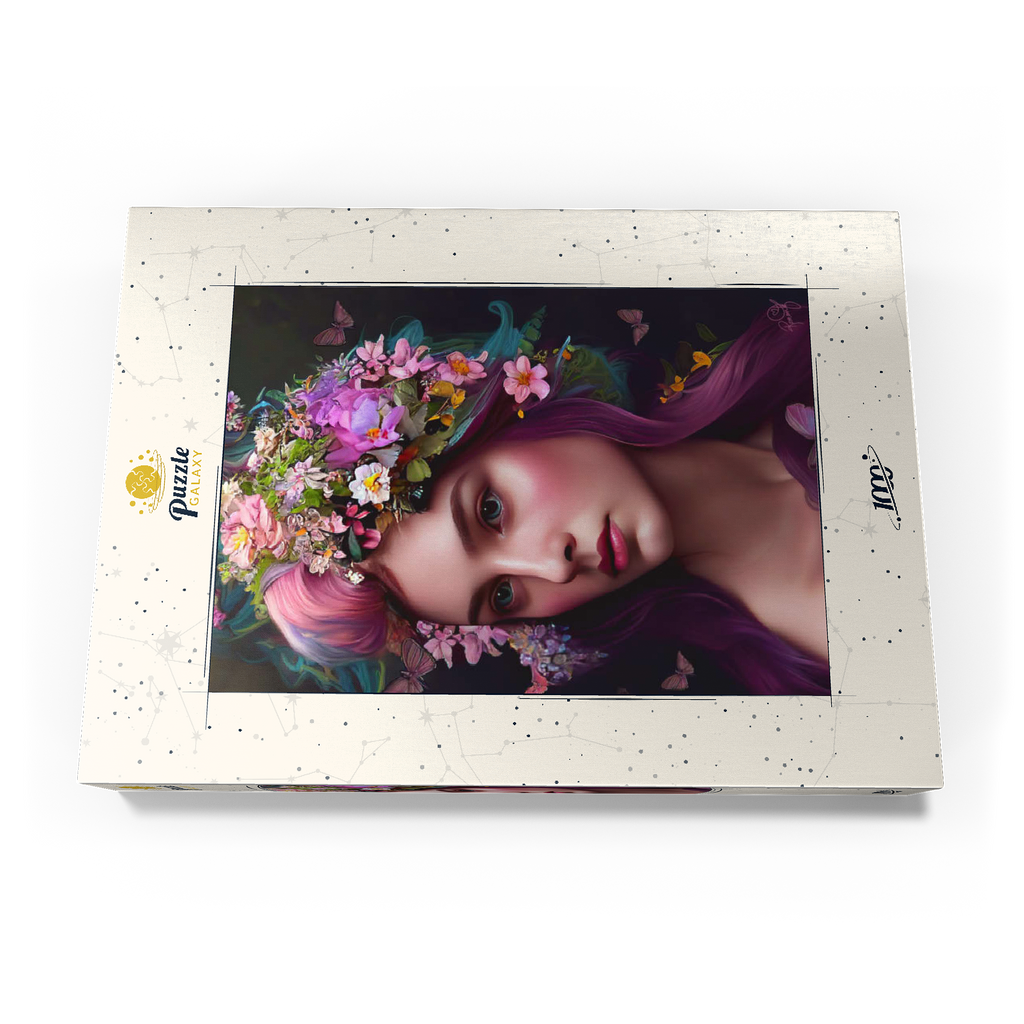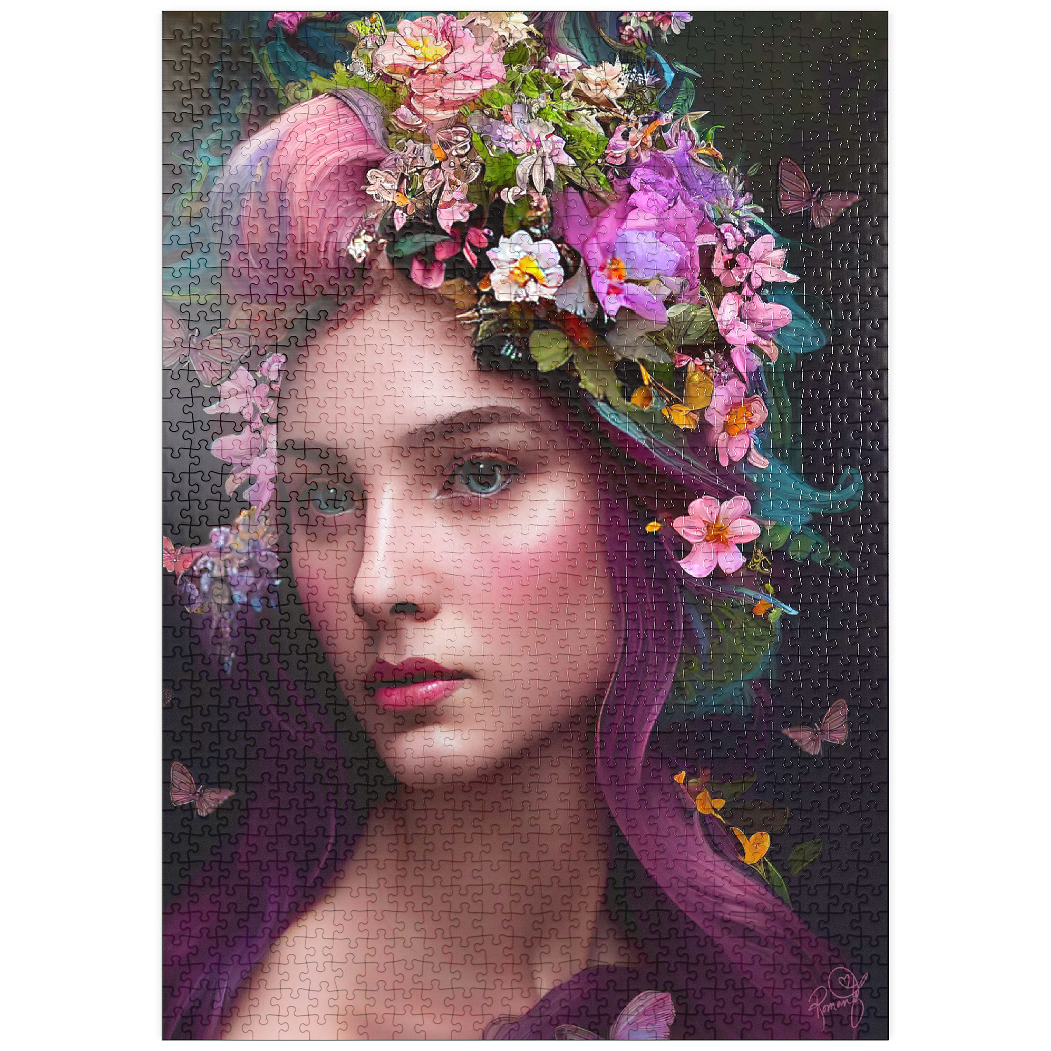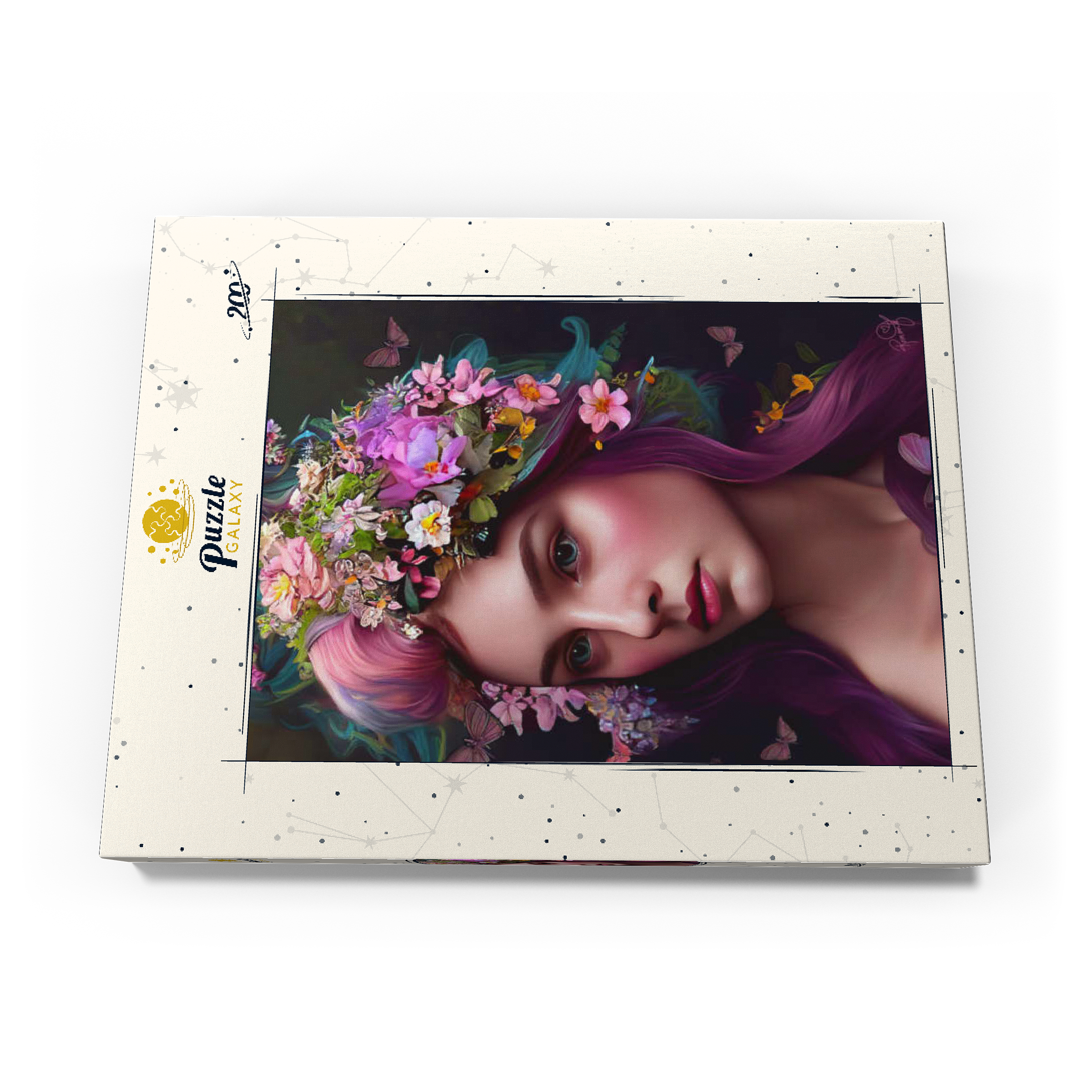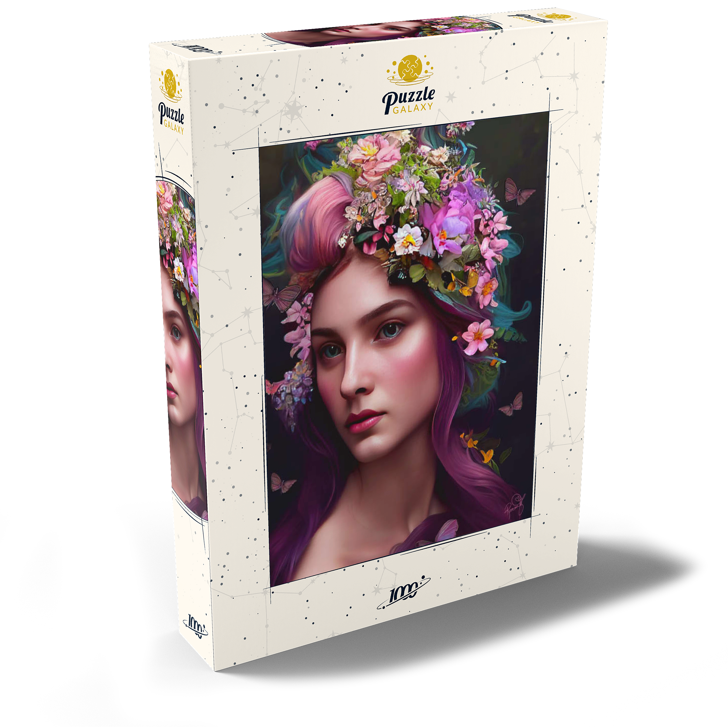 Ein faszinierendes digitales Kunstwerk, das eine elegante Frau zeigt, die mit einer üppigen Blumenkrone aus zarten rosa, violetten und weißen Blüten geschmückt ist, die sich mit grünem Laub verflechten. Schmetterlinge flattern um sie herum und verleihen der bezaubernden Szene einen Hauch von Leichtigkeit. Ihr tief violett- und rosa-getöntes Haar fällt in sanften Wellen herab und unterstreicht ihre strahlende Haut und ihre auffälligen blauen Augen. Die filigranen Details und die lebendige Farbpalette schaffen eine romantische und von der Natur inspirierte Ästhetik. Dieses Werk ist ideal für Fans von Fantasy-Porträts, botanischer Kunst und femininer Eleganz und eine faszinierende Ergänzung für jede Kunstsammlung oder jeden dekorativen Raum.
