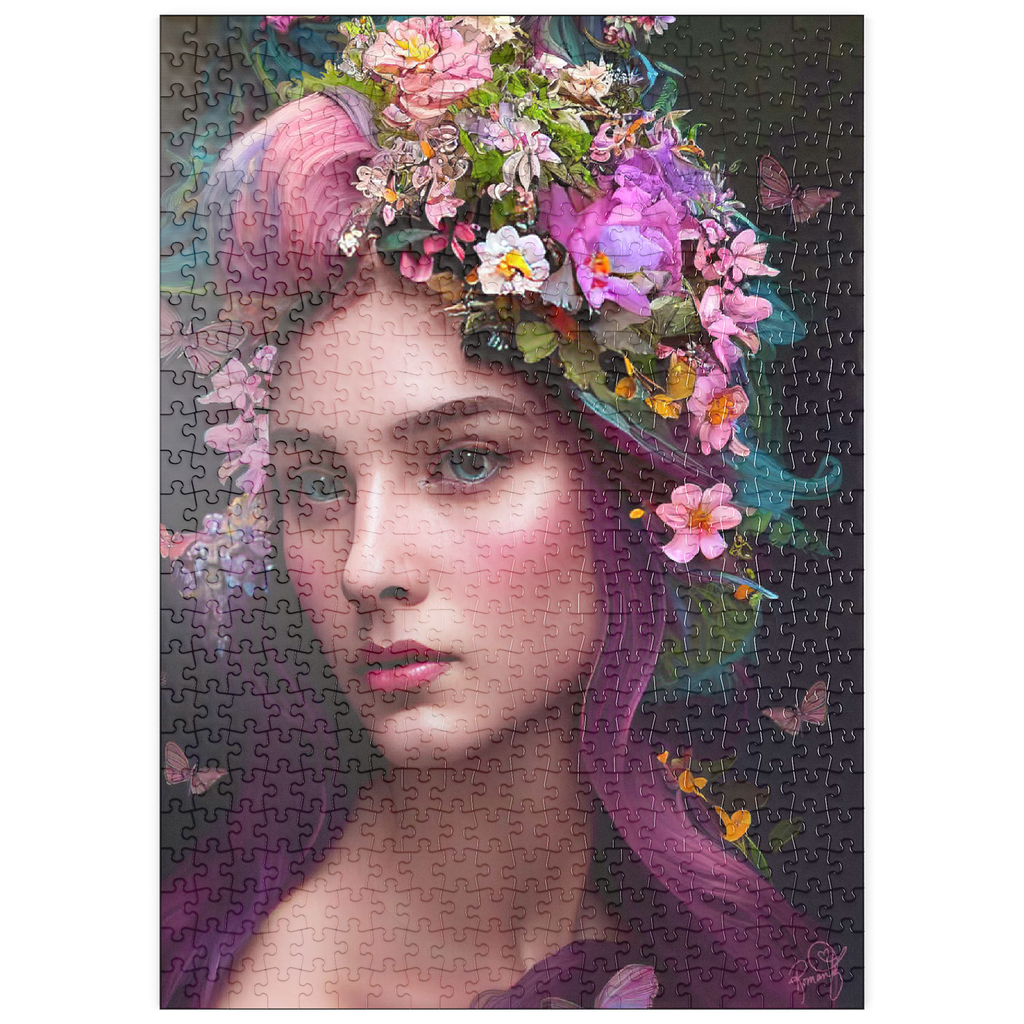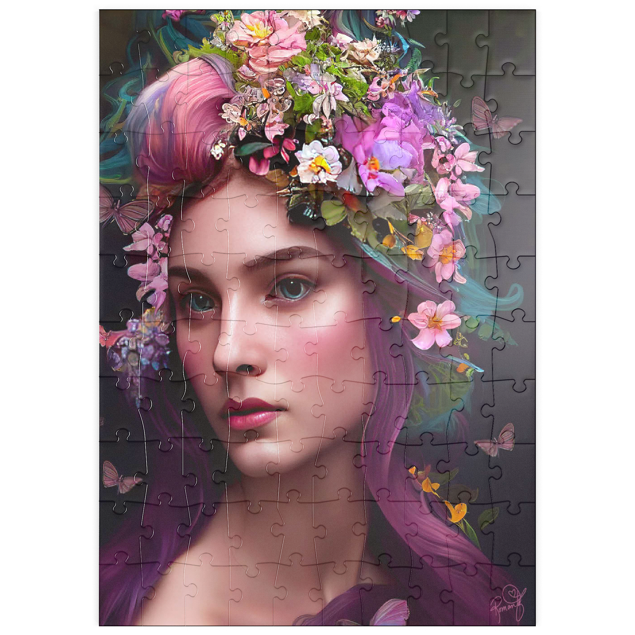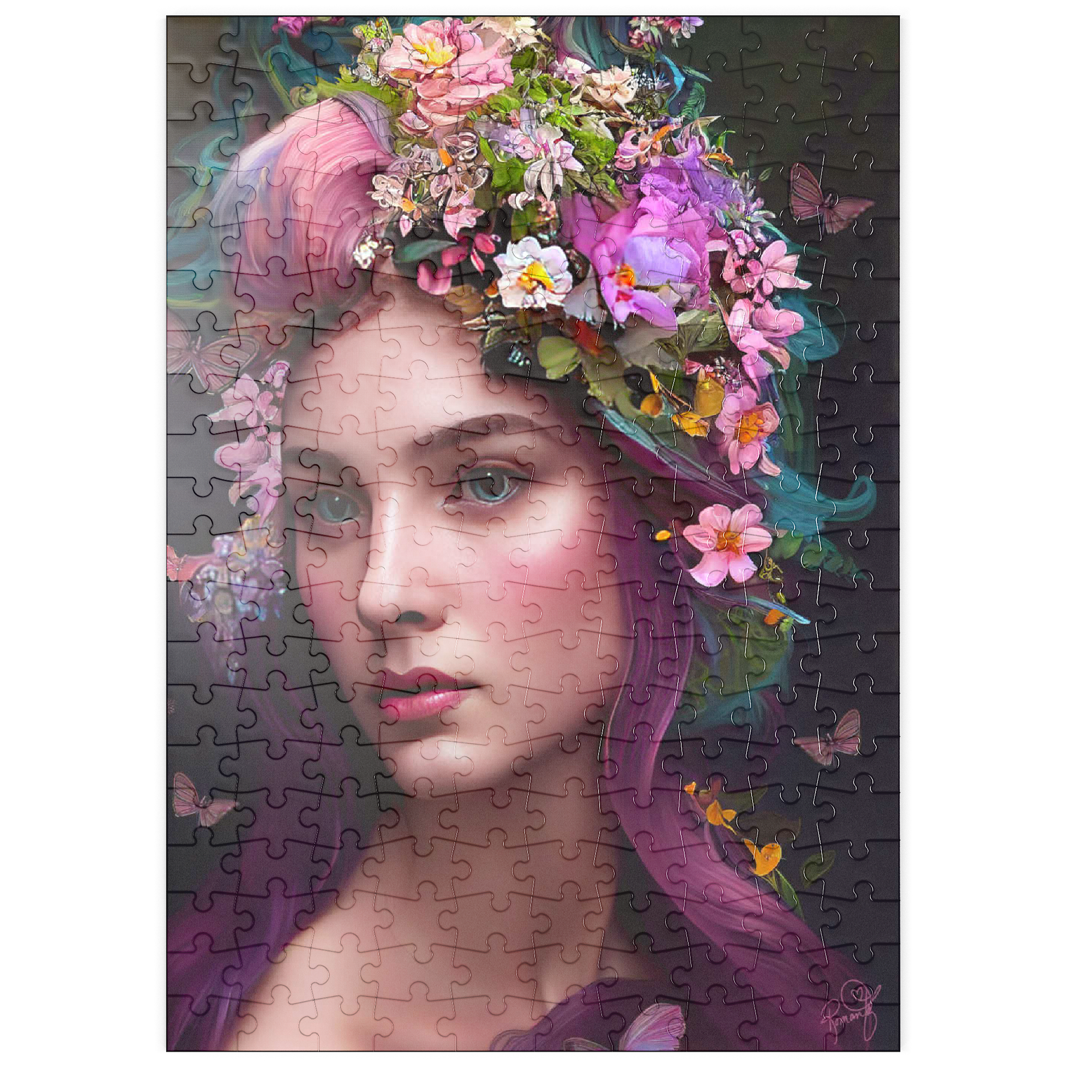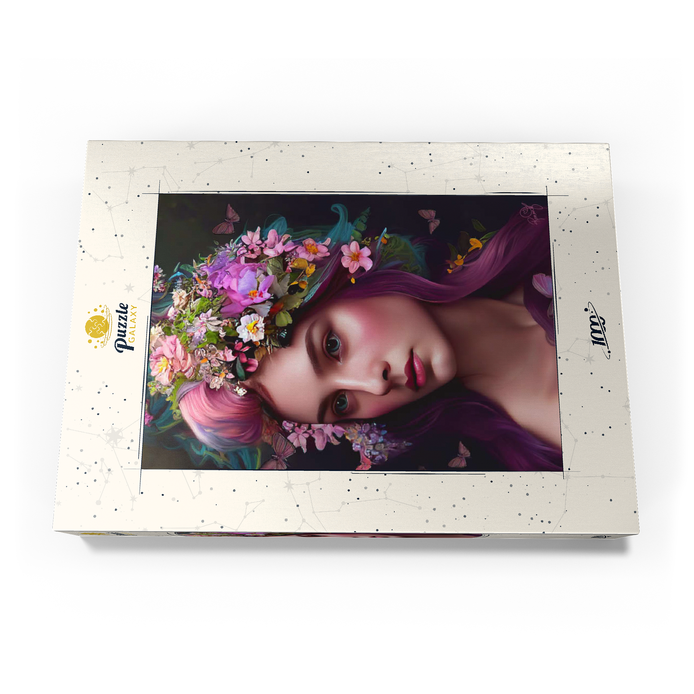 Ein faszinierendes digitales Kunstwerk, das eine elegante Frau zeigt, die mit einer üppigen Blumenkrone aus zarten rosa, violetten und weißen Blüten geschmückt ist, die sich mit grünem Laub verflechten. Schmetterlinge flattern um sie herum und verleihen der bezaubernden Szene einen Hauch von Leichtigkeit. Ihr tief violett- und rosa-getöntes Haar fällt in sanften Wellen herab und unterstreicht ihre strahlende Haut und ihre auffälligen blauen Augen. Die filigranen Details und die lebendige Farbpalette schaffen eine romantische und von der Natur inspirierte Ästhetik. Dieses Werk ist ideal für Fans von Fantasy-Porträts, botanischer Kunst und femininer Eleganz und eine faszinierende Ergänzung für jede Kunstsammlung oder jeden dekorativen Raum.