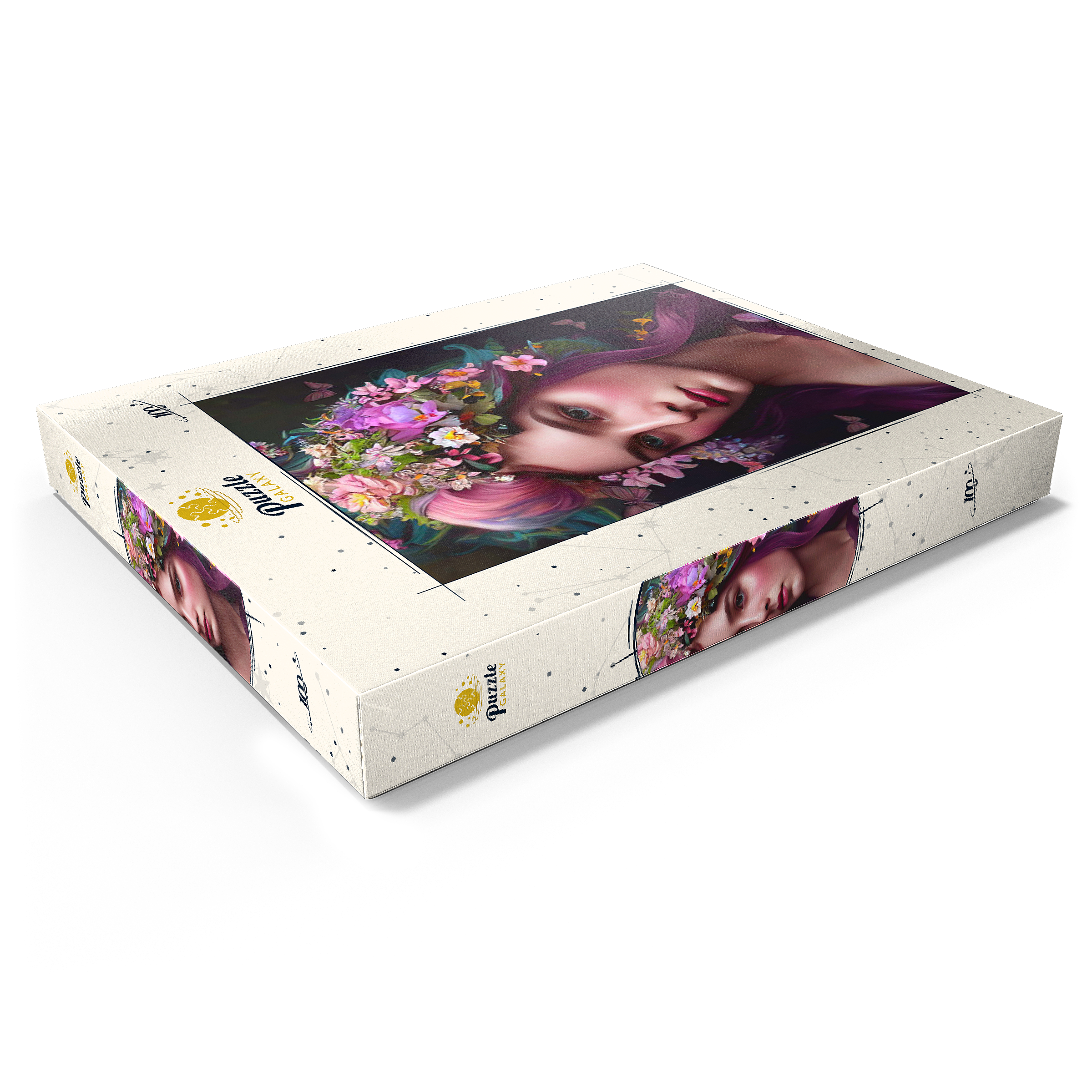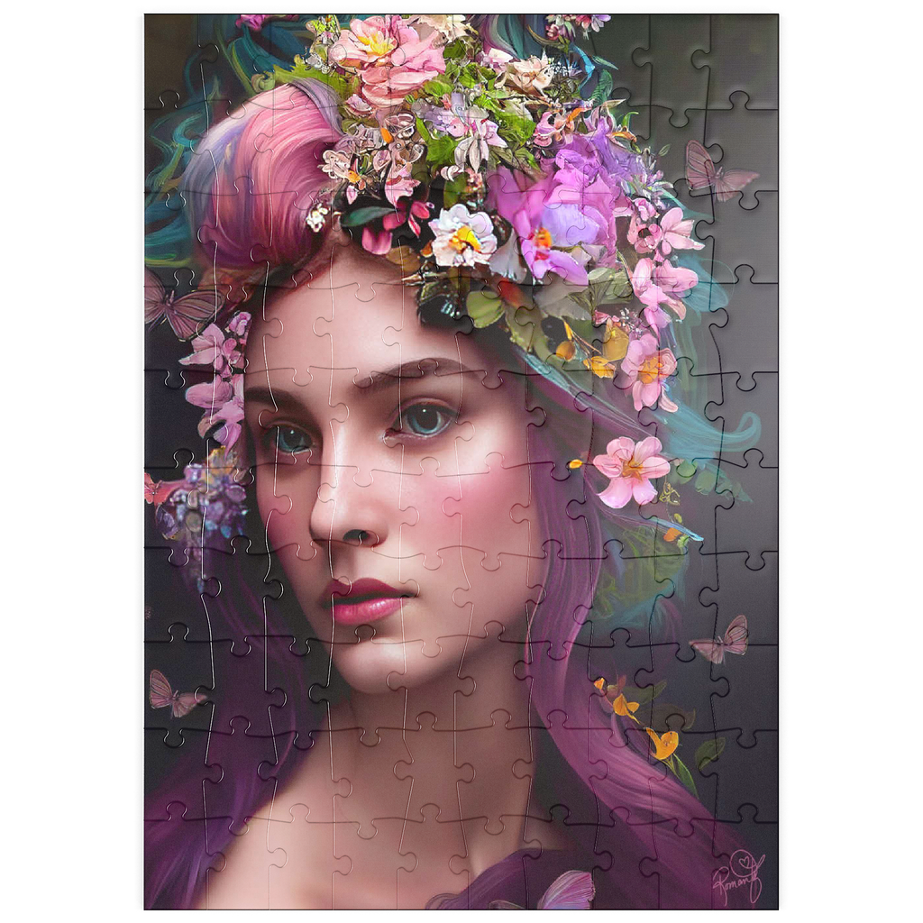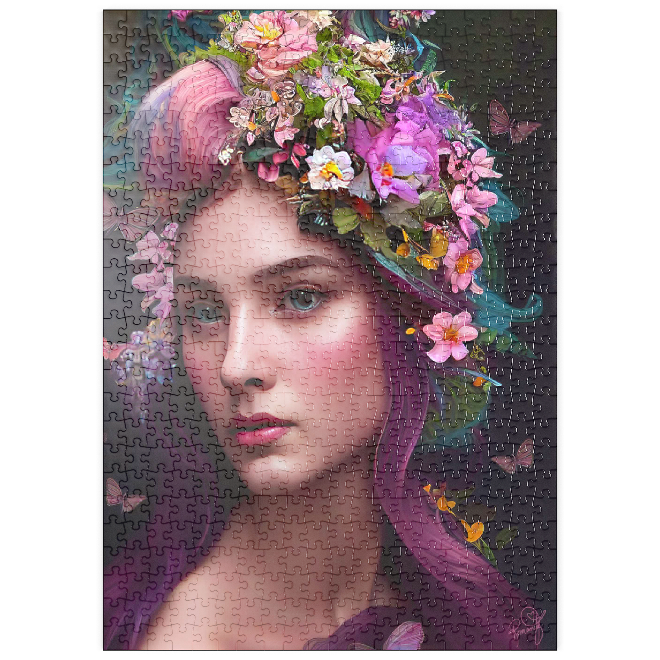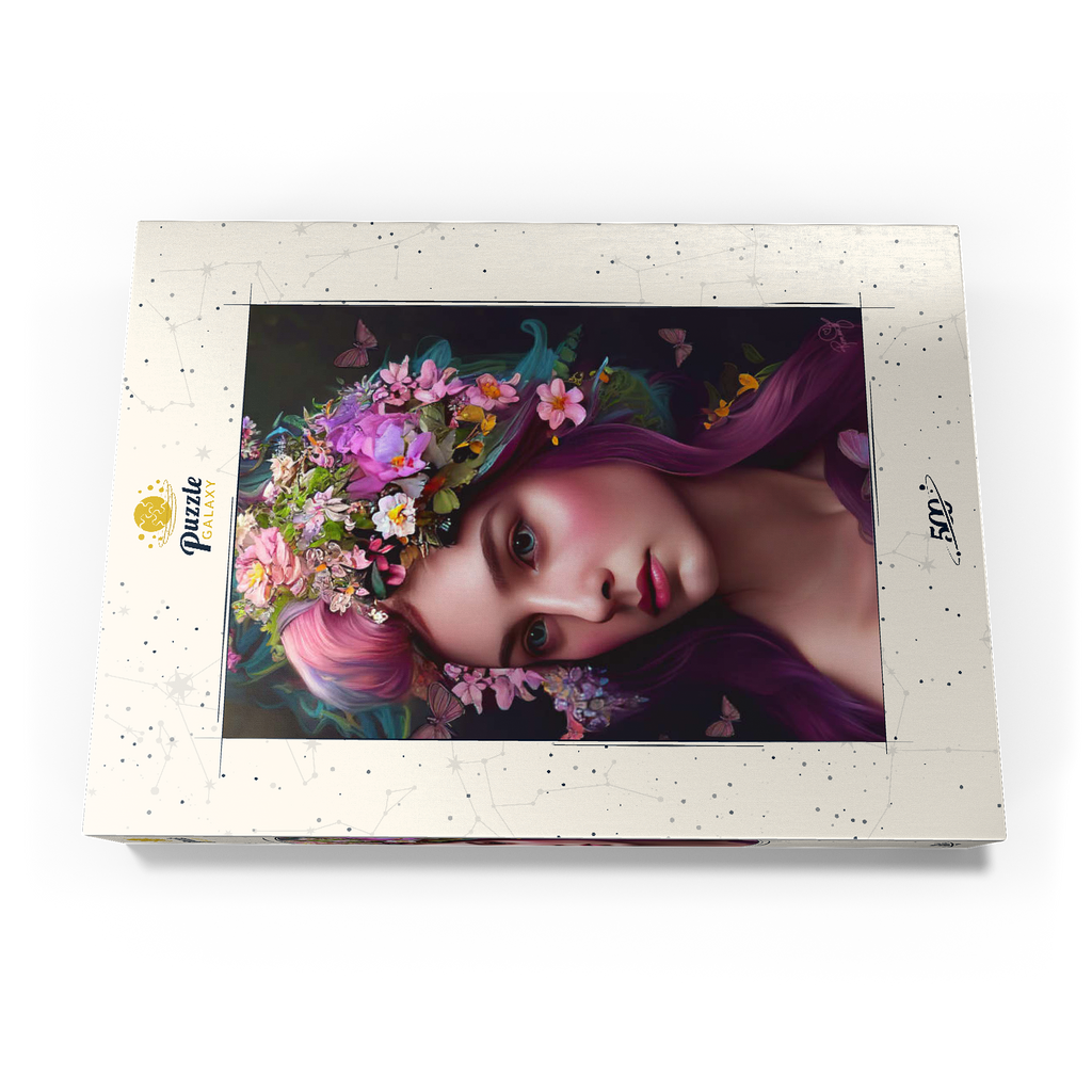 Ein faszinierendes digitales Kunstwerk, das eine elegante Frau zeigt, die mit einer üppigen Blumenkrone aus zarten rosa, violetten und weißen Blüten geschmückt ist, die sich mit grünem Laub verflechten. Schmetterlinge flattern um sie herum und verleihen der bezaubernden Szene einen Hauch von Leichtigkeit. Ihr tief violett- und rosa-getöntes Haar fällt in sanften Wellen herab und unterstreicht ihre strahlende Haut und ihre auffälligen blauen Augen. Die filigranen Details und die lebendige Farbpalette schaffen eine romantische und von der Natur inspirierte Ästhetik. Dieses Werk ist ideal für Fans von Fantasy-Porträts, botanischer Kunst und femininer Eleganz und eine faszinierende Ergänzung für jede Kunstsammlung oder jeden dekorativen Raum.