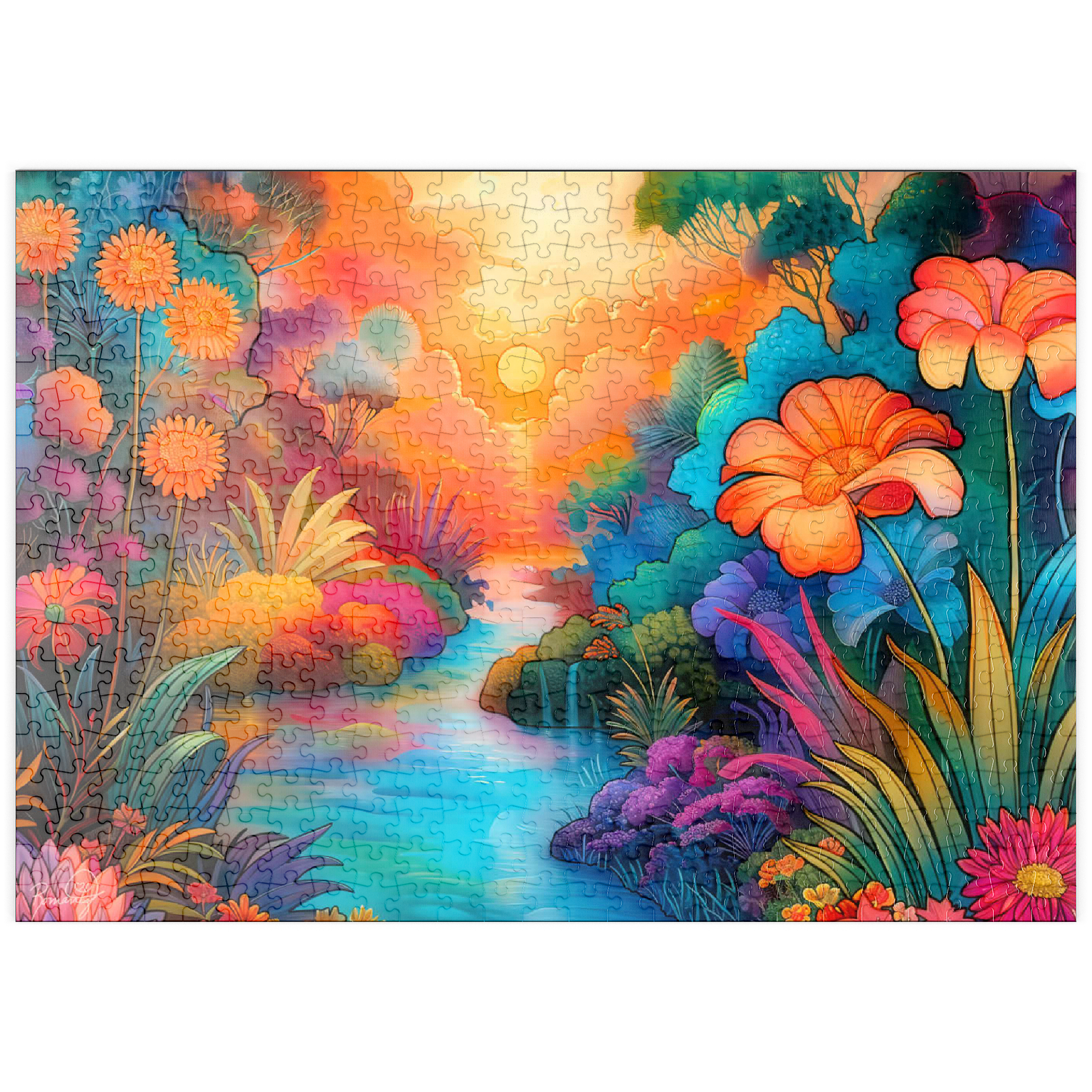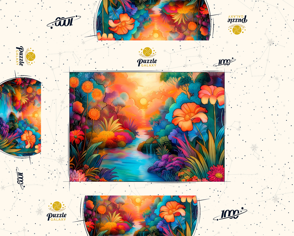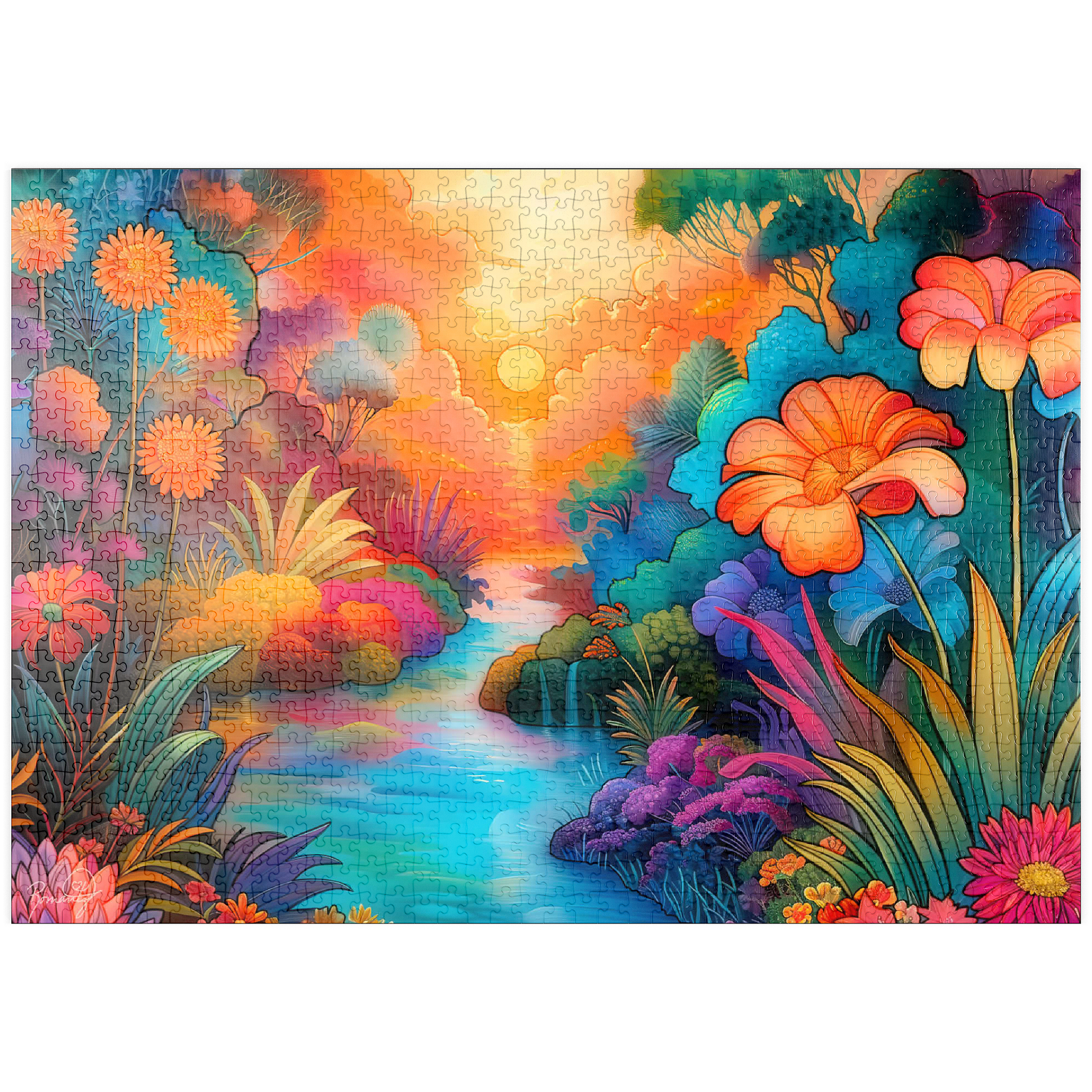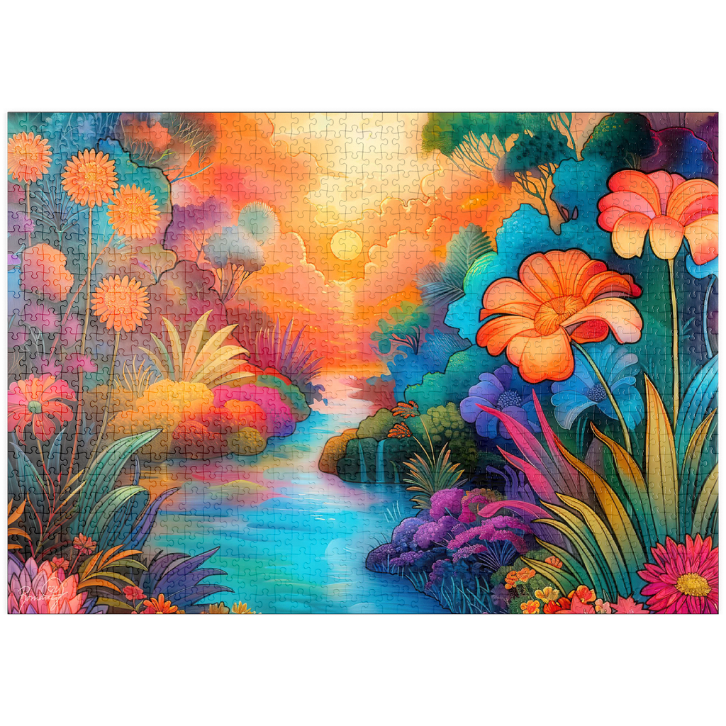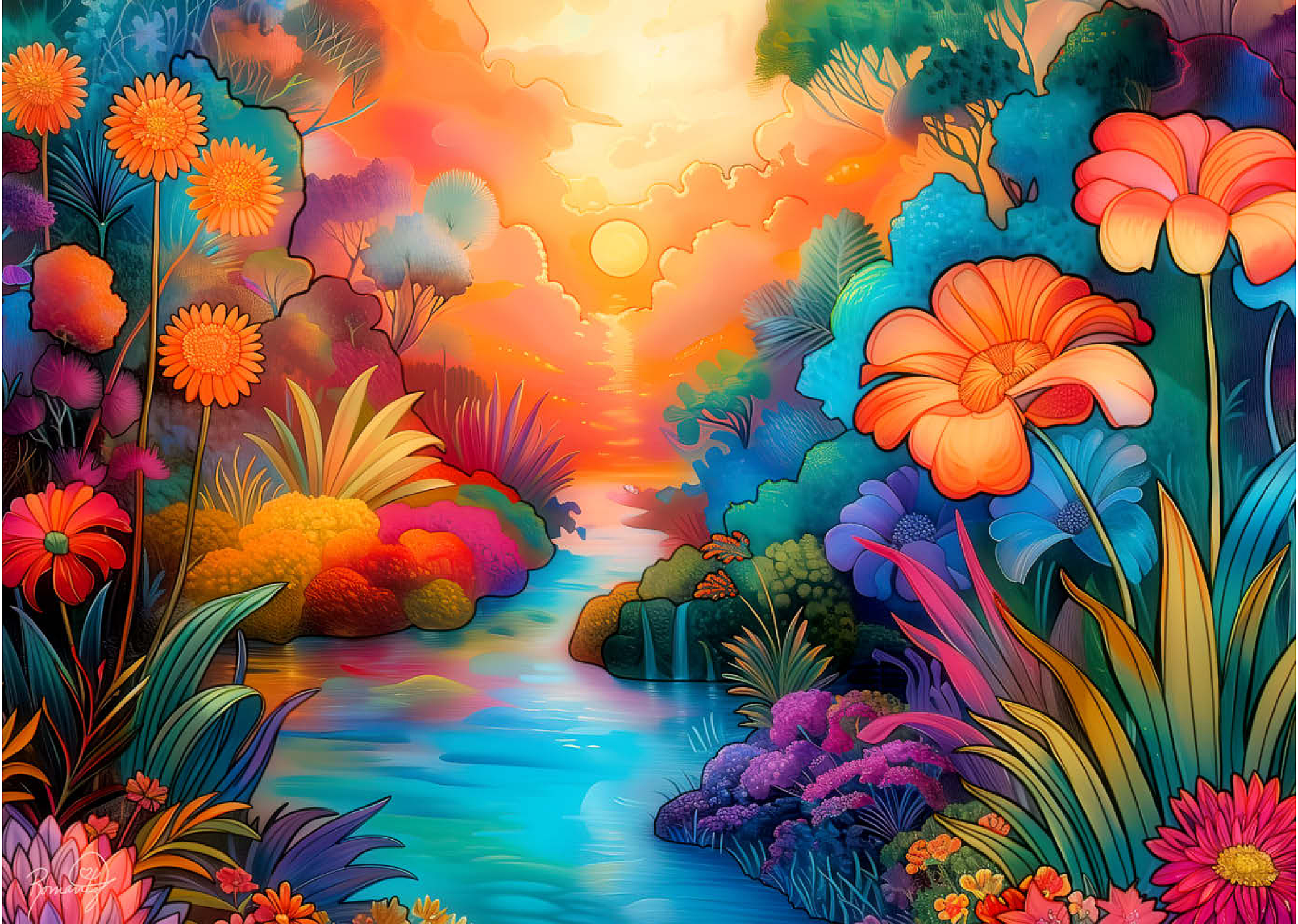 Diese surreale Landschaftskunst fängt ein traumhaftes Flusstal bei Sonnenuntergang ein, das in leuchtenden, fast magischen Farben erstrahlt. Der Himmel leuchtet in Orange-, Gold- und Rosatönen, während die Sonne untergeht und ein warmes Licht auf die reich strukturierte Flora wirft. Überdimensionale, farbenfrohe Blumen in Rot-, Blau- und Violetttönen blühen entlang der Flussufer, während fantastische Bäume und Pflanzen einen skurrilen Touch verleihen. Der türkisblaue Fluss schlängelt sich durch die Szene und spiegelt den atemberaubenden Himmel wider. Diese stark stilisierte und farbenfrohe Naturfantasie strahlt Ruhe, Kreativität und Staunen aus.