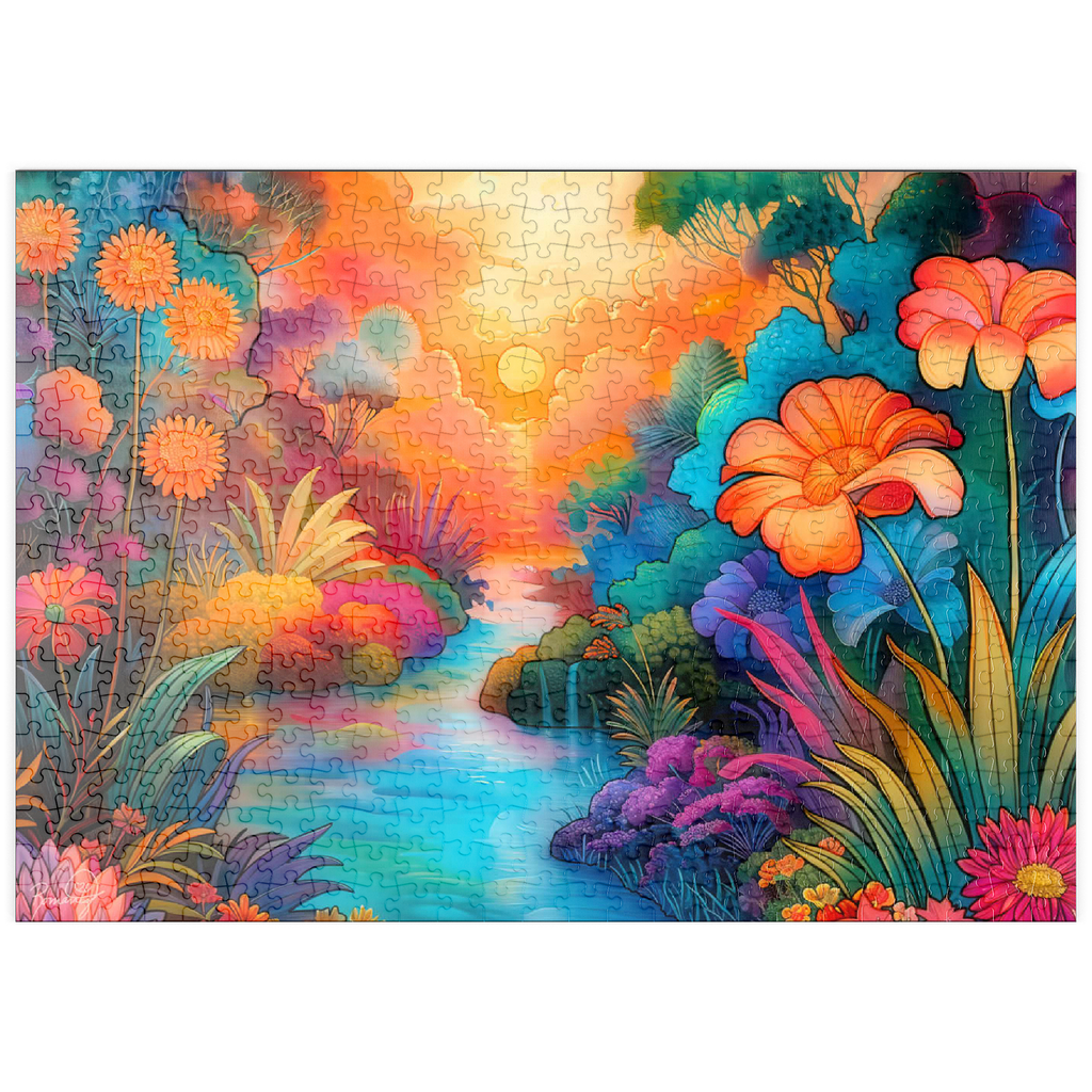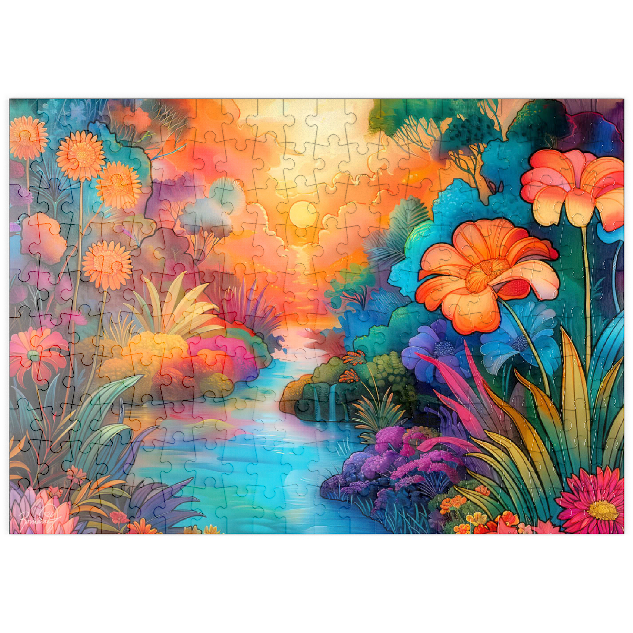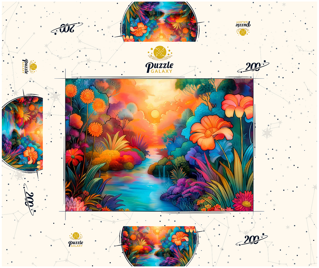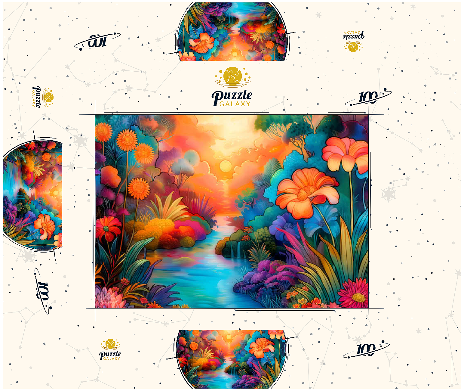 Diese surreale Landschaftskunst fängt ein traumhaftes Flusstal bei Sonnenuntergang ein, das in leuchtenden, fast magischen Farben erstrahlt. Der Himmel leuchtet in Orange-, Gold- und Rosatönen, während die Sonne untergeht und ein warmes Licht auf die reich strukturierte Flora wirft. Überdimensionale, farbenfrohe Blumen in Rot-, Blau- und Violetttönen blühen entlang der Flussufer, während fantastische Bäume und Pflanzen einen skurrilen Touch verleihen. Der türkisblaue Fluss schlängelt sich durch die Szene und spiegelt den atemberaubenden Himmel wider. Diese stark stilisierte und farbenfrohe Naturfantasie strahlt Ruhe, Kreativität und Staunen aus.
