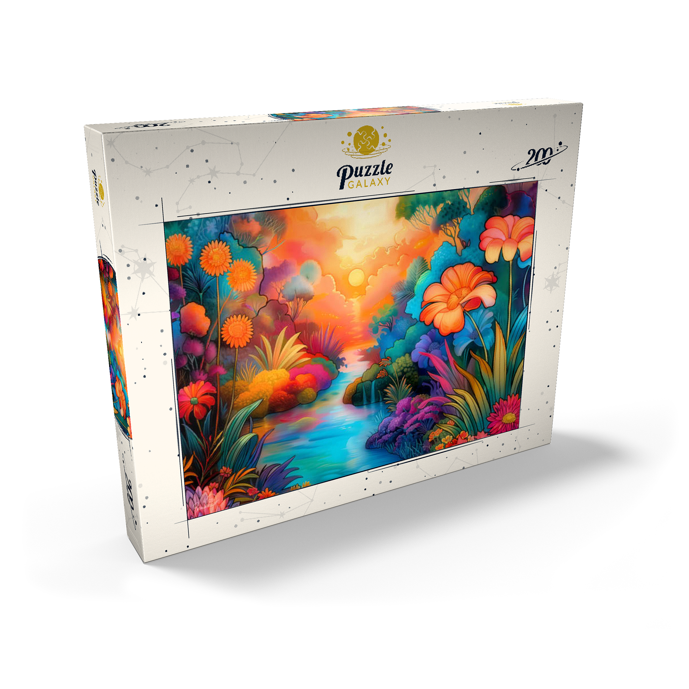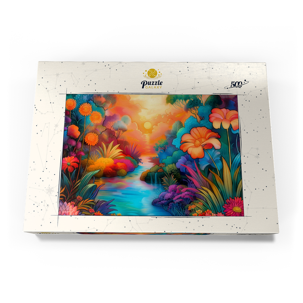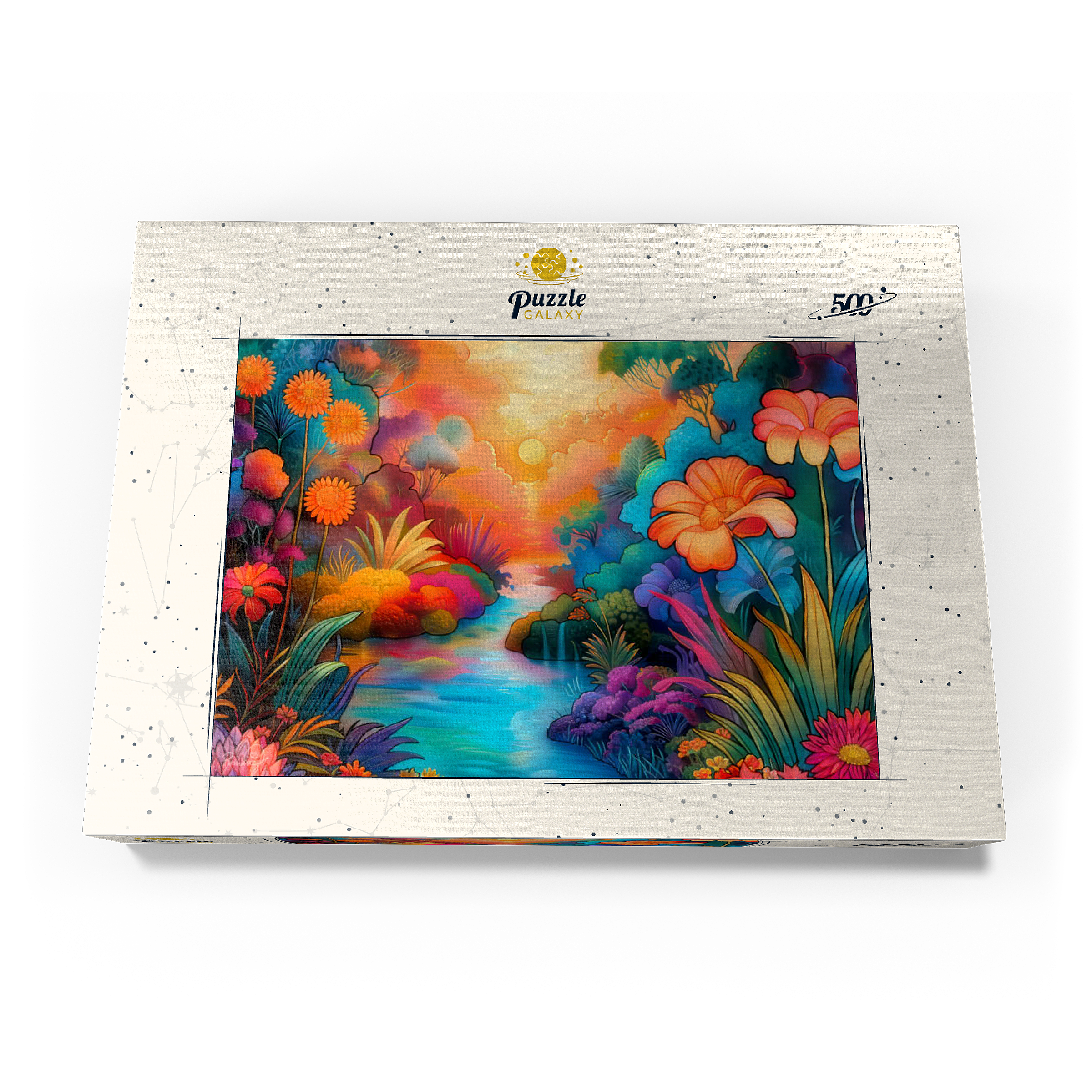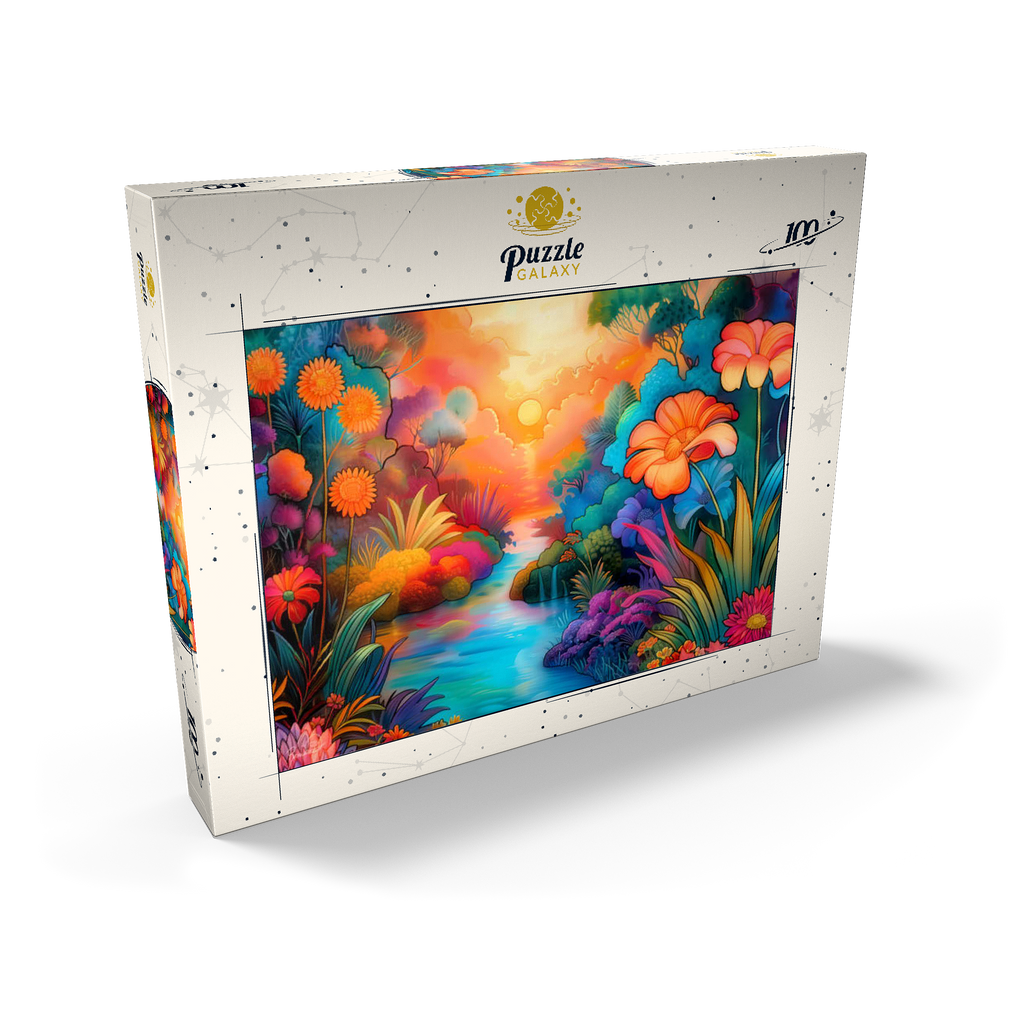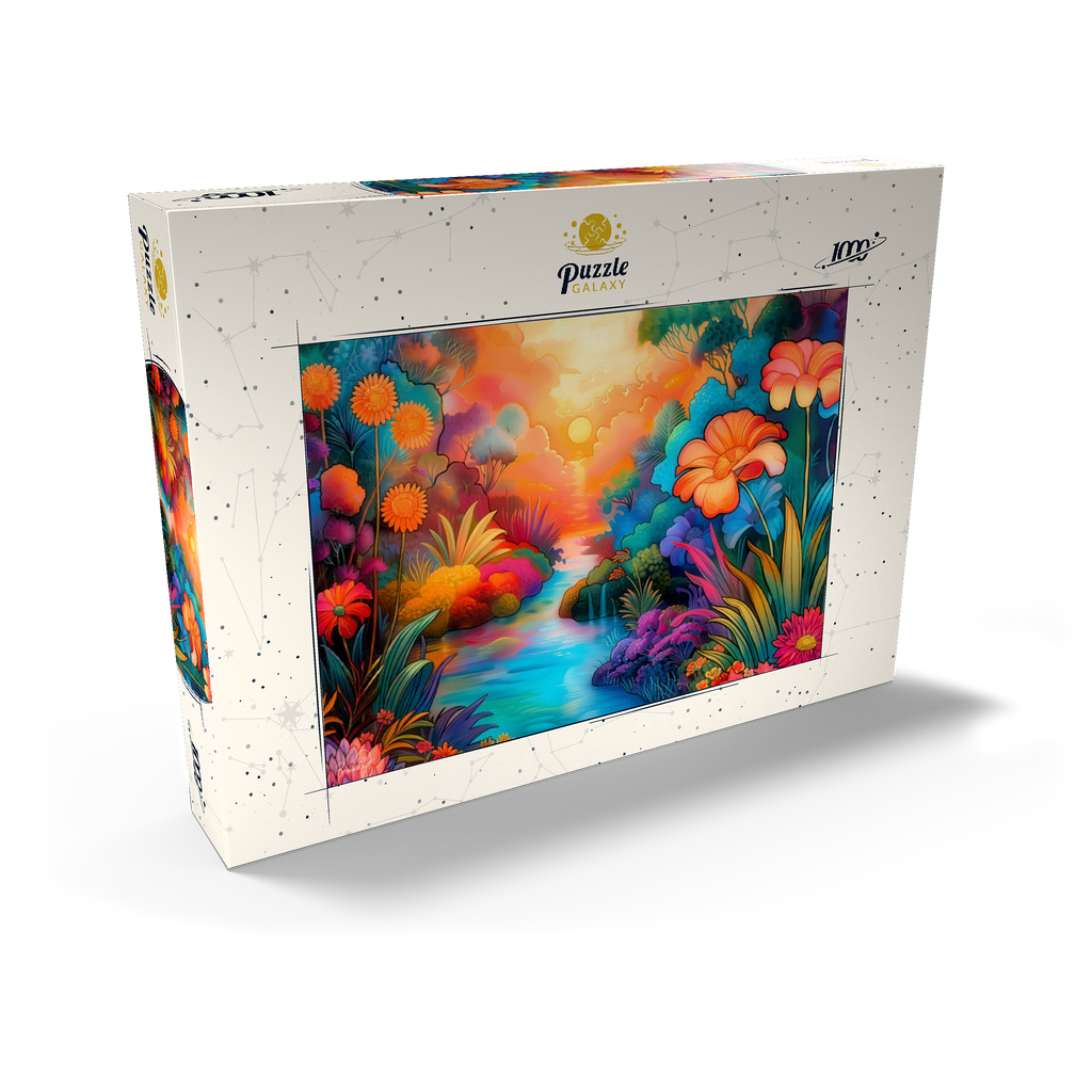 Diese surreale Landschaftskunst fängt ein traumhaftes Flusstal bei Sonnenuntergang ein, das in leuchtenden, fast magischen Farben erstrahlt. Der Himmel leuchtet in Orange-, Gold- und Rosatönen, während die Sonne untergeht und ein warmes Licht auf die reich strukturierte Flora wirft. Überdimensionale, farbenfrohe Blumen in Rot-, Blau- und Violetttönen blühen entlang der Flussufer, während fantastische Bäume und Pflanzen einen skurrilen Touch verleihen. Der türkisblaue Fluss schlängelt sich durch die Szene und spiegelt den atemberaubenden Himmel wider. Diese stark stilisierte und farbenfrohe Naturfantasie strahlt Ruhe, Kreativität und Staunen aus.