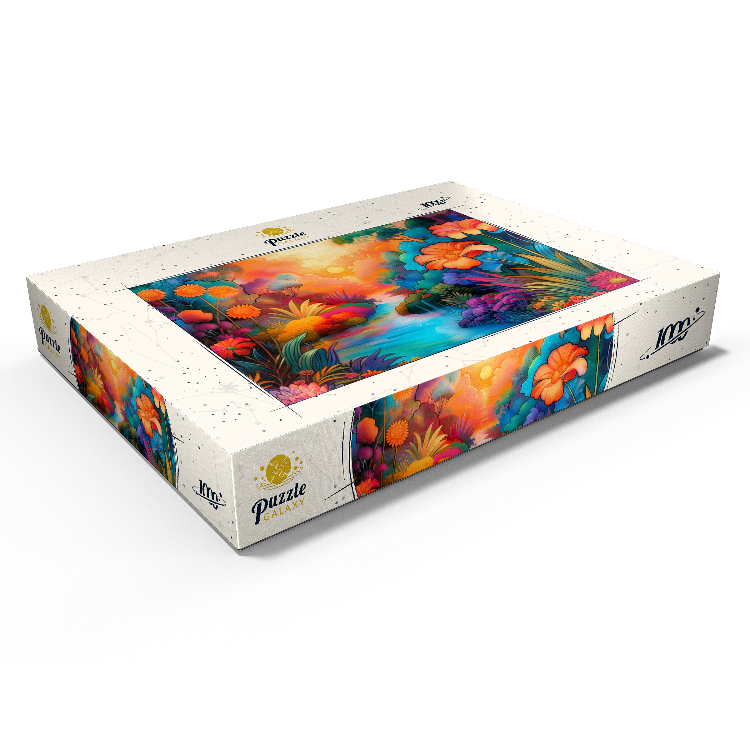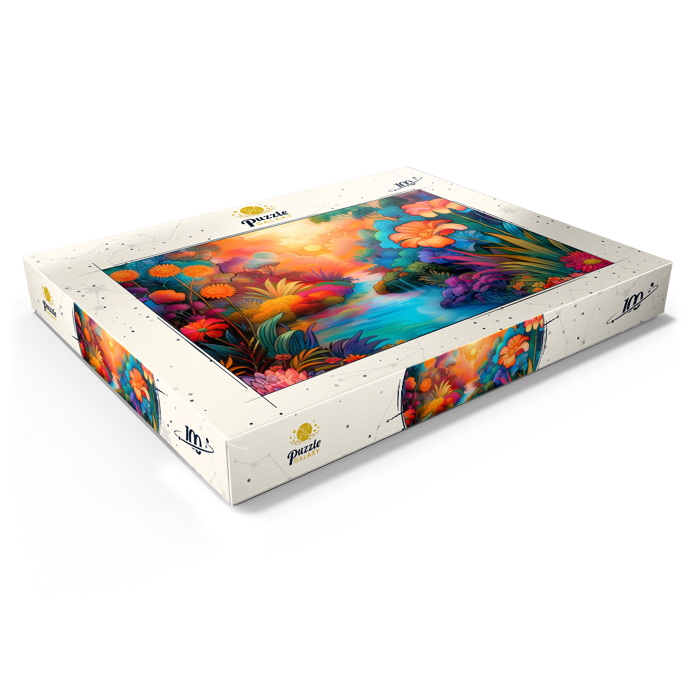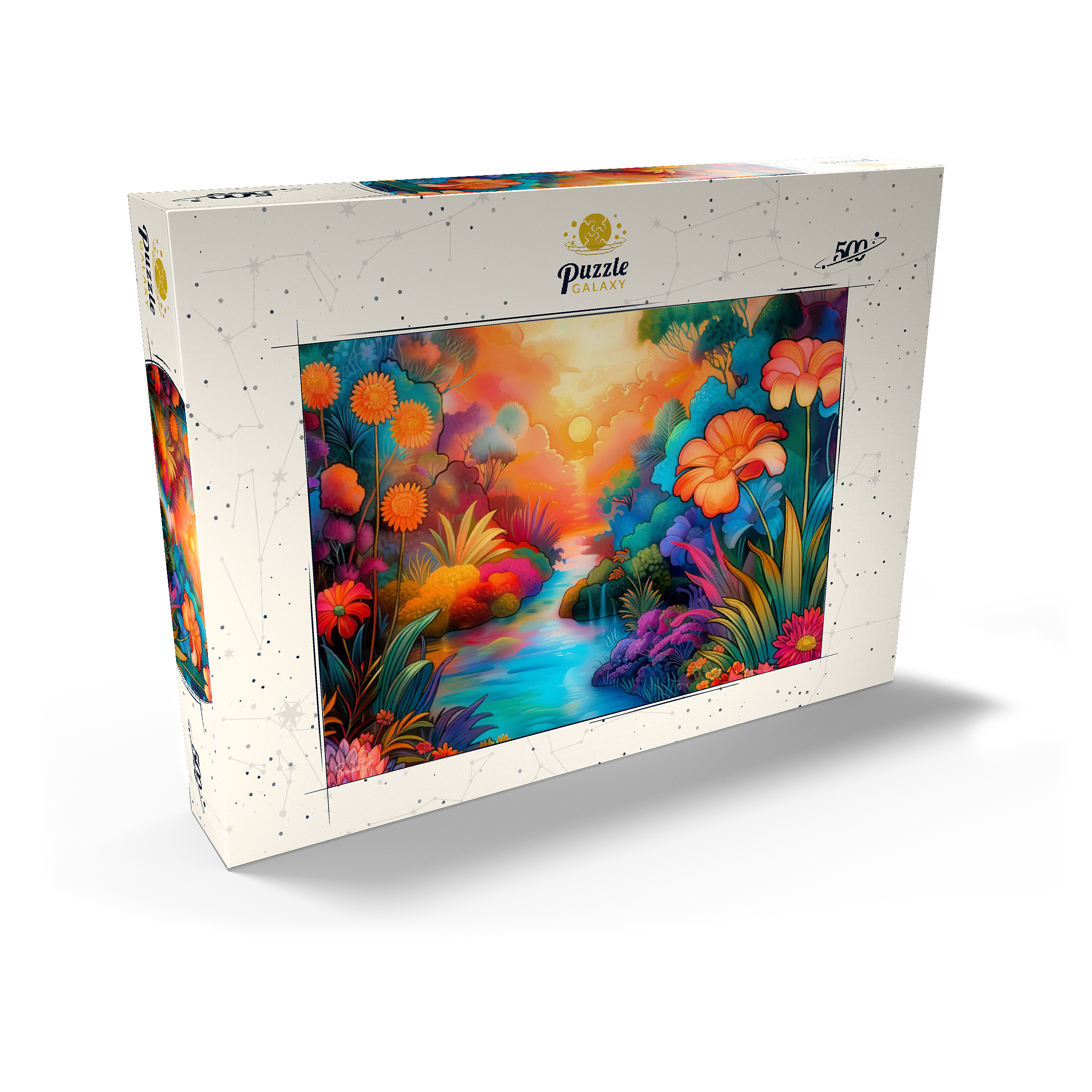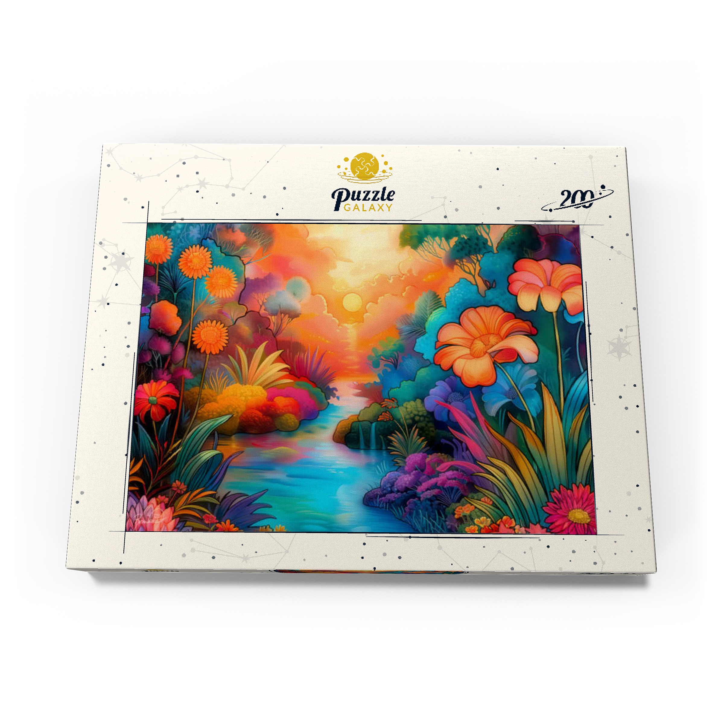 Diese surreale Landschaftskunst fängt ein traumhaftes Flusstal bei Sonnenuntergang ein, das in leuchtenden, fast magischen Farben erstrahlt. Der Himmel leuchtet in Orange-, Gold- und Rosatönen, während die Sonne untergeht und ein warmes Licht auf die reich strukturierte Flora wirft. Überdimensionale, farbenfrohe Blumen in Rot-, Blau- und Violetttönen blühen entlang der Flussufer, während fantastische Bäume und Pflanzen einen skurrilen Touch verleihen. Der türkisblaue Fluss schlängelt sich durch die Szene und spiegelt den atemberaubenden Himmel wider. Diese stark stilisierte und farbenfrohe Naturfantasie strahlt Ruhe, Kreativität und Staunen aus.