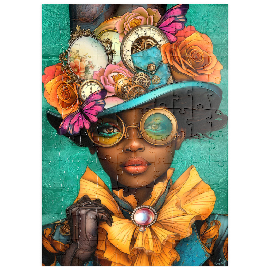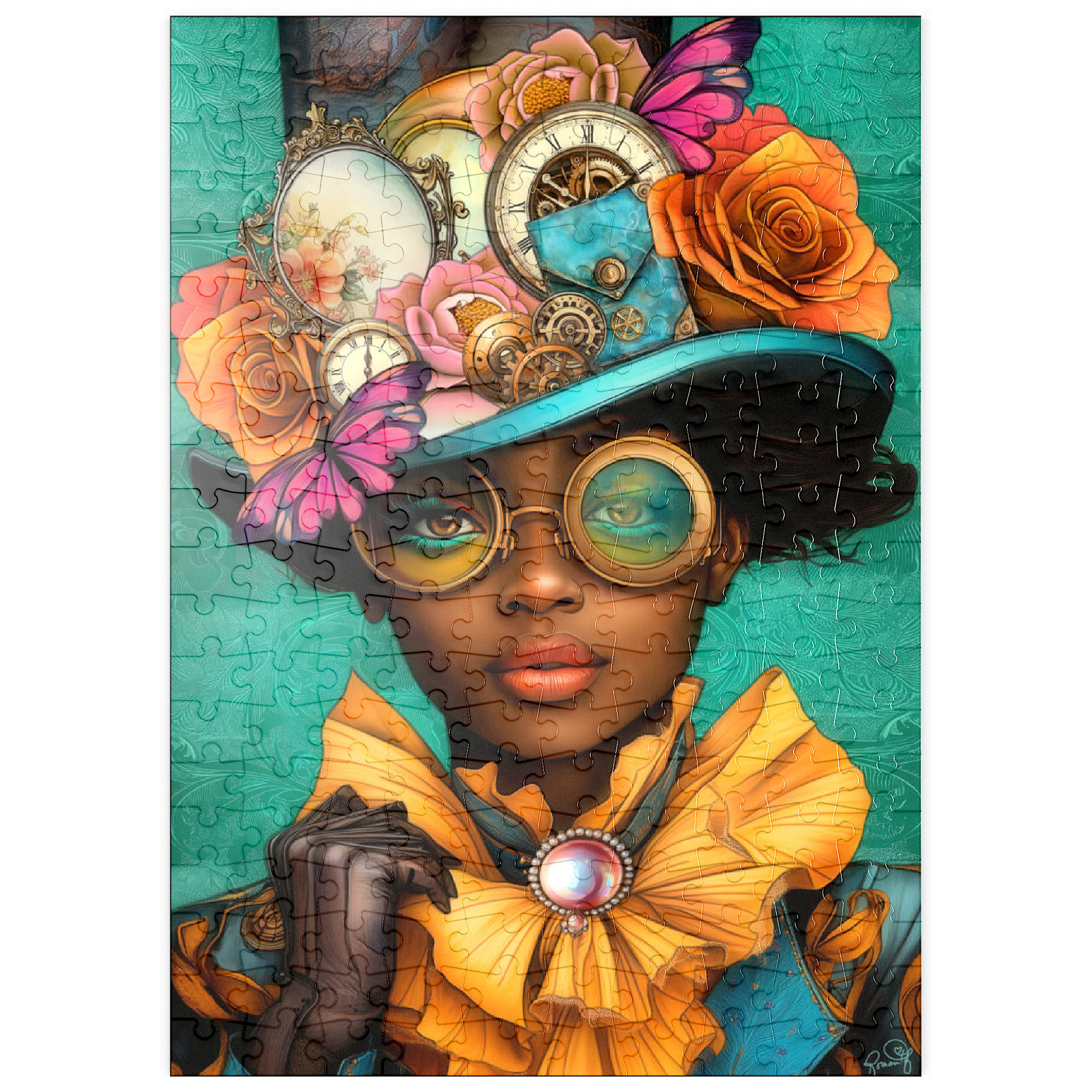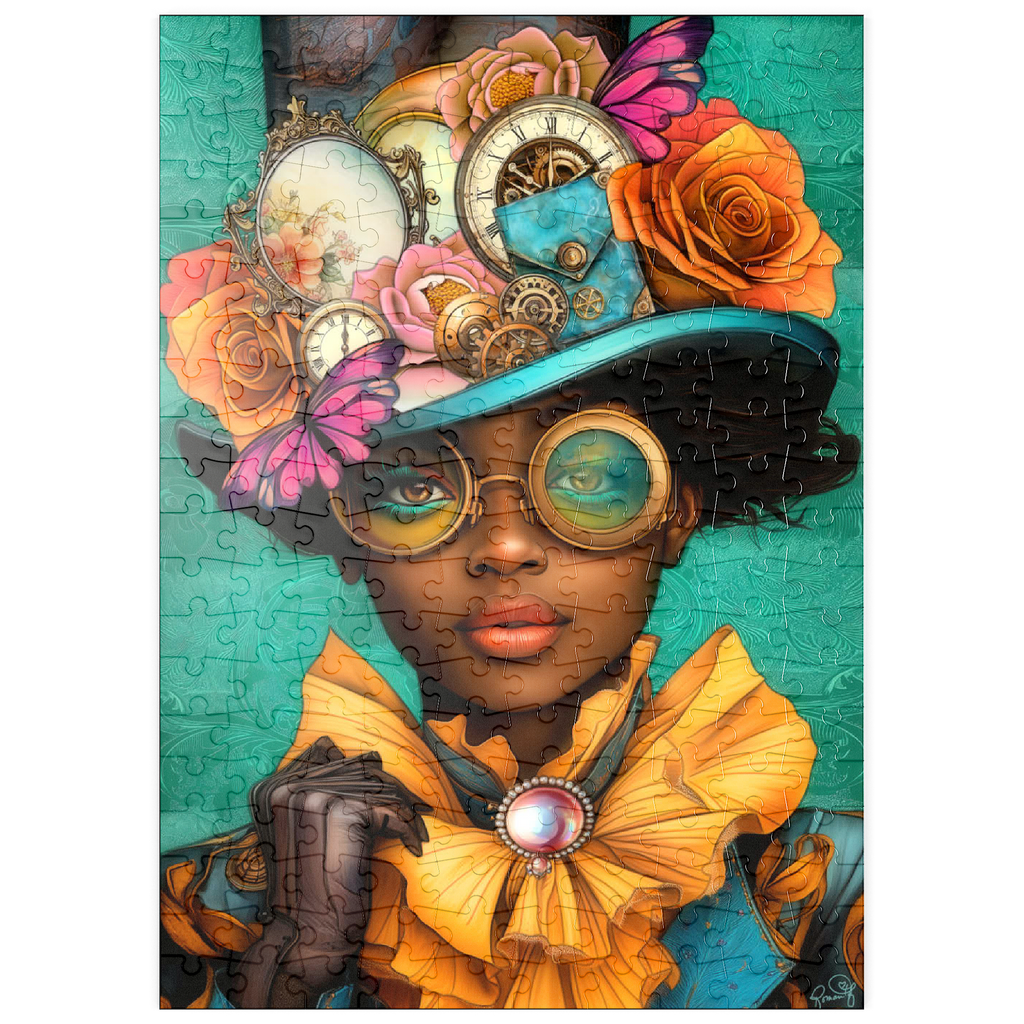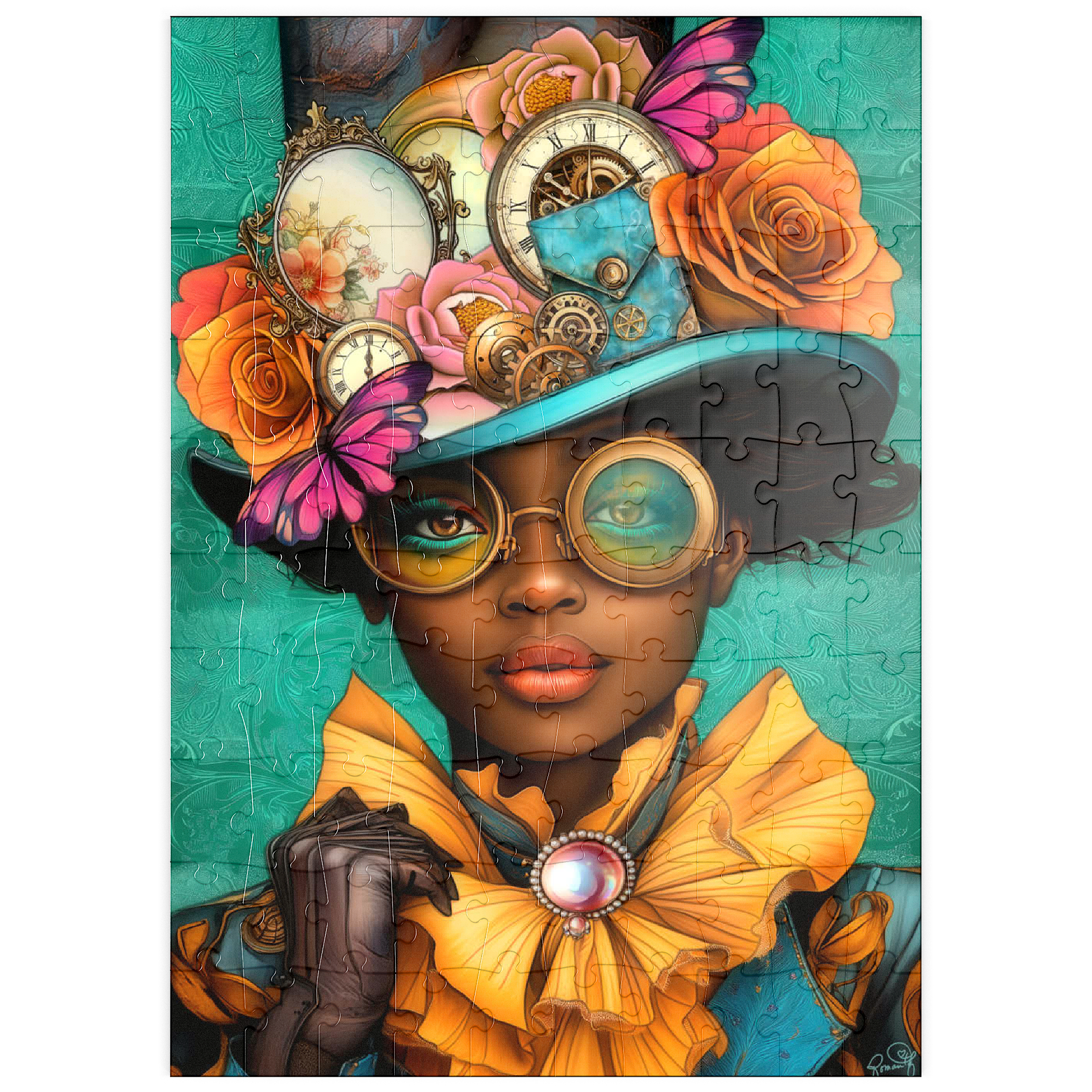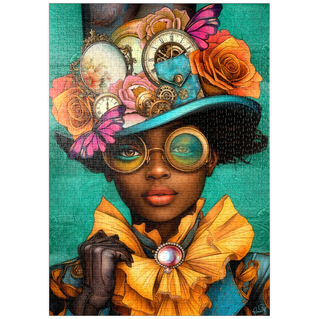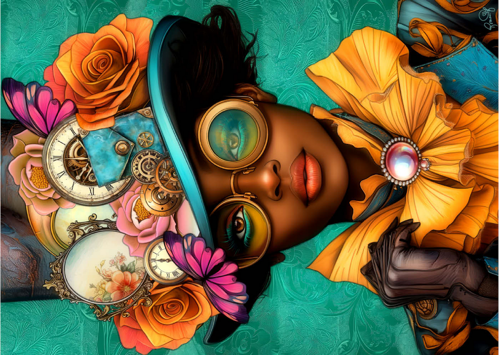 Ein auffälliges, vom Steampunk inspiriertes digitales Kunstwerk, das eine selbstbewusste Frau zeigt, die einen leuchtend türkisfarbenen Hut trägt, der mit filigranen Zahnrädern, Vintage-Uhren und zarten Blumen in Orange-, Rosa- und Goldtönen verziert ist. Ihre auffälligen, gelb getönten Schutzbrillen und der dazu passende goldene Rüschenkragen verleihen ihr einen dramatischen Touch, während die elegante Perlenbrosche die viktorianische Ästhetik unterstreicht. Der blaugrüne Hintergrund mit kunstvollen Mustern ergänzt die lebhaften Farbtöne und Steampunk-Elemente. Dieses detailreiche Kunstwerk ist perfekt für Fans von Steampunk-Mode, Fantasy-Porträts und retro-futuristischen Motiven. Eine ausgezeichnete Wahl als Wanddekoration, Design-Inspiration oder als einzigartiges Statement-Stück für jede Sammlung.