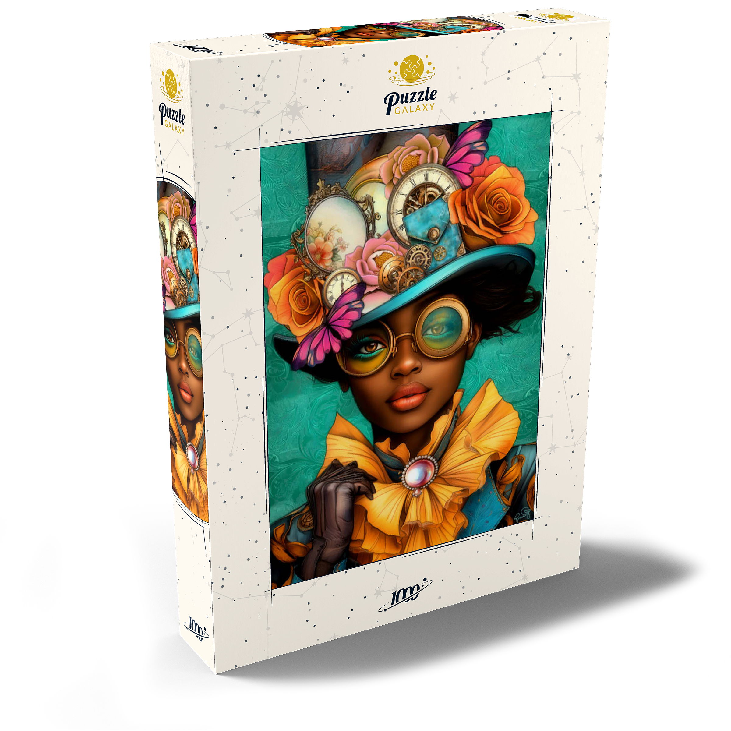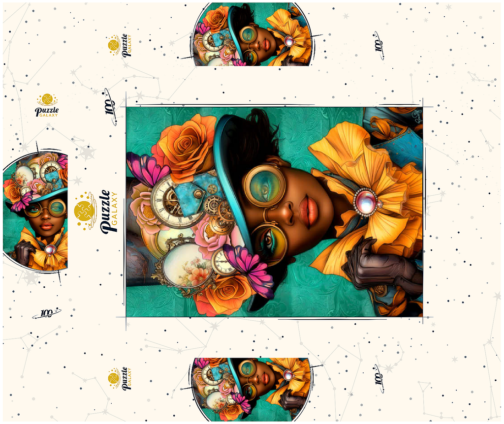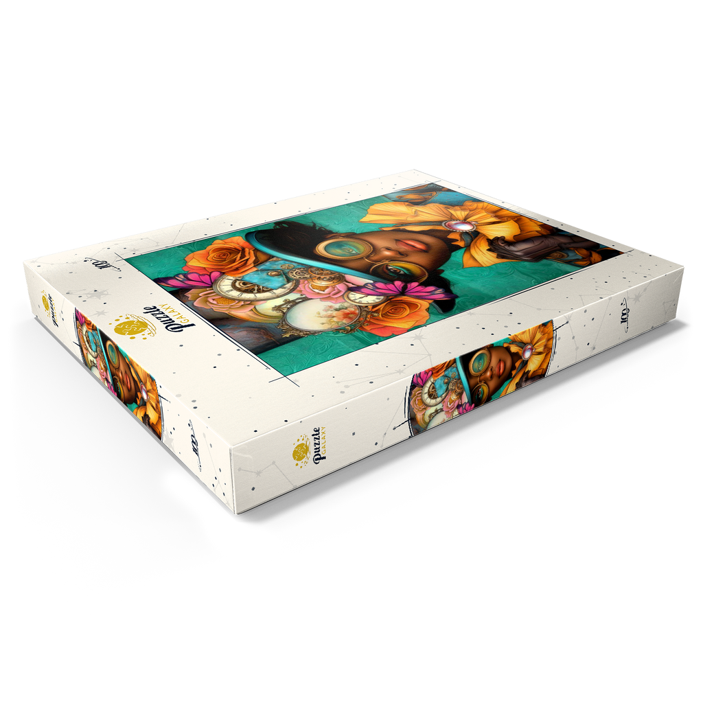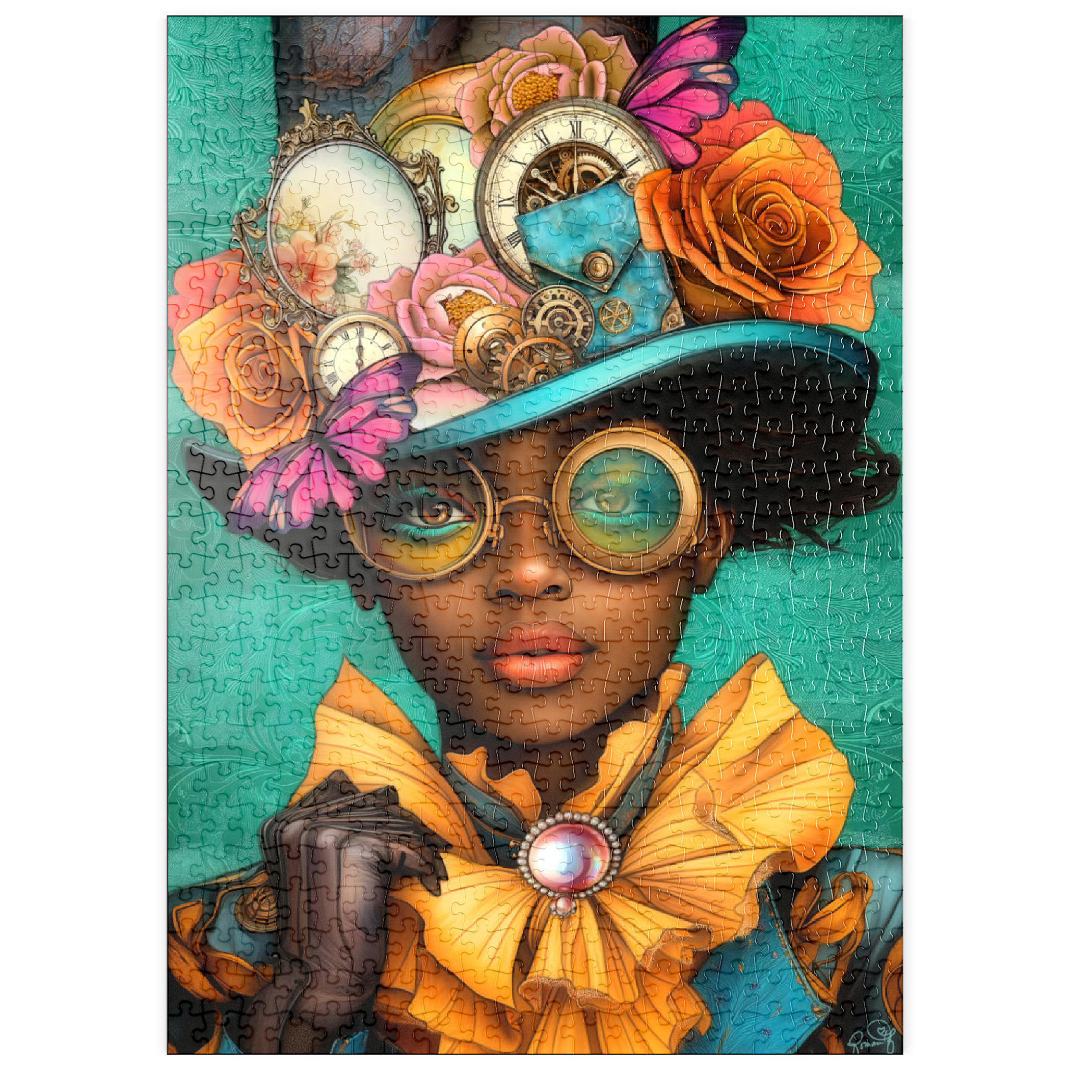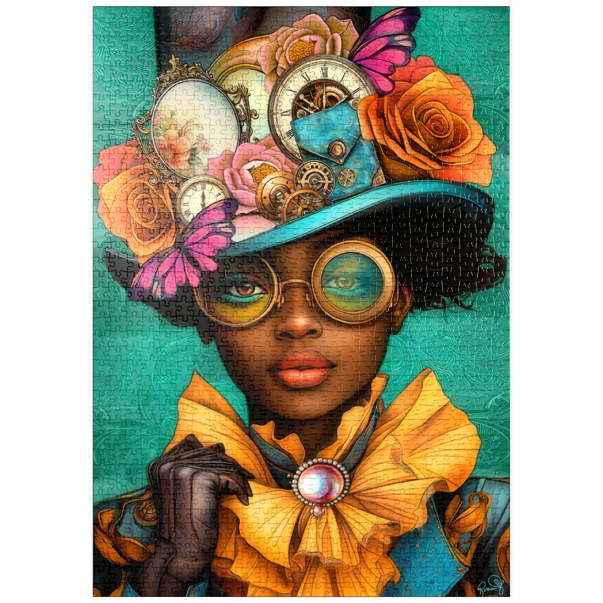 Ein auffälliges, vom Steampunk inspiriertes digitales Kunstwerk, das eine selbstbewusste Frau zeigt, die einen leuchtend türkisfarbenen Hut trägt, der mit filigranen Zahnrädern, Vintage-Uhren und zarten Blumen in Orange-, Rosa- und Goldtönen verziert ist. Ihre auffälligen, gelb getönten Schutzbrillen und der dazu passende goldene Rüschenkragen verleihen ihr einen dramatischen Touch, während die elegante Perlenbrosche die viktorianische Ästhetik unterstreicht. Der blaugrüne Hintergrund mit kunstvollen Mustern ergänzt die lebhaften Farbtöne und Steampunk-Elemente. Dieses detailreiche Kunstwerk ist perfekt für Fans von Steampunk-Mode, Fantasy-Porträts und retro-futuristischen Motiven. Eine ausgezeichnete Wahl als Wanddekoration, Design-Inspiration oder als einzigartiges Statement-Stück für jede Sammlung.