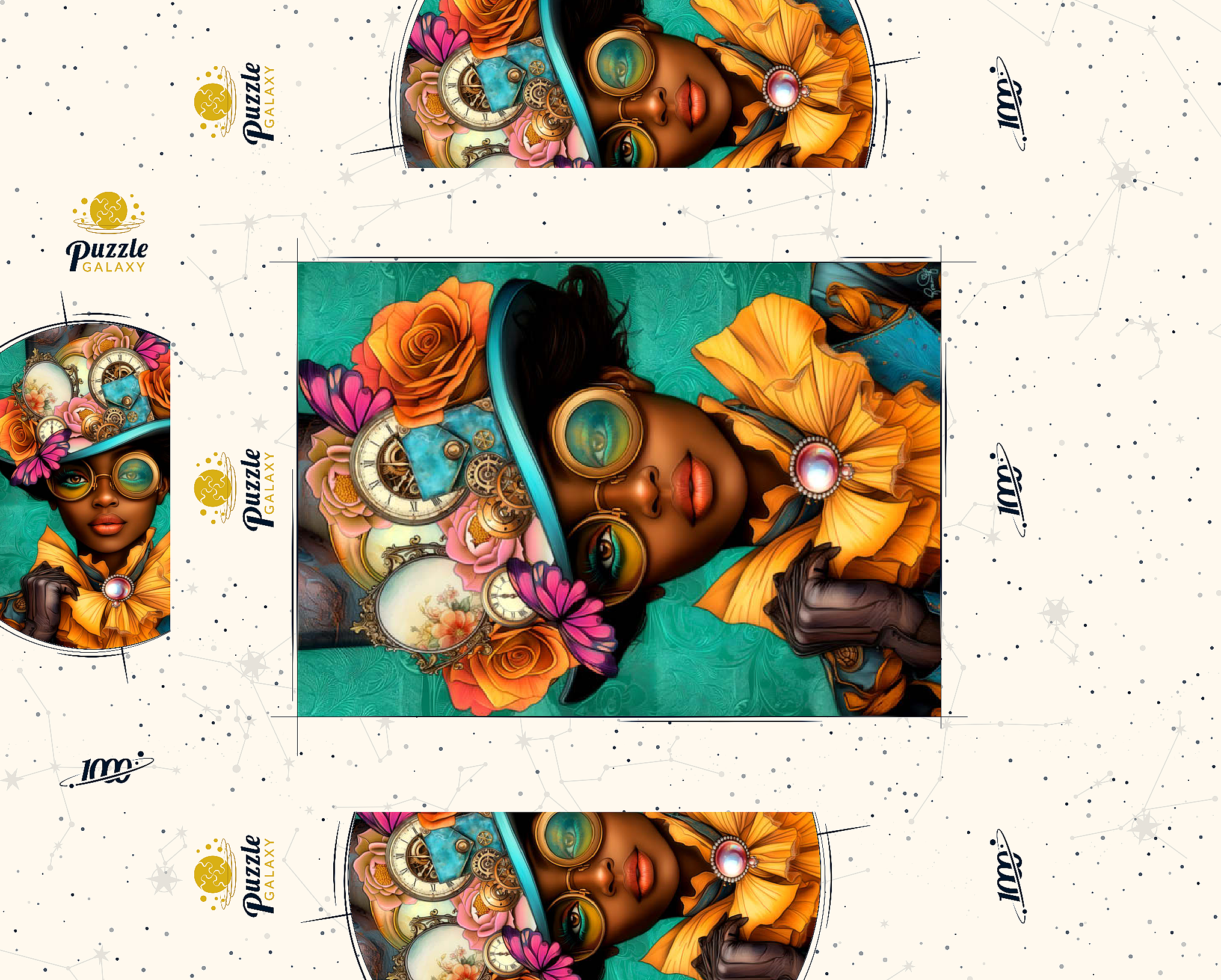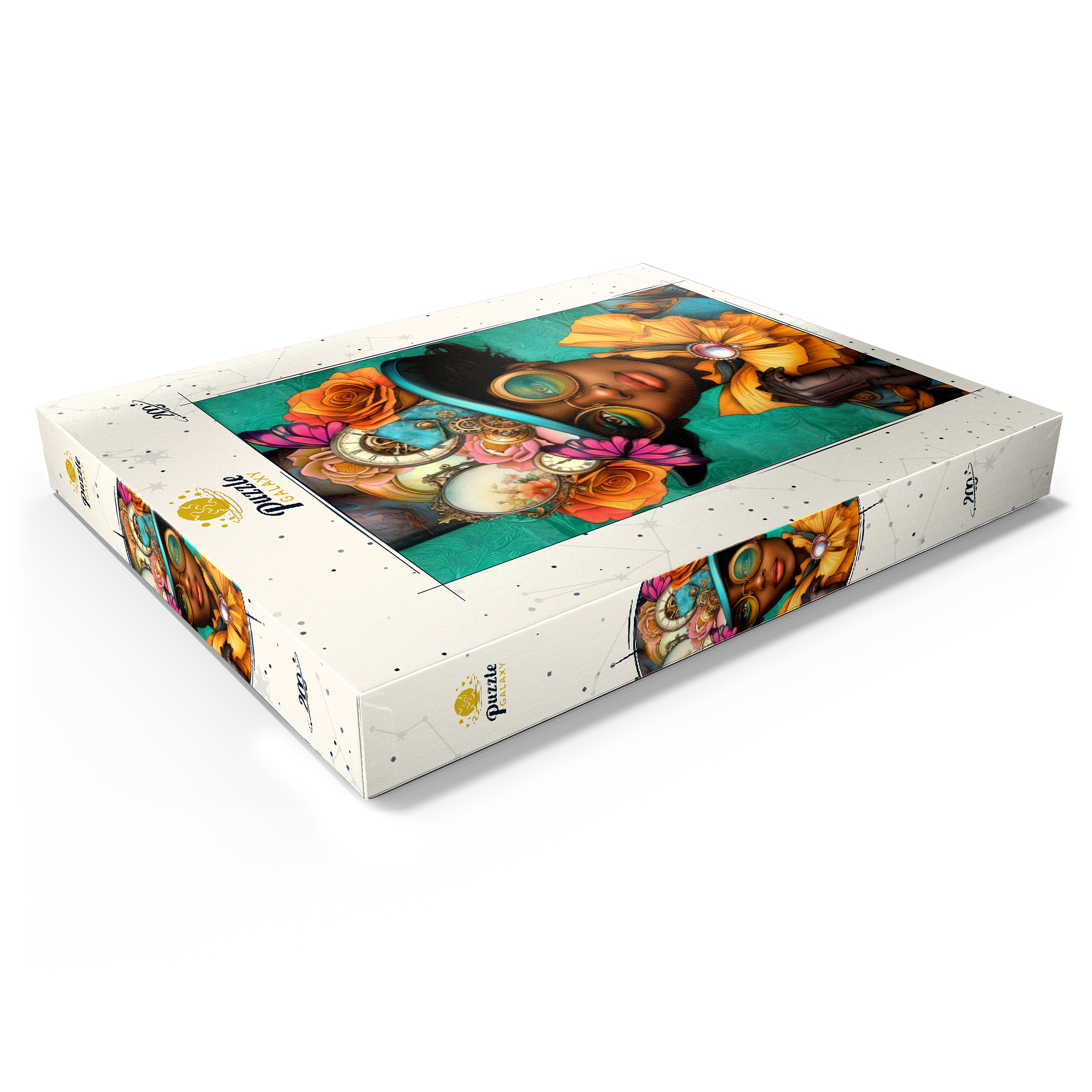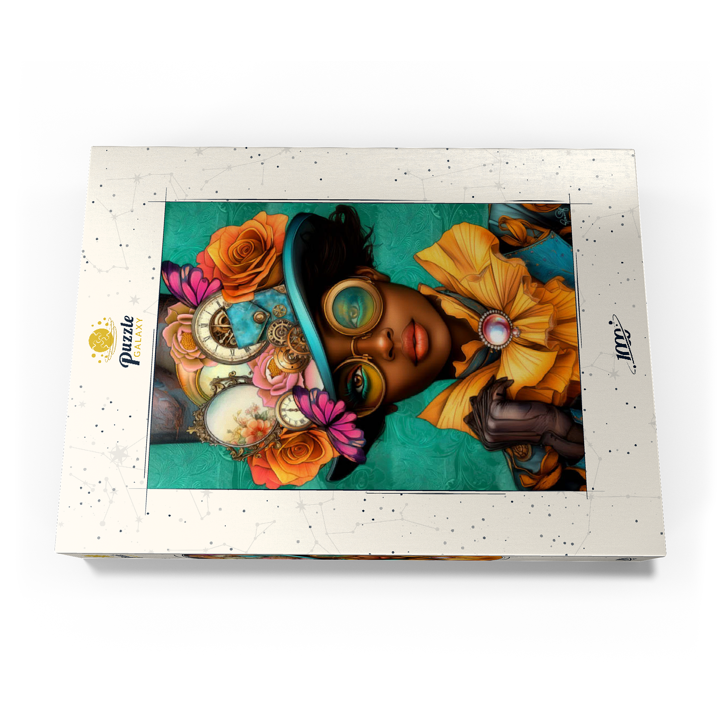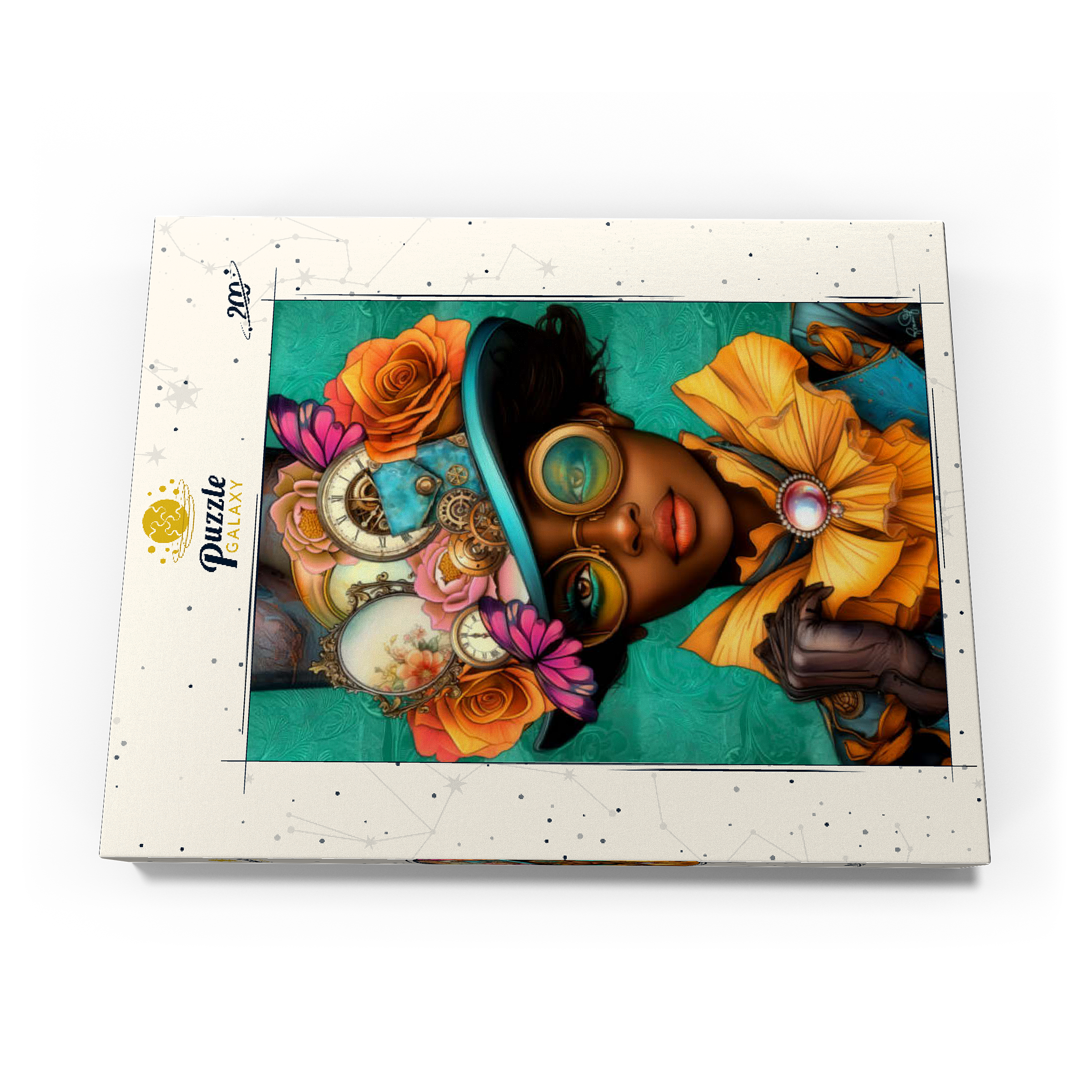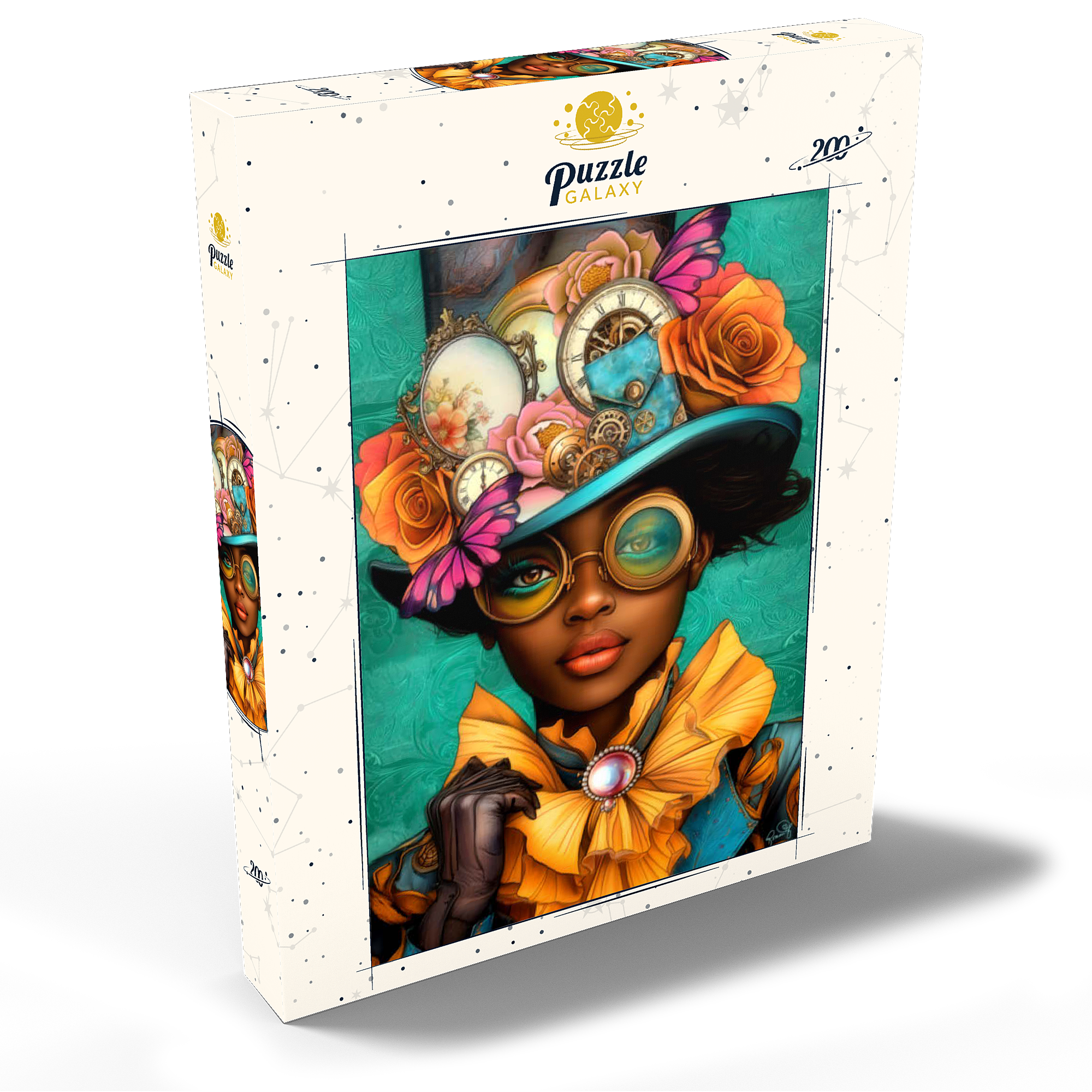 Ein auffälliges, vom Steampunk inspiriertes digitales Kunstwerk, das eine selbstbewusste Frau zeigt, die einen leuchtend türkisfarbenen Hut trägt, der mit filigranen Zahnrädern, Vintage-Uhren und zarten Blumen in Orange-, Rosa- und Goldtönen verziert ist. Ihre auffälligen, gelb getönten Schutzbrillen und der dazu passende goldene Rüschenkragen verleihen ihr einen dramatischen Touch, während die elegante Perlenbrosche die viktorianische Ästhetik unterstreicht. Der blaugrüne Hintergrund mit kunstvollen Mustern ergänzt die lebhaften Farbtöne und Steampunk-Elemente. Dieses detailreiche Kunstwerk ist perfekt für Fans von Steampunk-Mode, Fantasy-Porträts und retro-futuristischen Motiven. Eine ausgezeichnete Wahl als Wanddekoration, Design-Inspiration oder als einzigartiges Statement-Stück für jede Sammlung.