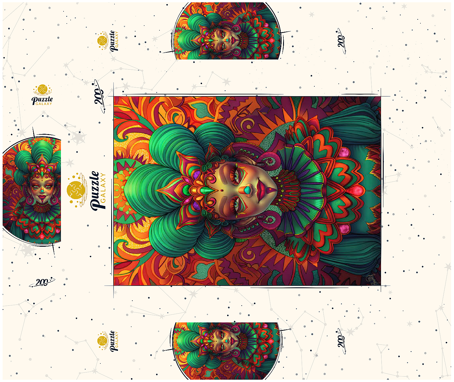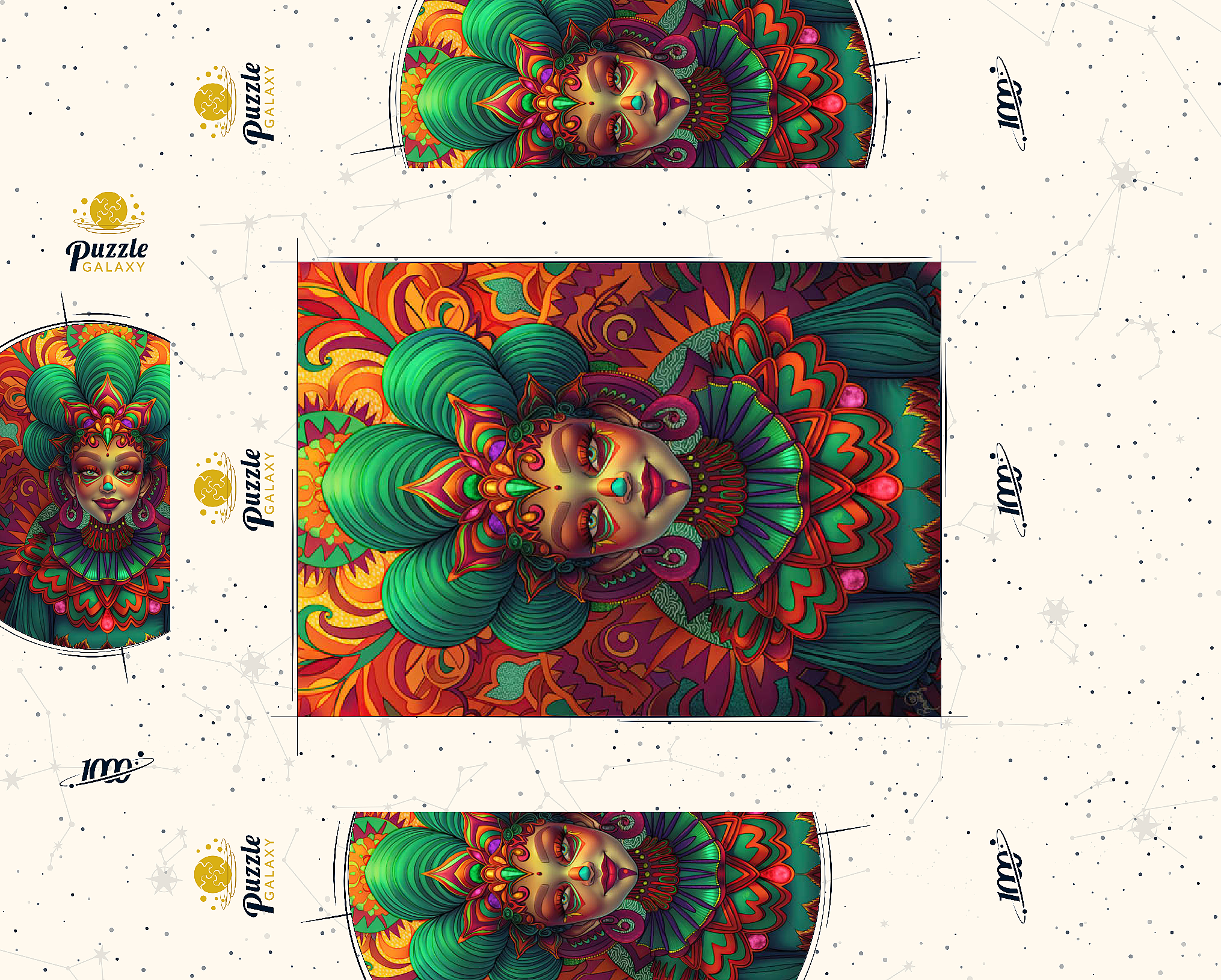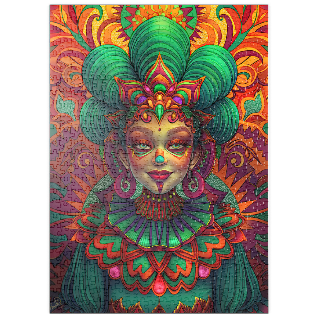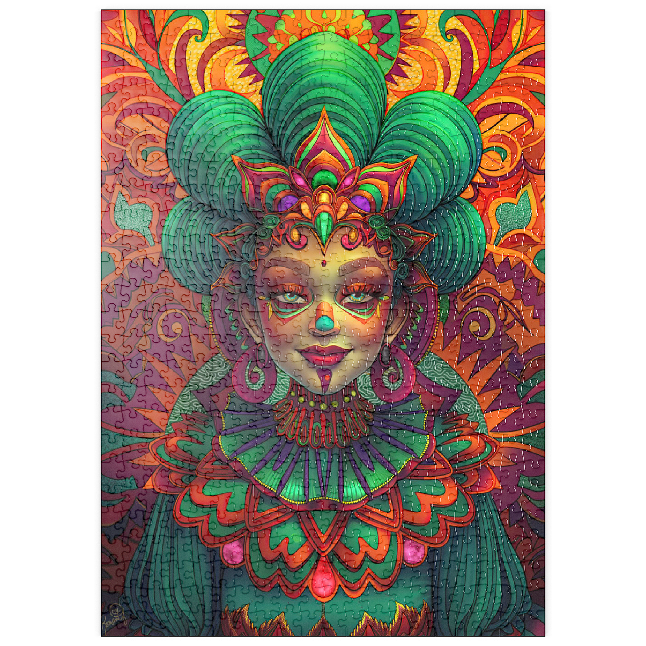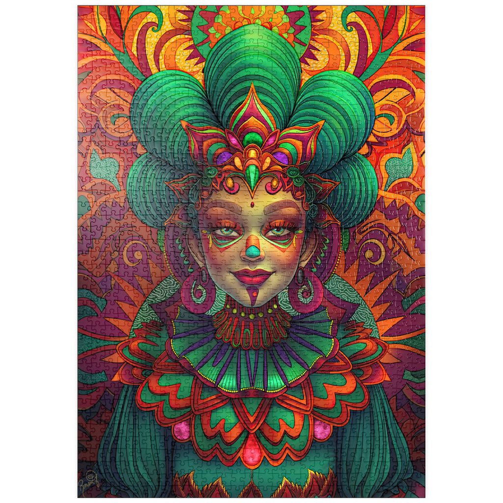 Ein atemberaubendes digitales Kunstwerk, das eine königliche Frau in aufwendiger traditioneller Kleidung zeigt, die lebhafte Grün-, Rot- und Goldtöne kombiniert. Ihr auffälliges smaragdgrünes Haar ist zu voluminösen, dekorativen Formen gestylt und passt perfekt zu ihrer kunstvollen Kopfbedeckung, die mit Edelsteinen und komplizierten Mustern verziert ist. Ihr selbstbewusster Ausdruck wird durch kunstvolle Gesichtsbemalungen und auffälliges, dramatisches Make-up unterstrichen. Der mehrlagige, gerüschte Kragen und die detailreiche Kleidung vermitteln einen Eindruck von zeremonieller Eleganz. Umgeben von einem lebhaften, symmetrischen Hintergrund aus wirbelnden Mustern ist dieses Kunstwerk perfekt für Liebhaber von Fantasy-Porträts, kultureller Kunst und dekorativer Ästhetik. Ideal als Wandkunst oder Inspiration für kreatives Design.