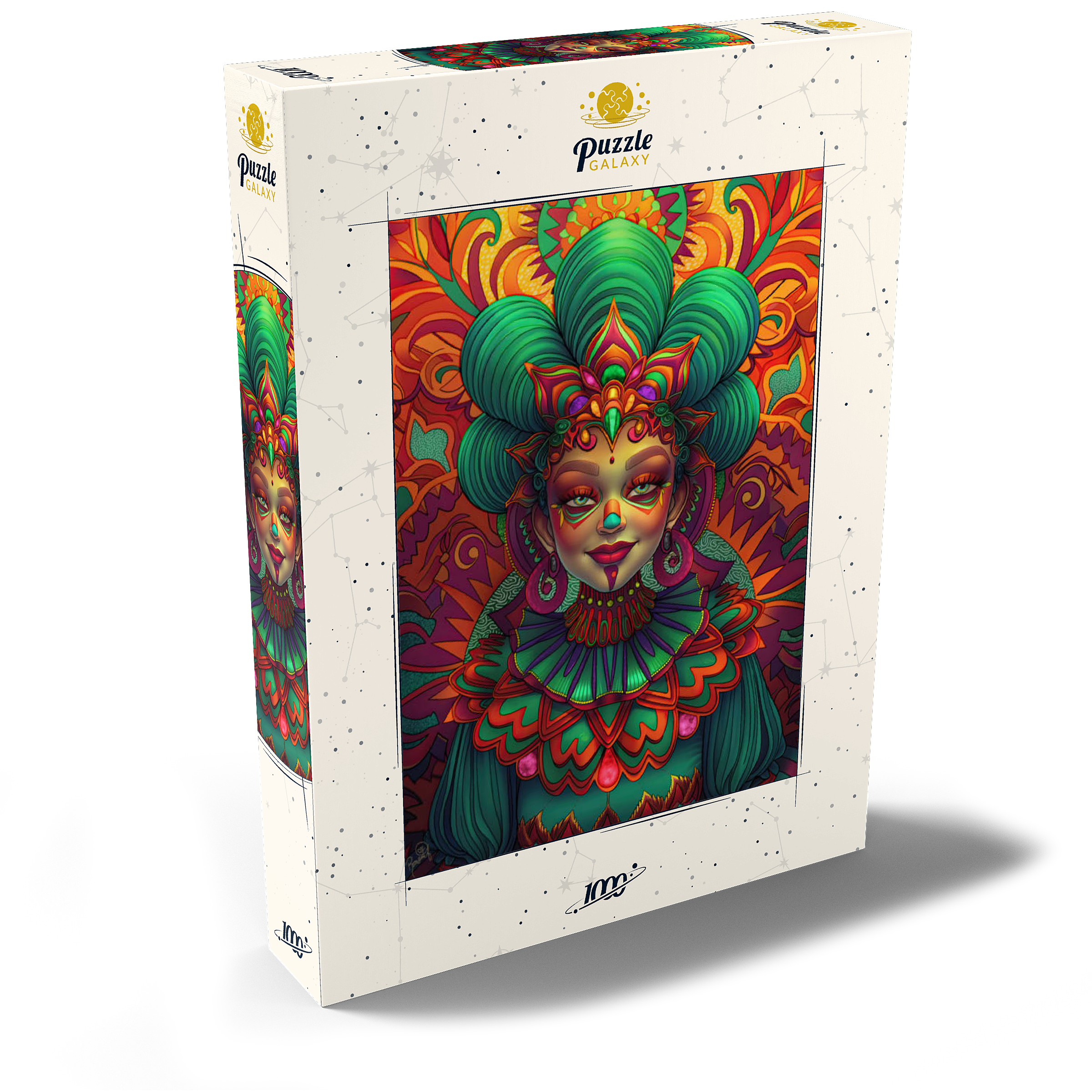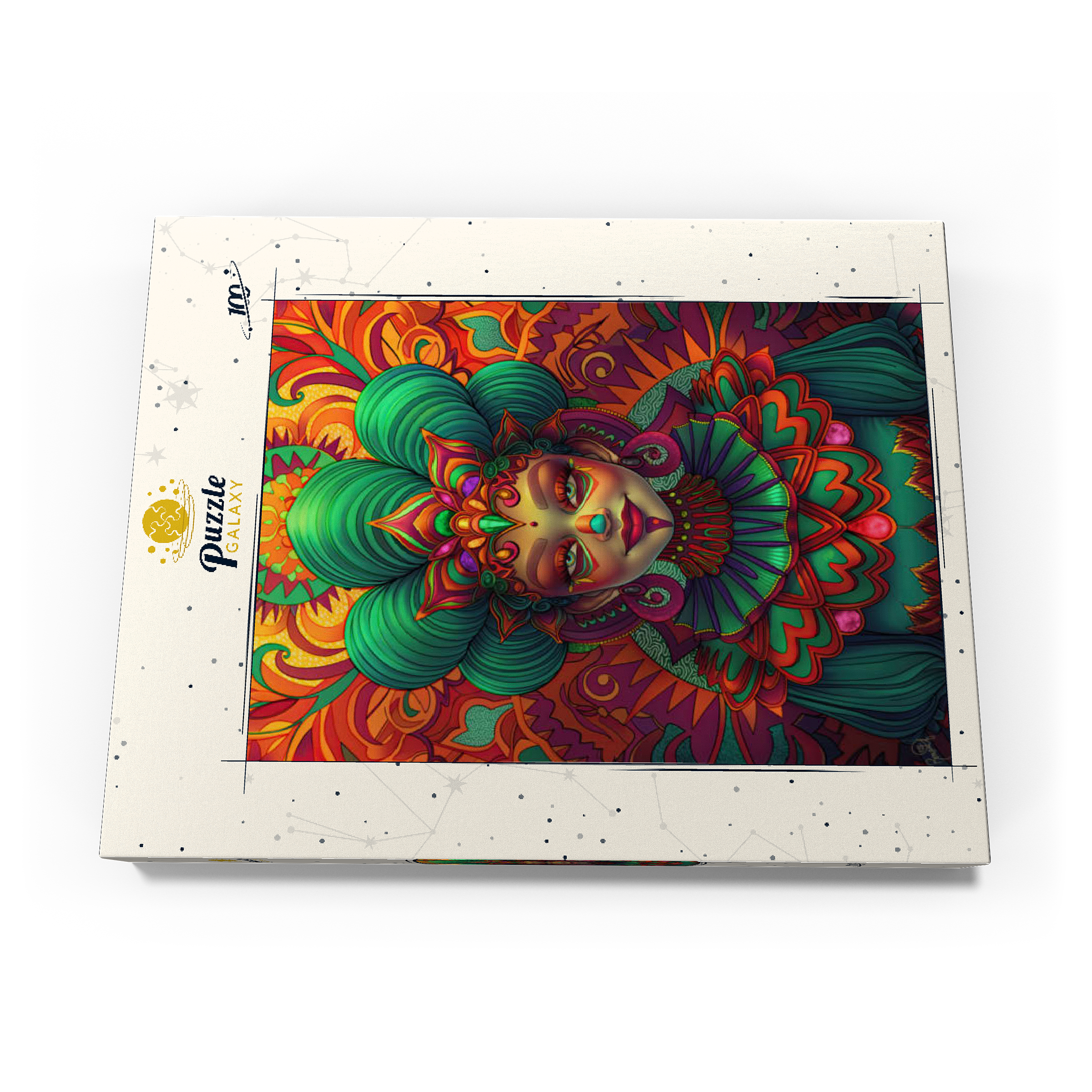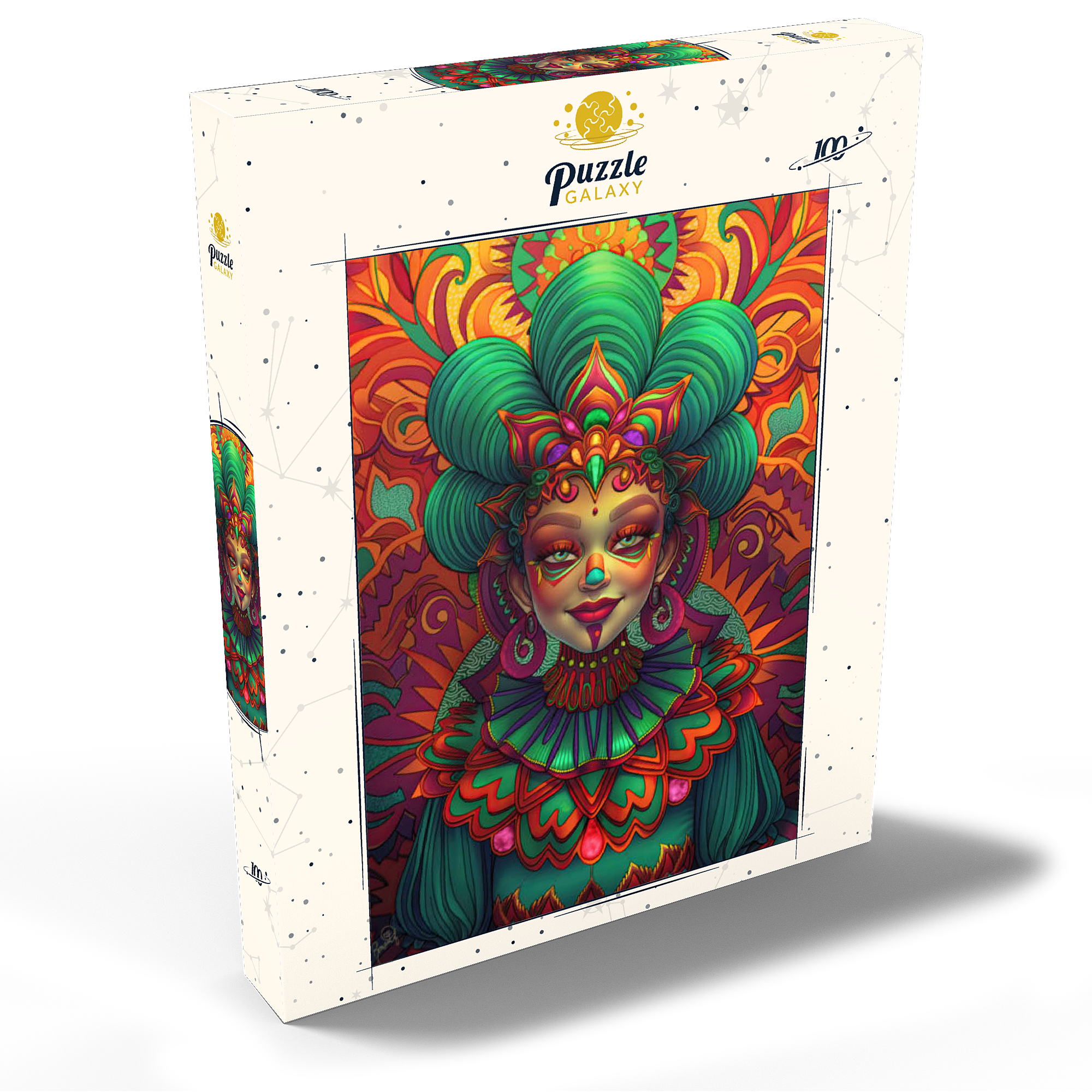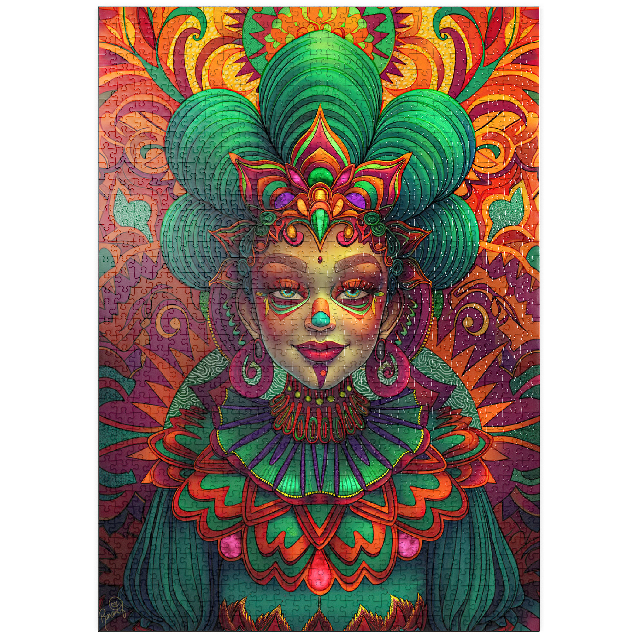 Ein atemberaubendes digitales Kunstwerk, das eine königliche Frau in aufwendiger traditioneller Kleidung zeigt, die lebhafte Grün-, Rot- und Goldtöne kombiniert. Ihr auffälliges smaragdgrünes Haar ist zu voluminösen, dekorativen Formen gestylt und passt perfekt zu ihrer kunstvollen Kopfbedeckung, die mit Edelsteinen und komplizierten Mustern verziert ist. Ihr selbstbewusster Ausdruck wird durch kunstvolle Gesichtsbemalungen und auffälliges, dramatisches Make-up unterstrichen. Der mehrlagige, gerüschte Kragen und die detailreiche Kleidung vermitteln einen Eindruck von zeremonieller Eleganz. Umgeben von einem lebhaften, symmetrischen Hintergrund aus wirbelnden Mustern ist dieses Kunstwerk perfekt für Liebhaber von Fantasy-Porträts, kultureller Kunst und dekorativer Ästhetik. Ideal als Wandkunst oder Inspiration für kreatives Design.