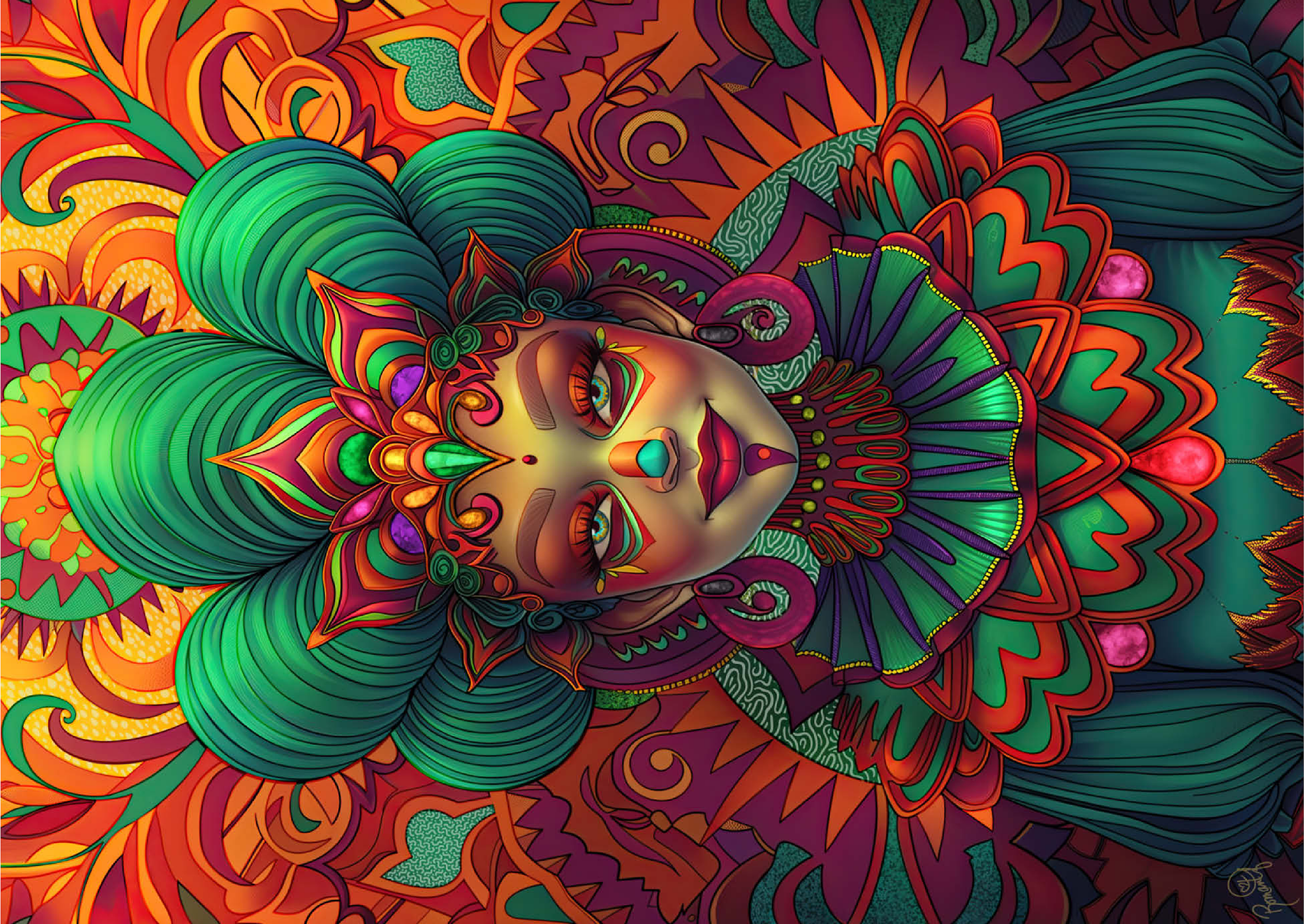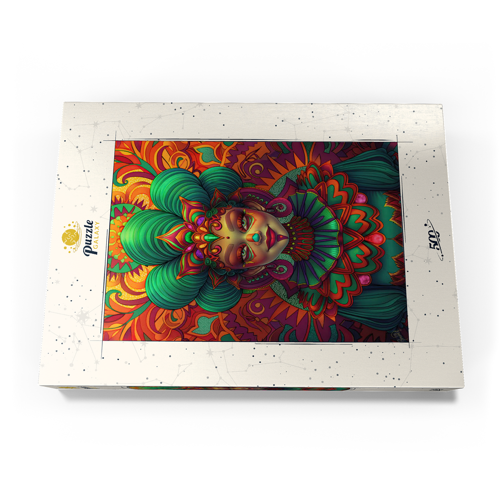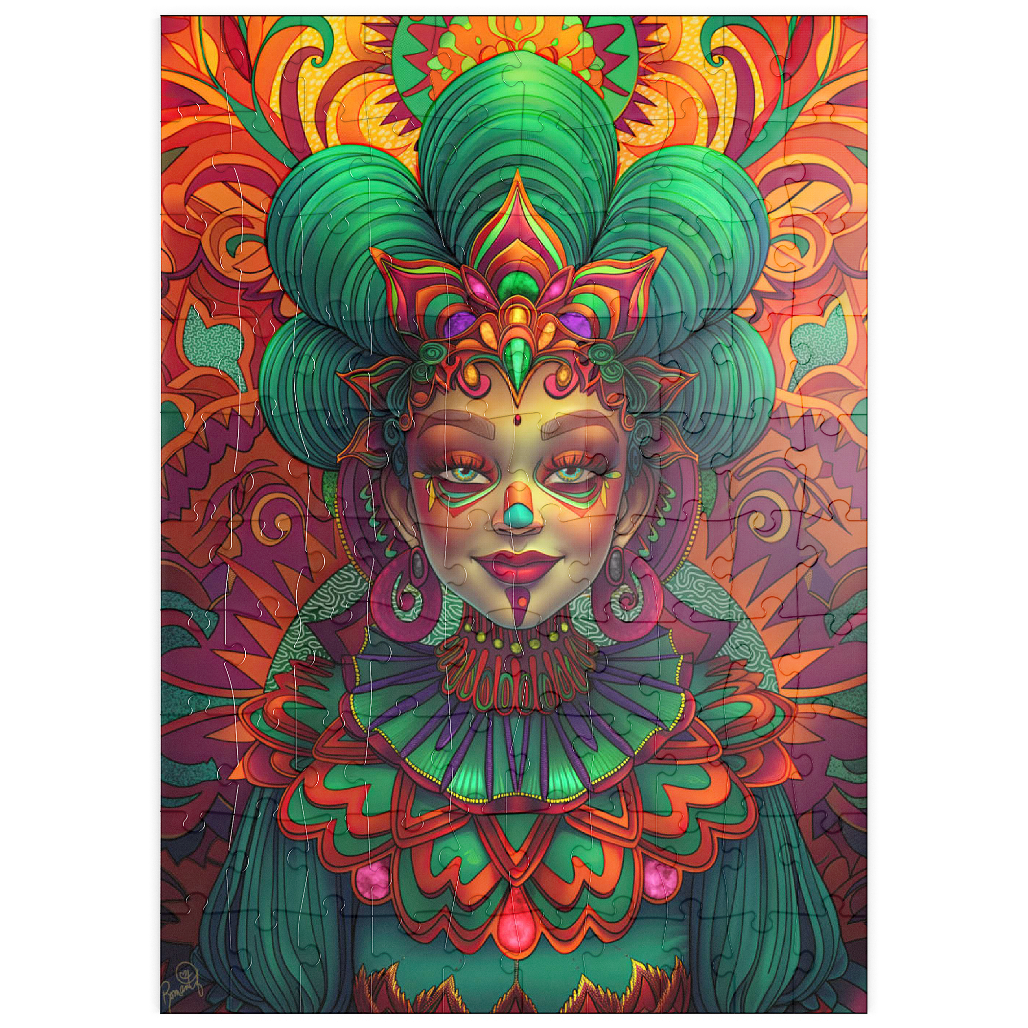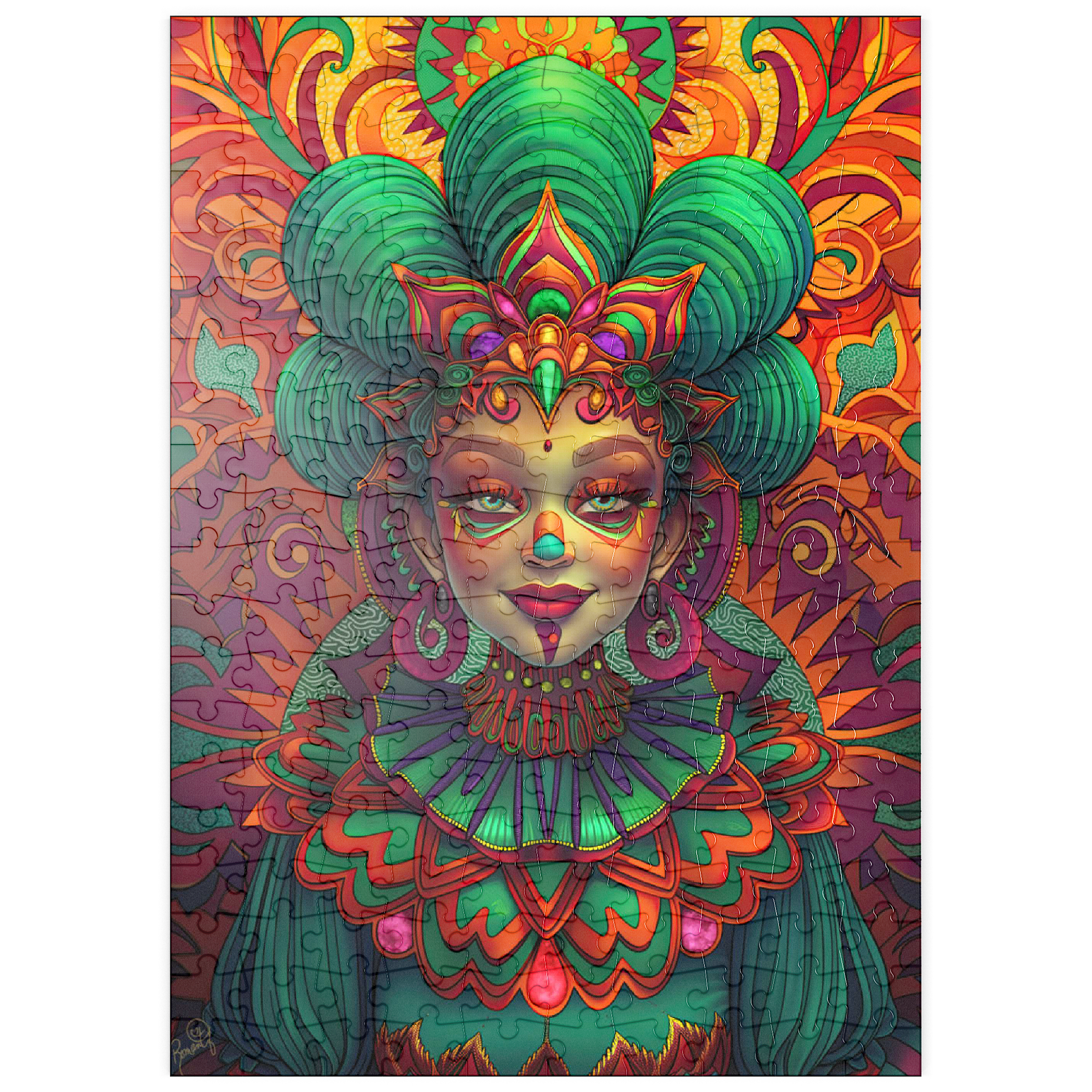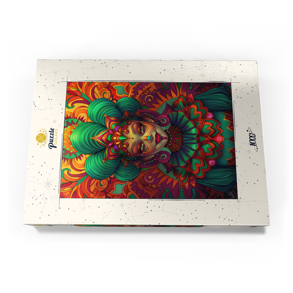Ein atemberaubendes digitales Kunstwerk, das eine königliche Frau in aufwendiger traditioneller Kleidung zeigt, die lebhafte Grün-, Rot- und Goldtöne kombiniert. Ihr auffälliges smaragdgrünes Haar ist zu voluminösen, dekorativen Formen gestylt und passt perfekt zu ihrer kunstvollen Kopfbedeckung, die mit Edelsteinen und komplizierten Mustern verziert ist. Ihr selbstbewusster Ausdruck wird durch kunstvolle Gesichtsbemalungen und auffälliges, dramatisches Make-up unterstrichen. Der mehrlagige, gerüschte Kragen und die detailreiche Kleidung vermitteln einen Eindruck von zeremonieller Eleganz. Umgeben von einem lebhaften, symmetrischen Hintergrund aus wirbelnden Mustern ist dieses Kunstwerk perfekt für Liebhaber von Fantasy-Porträts, kultureller Kunst und dekorativer Ästhetik. Ideal als Wandkunst oder Inspiration für kreatives Design.