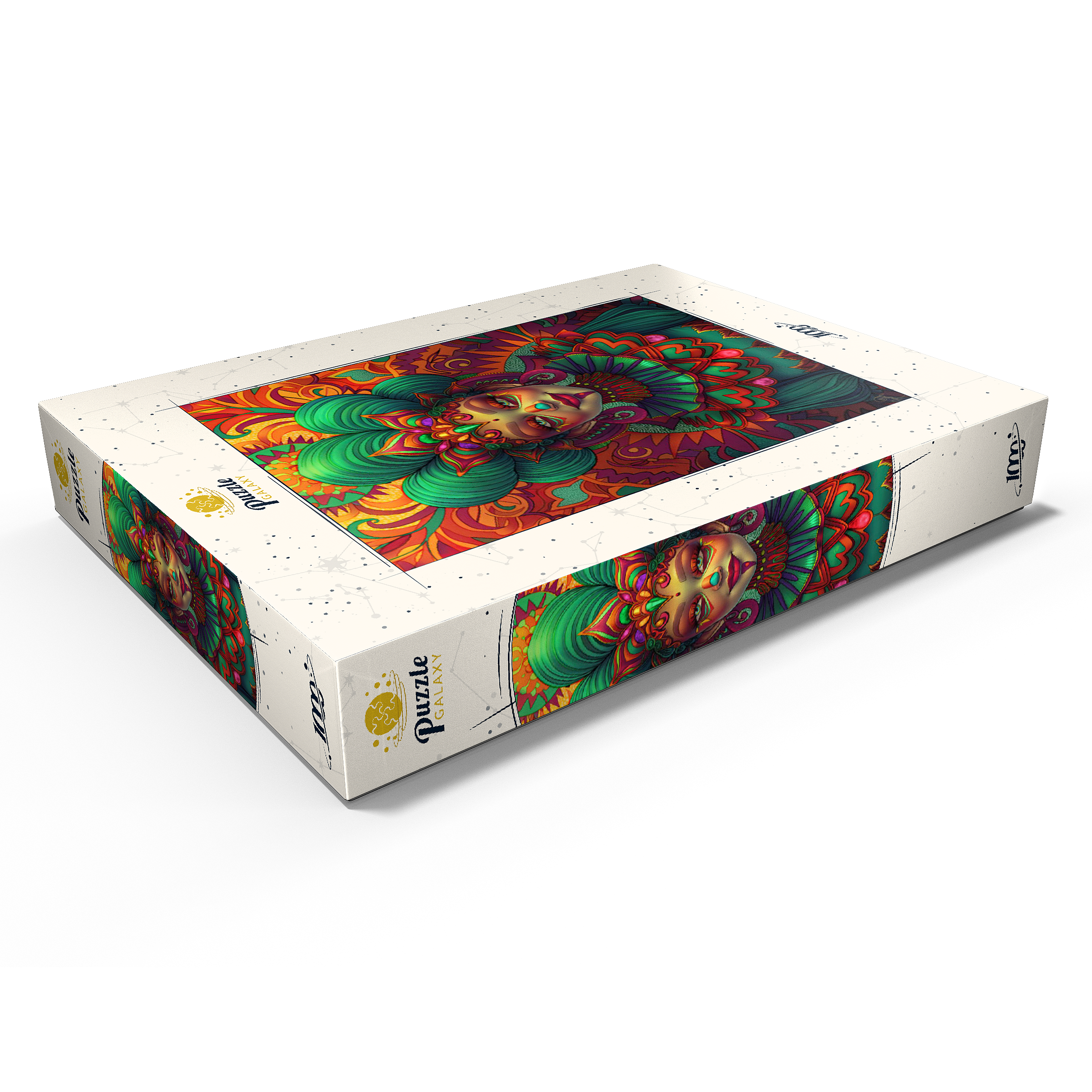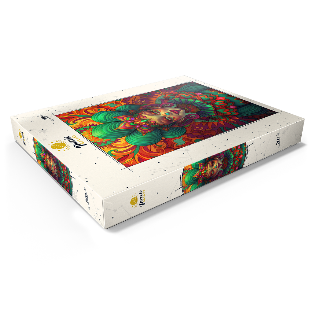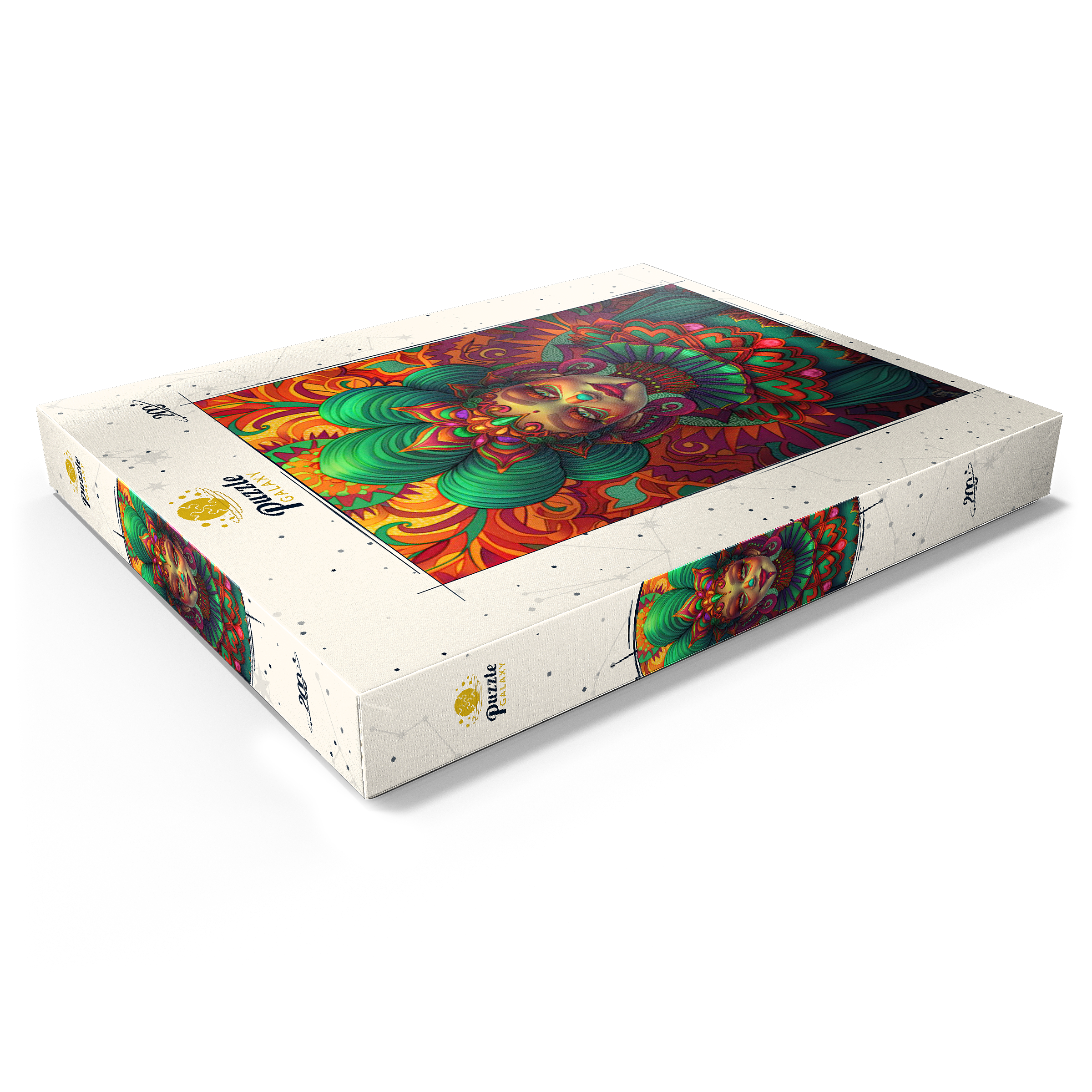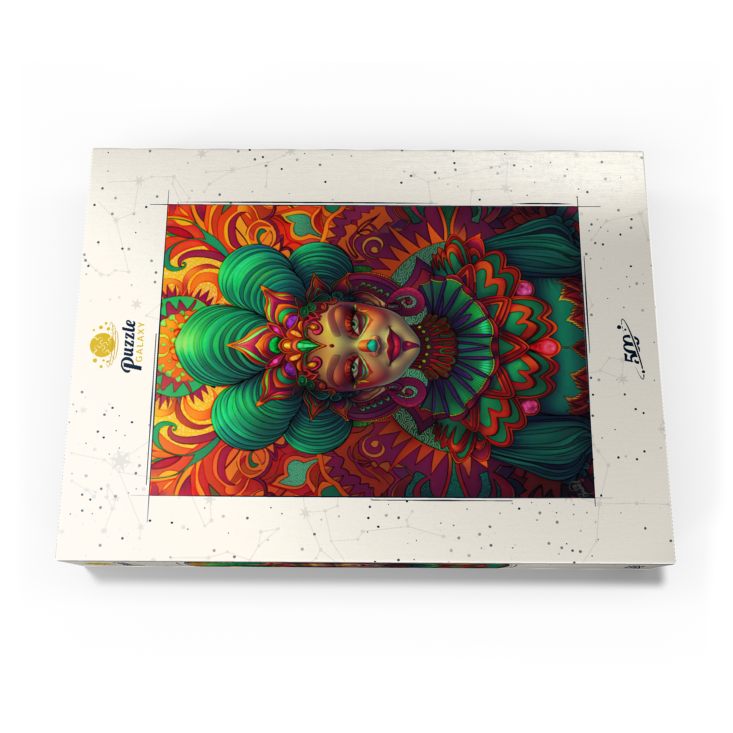 Ein atemberaubendes digitales Kunstwerk, das eine königliche Frau in aufwendiger traditioneller Kleidung zeigt, die lebhafte Grün-, Rot- und Goldtöne kombiniert. Ihr auffälliges smaragdgrünes Haar ist zu voluminösen, dekorativen Formen gestylt und passt perfekt zu ihrer kunstvollen Kopfbedeckung, die mit Edelsteinen und komplizierten Mustern verziert ist. Ihr selbstbewusster Ausdruck wird durch kunstvolle Gesichtsbemalungen und auffälliges, dramatisches Make-up unterstrichen. Der mehrlagige, gerüschte Kragen und die detailreiche Kleidung vermitteln einen Eindruck von zeremonieller Eleganz. Umgeben von einem lebhaften, symmetrischen Hintergrund aus wirbelnden Mustern ist dieses Kunstwerk perfekt für Liebhaber von Fantasy-Porträts, kultureller Kunst und dekorativer Ästhetik. Ideal als Wandkunst oder Inspiration für kreatives Design.