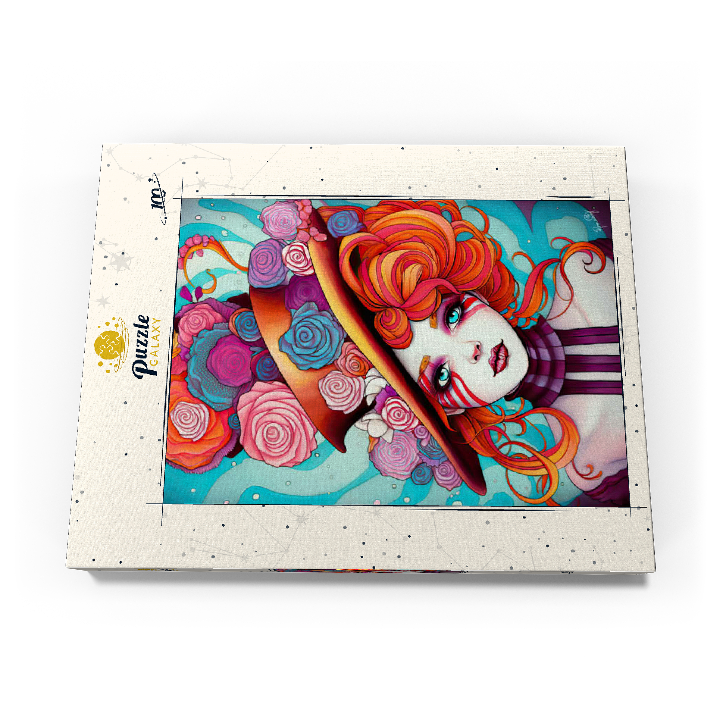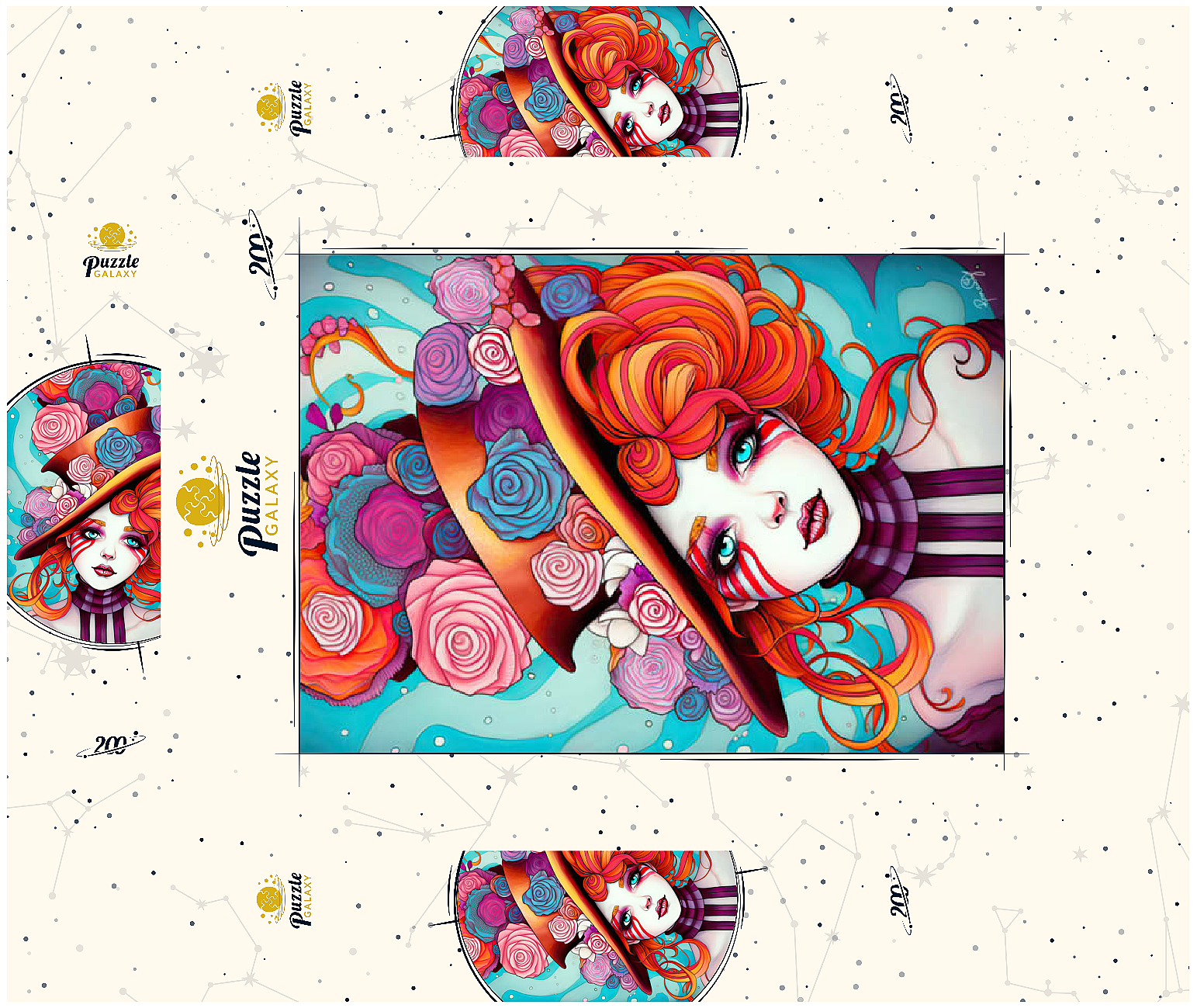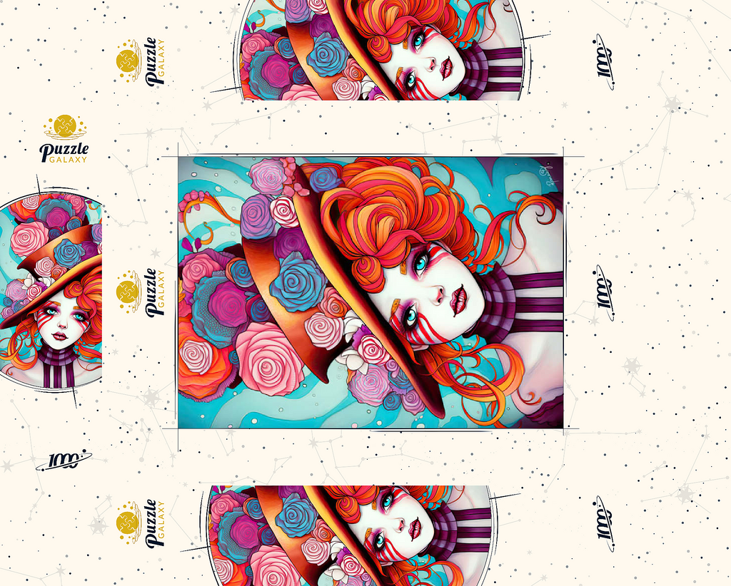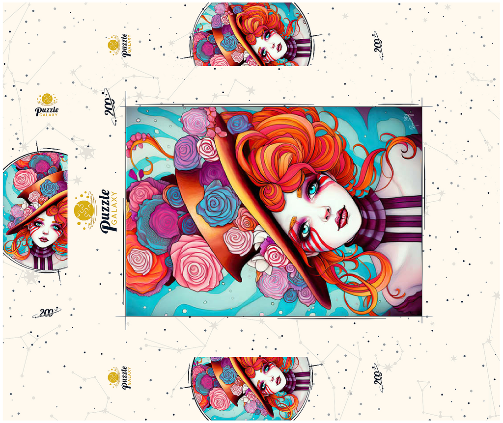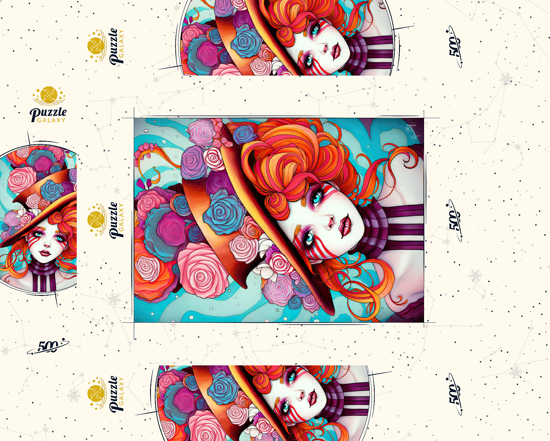 Ein lebhaftes und skurriles Porträt einer jungen Frau mit auffälligen rot-orangefarbenen Locken und himmelblauen Augen, geschmückt mit einem surrealen Zylinderhut, der mit bunten Rosen in Rosa-, Violett- und Blautönen überladen ist. Ihre porzellanartige Haut wird durch kräftige rote Gesichtsfarbe unter den Augen betont, was ihr einen theatralischen, fantasievollen Reiz verleiht. Der türkisfarbene Hintergrund bildet einen wunderschönen Kontrast zur Wärme der Blumenpracht und den kühlen Tönen ihres Blicks. Dieses Kunstwerk im Fantasy-Stil beschwört eine traumhafte, fantasievolle Welt voller Farben, Ausdruckskraft und bezaubernder Eleganz herauf.