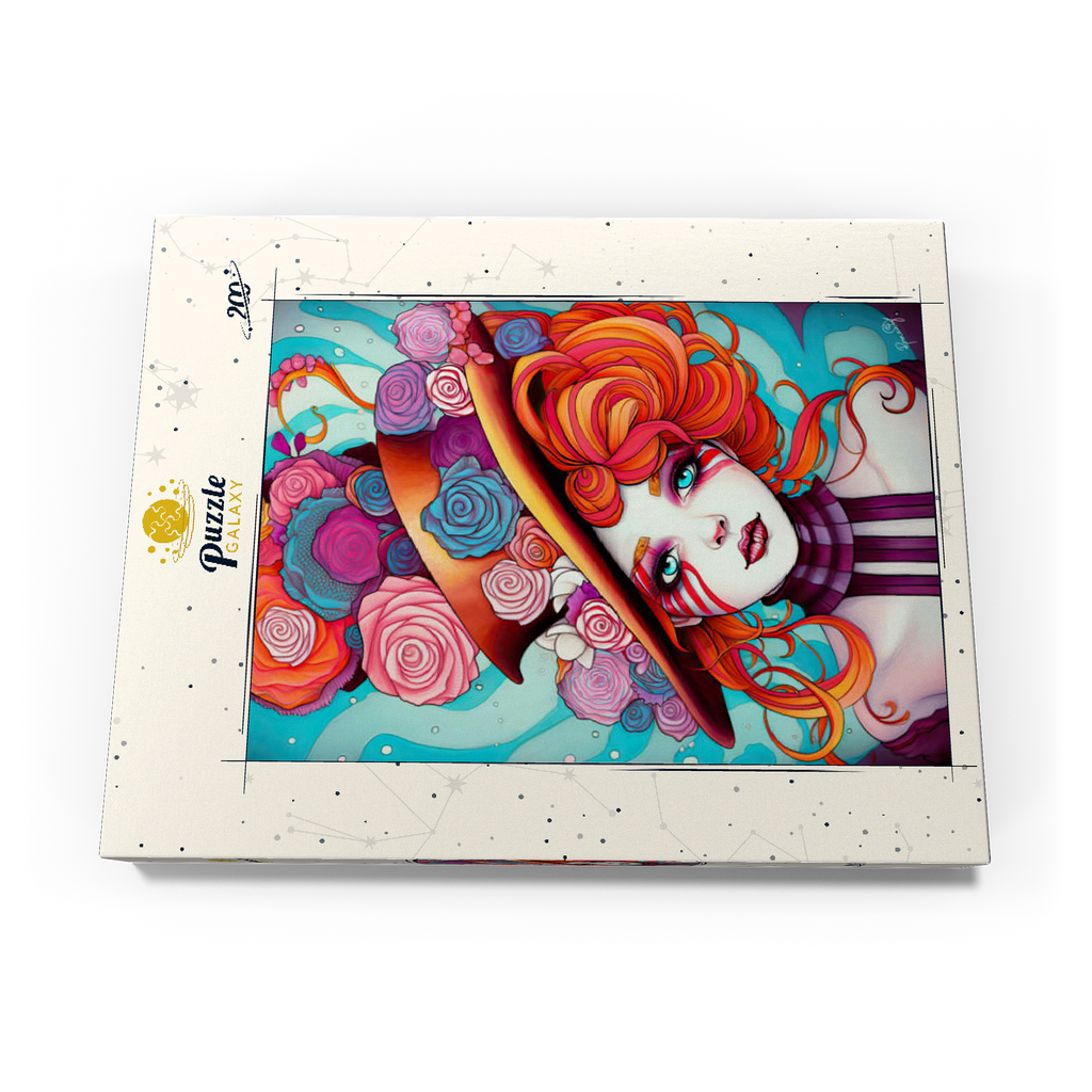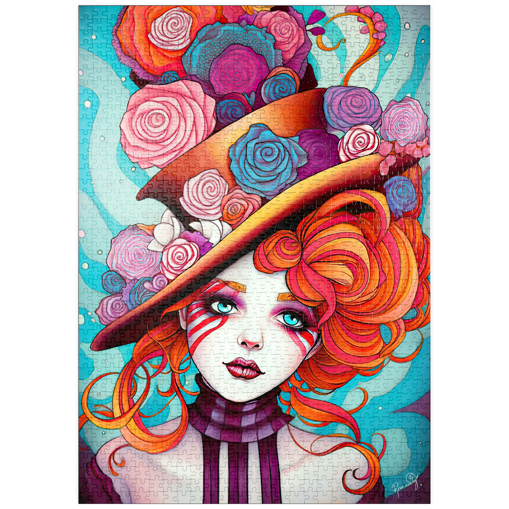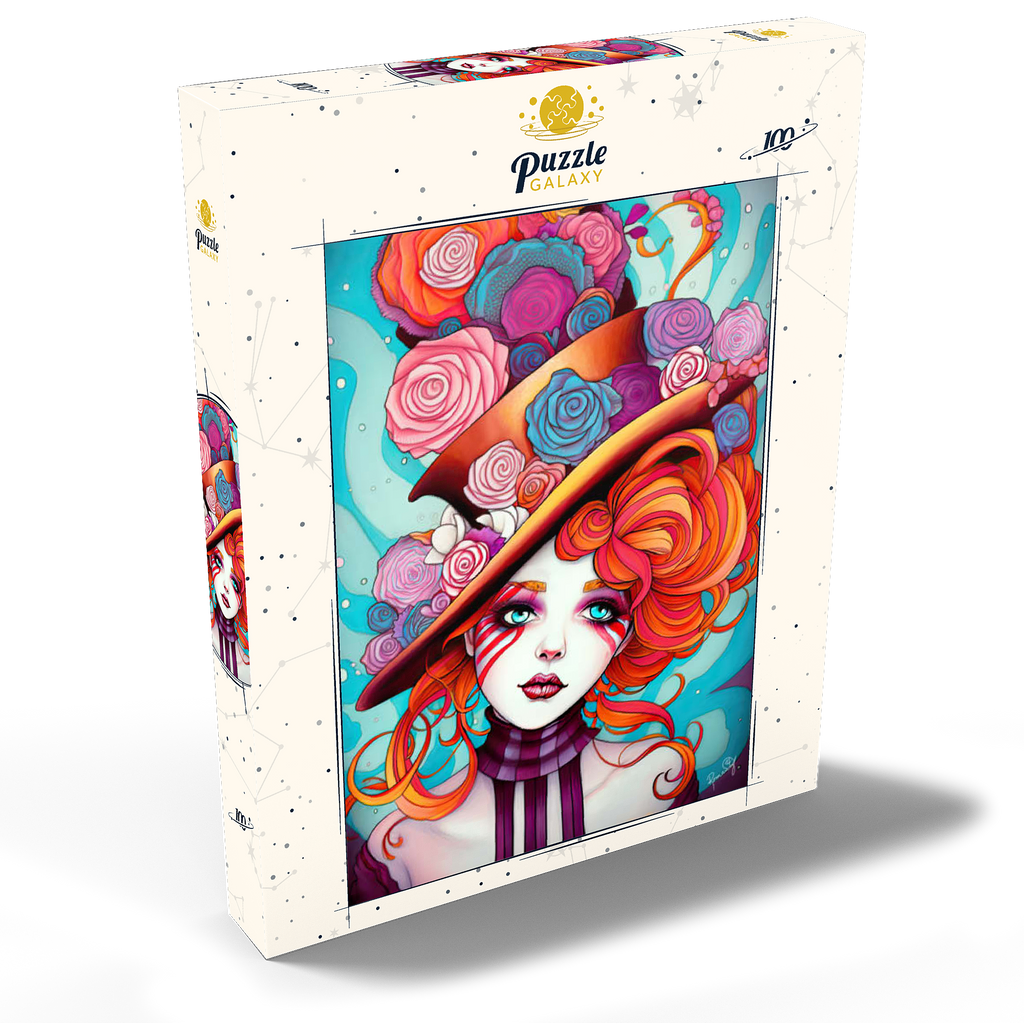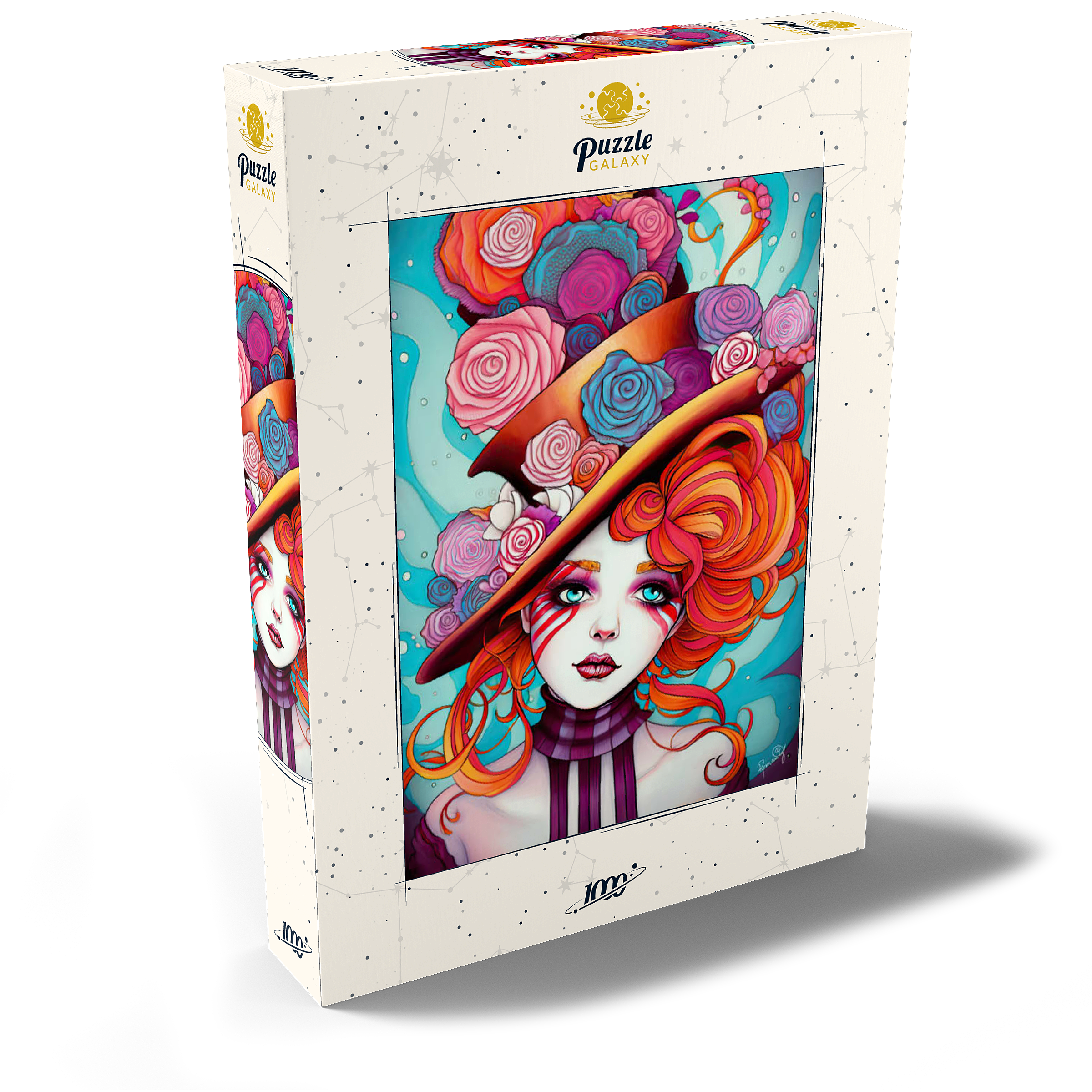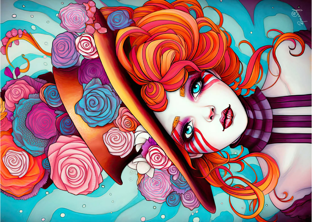 Ein lebhaftes und skurriles Porträt einer jungen Frau mit auffälligen rot-orangefarbenen Locken und himmelblauen Augen, geschmückt mit einem surrealen Zylinderhut, der mit bunten Rosen in Rosa-, Violett- und Blautönen überladen ist. Ihre porzellanartige Haut wird durch kräftige rote Gesichtsfarbe unter den Augen betont, was ihr einen theatralischen, fantasievollen Reiz verleiht. Der türkisfarbene Hintergrund bildet einen wunderschönen Kontrast zur Wärme der Blumenpracht und den kühlen Tönen ihres Blicks. Dieses Kunstwerk im Fantasy-Stil beschwört eine traumhafte, fantasievolle Welt voller Farben, Ausdruckskraft und bezaubernder Eleganz herauf.