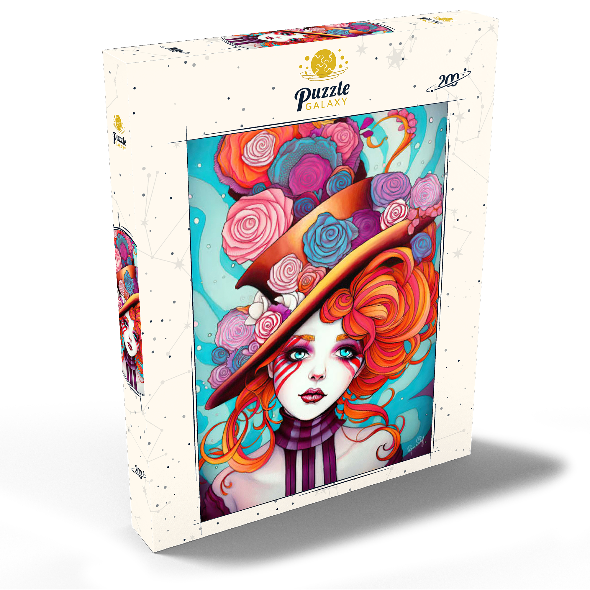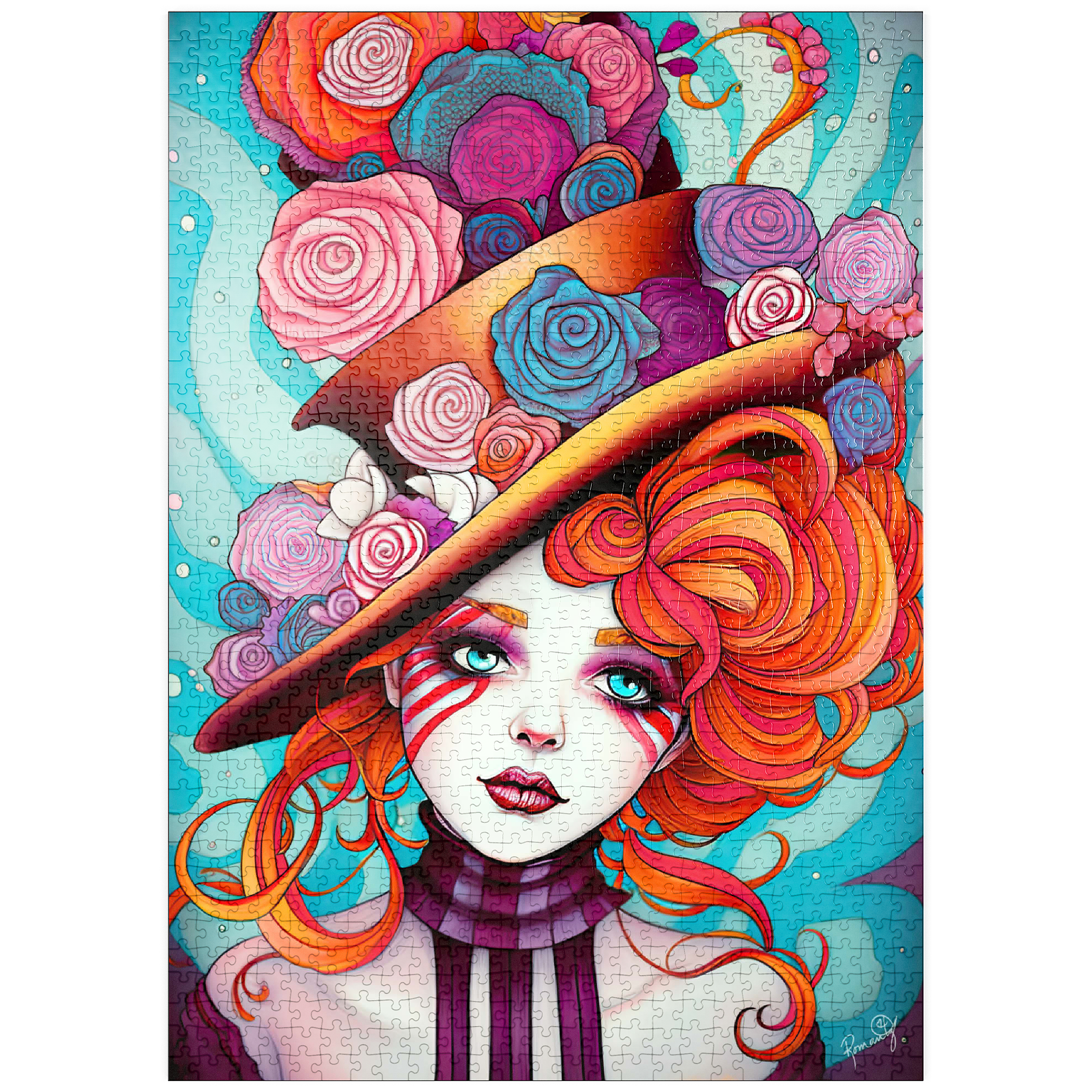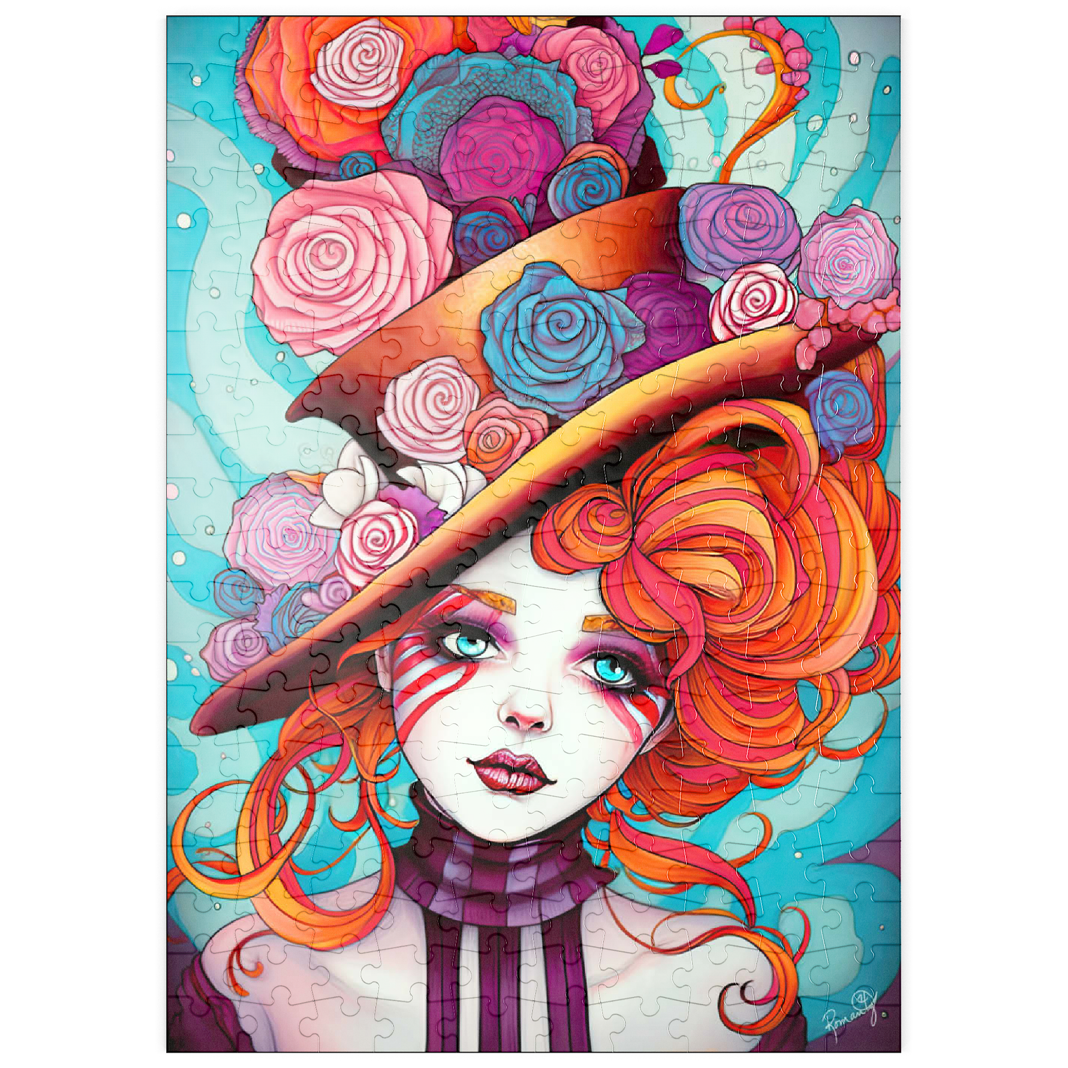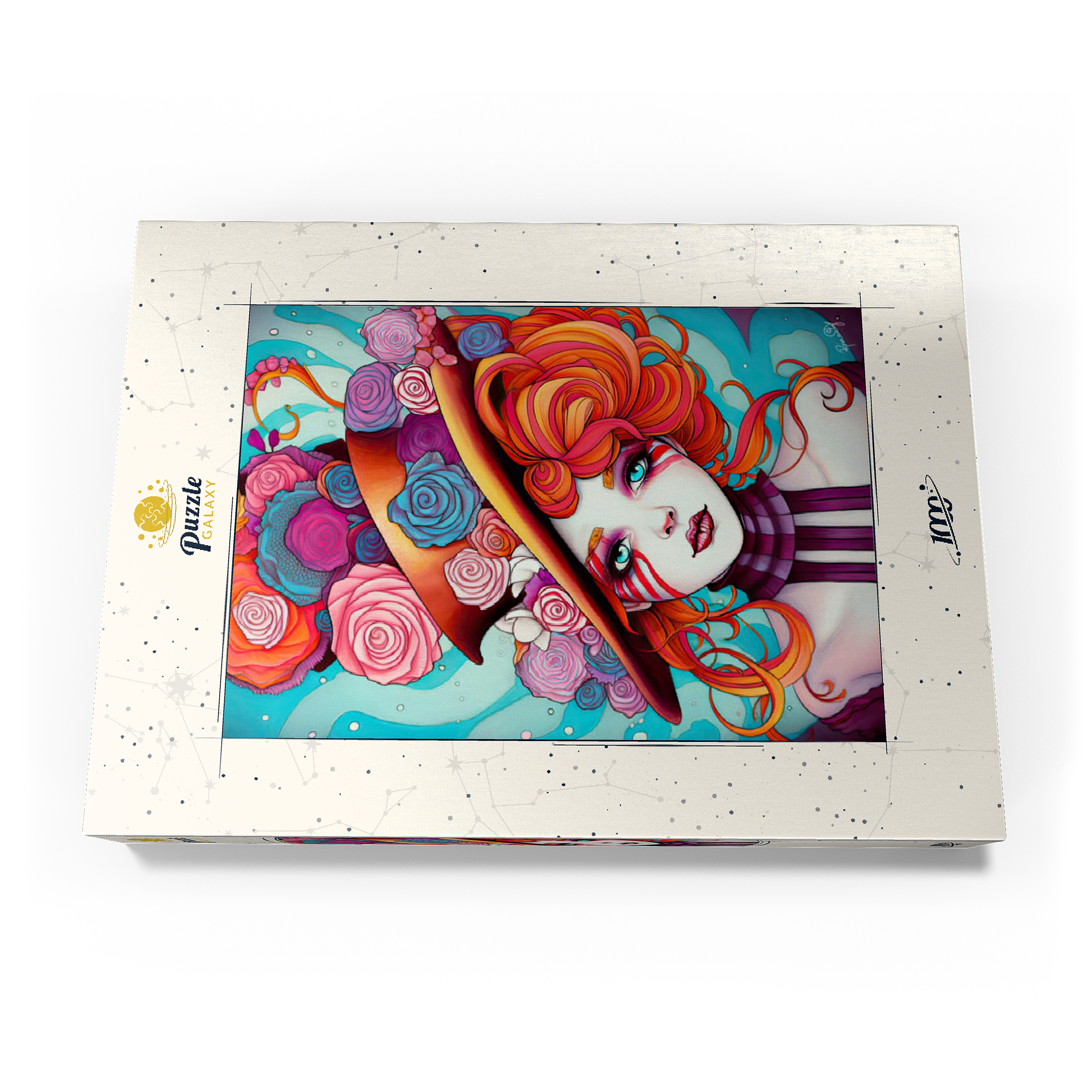 Ein lebhaftes und skurriles Porträt einer jungen Frau mit auffälligen rot-orangefarbenen Locken und himmelblauen Augen, geschmückt mit einem surrealen Zylinderhut, der mit bunten Rosen in Rosa-, Violett- und Blautönen überladen ist. Ihre porzellanartige Haut wird durch kräftige rote Gesichtsfarbe unter den Augen betont, was ihr einen theatralischen, fantasievollen Reiz verleiht. Der türkisfarbene Hintergrund bildet einen wunderschönen Kontrast zur Wärme der Blumenpracht und den kühlen Tönen ihres Blicks. Dieses Kunstwerk im Fantasy-Stil beschwört eine traumhafte, fantasievolle Welt voller Farben, Ausdruckskraft und bezaubernder Eleganz herauf.
