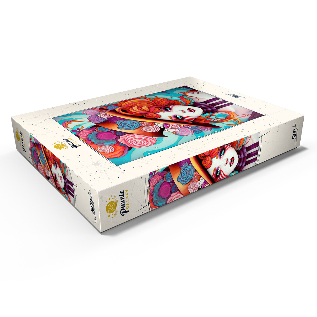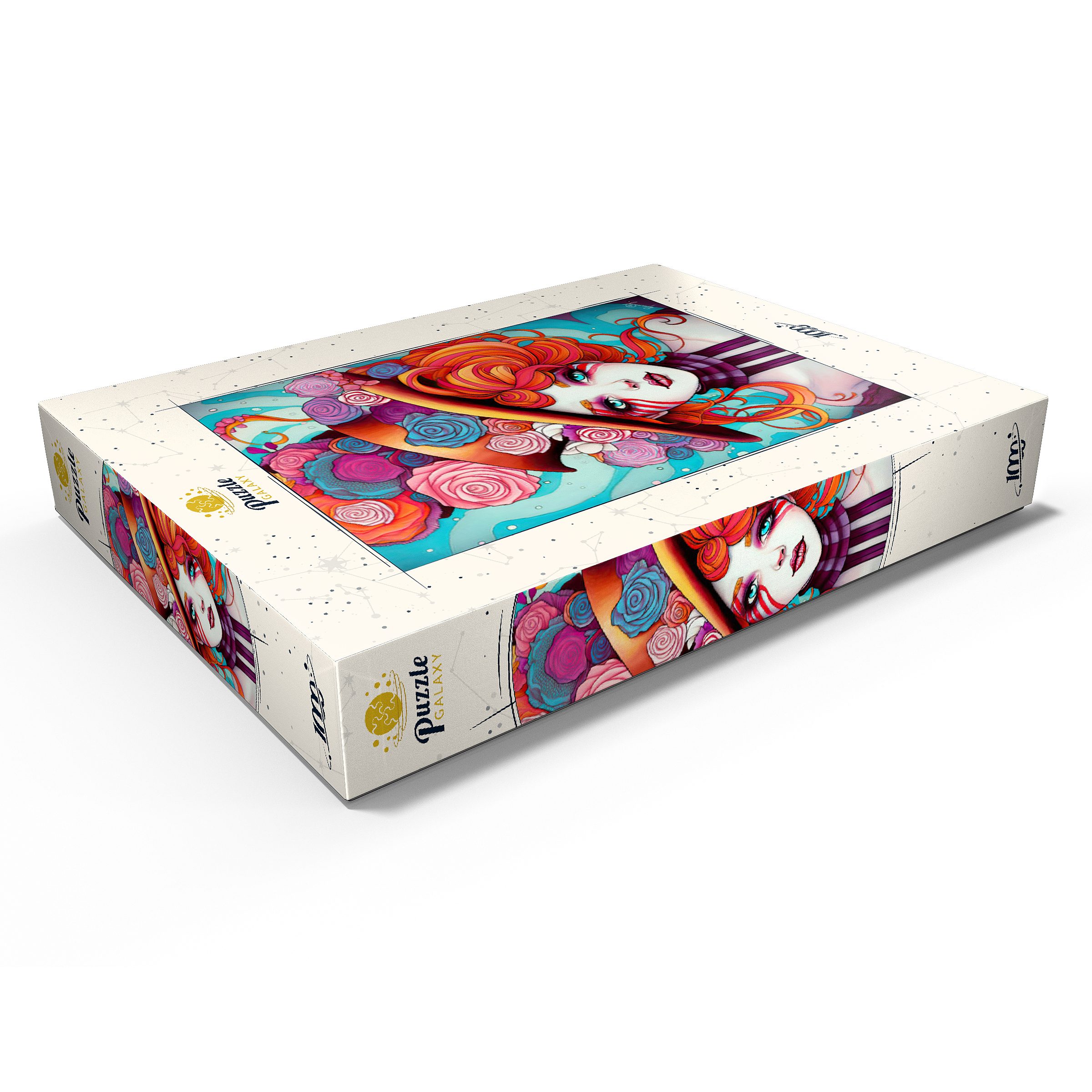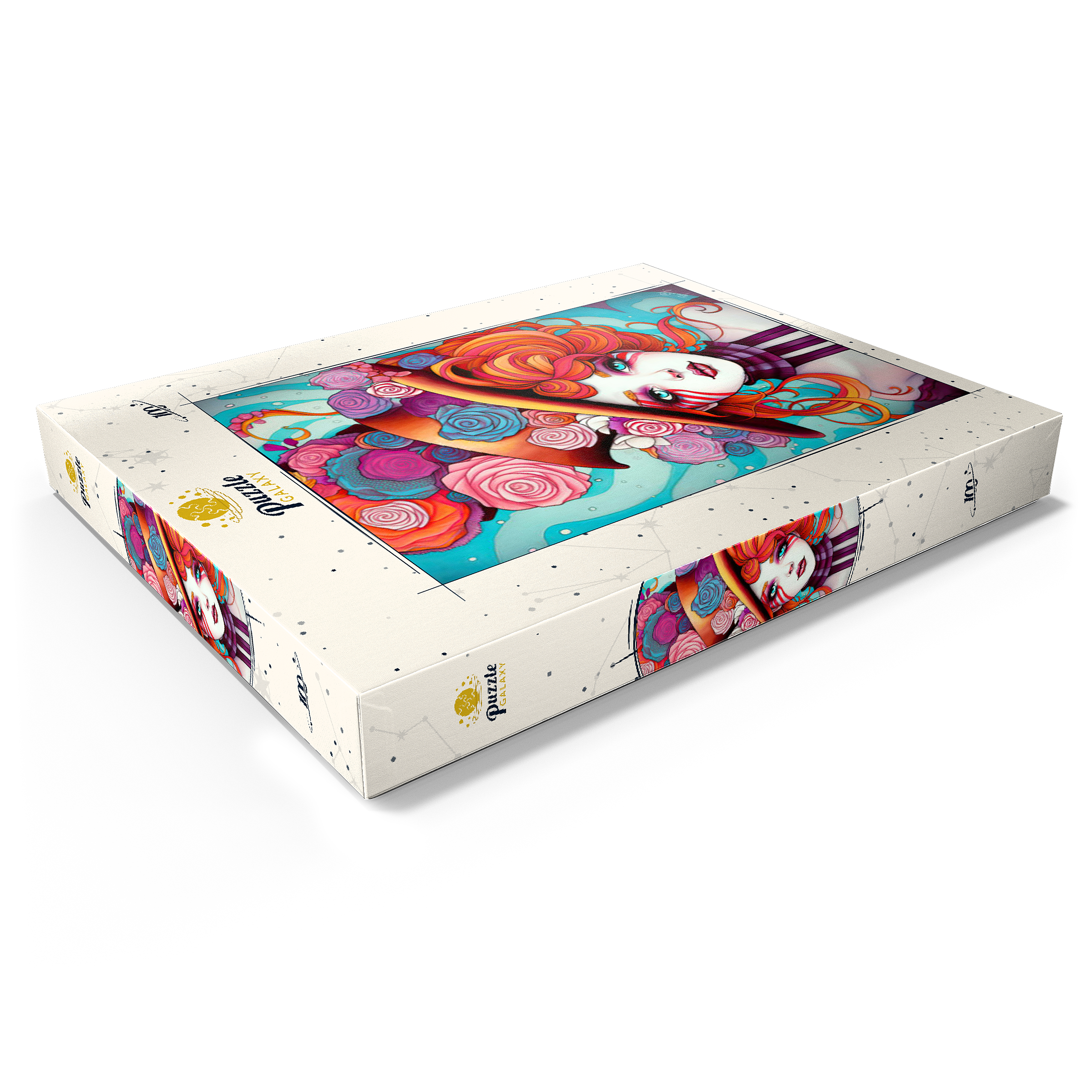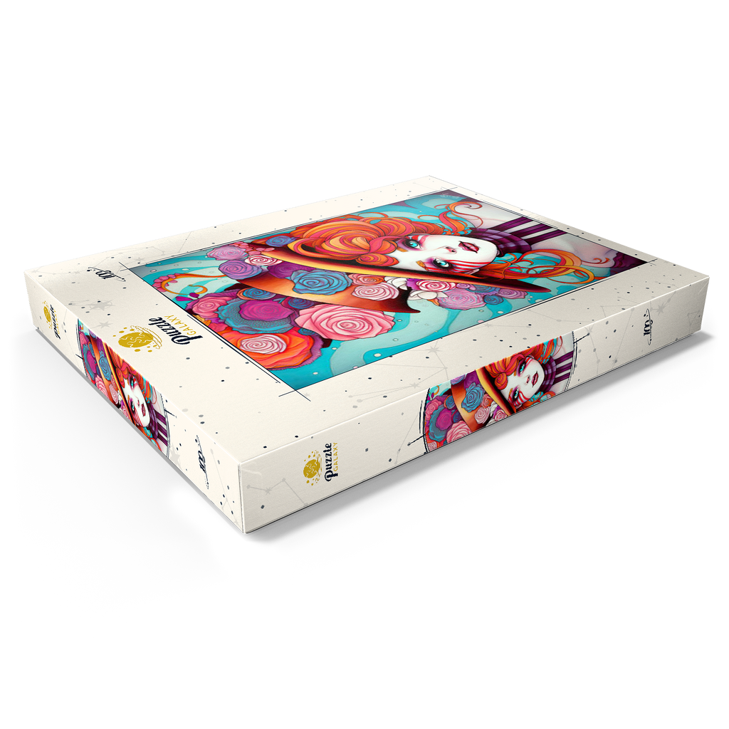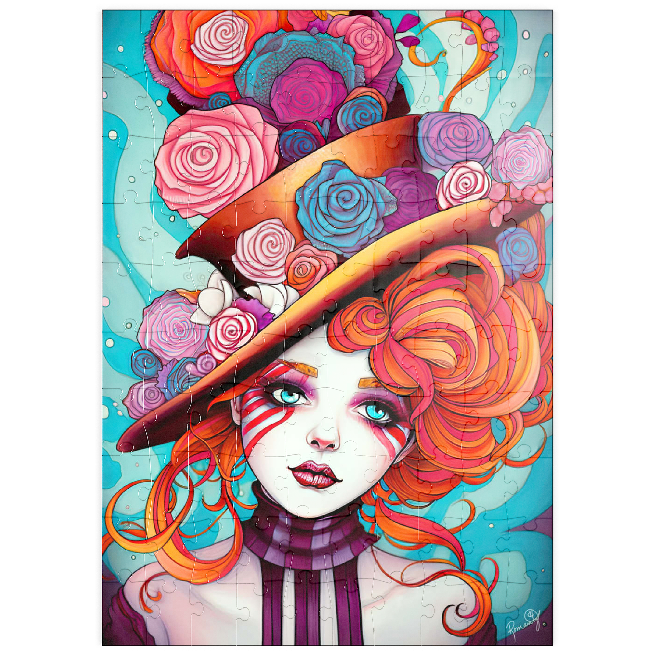 Ein lebhaftes und skurriles Porträt einer jungen Frau mit auffälligen rot-orangefarbenen Locken und himmelblauen Augen, geschmückt mit einem surrealen Zylinderhut, der mit bunten Rosen in Rosa-, Violett- und Blautönen überladen ist. Ihre porzellanartige Haut wird durch kräftige rote Gesichtsfarbe unter den Augen betont, was ihr einen theatralischen, fantasievollen Reiz verleiht. Der türkisfarbene Hintergrund bildet einen wunderschönen Kontrast zur Wärme der Blumenpracht und den kühlen Tönen ihres Blicks. Dieses Kunstwerk im Fantasy-Stil beschwört eine traumhafte, fantasievolle Welt voller Farben, Ausdruckskraft und bezaubernder Eleganz herauf.