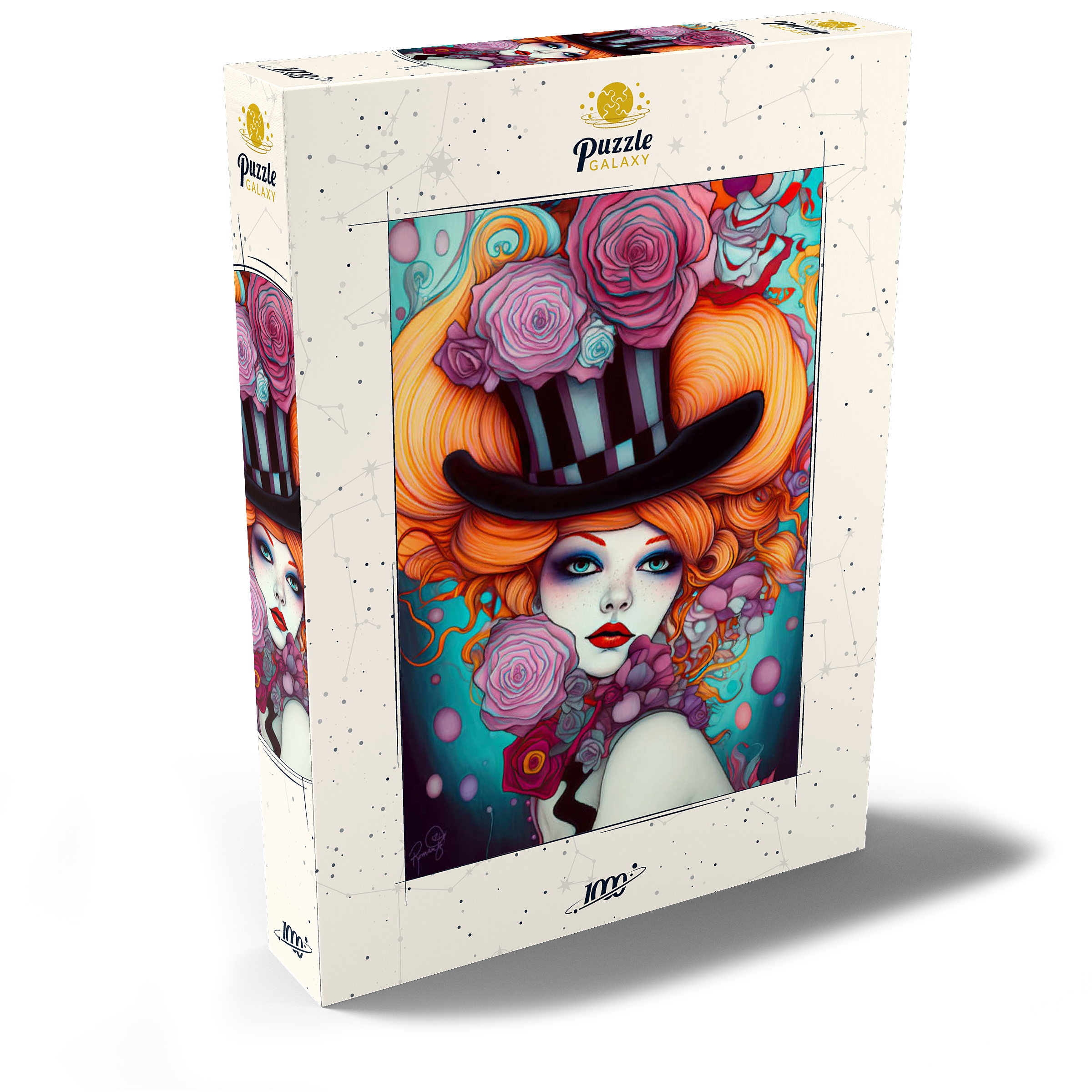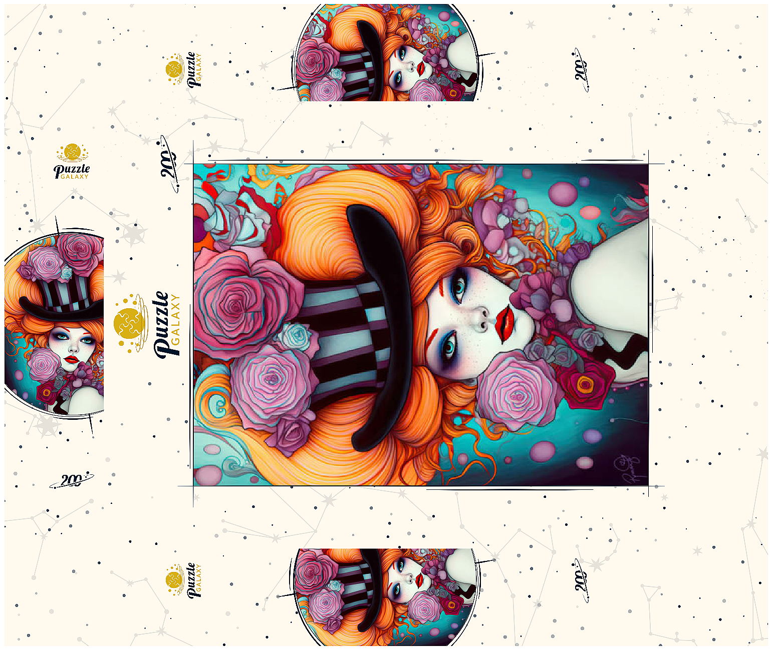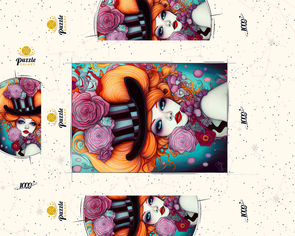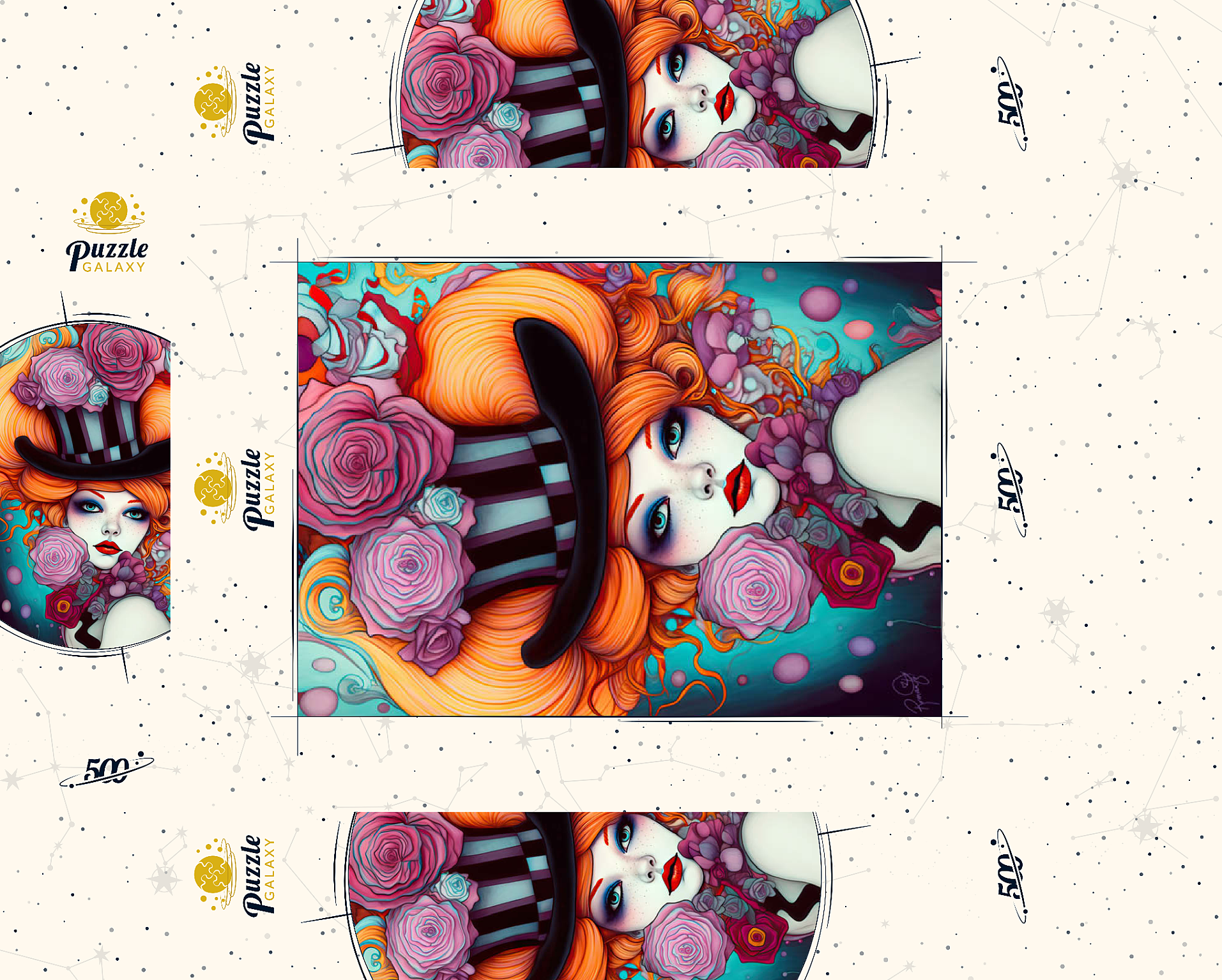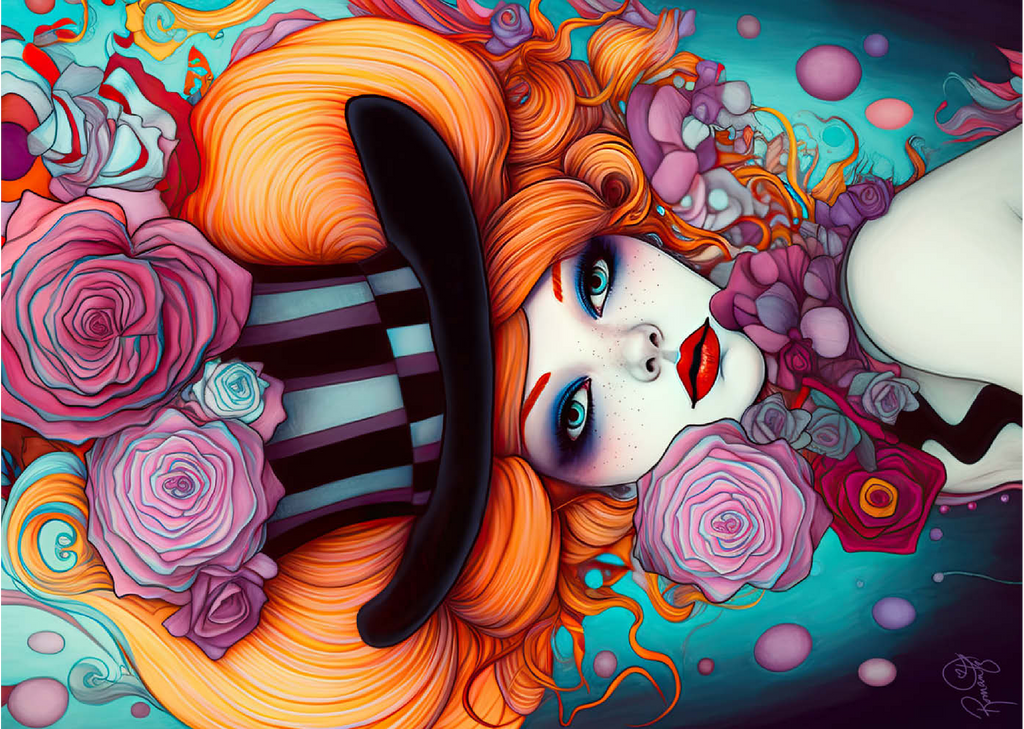 Ein faszinierendes digitales Kunstwerk, das eine skurrile Frau mit voluminösem orangefarbenem Haar, auffälligen blauen Augen und kräftigen roten Lippen darstellt. Sie trägt einen dramatischen schwarz-weiß gestreiften Zylinderhut, der mit überdimensionalen Rosen in Rosa-, Lavendel- und Weißtönen verziert ist. Weitere florale Elemente umgeben sie und verstärken die fantastische und surreale Atmosphäre. Der türkisfarbene Hintergrund, akzentuiert durch wirbelnde Blasen, verstärkt den traumhaften Charakter noch zusätzlich. Dieses fantasievolle Werk ist ideal für Liebhaber von Fantasy-Kunst, Steampunk-Ästhetik und lebendigen Charakterporträts. Perfekt als auffälliges Wandkunstwerk oder als einzigartige dekorative Ergänzung für jeden kreativen Raum.