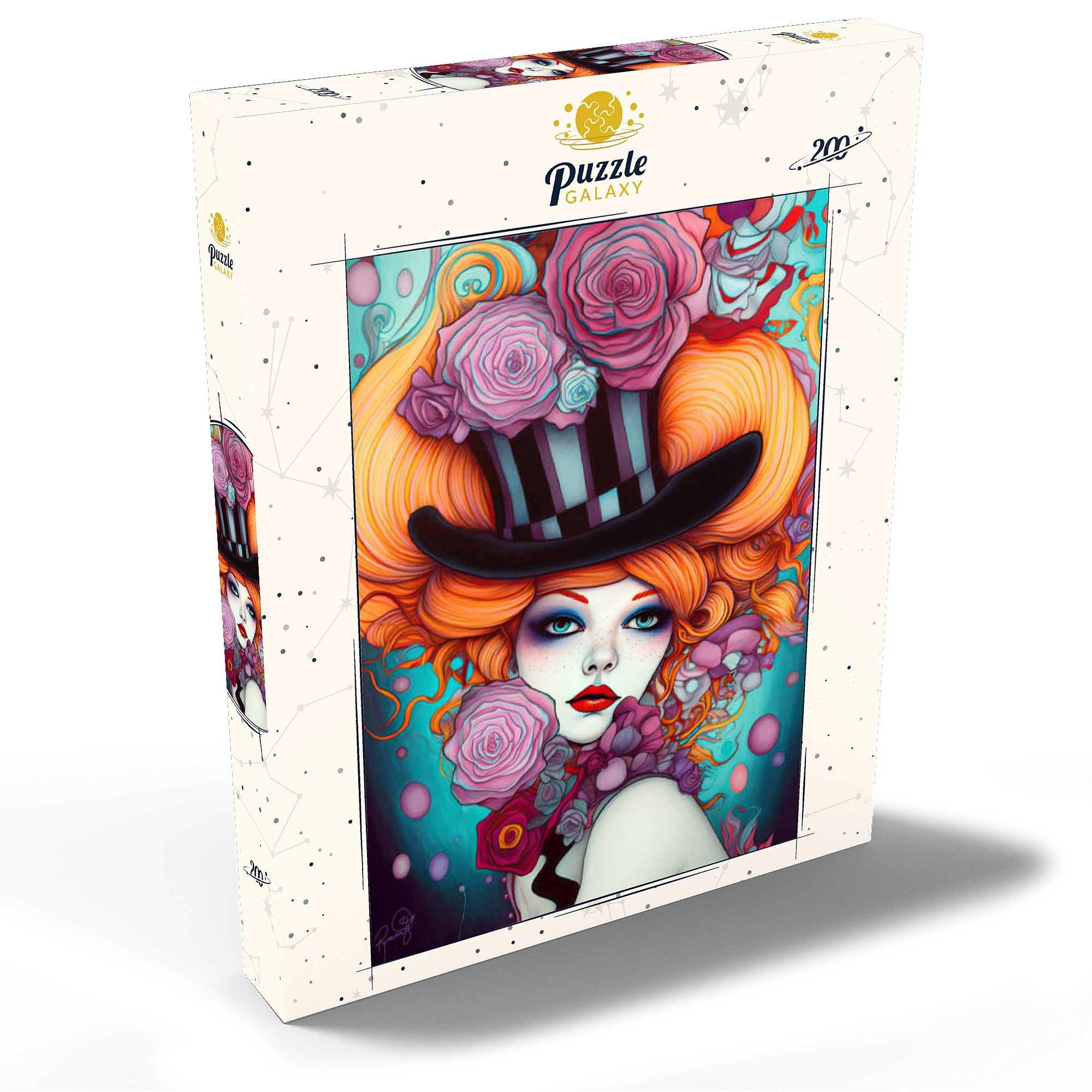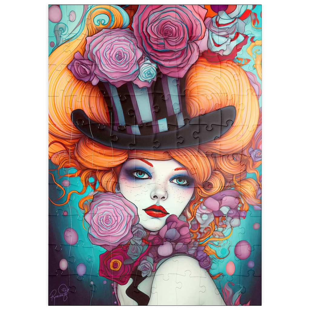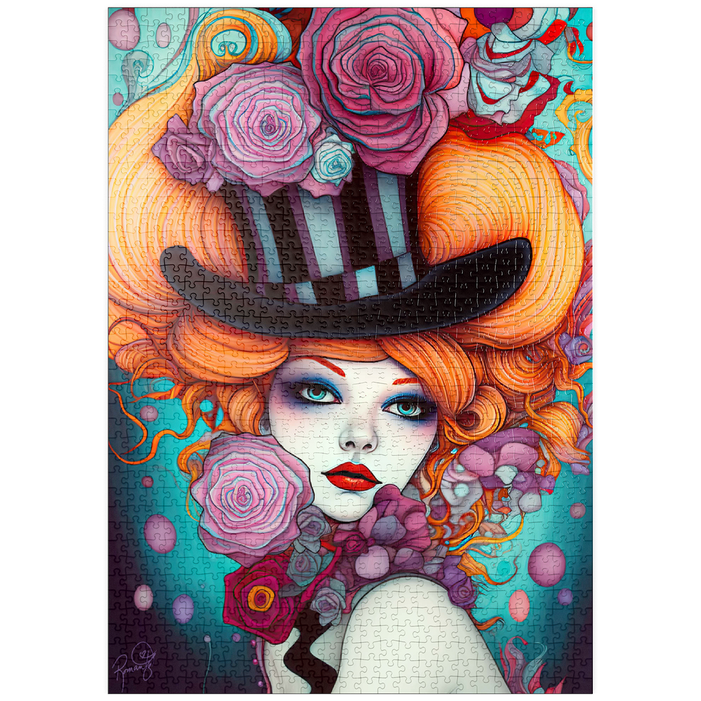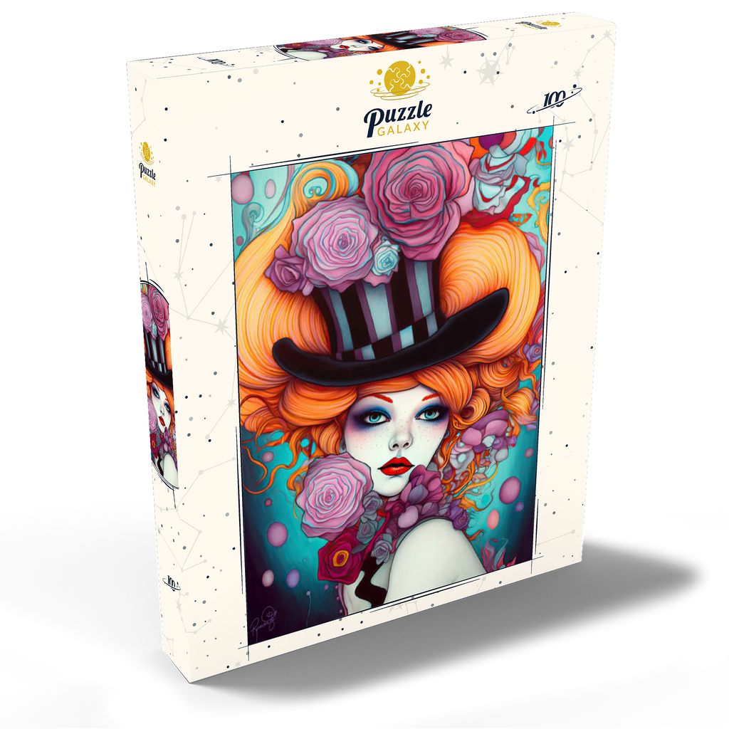 Ein faszinierendes digitales Kunstwerk, das eine skurrile Frau mit voluminösem orangefarbenem Haar, auffälligen blauen Augen und kräftigen roten Lippen darstellt. Sie trägt einen dramatischen schwarz-weiß gestreiften Zylinderhut, der mit überdimensionalen Rosen in Rosa-, Lavendel- und Weißtönen verziert ist. Weitere florale Elemente umgeben sie und verstärken die fantastische und surreale Atmosphäre. Der türkisfarbene Hintergrund, akzentuiert durch wirbelnde Blasen, verstärkt den traumhaften Charakter noch zusätzlich. Dieses fantasievolle Werk ist ideal für Liebhaber von Fantasy-Kunst, Steampunk-Ästhetik und lebendigen Charakterporträts. Perfekt als auffälliges Wandkunstwerk oder als einzigartige dekorative Ergänzung für jeden kreativen Raum.