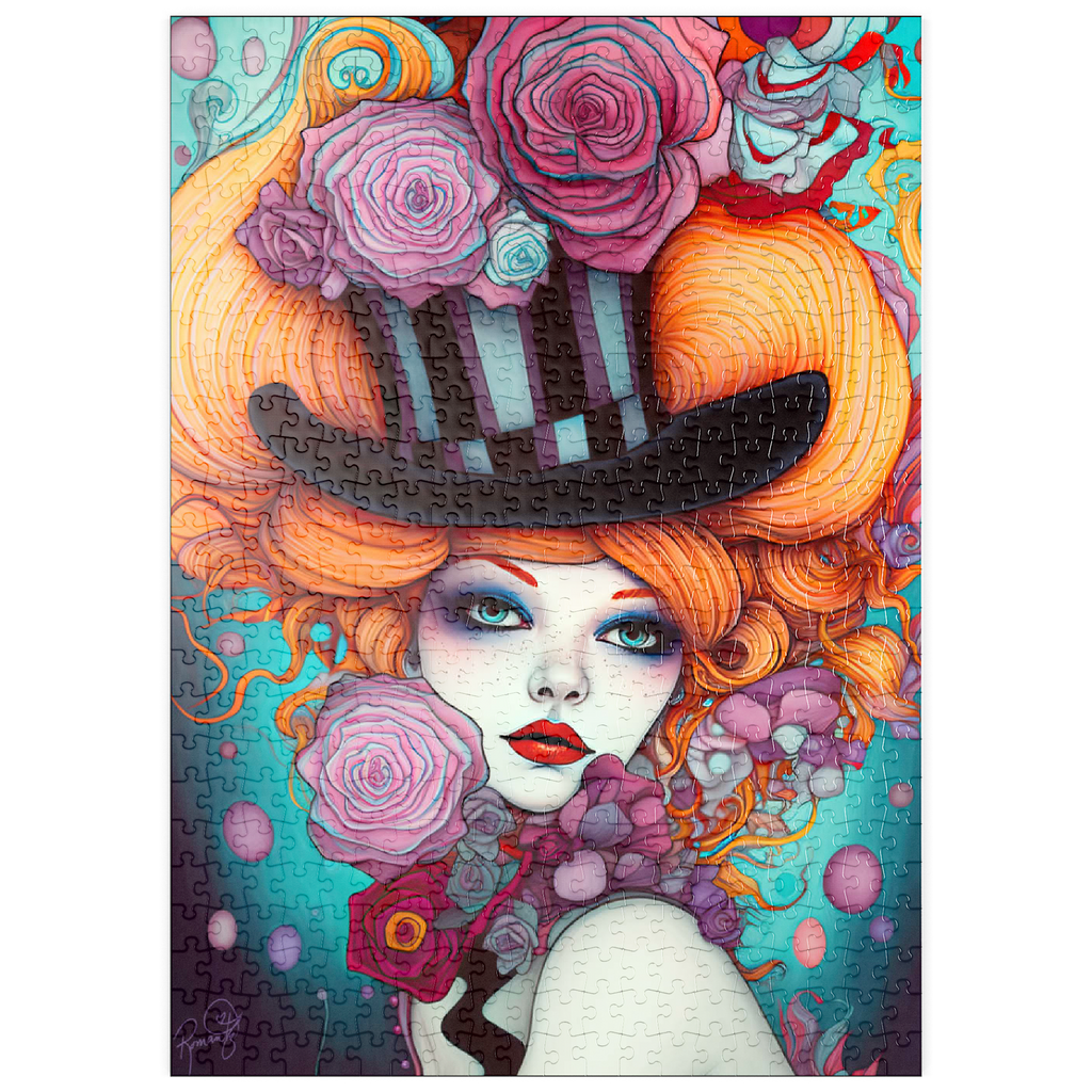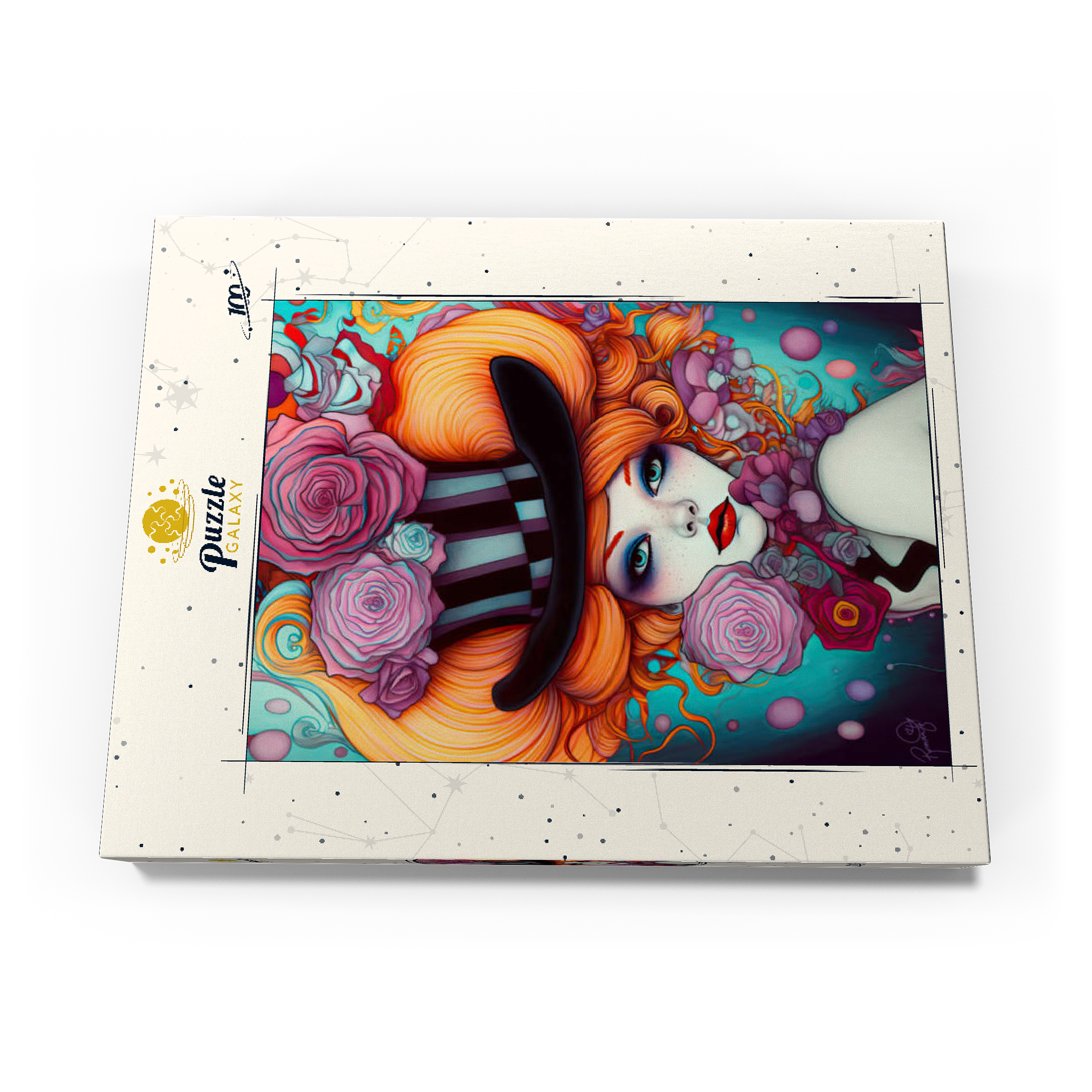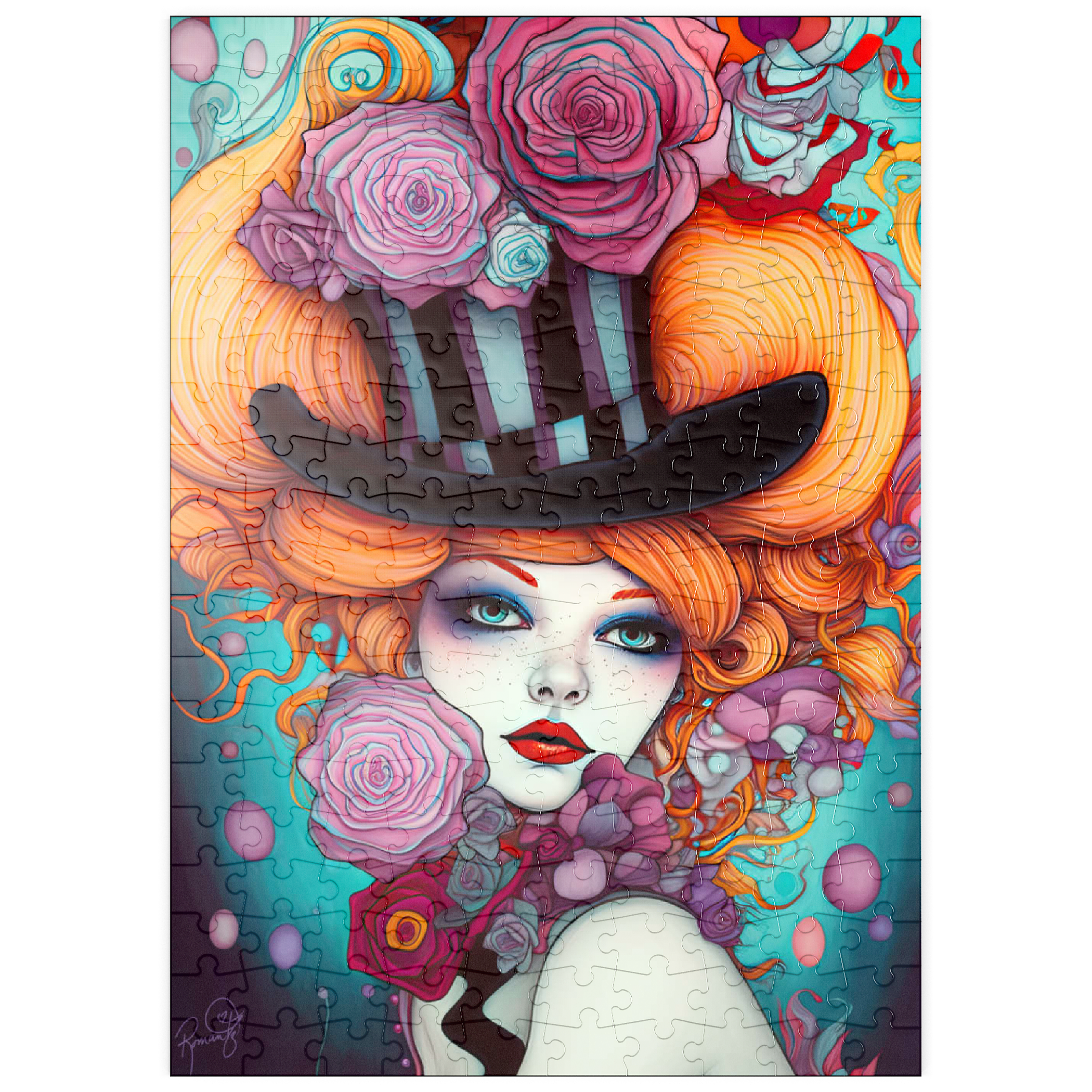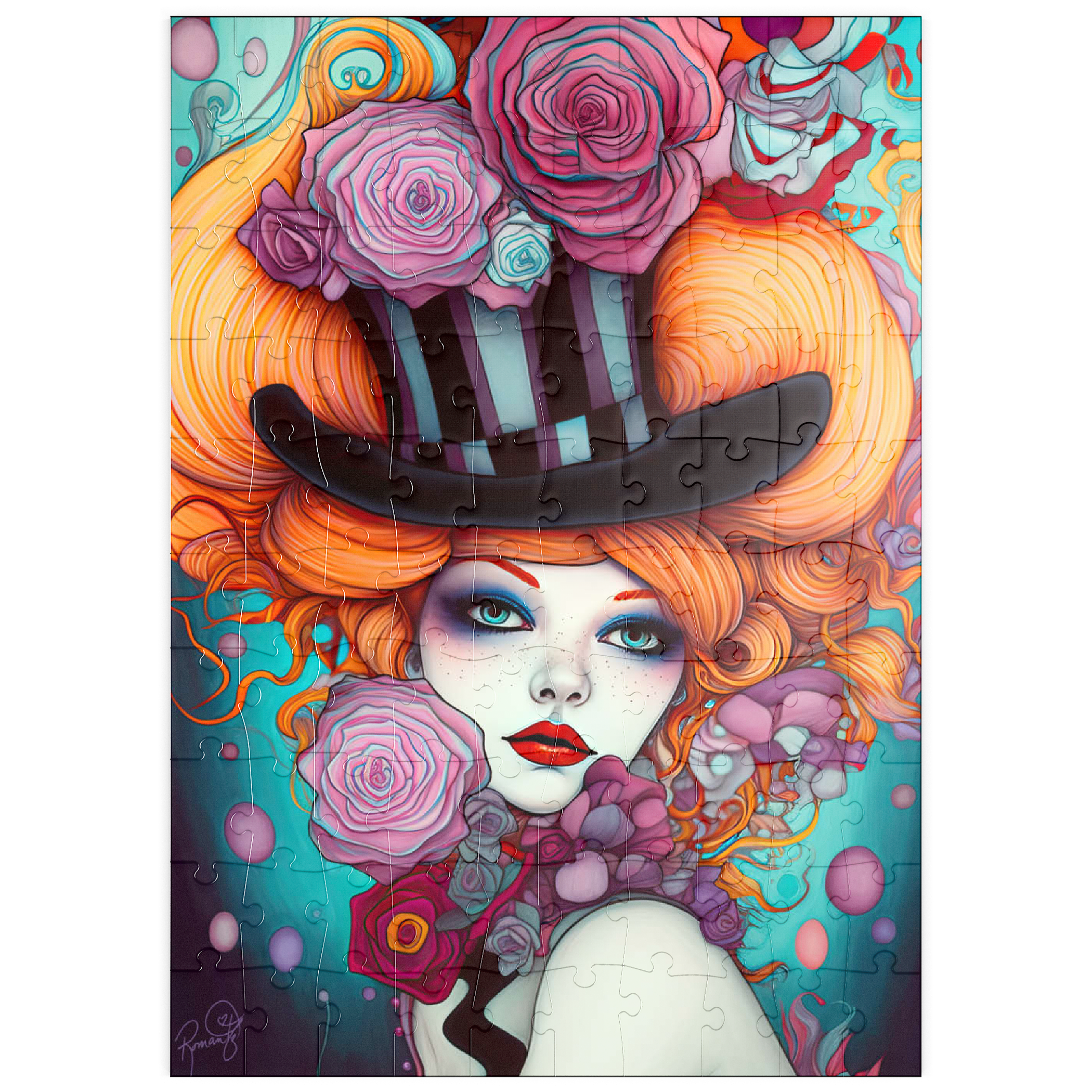 Ein faszinierendes digitales Kunstwerk, das eine skurrile Frau mit voluminösem orangefarbenem Haar, auffälligen blauen Augen und kräftigen roten Lippen darstellt. Sie trägt einen dramatischen schwarz-weiß gestreiften Zylinderhut, der mit überdimensionalen Rosen in Rosa-, Lavendel- und Weißtönen verziert ist. Weitere florale Elemente umgeben sie und verstärken die fantastische und surreale Atmosphäre. Der türkisfarbene Hintergrund, akzentuiert durch wirbelnde Blasen, verstärkt den traumhaften Charakter noch zusätzlich. Dieses fantasievolle Werk ist ideal für Liebhaber von Fantasy-Kunst, Steampunk-Ästhetik und lebendigen Charakterporträts. Perfekt als auffälliges Wandkunstwerk oder als einzigartige dekorative Ergänzung für jeden kreativen Raum.