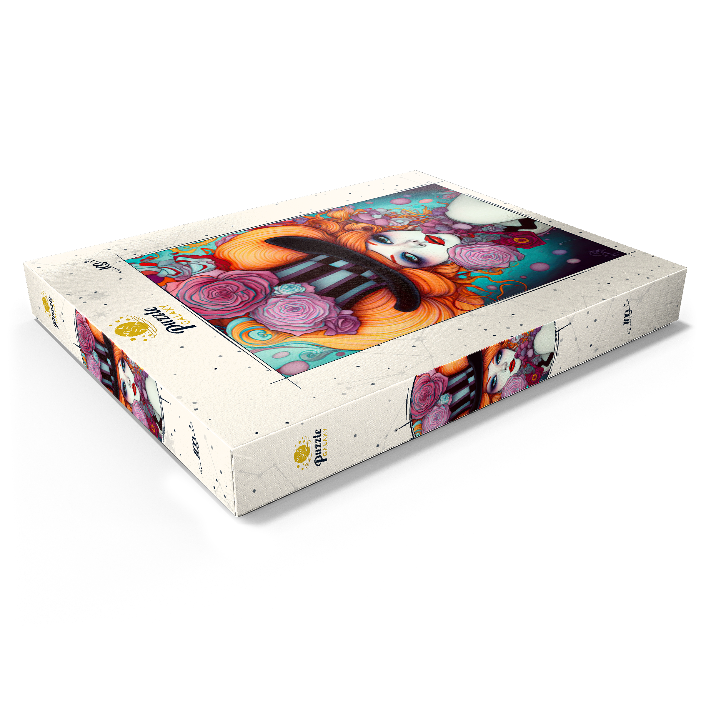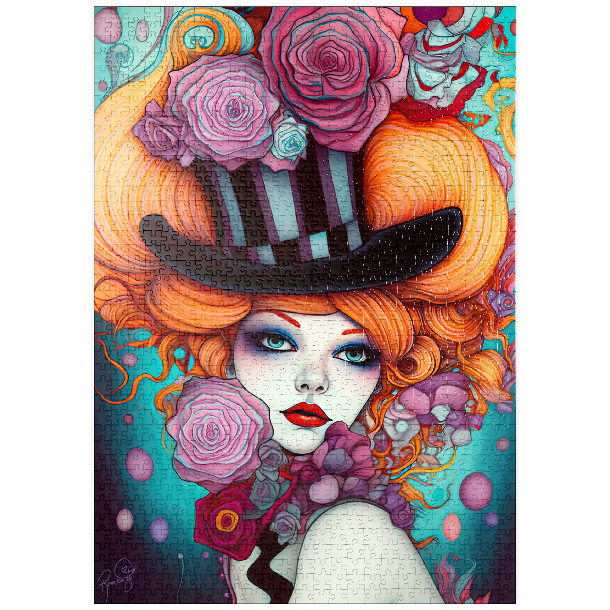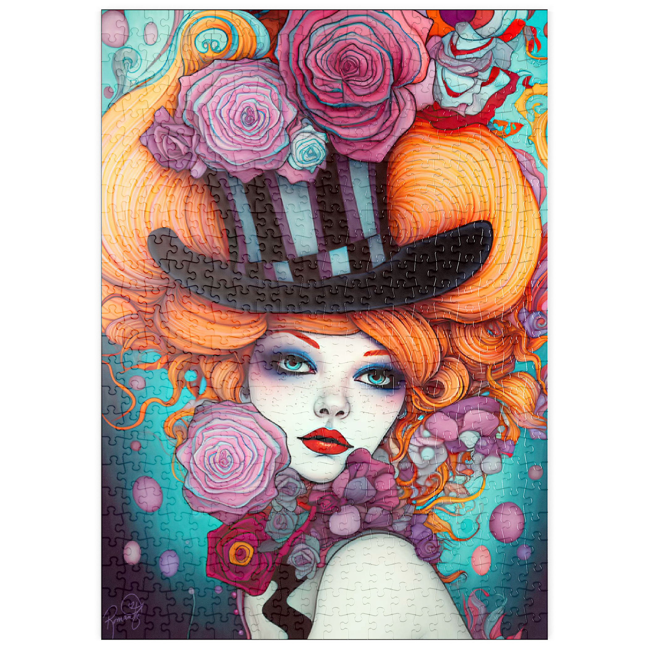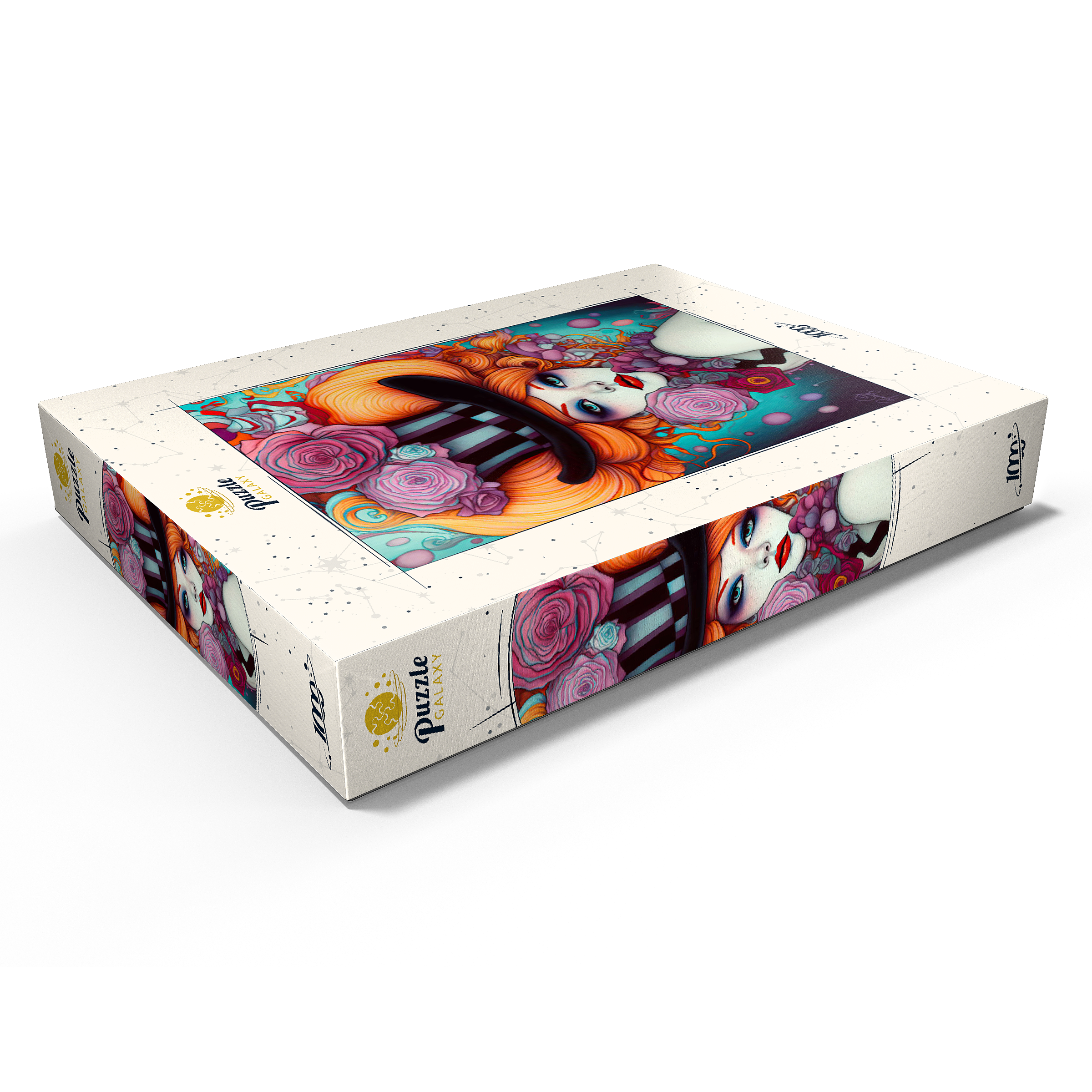 Ein faszinierendes digitales Kunstwerk, das eine skurrile Frau mit voluminösem orangefarbenem Haar, auffälligen blauen Augen und kräftigen roten Lippen darstellt. Sie trägt einen dramatischen schwarz-weiß gestreiften Zylinderhut, der mit überdimensionalen Rosen in Rosa-, Lavendel- und Weißtönen verziert ist. Weitere florale Elemente umgeben sie und verstärken die fantastische und surreale Atmosphäre. Der türkisfarbene Hintergrund, akzentuiert durch wirbelnde Blasen, verstärkt den traumhaften Charakter noch zusätzlich. Dieses fantasievolle Werk ist ideal für Liebhaber von Fantasy-Kunst, Steampunk-Ästhetik und lebendigen Charakterporträts. Perfekt als auffälliges Wandkunstwerk oder als einzigartige dekorative Ergänzung für jeden kreativen Raum.