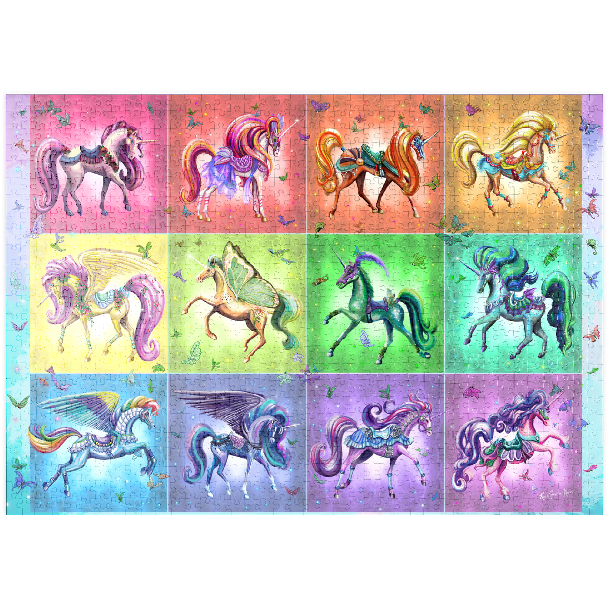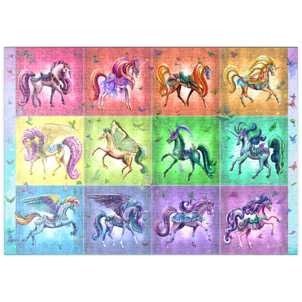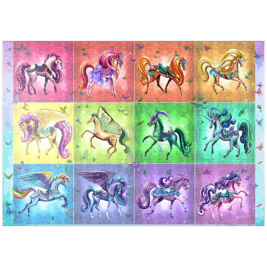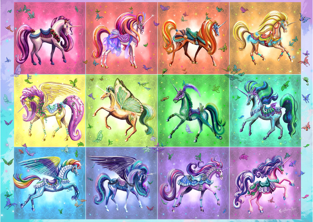 Zwölf schillernde Einhörner tanzen vor einem Regenbogenhintergrund in diesem lebhaften Puzzlebild von Rose Cat Khan. Jedes Einhorn ist mit verspielten Sätteln, Blumen, Flügeln und glitzernden Accessoires geschmückt – einige mit Schmetterlingsflügeln, andere mit üppigen Mähnen und wallenden Roben. Die kunstvollen Zaumzeuge und Posen lassen den Zauber einer Karussellfahrt erahnen und wecken Erinnerungen an verzauberte Ausflüge und Kindheitswunder. Verspielte Schmetterlinge flattern durch die Luft und verleihen jedem Bild Bewegung und Charme. Dieses Kunstwerk ist eine Feier der Farben, Charaktere und Fantasie und lädt den Betrachter in eine Galerie der Verzauberung ein, in der jedes Einhorn eine Geschichte erzählt und jeder Farbton Freude ausstrahlt.