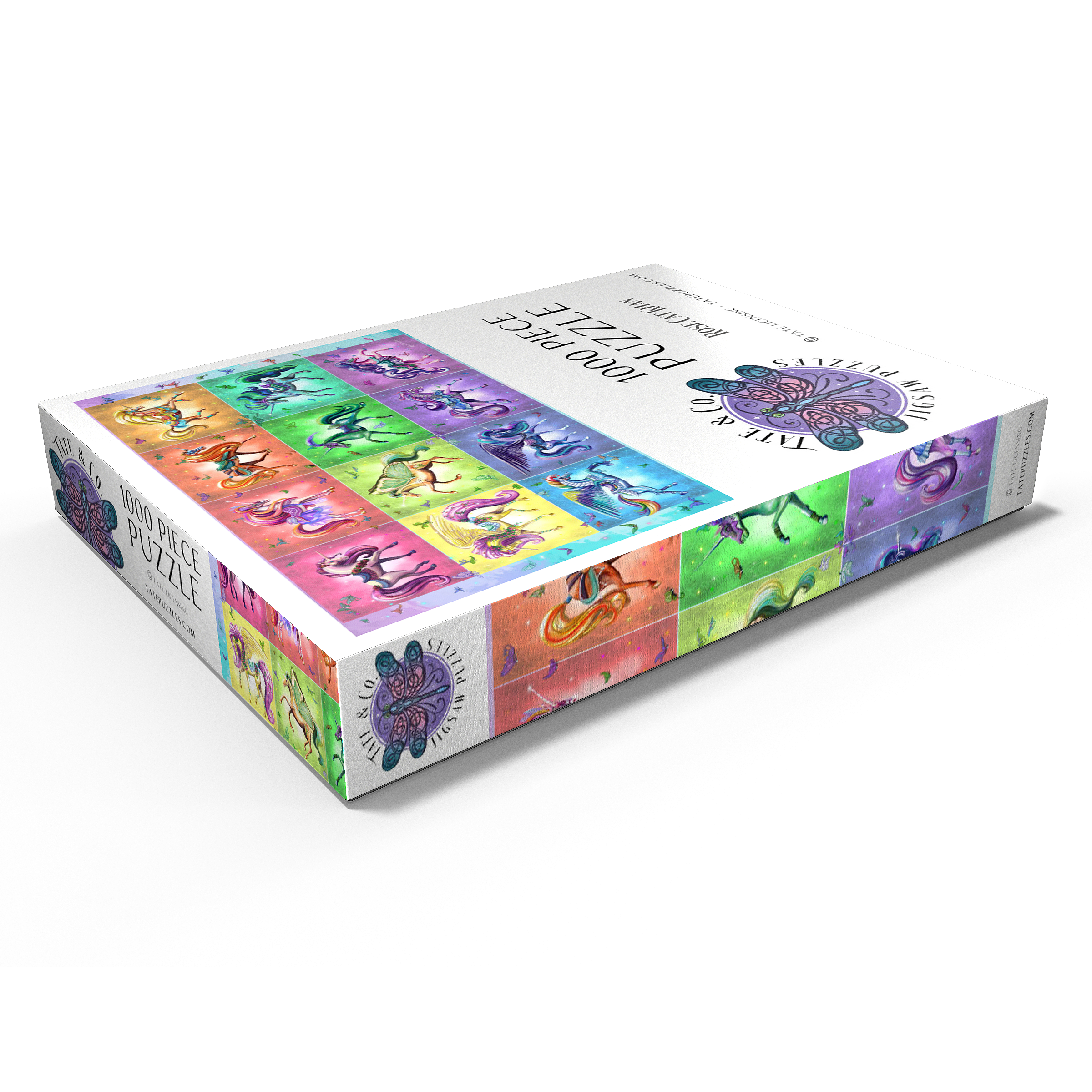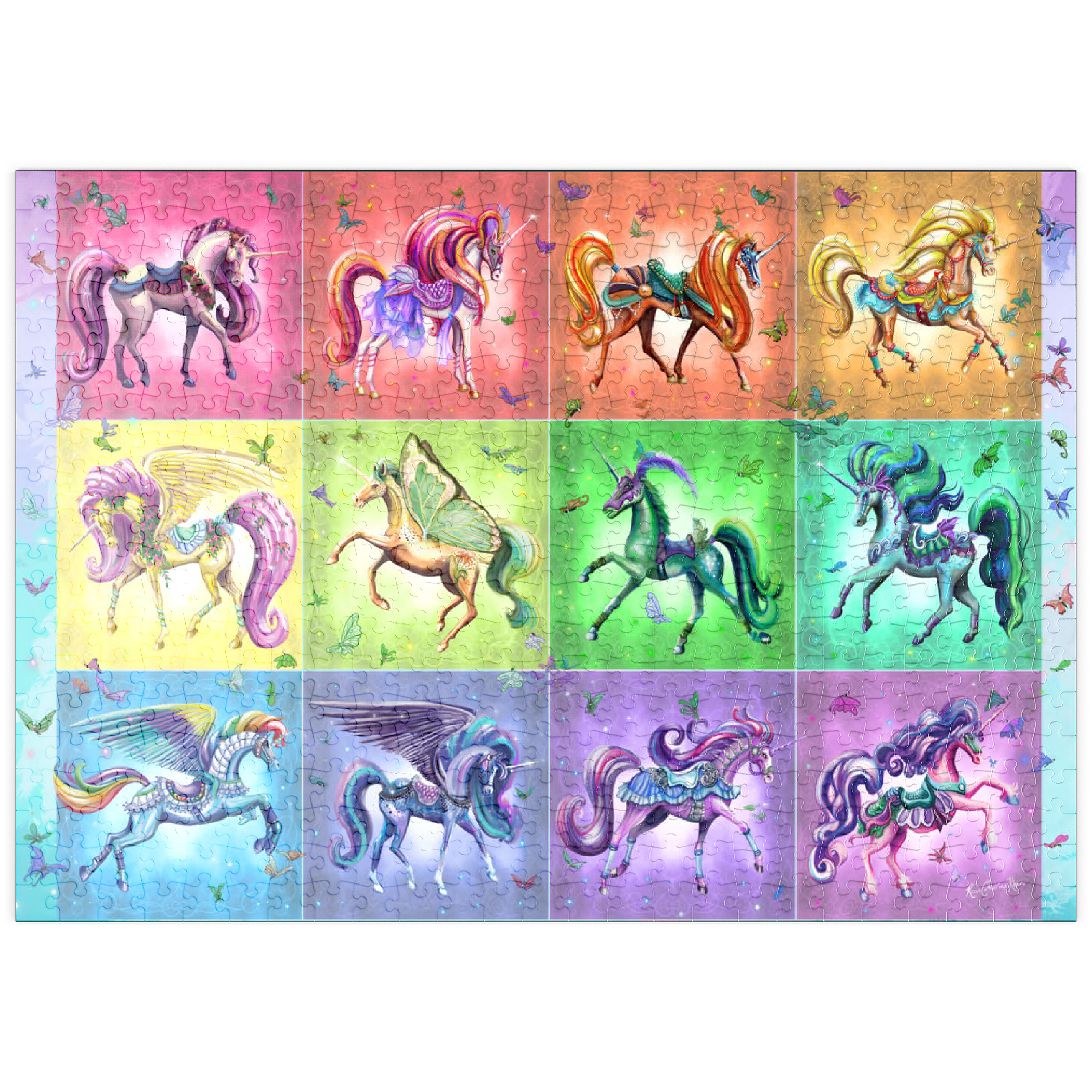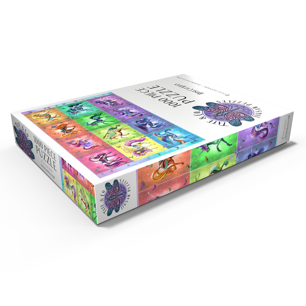 Zwölf schillernde Einhörner tanzen vor einem Regenbogenhintergrund in diesem lebhaften Puzzlebild von Rose Cat Khan. Jedes Einhorn ist mit verspielten Sätteln, Blumen, Flügeln und glitzernden Accessoires geschmückt – einige mit Schmetterlingsflügeln, andere mit üppigen Mähnen und wallenden Roben. Die kunstvollen Zaumzeuge und Posen lassen den Zauber einer Karussellfahrt erahnen und wecken Erinnerungen an verzauberte Ausflüge und Kindheitswunder. Verspielte Schmetterlinge flattern durch die Luft und verleihen jedem Bild Bewegung und Charme. Dieses Kunstwerk ist eine Feier der Farben, Charaktere und Fantasie und lädt den Betrachter in eine Galerie der Verzauberung ein, in der jedes Einhorn eine Geschichte erzählt und jeder Farbton Freude ausstrahlt.