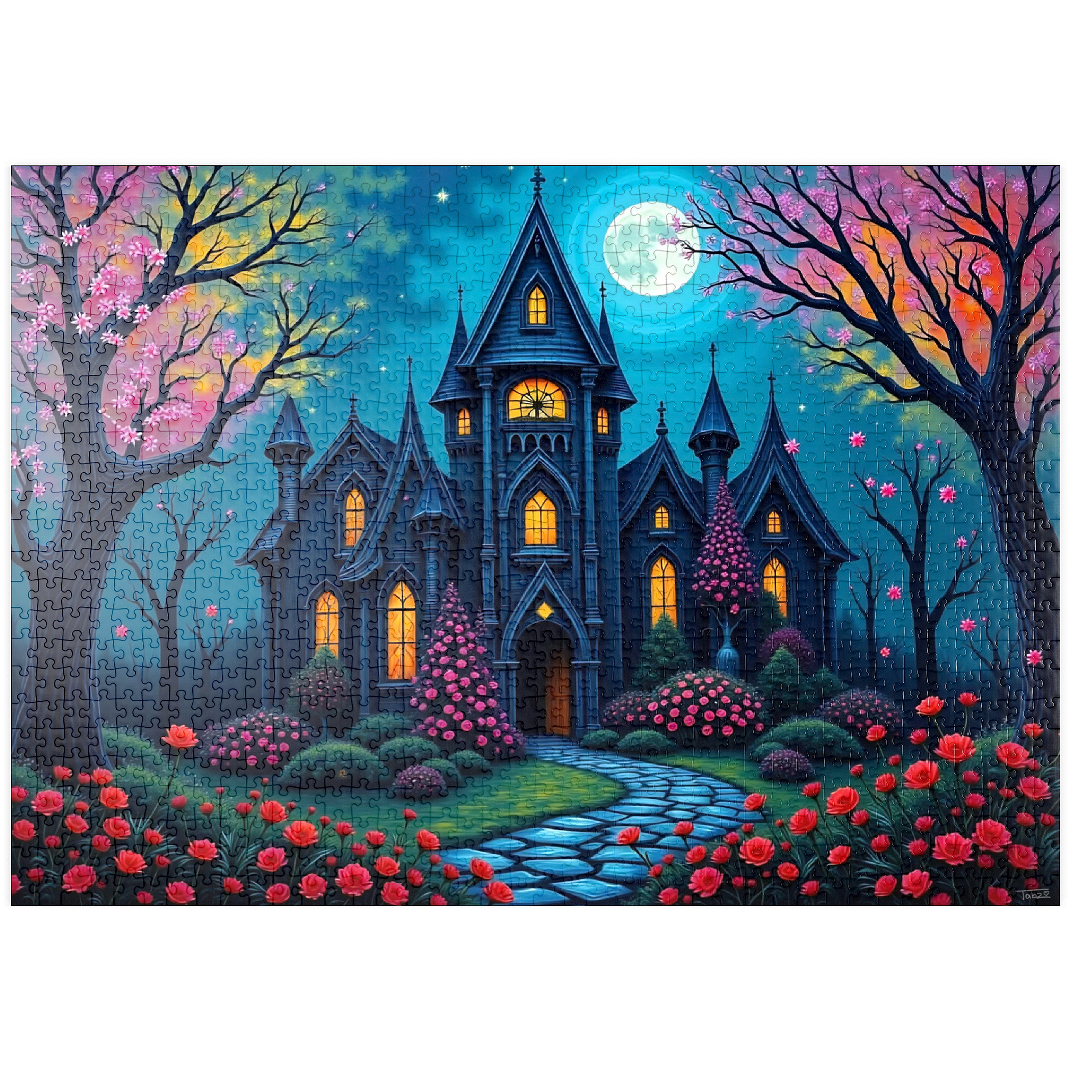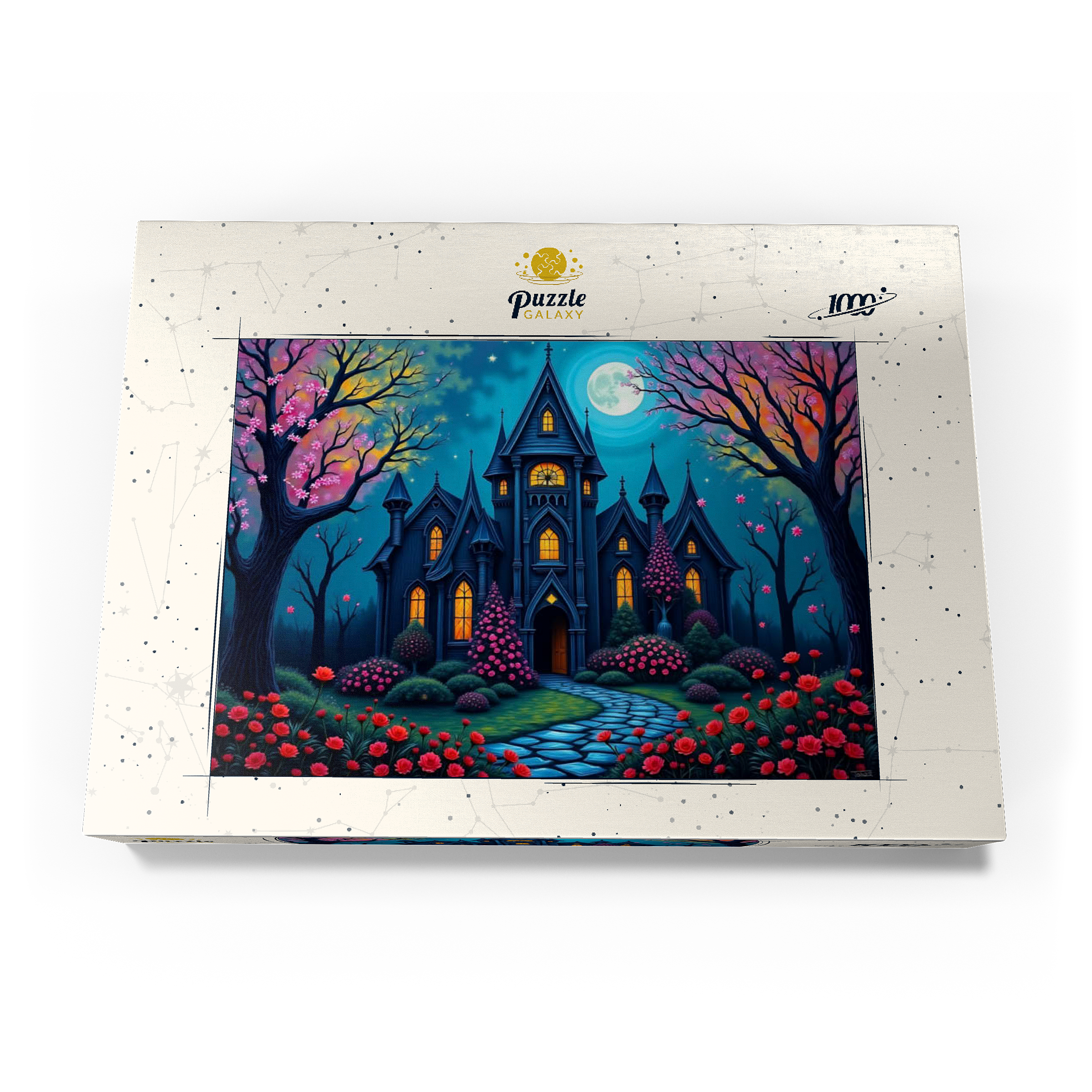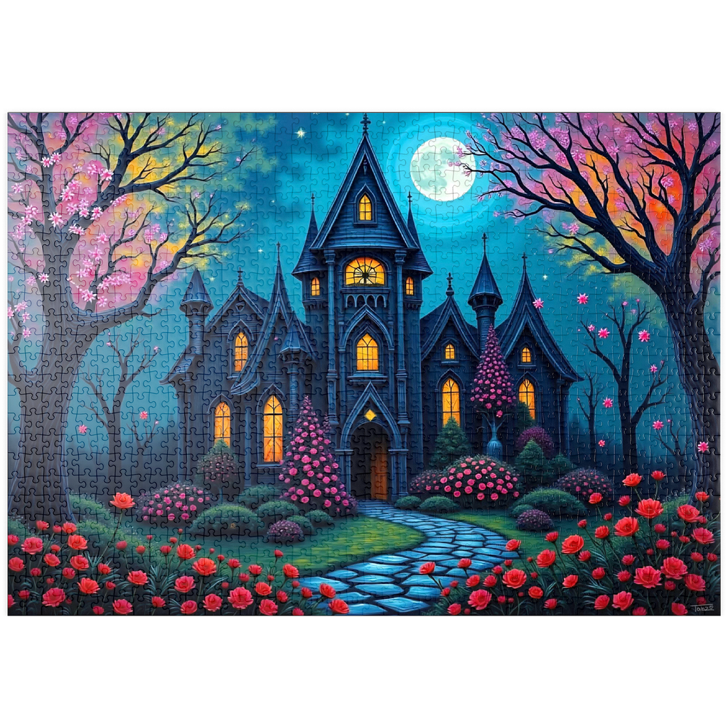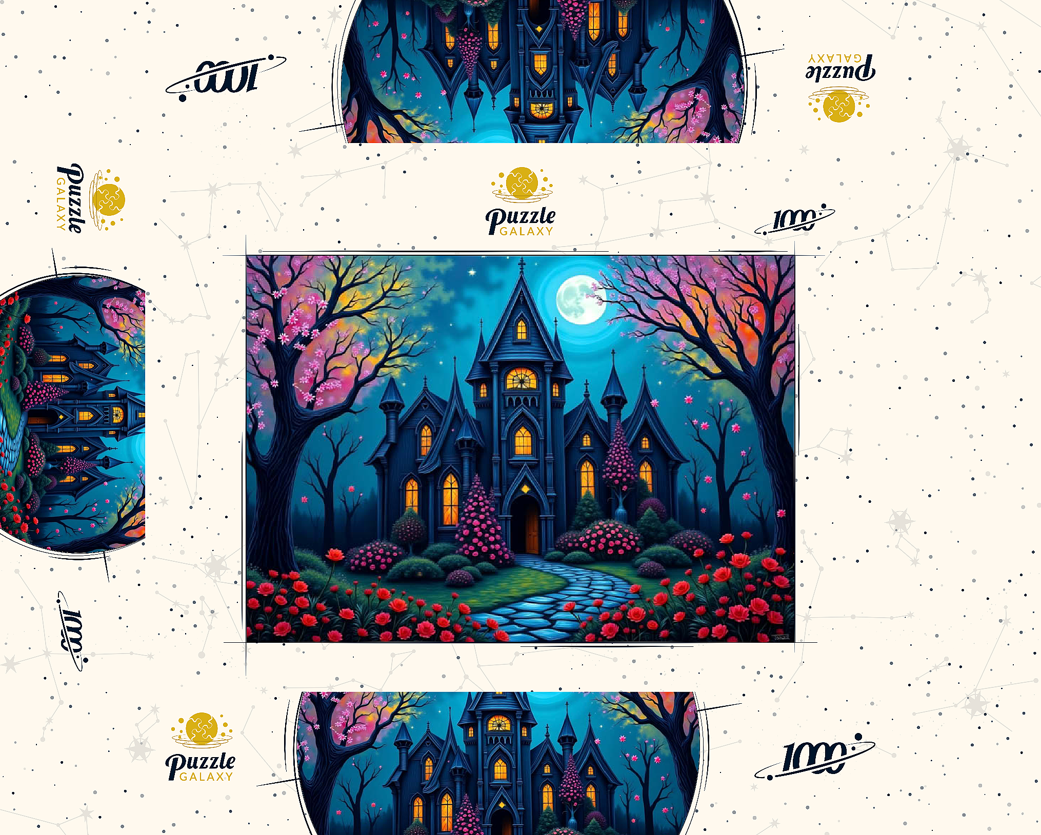 Bezauberndes gotisches Herrenhaus bei Vollmond mit blühendem Garten