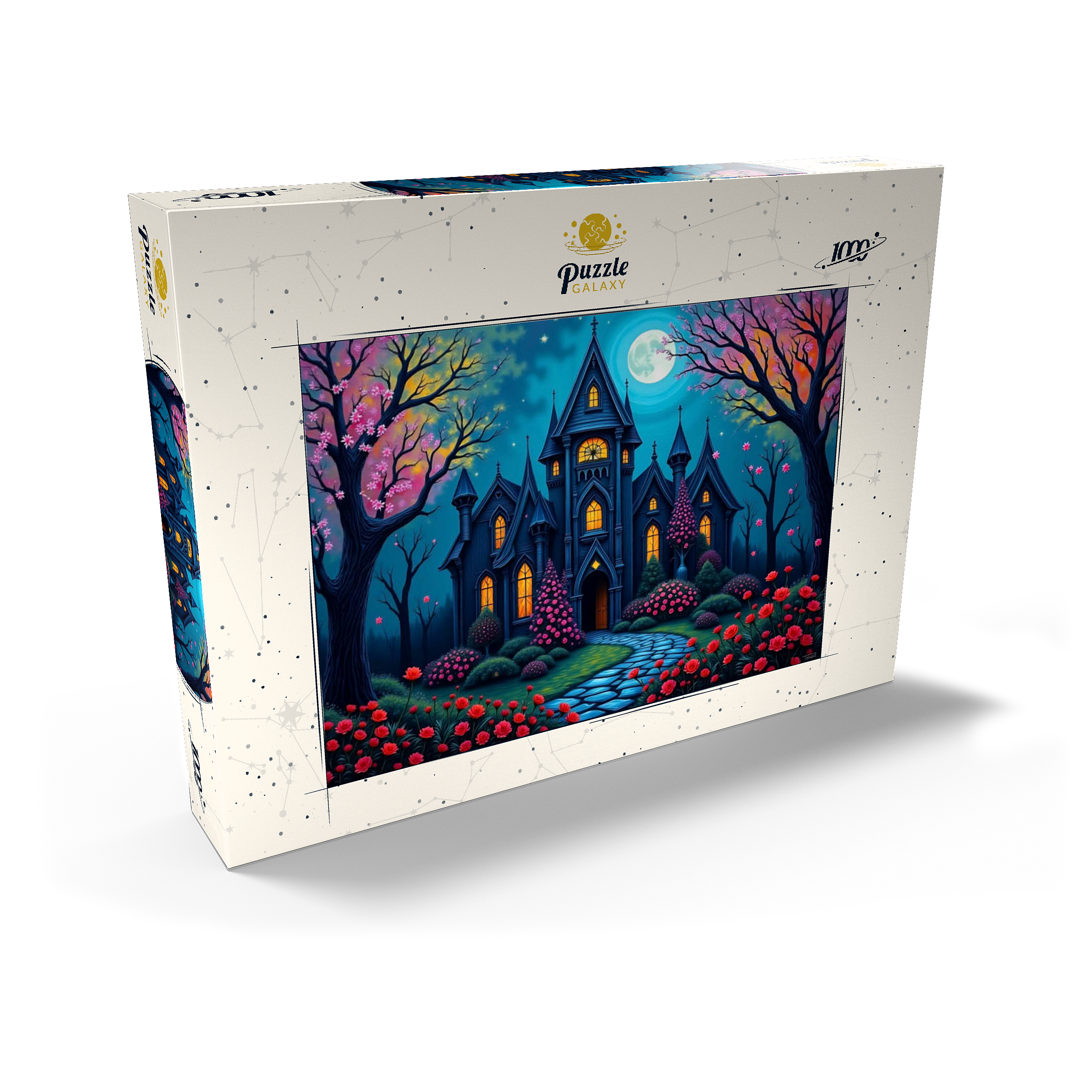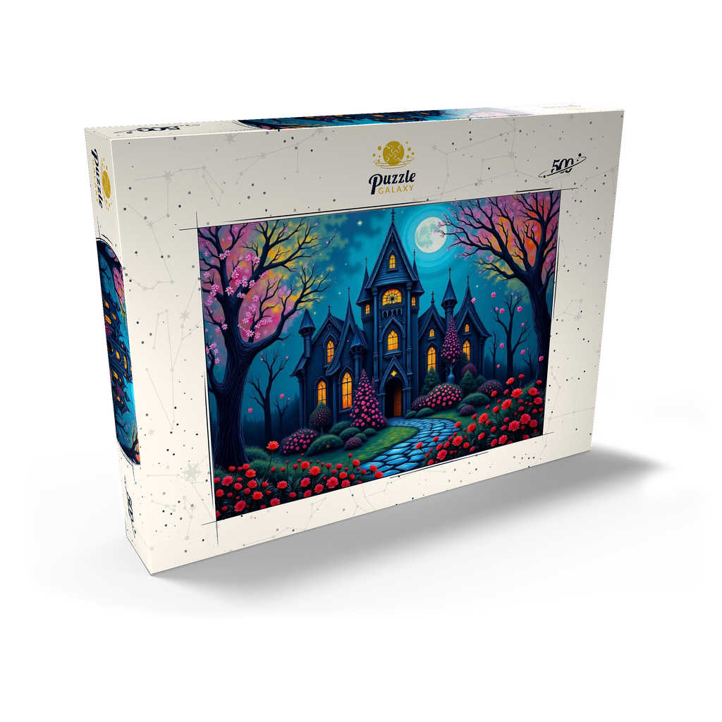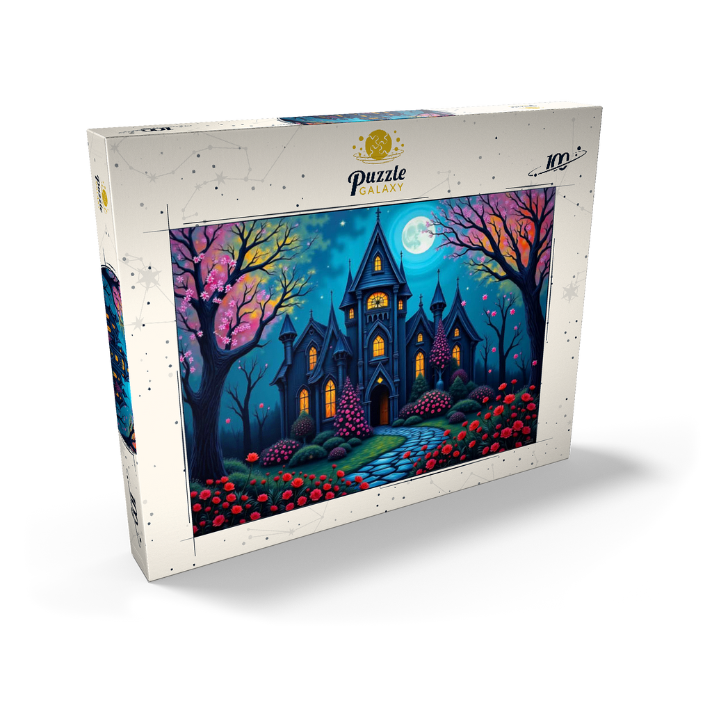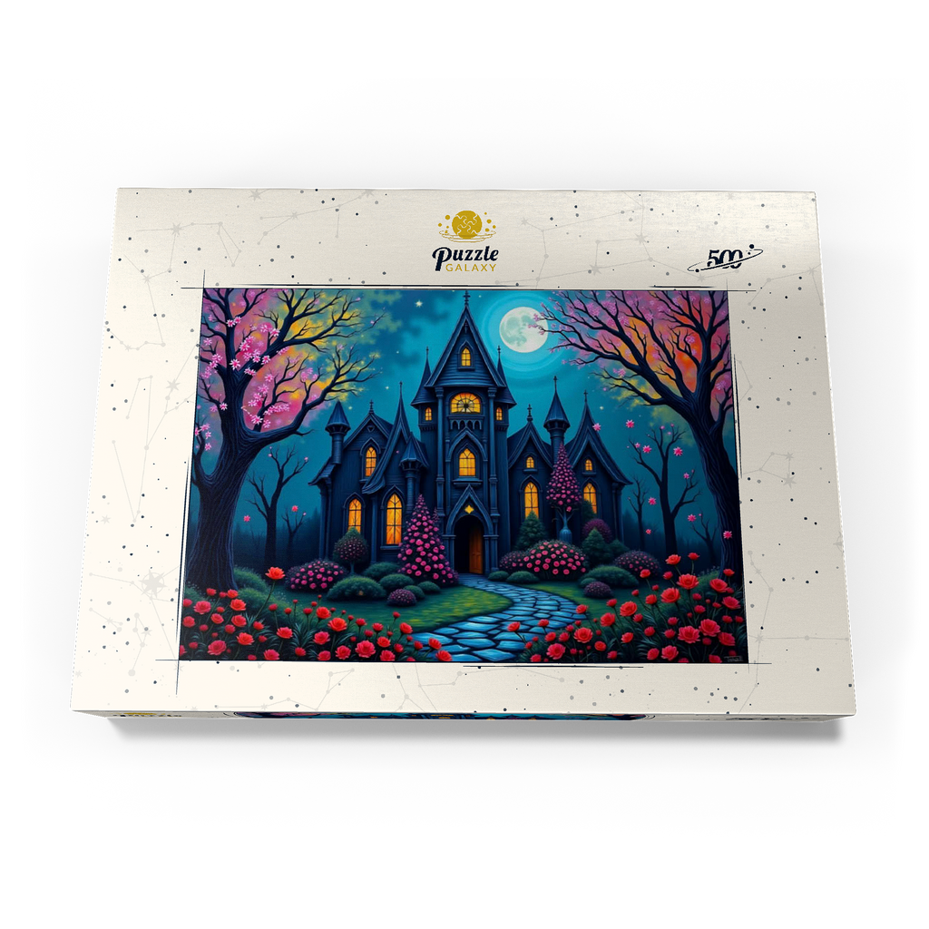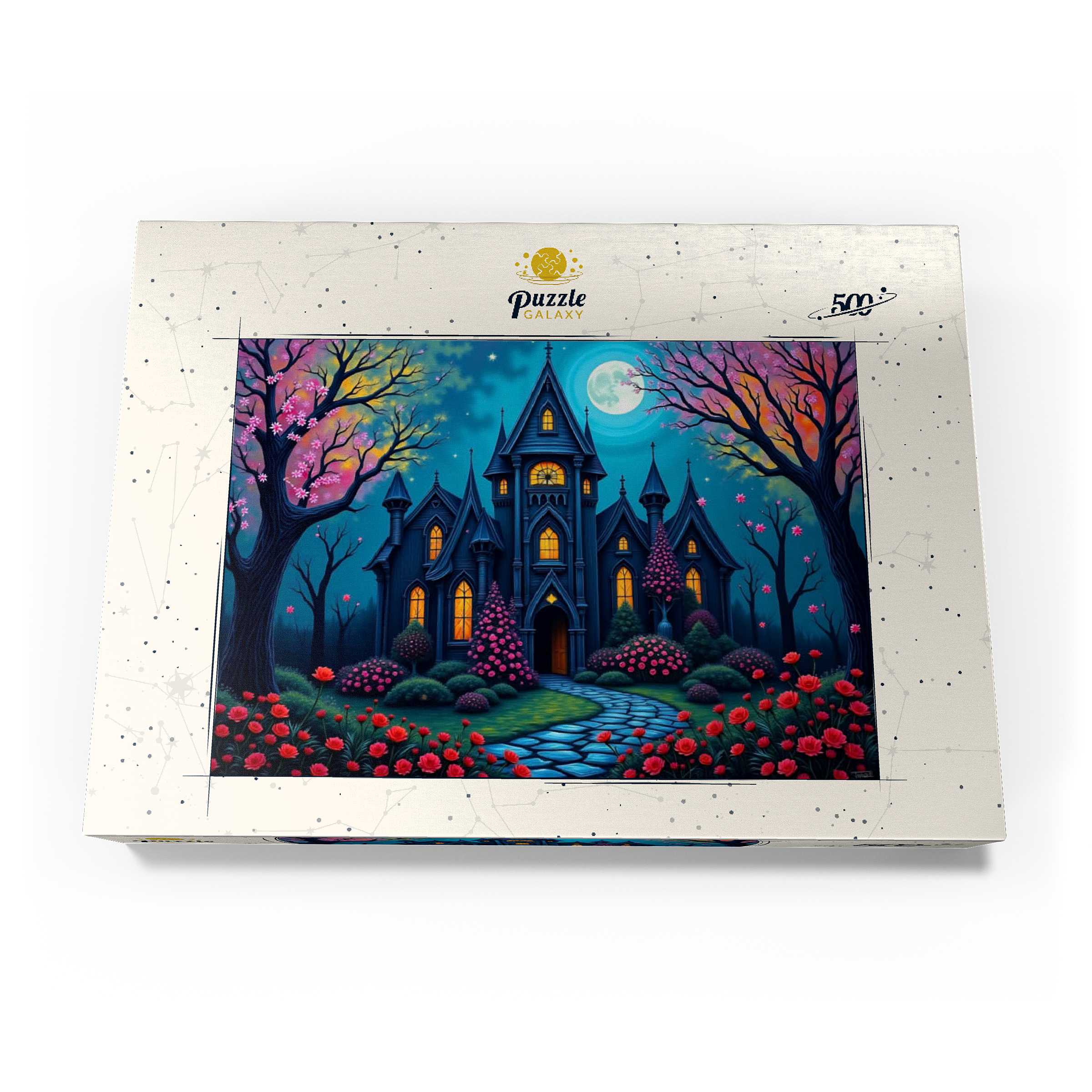 Bezauberndes gotisches Herrenhaus bei Vollmond mit blühendem Garten