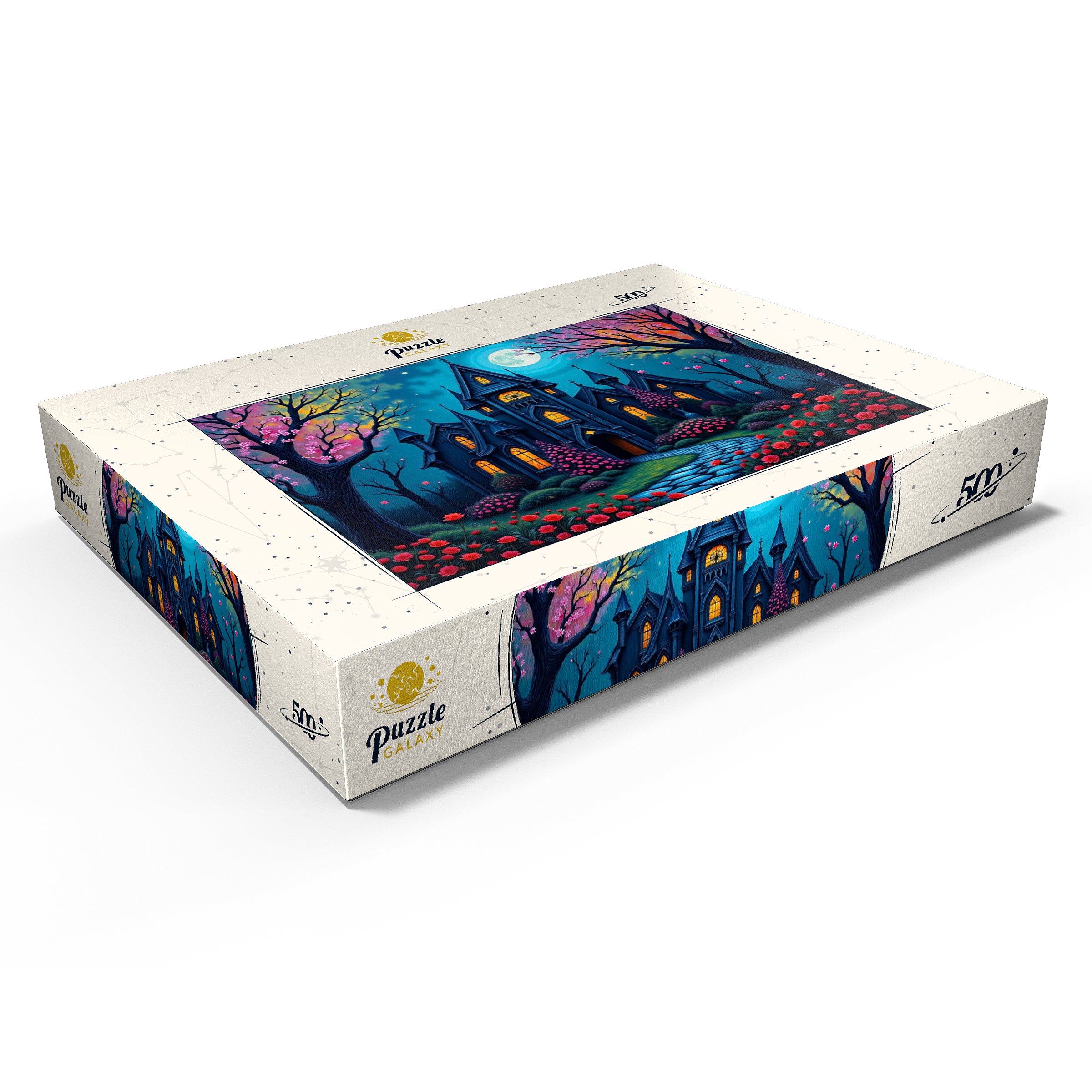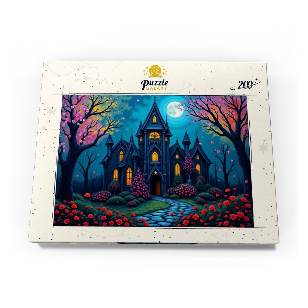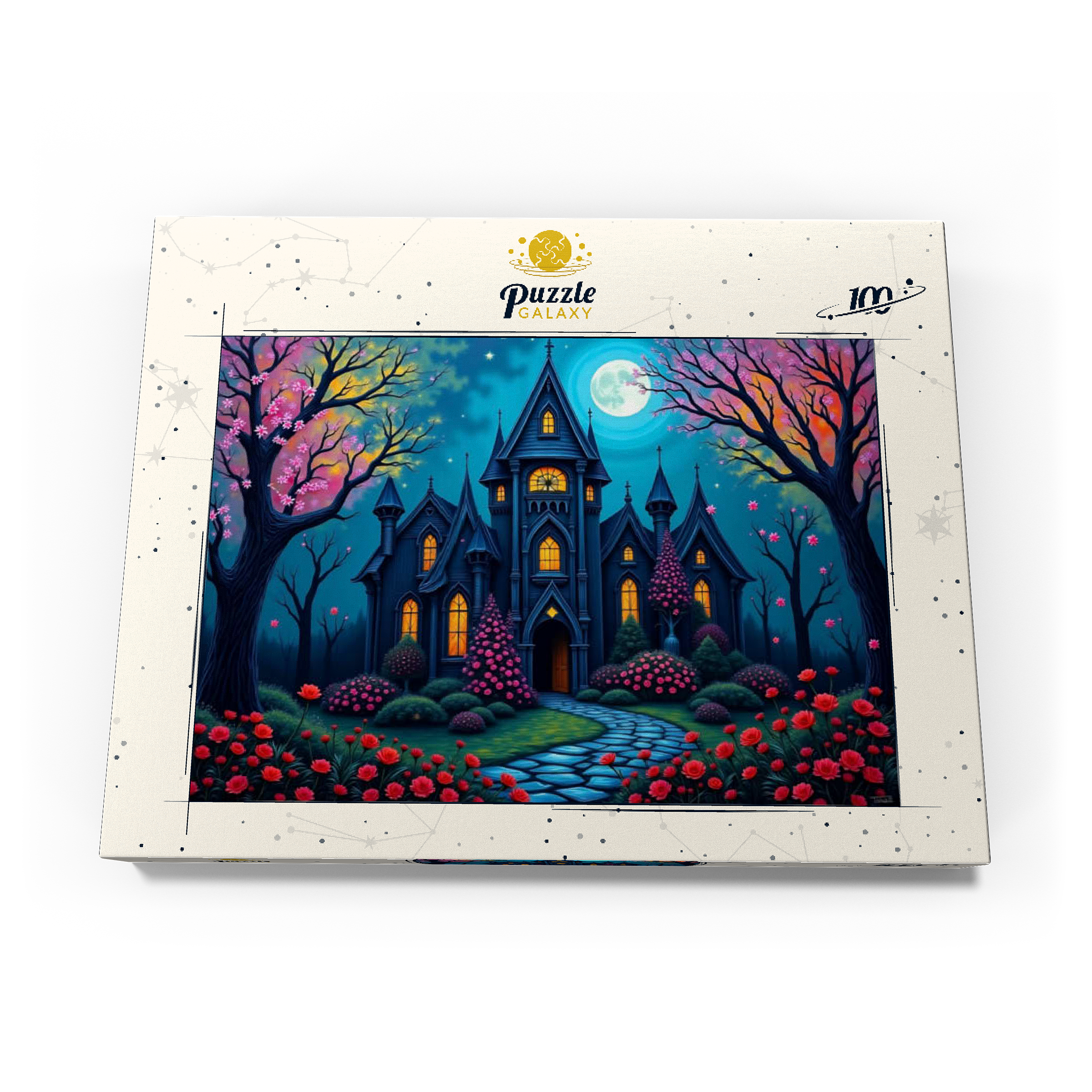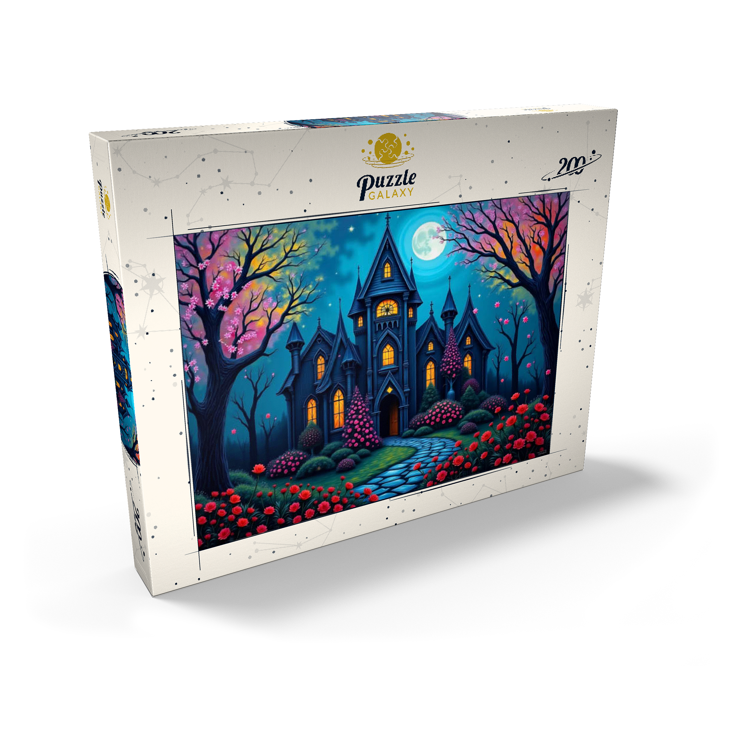 Bezauberndes gotisches Herrenhaus bei Vollmond mit blühendem Garten