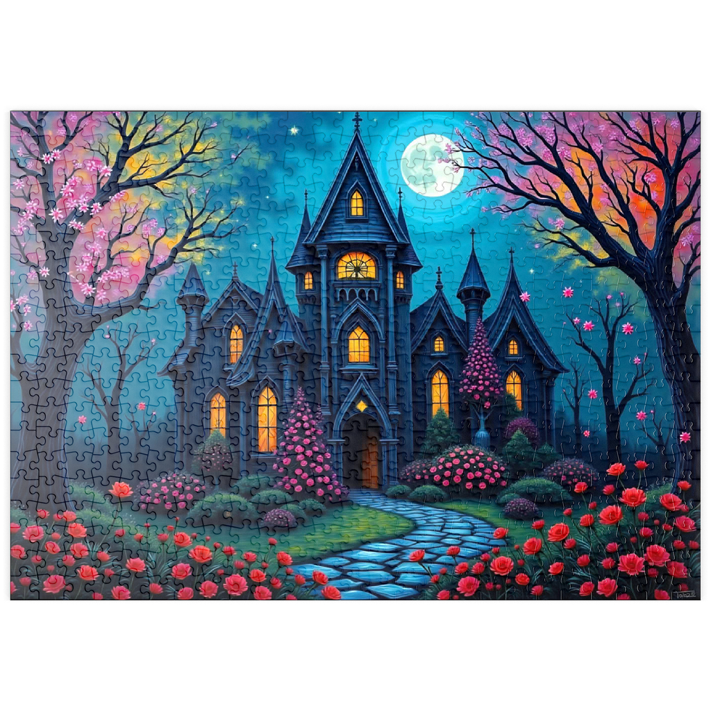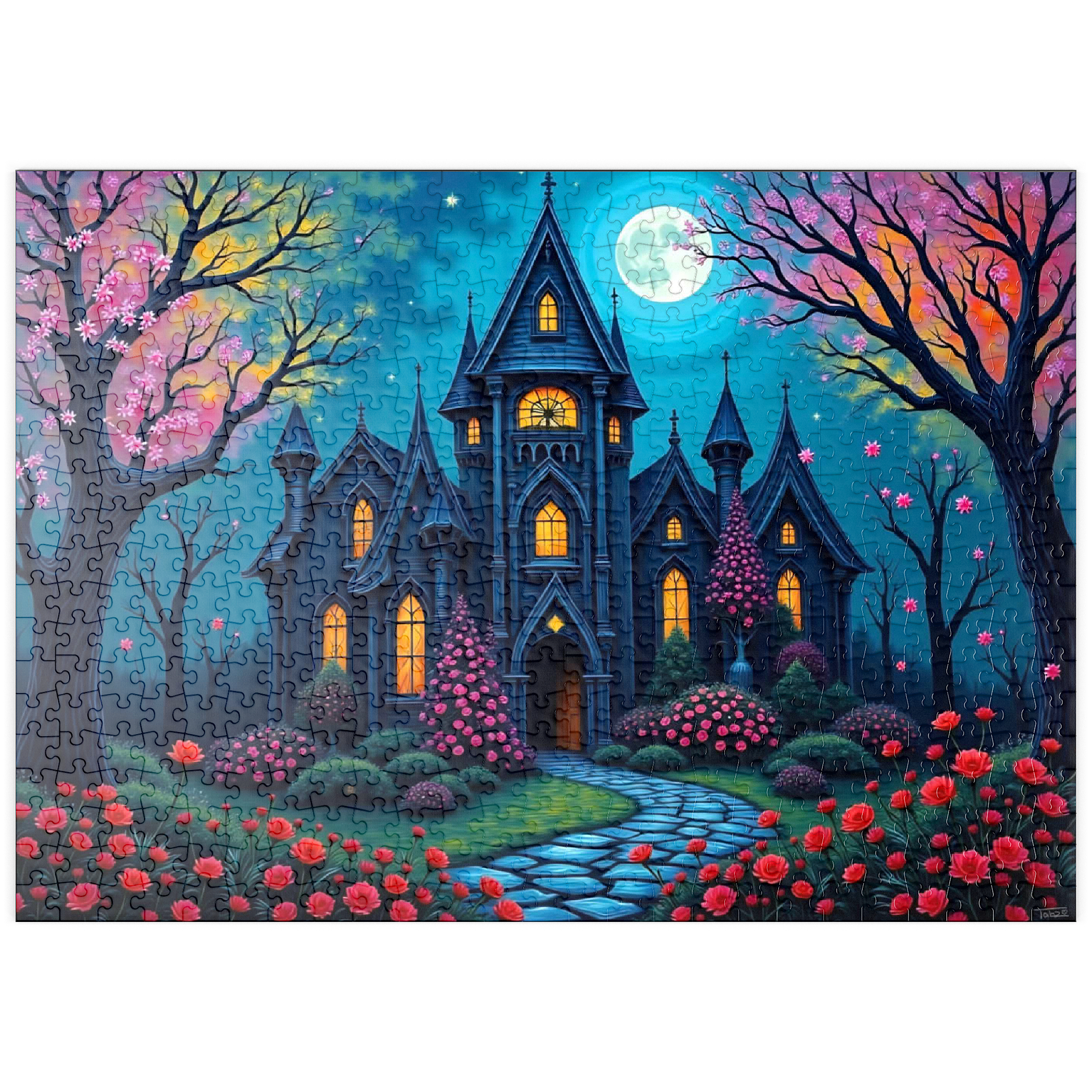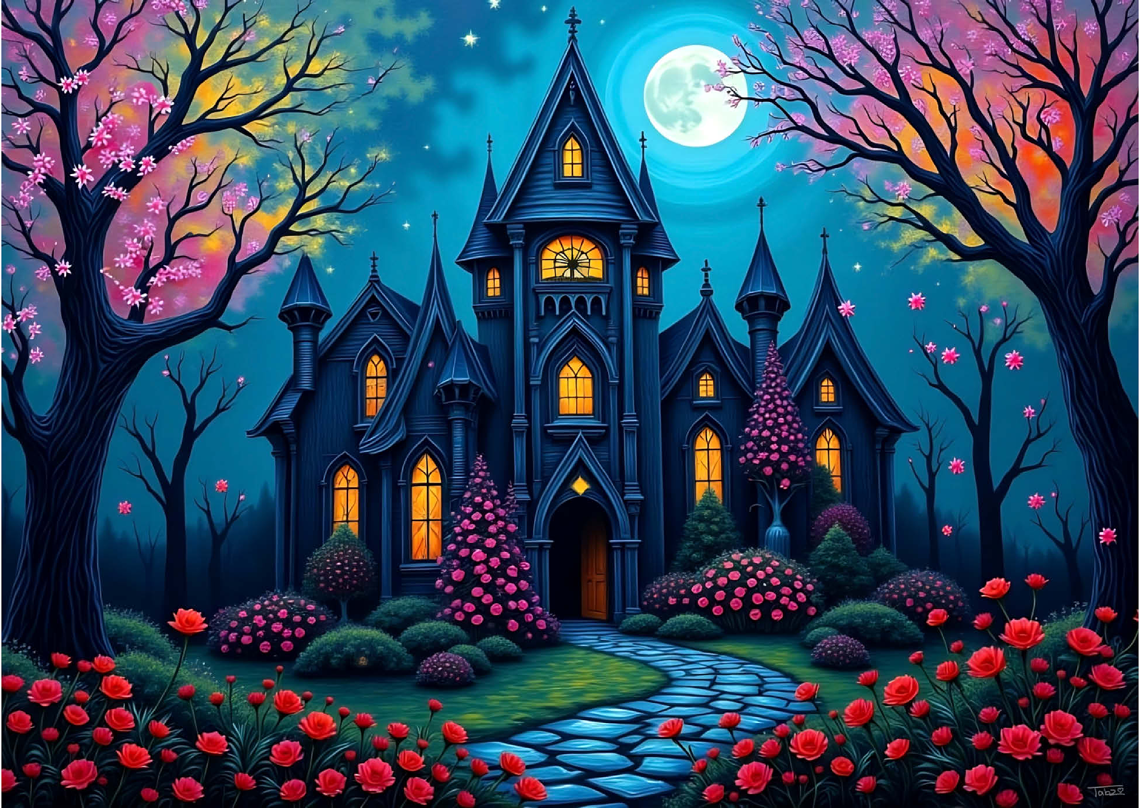 Ein faszinierendes digitales Kunstwerk einer majestätischen Villa im gotischen Stil, beleuchtet vom Schein eines strahlenden Vollmonds. Die dunkle, komplexe Architektur mit spitzen Türmen, Bogenfenstern und kunstvollen Details strahlt einen geheimnisvollen Charme aus. Die leuchtenden Fenster bilden einen wunderschönen Kontrast zum Nachthimmel, der in leuchtenden Blau-, Violett- und Rosatönen erstrahlt. Das Herrenhaus ist von einem üppigen Garten in voller Blüte umgeben, in dem leuchtend rote und rosa Rosen einen Steinweg säumen. Blühende Kirschbäume mit zarten Blütenblättern verleihen der Szene einen magischen Touch. Dieses Werk ist perfekt für Fans von Gothic-Fantasy, düsterer Märchenästhetik und bezaubernder Landschaftskunst und eignet sich ideal als Wanddekoration oder als Blickfang für stimmungsvolle Räume.