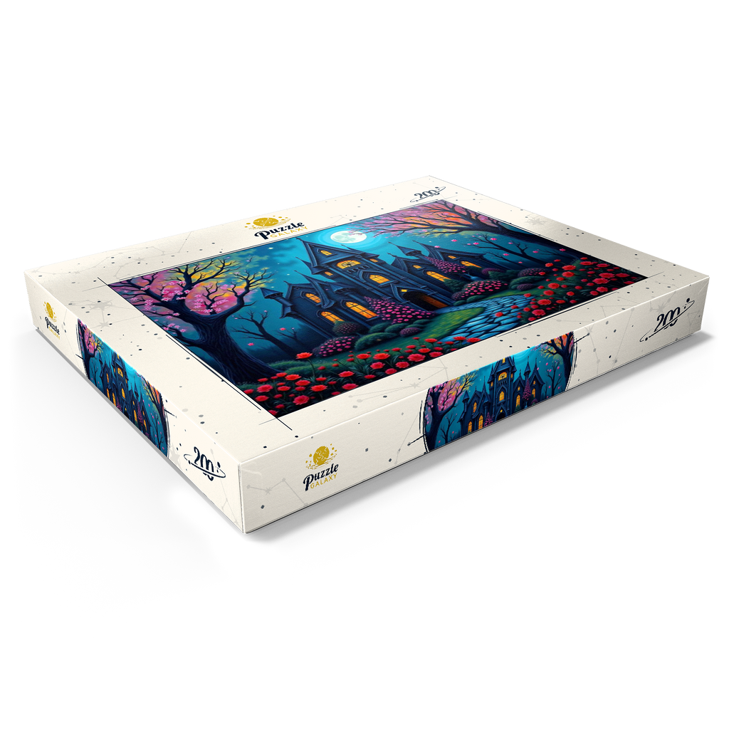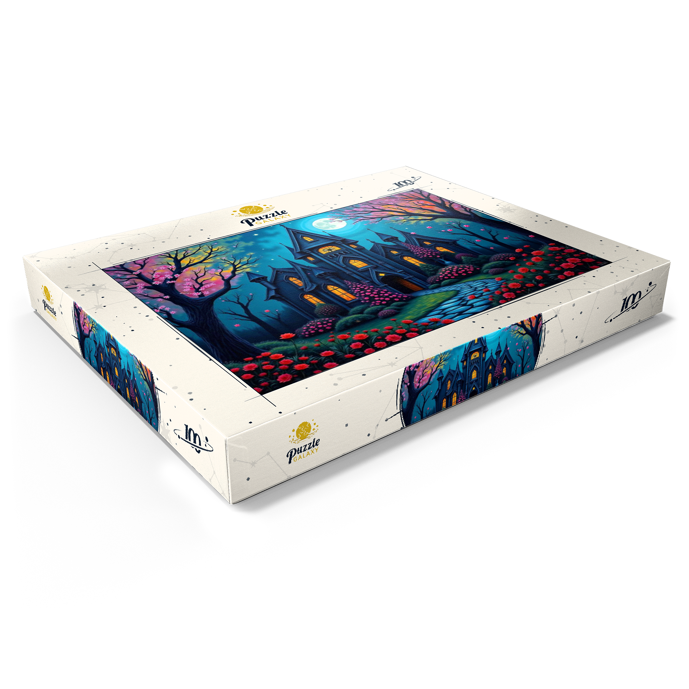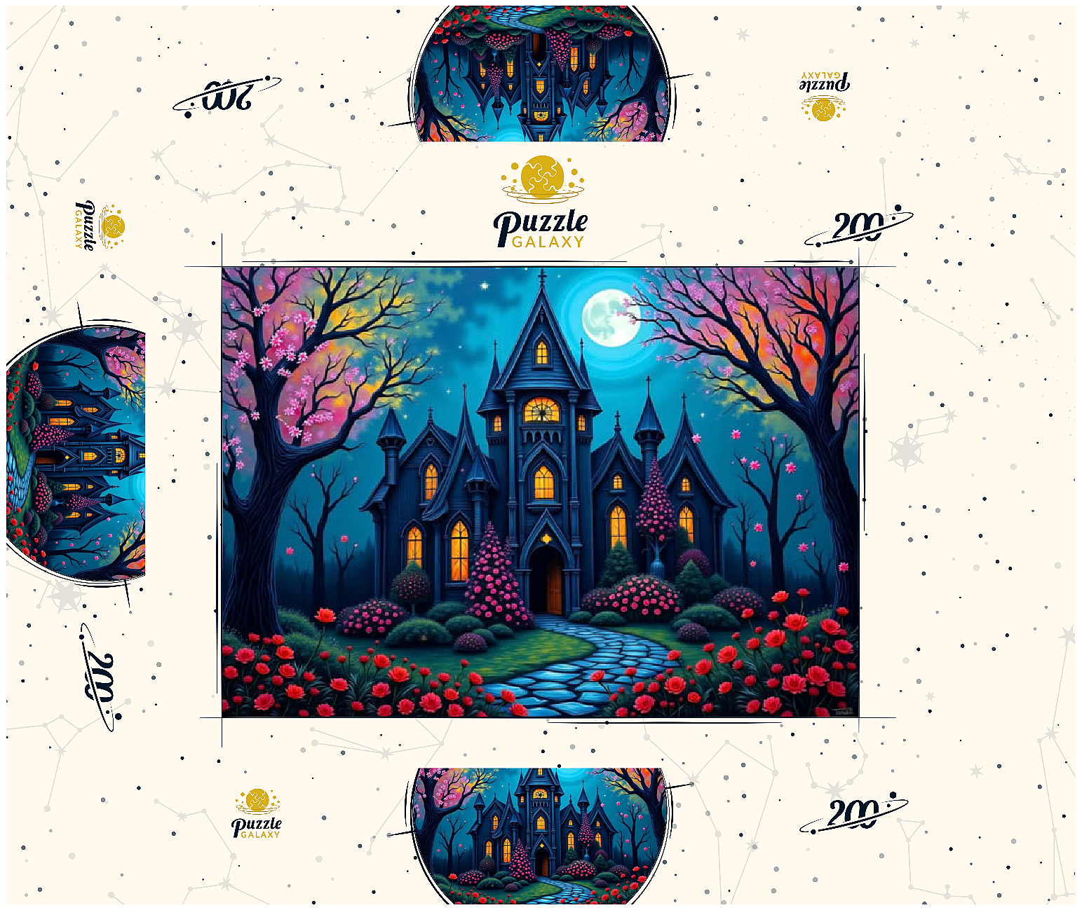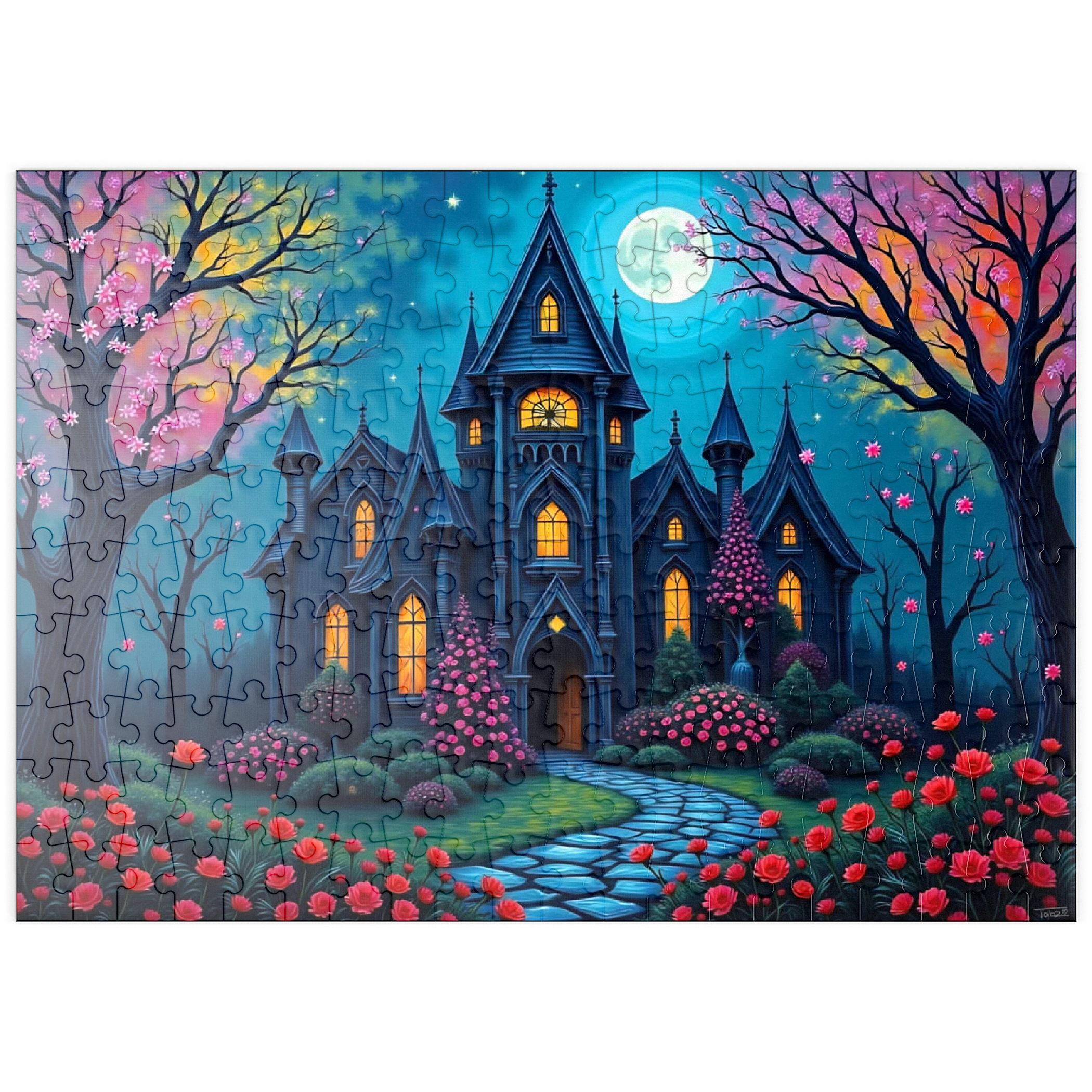 Ein faszinierendes digitales Kunstwerk einer majestätischen Villa im gotischen Stil, beleuchtet vom Schein eines strahlenden Vollmonds. Die dunkle, komplexe Architektur mit spitzen Türmen, Bogenfenstern und kunstvollen Details strahlt einen geheimnisvollen Charme aus. Die leuchtenden Fenster bilden einen wunderschönen Kontrast zum Nachthimmel, der in leuchtenden Blau-, Violett- und Rosatönen erstrahlt. Das Herrenhaus ist von einem üppigen Garten in voller Blüte umgeben, in dem leuchtend rote und rosa Rosen einen Steinweg säumen. Blühende Kirschbäume mit zarten Blütenblättern verleihen der Szene einen magischen Touch. Dieses Werk ist perfekt für Fans von Gothic-Fantasy, düsterer Märchenästhetik und bezaubernder Landschaftskunst und eignet sich ideal als Wanddekoration oder als Blickfang für stimmungsvolle Räume.