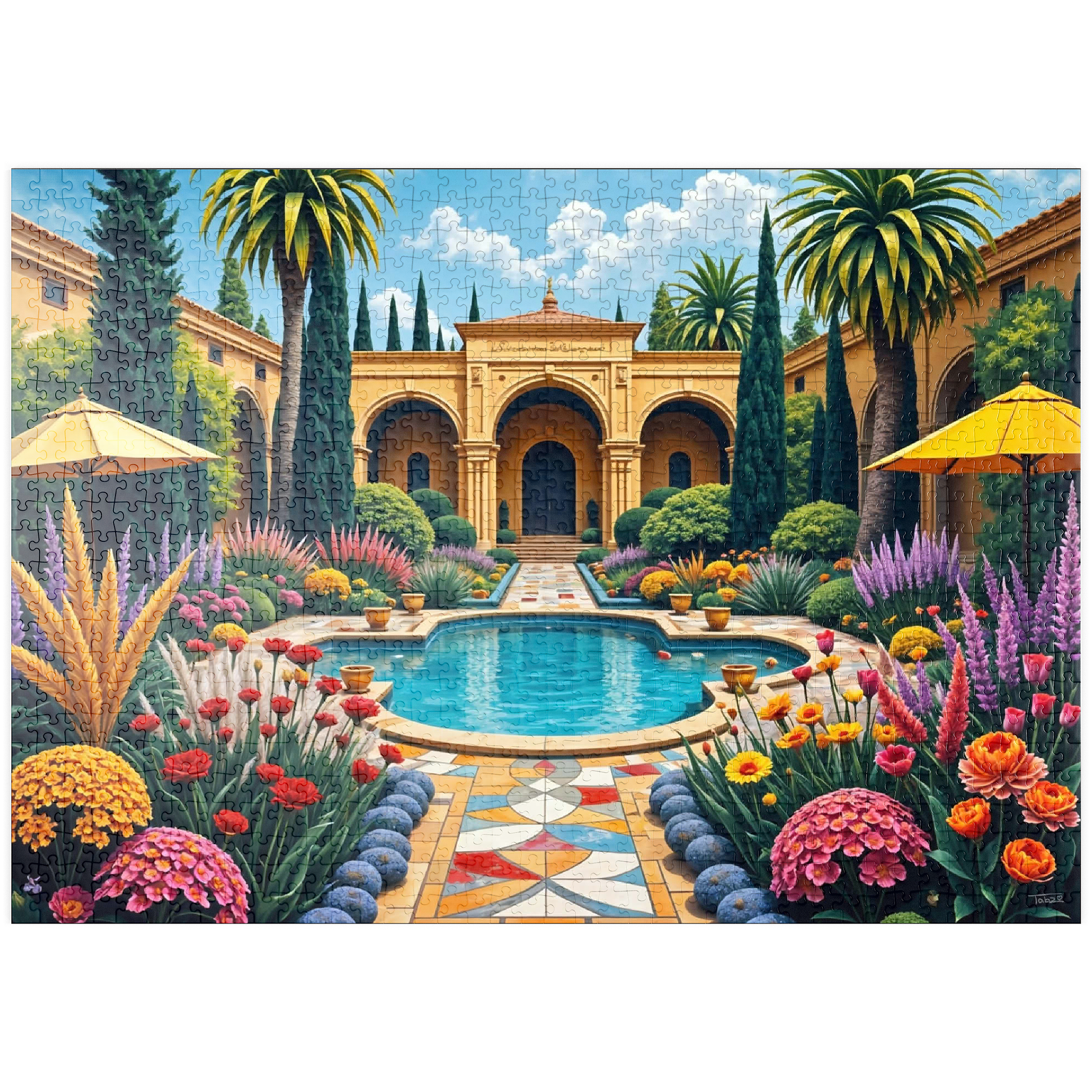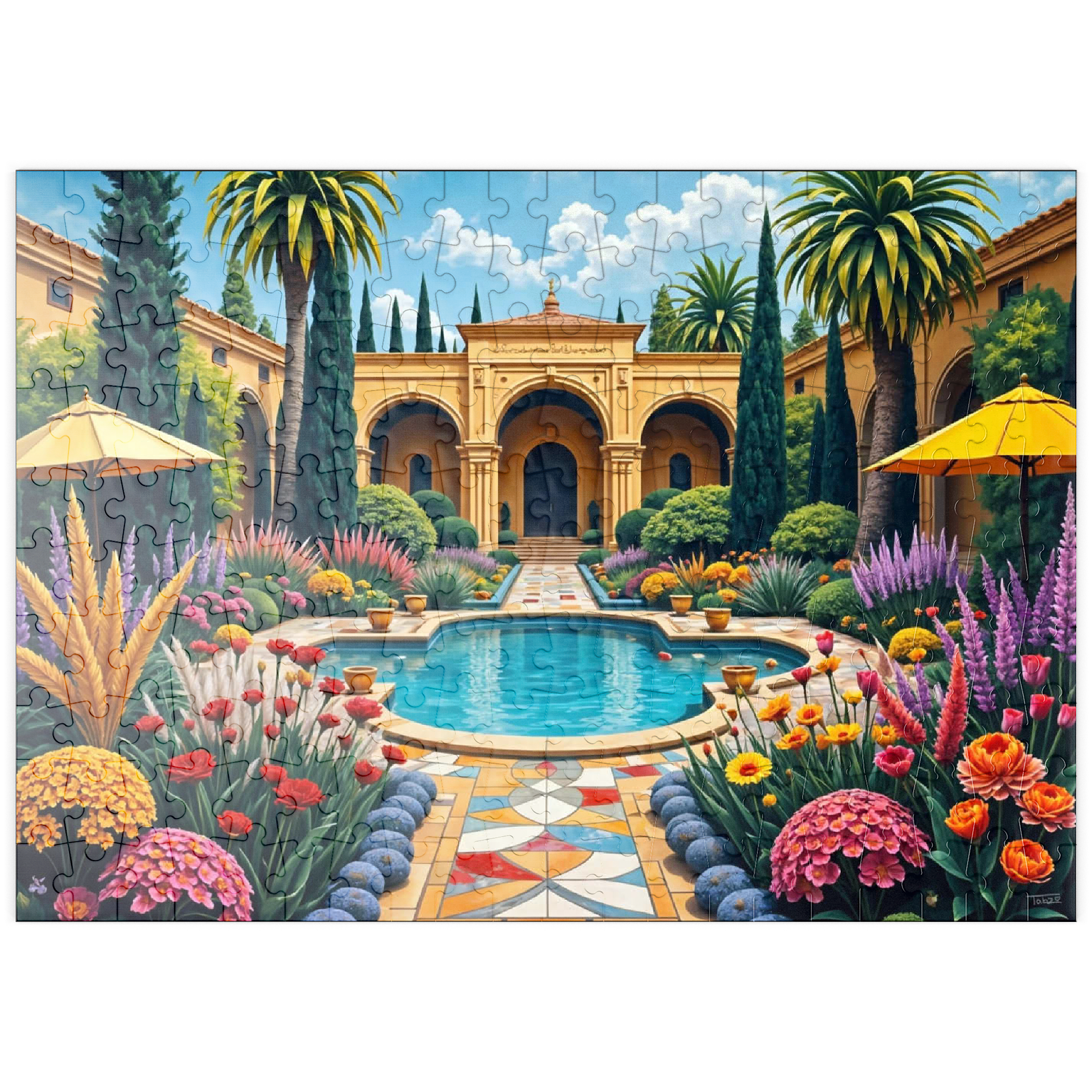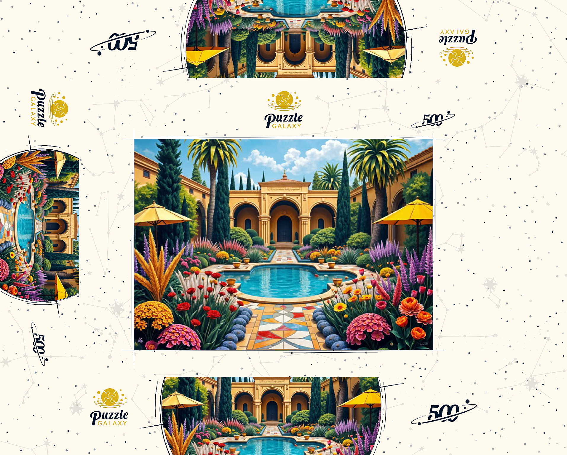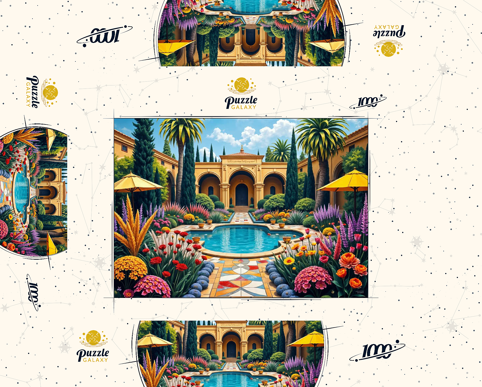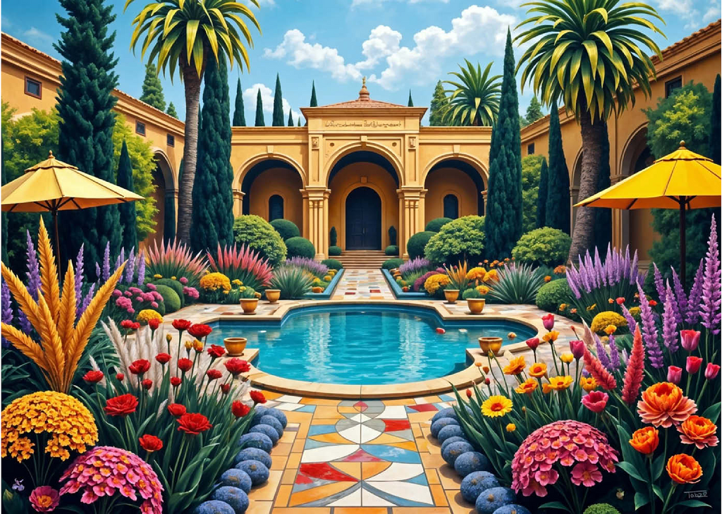 Ein atemberaubendes digitales Kunstwerk eines luxuriösen mediterranen Innenhofgartens mit einem glitzernden blauen Pool, umgeben von leuchtenden Blumen und üppigem Grün. Die elegante Architektur mit ihren goldenen Bögen und Terrakottatönen vermittelt ein Gefühl von zeitloser Schönheit. Hoch aufragende Palmen und schlanke Zypressen rahmen den ruhigen Raum ein, während aufwendige Mosaikfliesen den Poolrand säumen. Leuchtend gelbe Sonnenschirme spenden Schatten und setzen farbliche Akzente, die die blühenden Blumen in Rot, Orange, Violett und Gelb perfekt ergänzen. Dieses Kunstwerk ist ideal für Liebhaber mediterraner Landschaften, luxuriöser Gartengestaltung und architektonischer Eleganz und eignet sich perfekt als Wanddekoration oder Designinspiration.