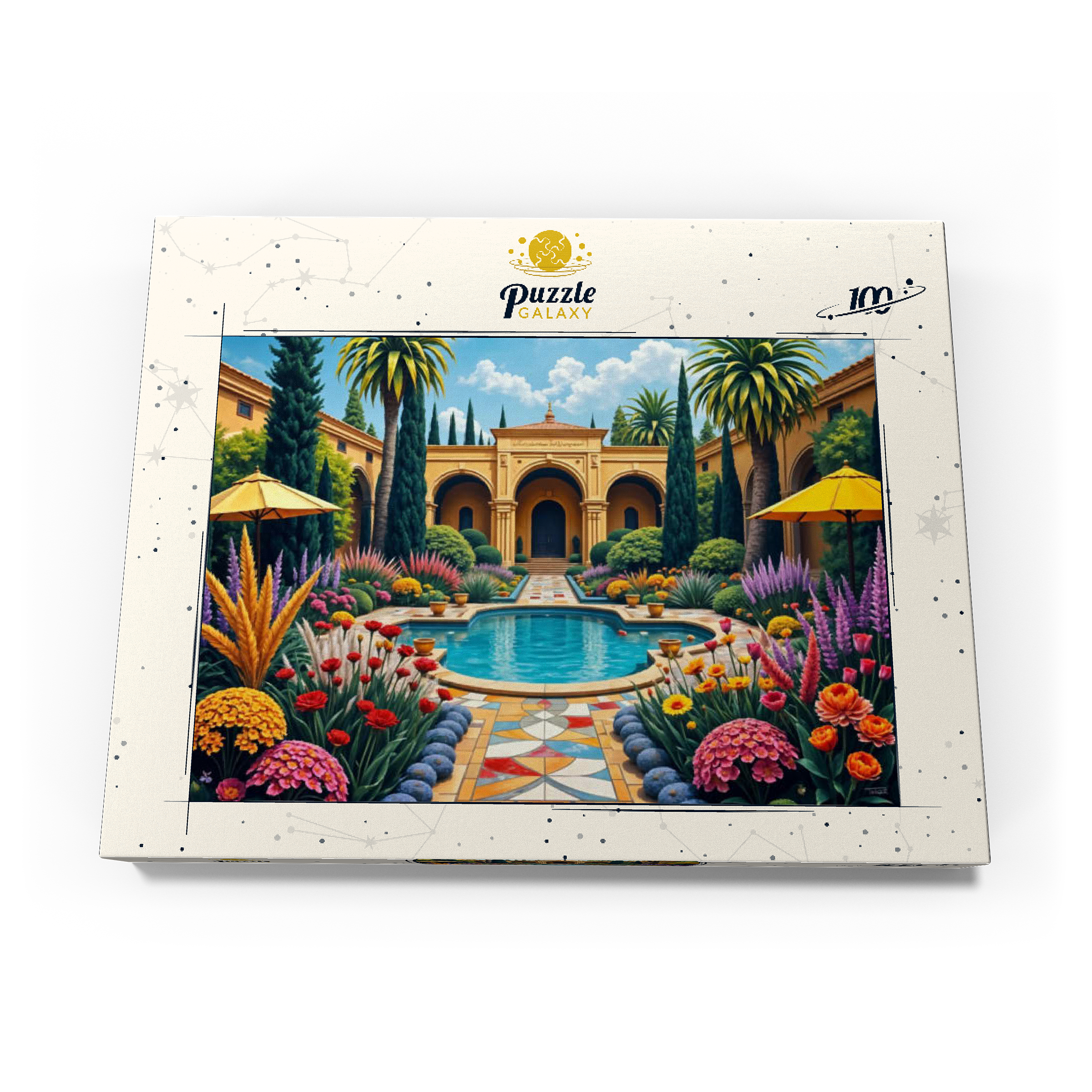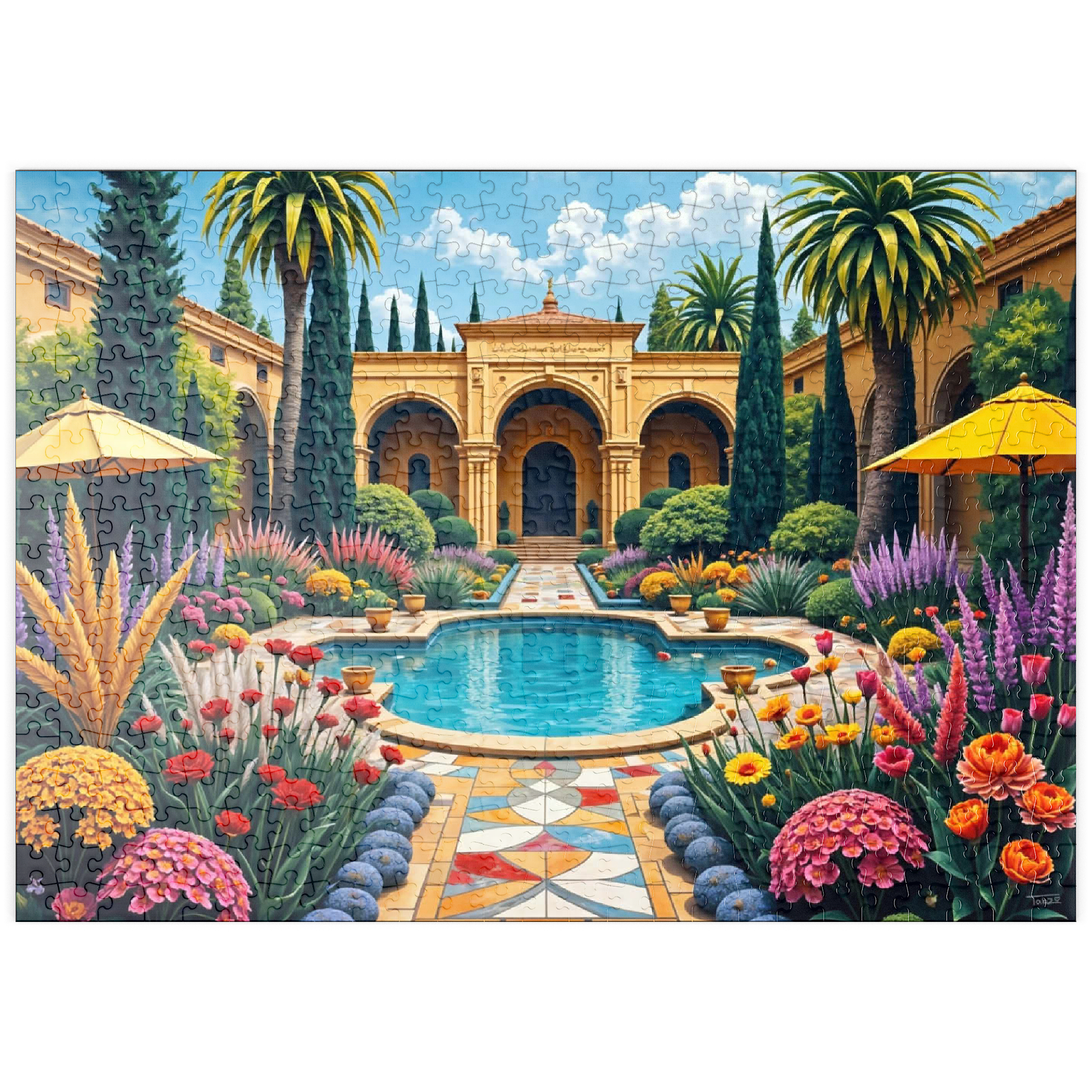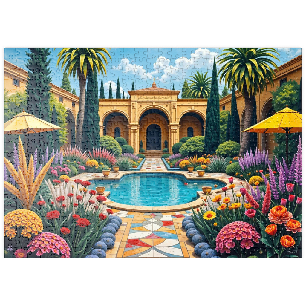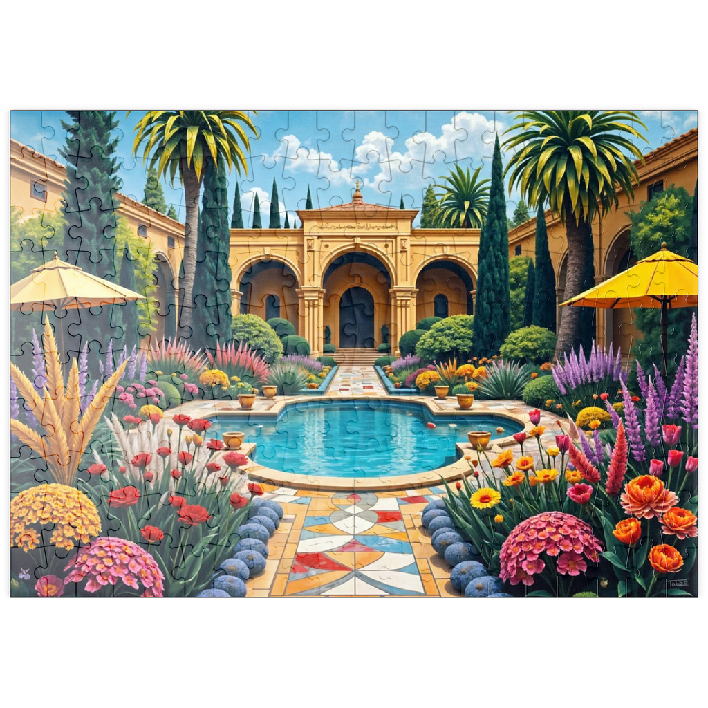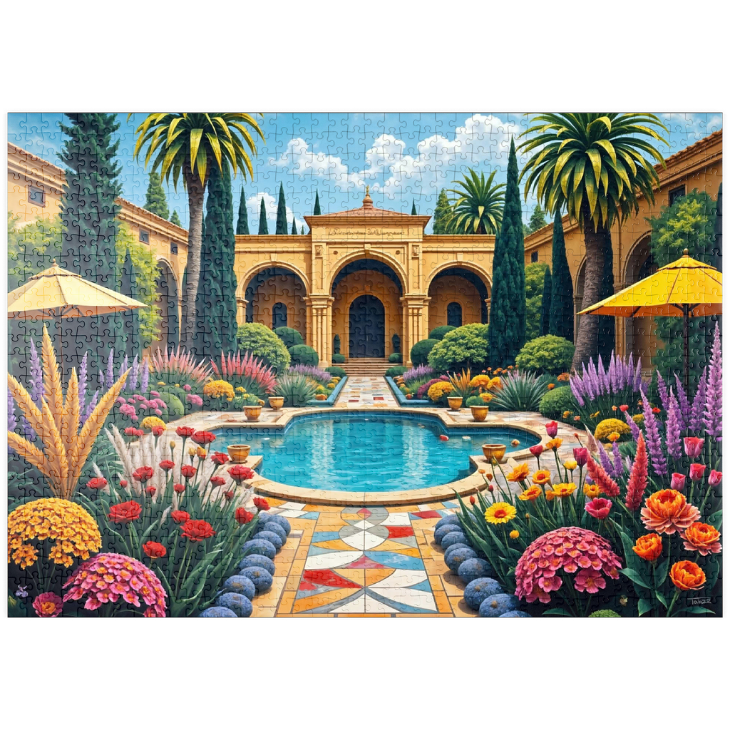 Ein atemberaubendes digitales Kunstwerk eines luxuriösen mediterranen Innenhofgartens mit einem glitzernden blauen Pool, umgeben von leuchtenden Blumen und üppigem Grün. Die elegante Architektur mit ihren goldenen Bögen und Terrakottatönen vermittelt ein Gefühl von zeitloser Schönheit. Hoch aufragende Palmen und schlanke Zypressen rahmen den ruhigen Raum ein, während aufwendige Mosaikfliesen den Poolrand säumen. Leuchtend gelbe Sonnenschirme spenden Schatten und setzen farbliche Akzente, die die blühenden Blumen in Rot, Orange, Violett und Gelb perfekt ergänzen. Dieses Kunstwerk ist ideal für Liebhaber mediterraner Landschaften, luxuriöser Gartengestaltung und architektonischer Eleganz und eignet sich perfekt als Wanddekoration oder Designinspiration.