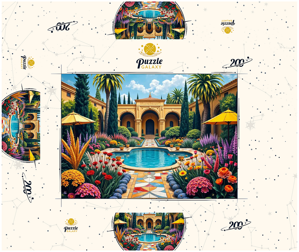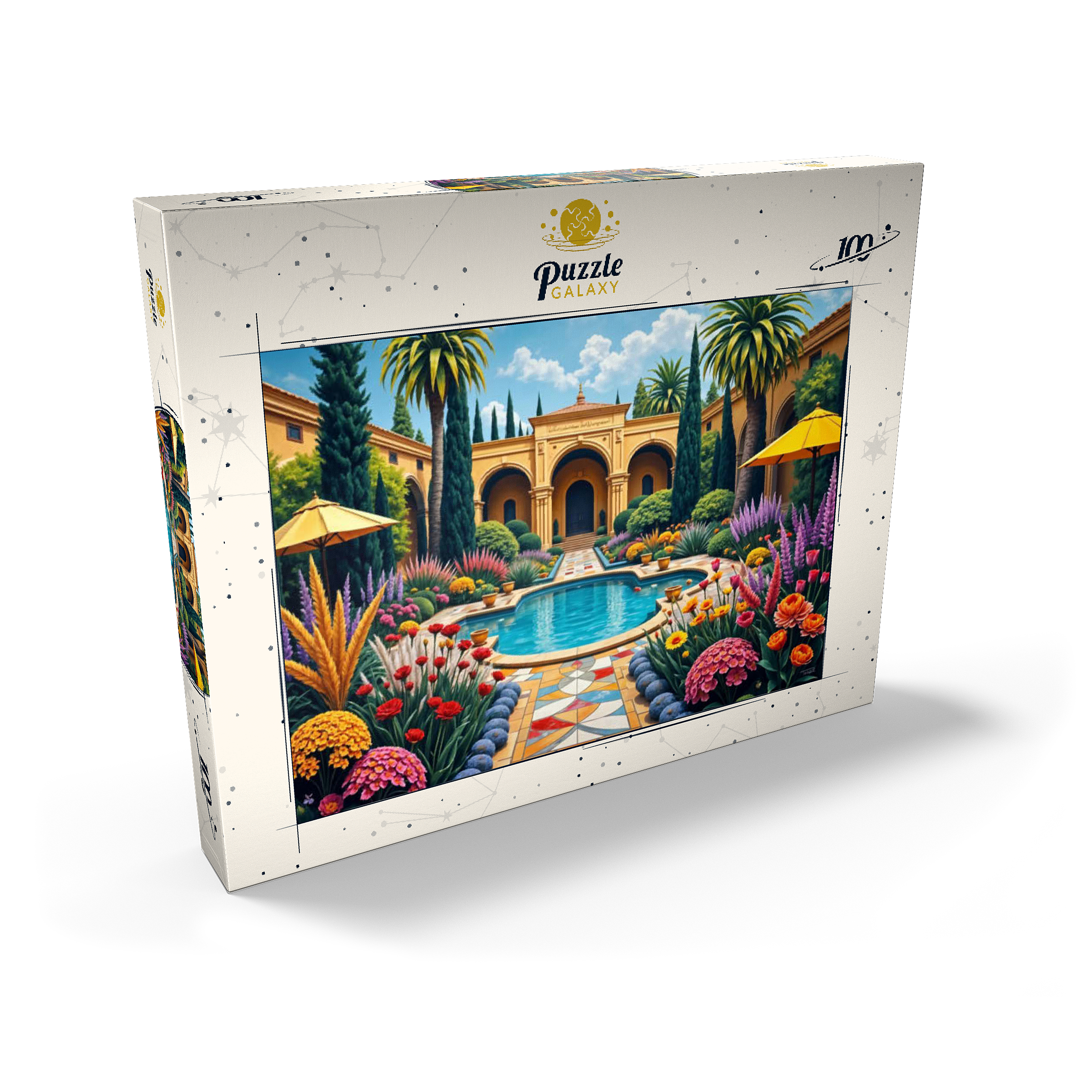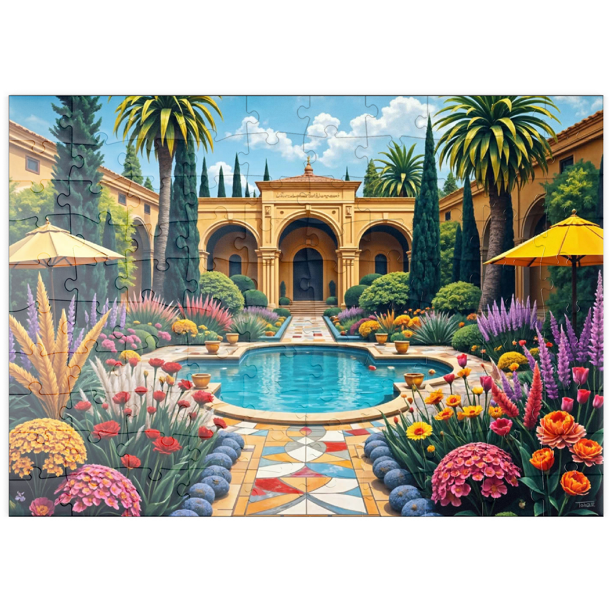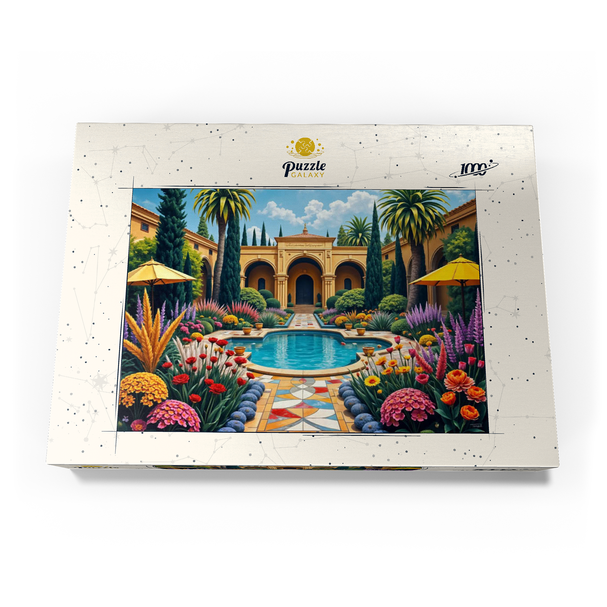 Ein atemberaubendes digitales Kunstwerk eines luxuriösen mediterranen Innenhofgartens mit einem glitzernden blauen Pool, umgeben von leuchtenden Blumen und üppigem Grün. Die elegante Architektur mit ihren goldenen Bögen und Terrakottatönen vermittelt ein Gefühl von zeitloser Schönheit. Hoch aufragende Palmen und schlanke Zypressen rahmen den ruhigen Raum ein, während aufwendige Mosaikfliesen den Poolrand säumen. Leuchtend gelbe Sonnenschirme spenden Schatten und setzen farbliche Akzente, die die blühenden Blumen in Rot, Orange, Violett und Gelb perfekt ergänzen. Dieses Kunstwerk ist ideal für Liebhaber mediterraner Landschaften, luxuriöser Gartengestaltung und architektonischer Eleganz und eignet sich perfekt als Wanddekoration oder Designinspiration.