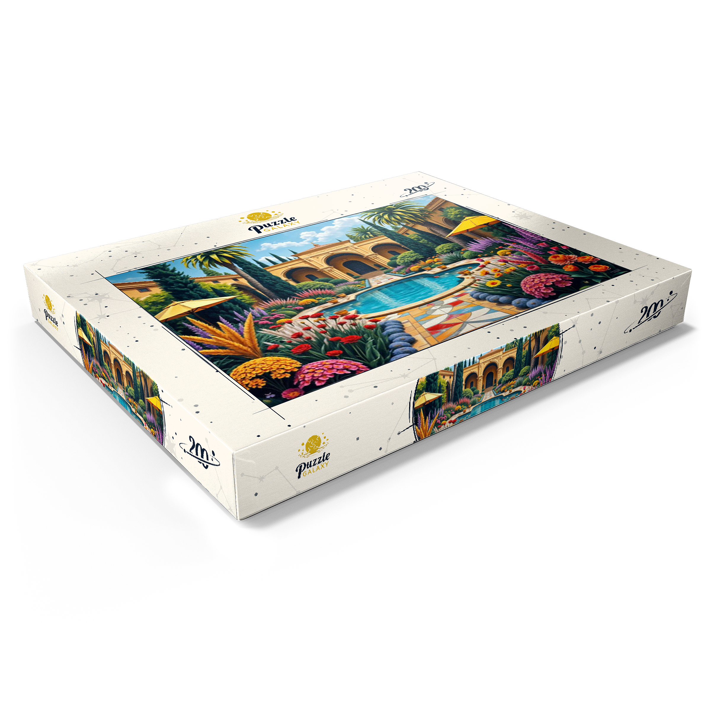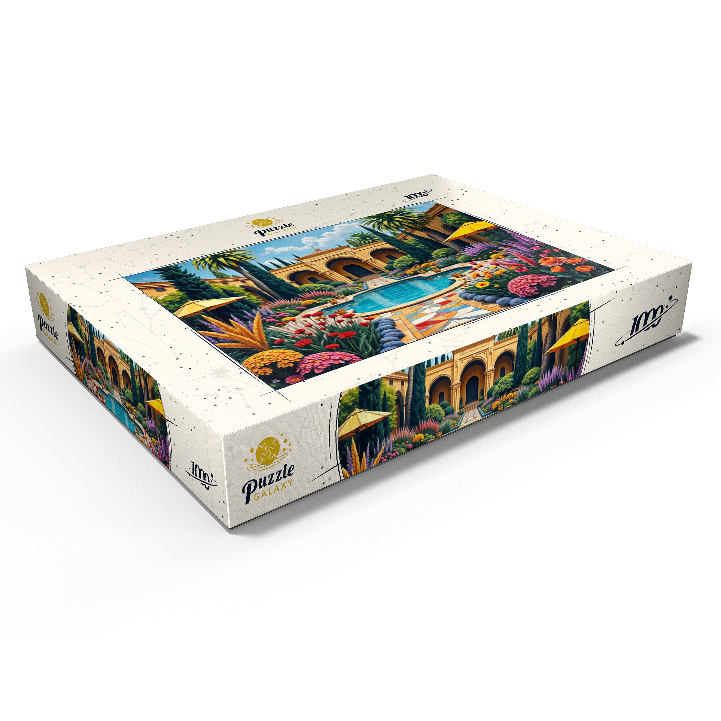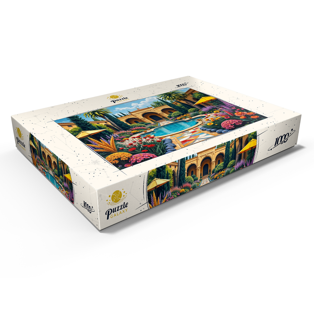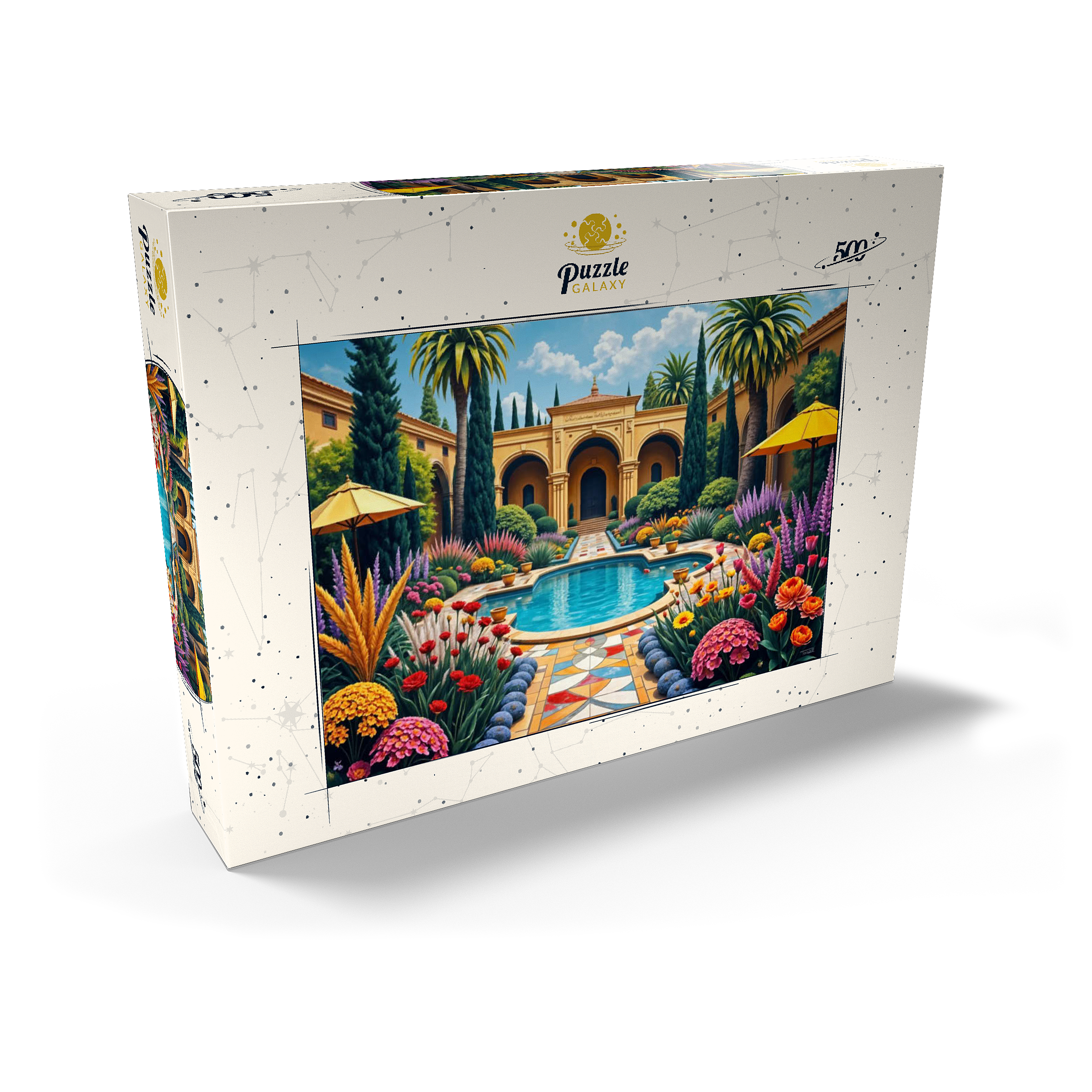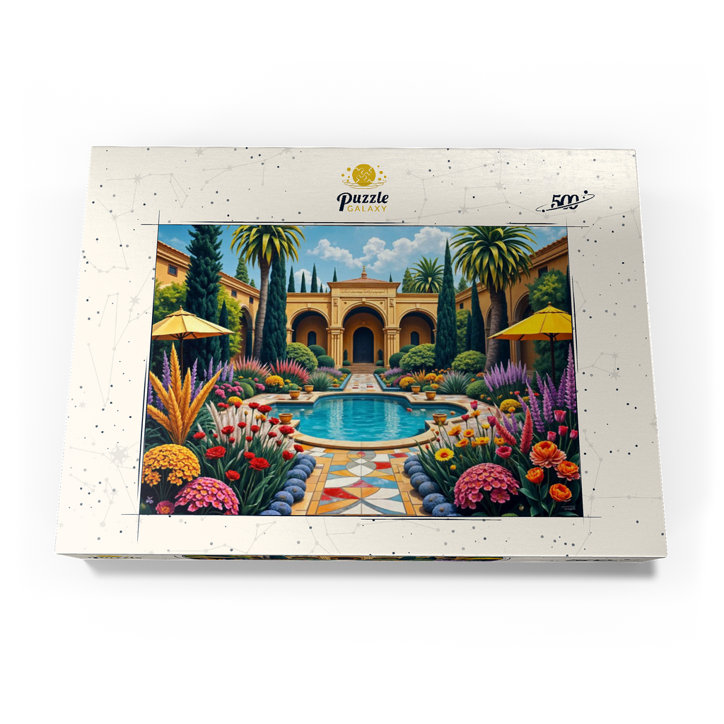 Ein atemberaubendes digitales Kunstwerk eines luxuriösen mediterranen Innenhofgartens mit einem glitzernden blauen Pool, umgeben von leuchtenden Blumen und üppigem Grün. Die elegante Architektur mit ihren goldenen Bögen und Terrakottatönen vermittelt ein Gefühl von zeitloser Schönheit. Hoch aufragende Palmen und schlanke Zypressen rahmen den ruhigen Raum ein, während aufwendige Mosaikfliesen den Poolrand säumen. Leuchtend gelbe Sonnenschirme spenden Schatten und setzen farbliche Akzente, die die blühenden Blumen in Rot, Orange, Violett und Gelb perfekt ergänzen. Dieses Kunstwerk ist ideal für Liebhaber mediterraner Landschaften, luxuriöser Gartengestaltung und architektonischer Eleganz und eignet sich perfekt als Wanddekoration oder Designinspiration.