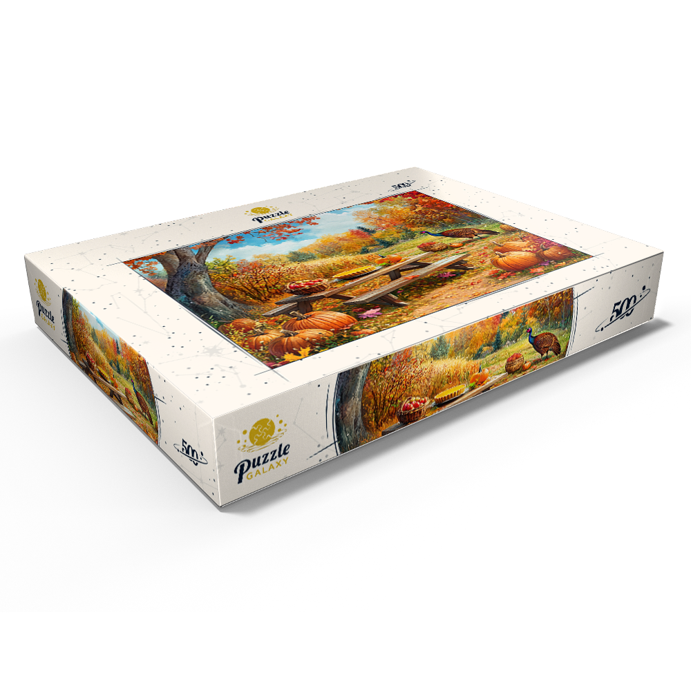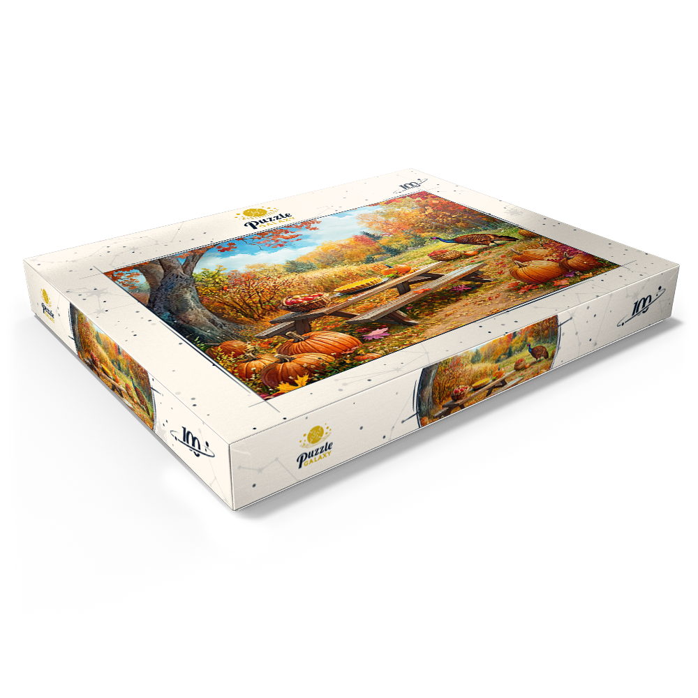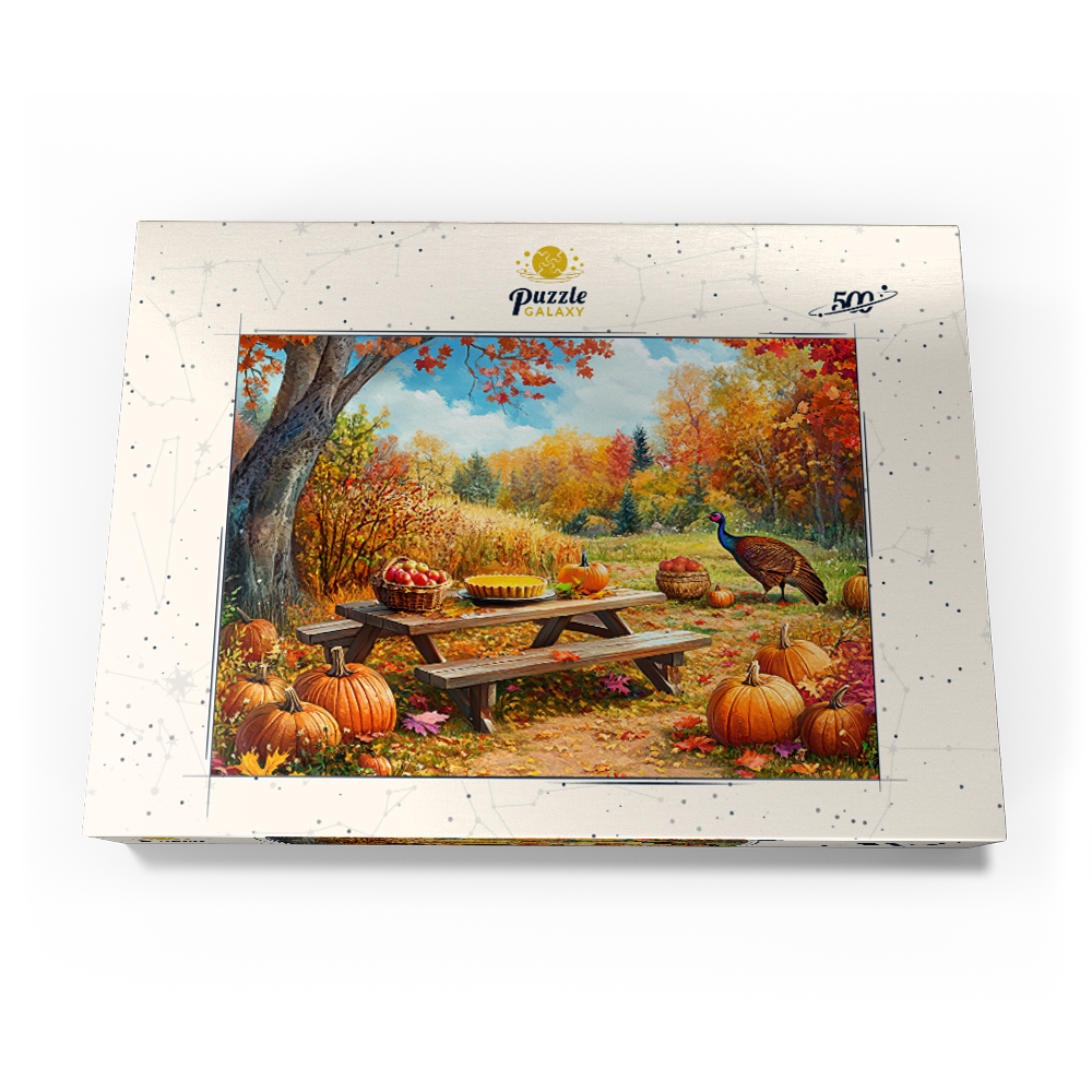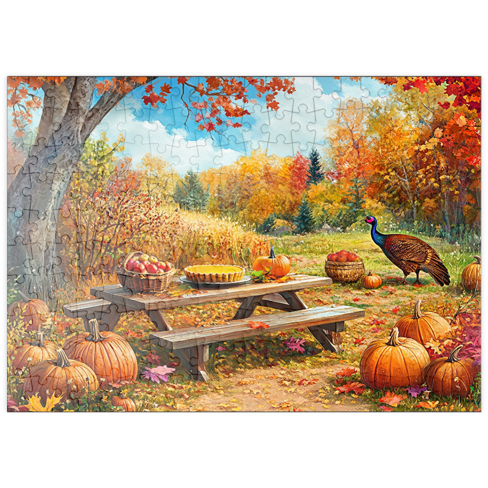 This fall harvest picnic scene shows a rustic wooden picnic table in a colorful woodland landscape filled with pumpkins, gourds, and fallen leaves under a bright blue sky. A basket of fresh apples and a golden pie sit on the table, adding cozy Thanksgiving and farm harvest keywords for seasonal search intent. Warm sunlight highlights peak autumn foliage in vivid reds and golds, creating a peaceful countryside or park atmosphere with textured, realistic detail. A wild turkey standing nearby reinforces the seasonal wildlife theme, making the image ideal for searches related to fall decor, autumn picnic, harvest festival, pumpkin patch, and Thanksgiving outdoor scenery.