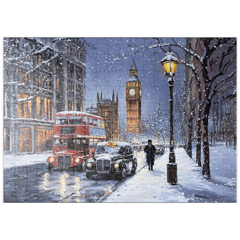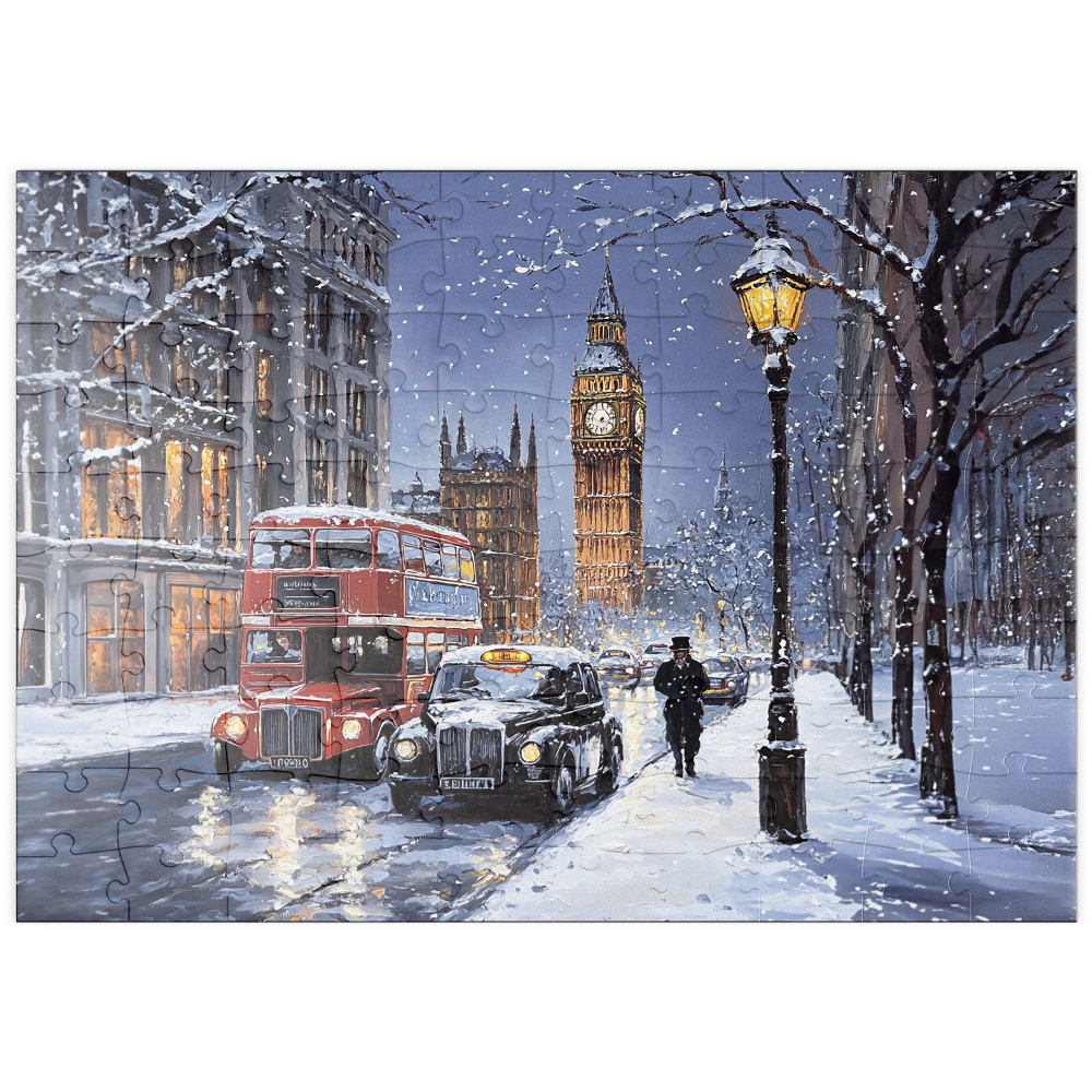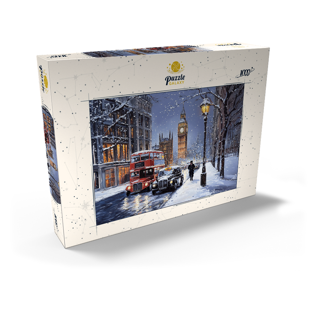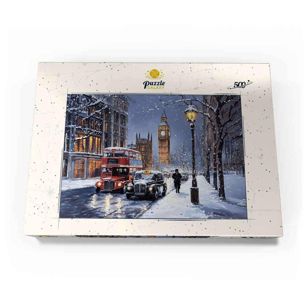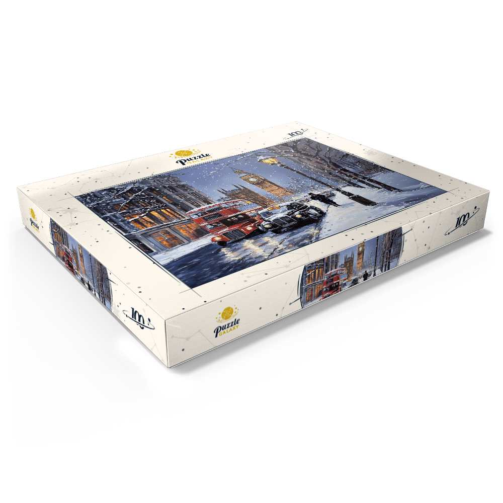 Big Ben and the Palace of Westminster in London England are featured in a snowy winter evening city scene beside the River Thames, capturing one of the most recognizable landmarks in the United Kingdom. The view highlights the Gothic Revival architecture of Westminster, warm glowing windows, and classic London street traffic with a red double decker bus and a black taxi on a wet reflective roadway. Bare trees and historic stone buildings frame the skyline under a cool blue dusk sky, while falling snow and streetlights add a festive holiday atmosphere. This depiction emphasizes texture rich detail and timeless London travel appeal.