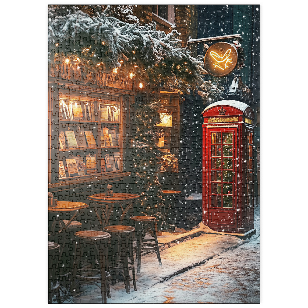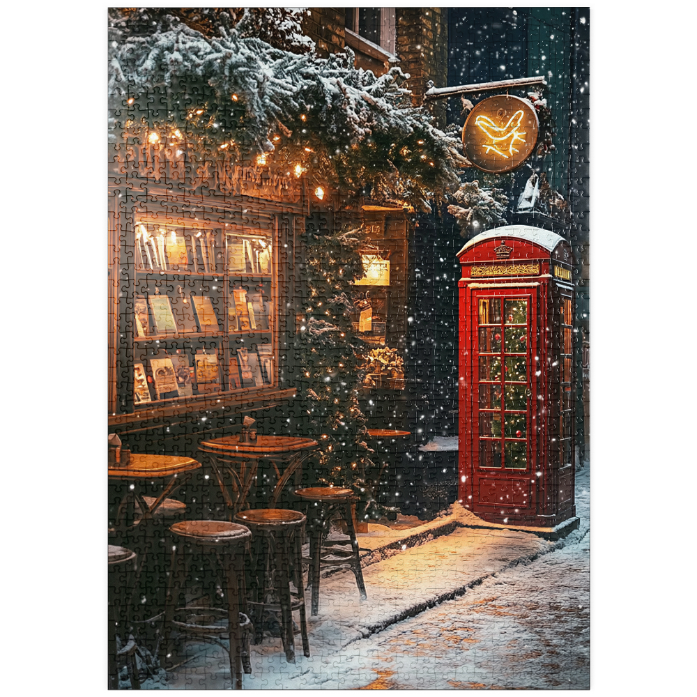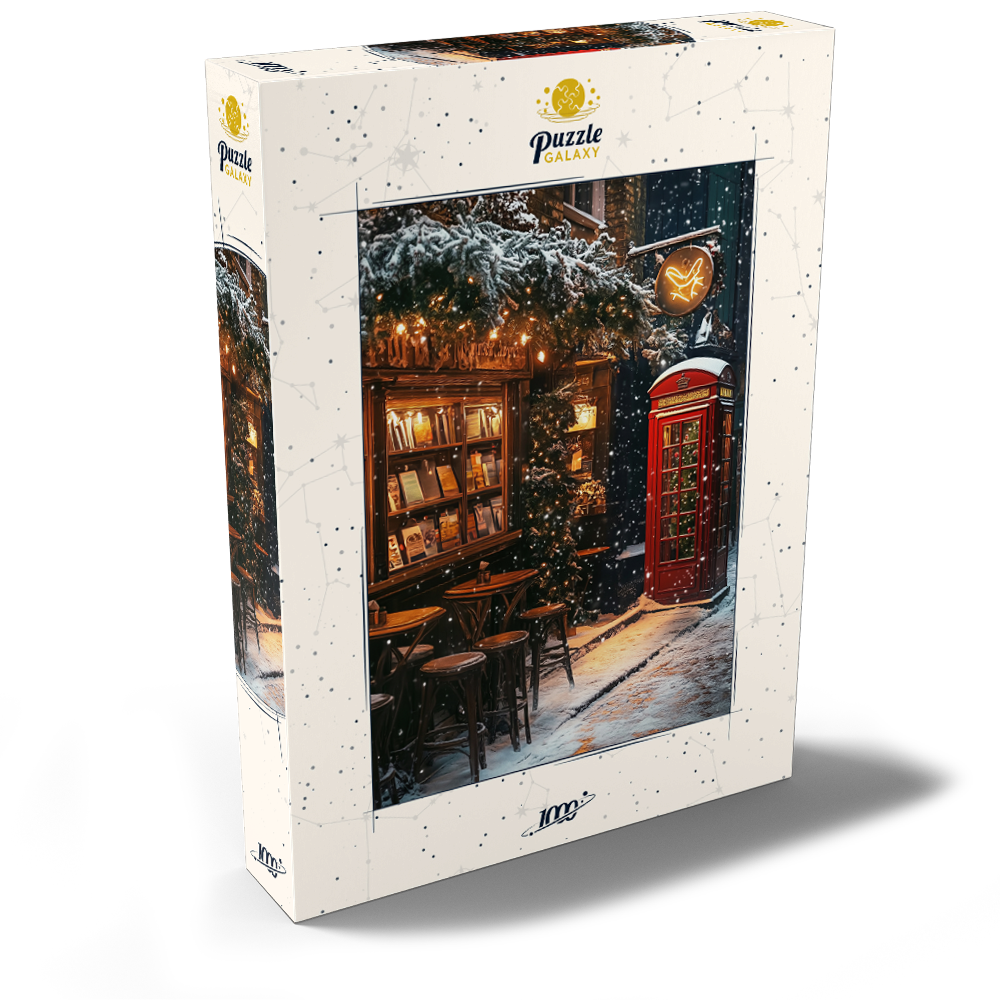 London England red telephone box on a snowy street creates an iconic winter cityscape beside a cozy bookshop and cafe, evoking classic British travel photography and Christmas in London atmosphere. Warm window light spills onto stacked books and small wooden bistro tables, while evergreen garlands and twinkling string lights decorate the narrow alley and add festive holiday charm. Falling snow softens the brick facades and enhances the cinematic, nostalgic mood of a traditional UK winter scene. This image suits searches for London landmarks, red phone booth symbolism, UK winter street decor, European city travel destinations, and seasonal holiday street scenes.
