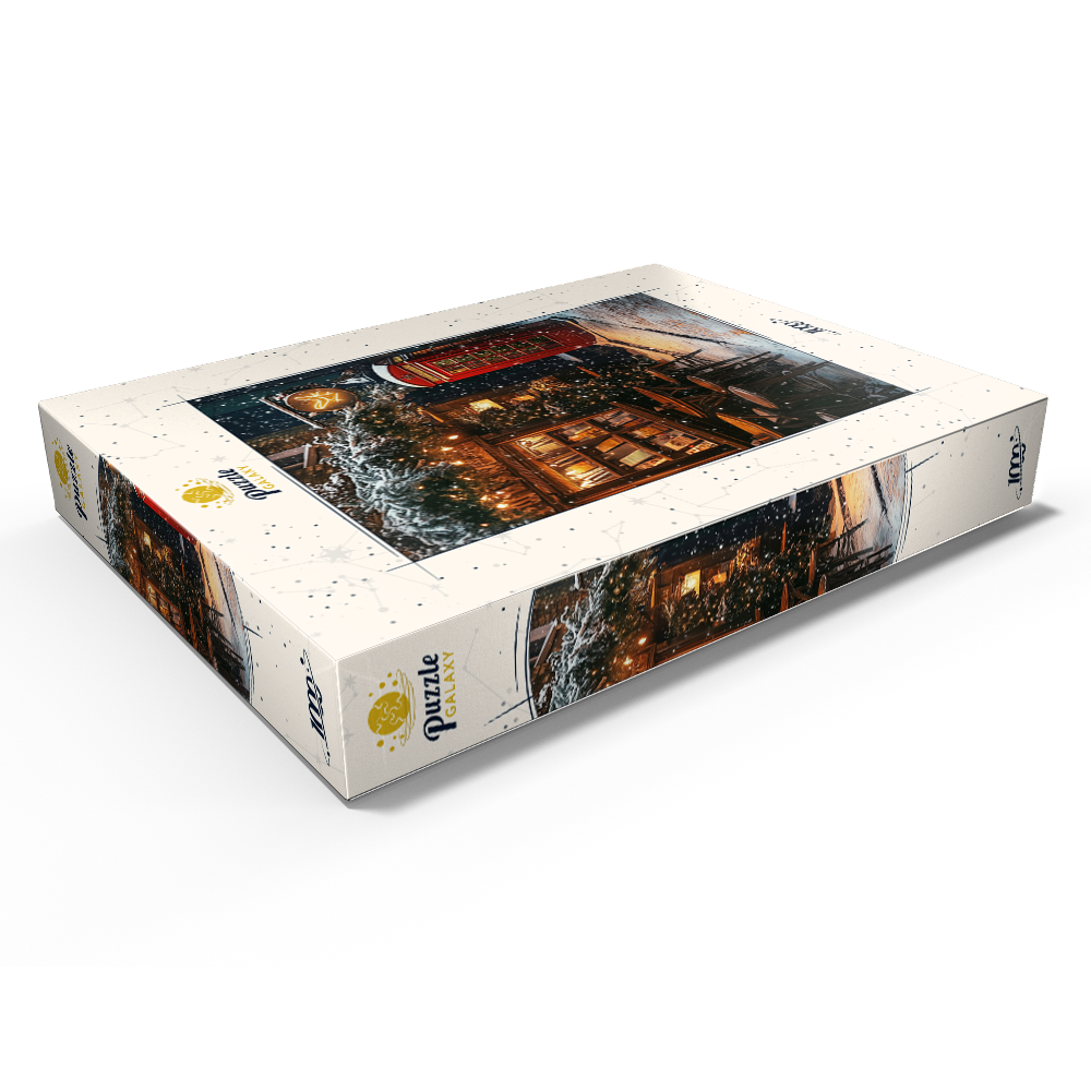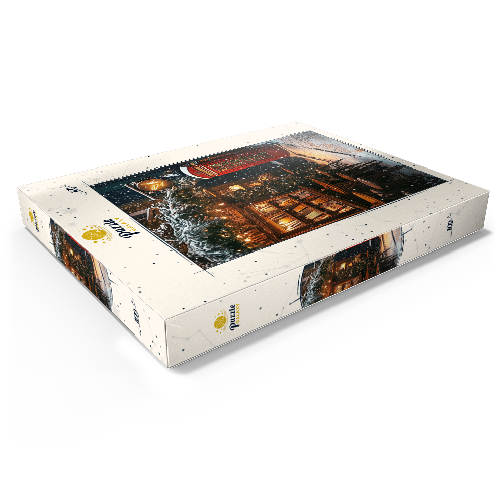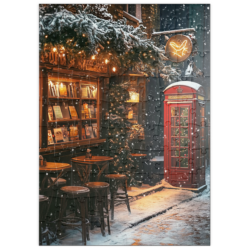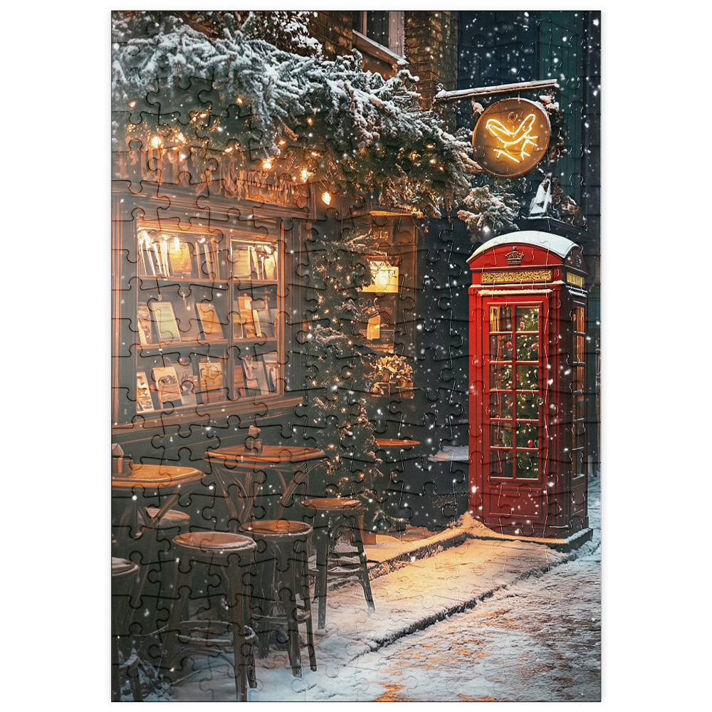 London England red telephone box on a snowy street creates an iconic winter cityscape beside a cozy bookshop and cafe, evoking classic British travel photography and Christmas in London atmosphere. Warm window light spills onto stacked books and small wooden bistro tables, while evergreen garlands and twinkling string lights decorate the narrow alley and add festive holiday charm. Falling snow softens the brick facades and enhances the cinematic, nostalgic mood of a traditional UK winter scene. This image suits searches for London landmarks, red phone booth symbolism, UK winter street decor, European city travel destinations, and seasonal holiday street scenes.