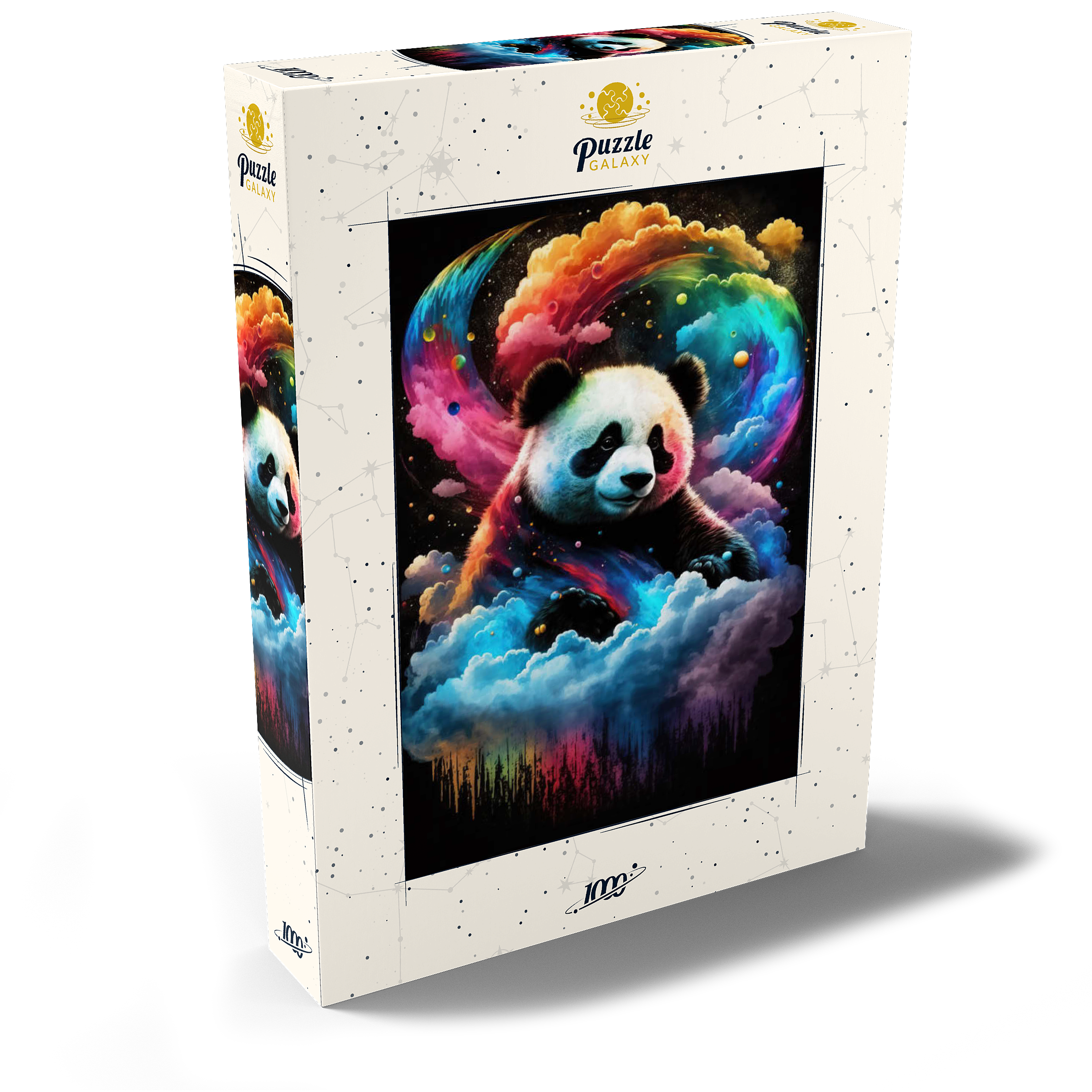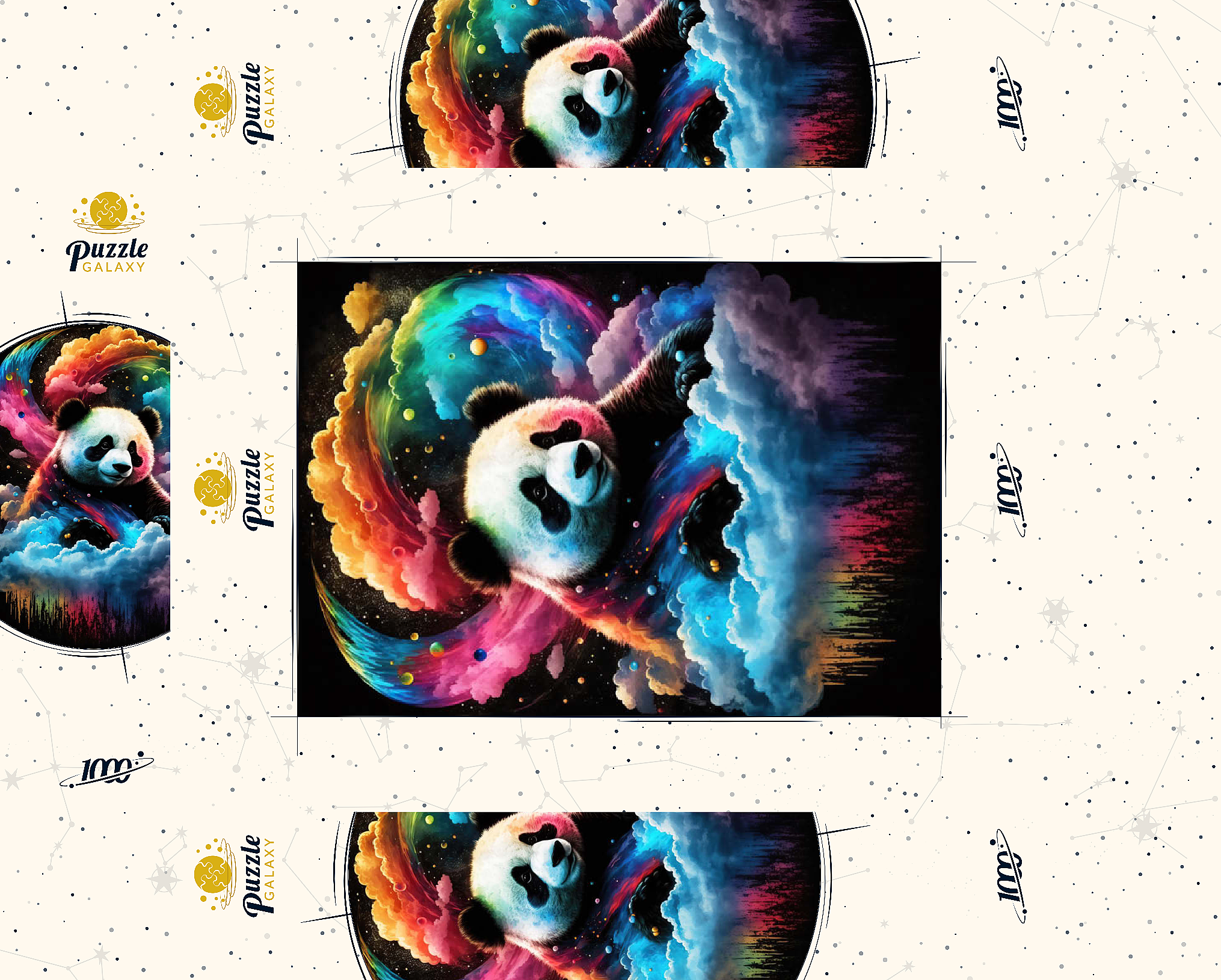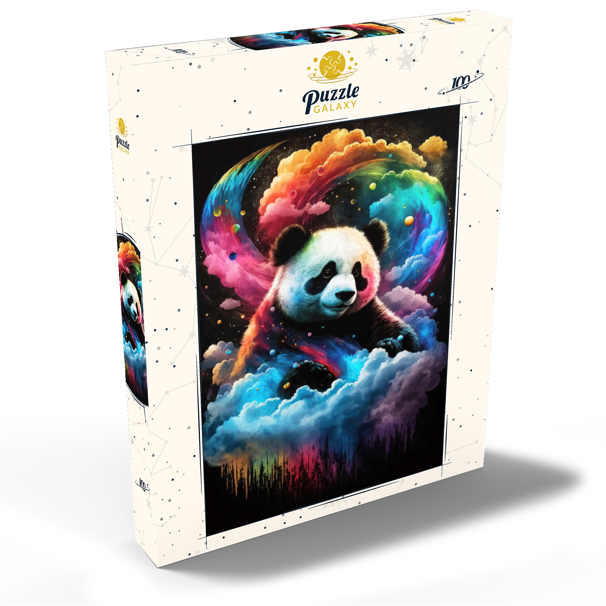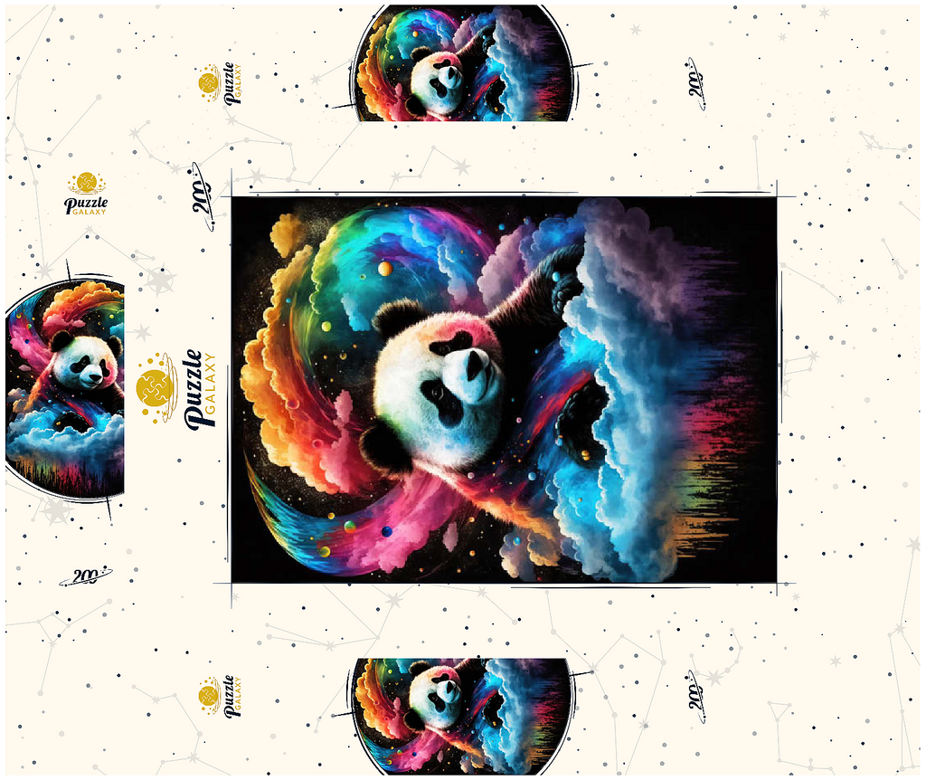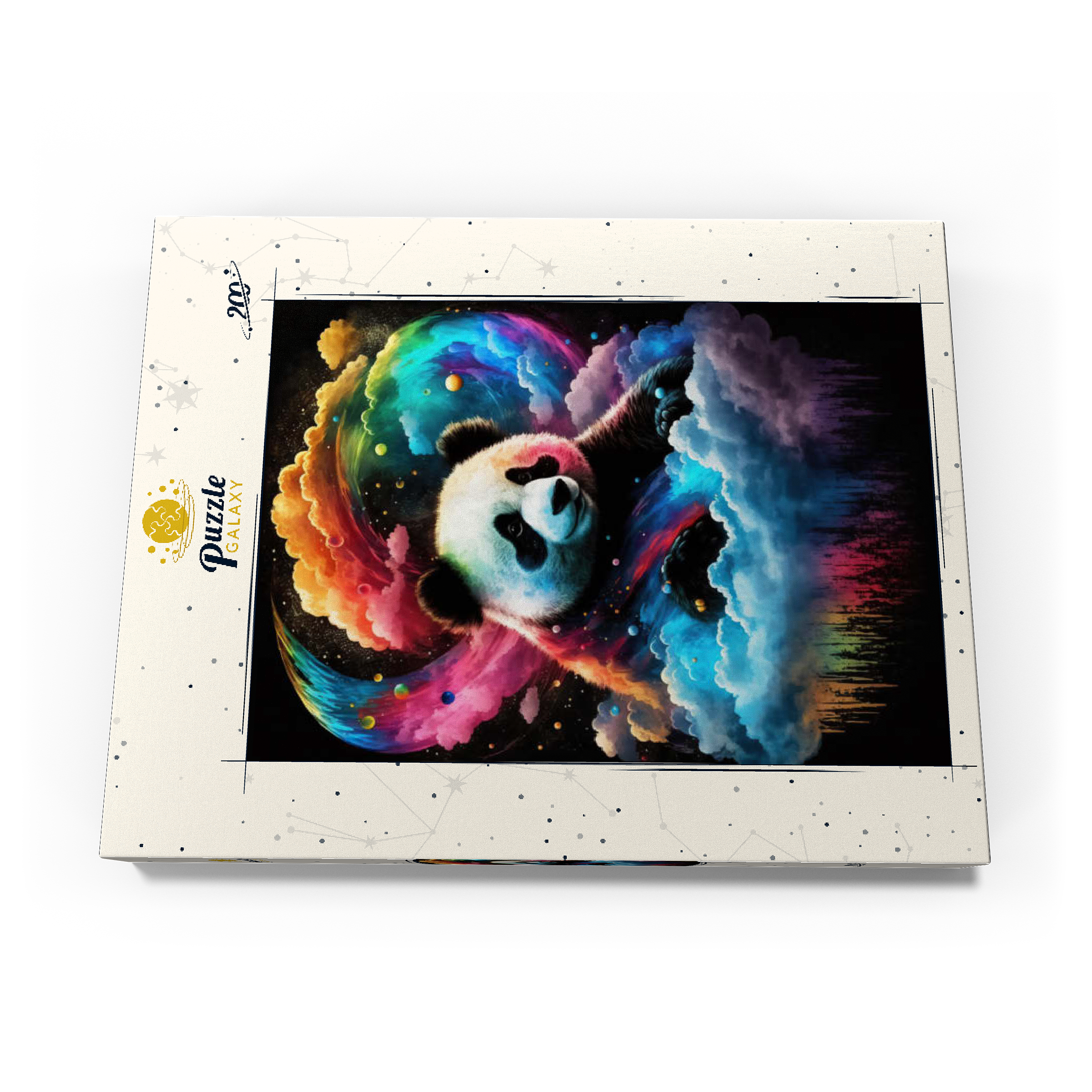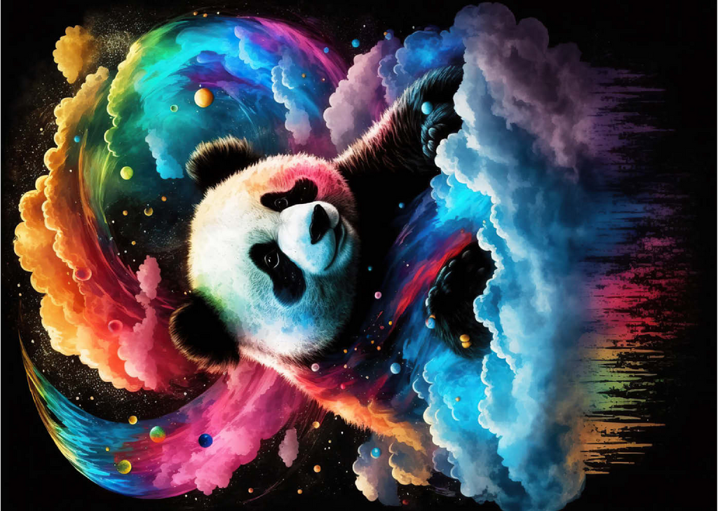 Dieses faszinierende Kunstwerk zeigt einen majestätischen Panda, umgeben von wirbelnden kosmischen Wolken und leuchtenden nebelartigen Farben. Die verträumte Komposition verbindet Fantasie und Surrealismus, wobei der Panda durch ein himmlisches Reich aus strahlendem Blau, feurigem Orange und tiefem Violett zu schweben scheint. Ätherisches Licht und schwebende Planeten verstärken die magische, jenseitige Atmosphäre und schaffen ein visuell beeindruckendes Meisterwerk. Dieses Werk ist perfekt für Liebhaber kosmischer Kunst, skurriler Illustrationen von Wildtieren und für alle, die sich von der mystischen Schönheit der Natur in Verbindung mit Fantasie angezogen fühlen.
