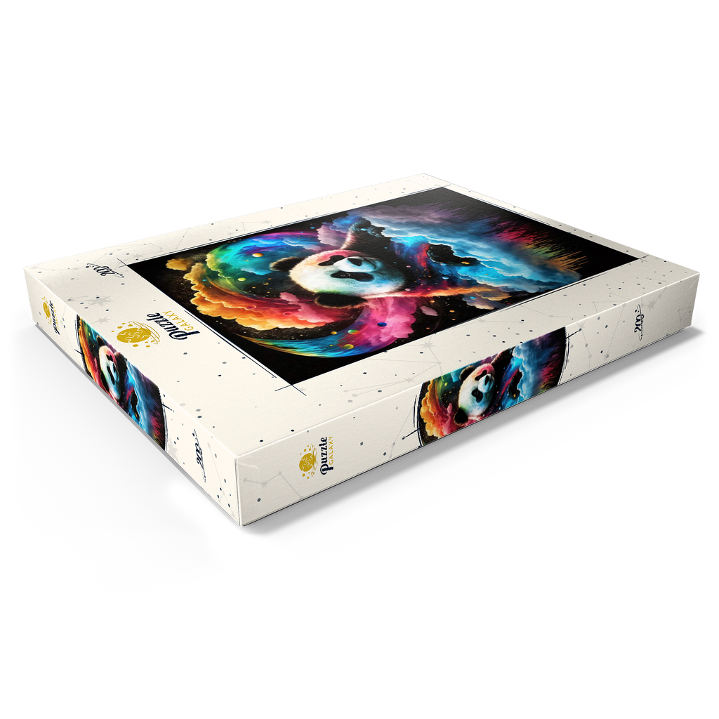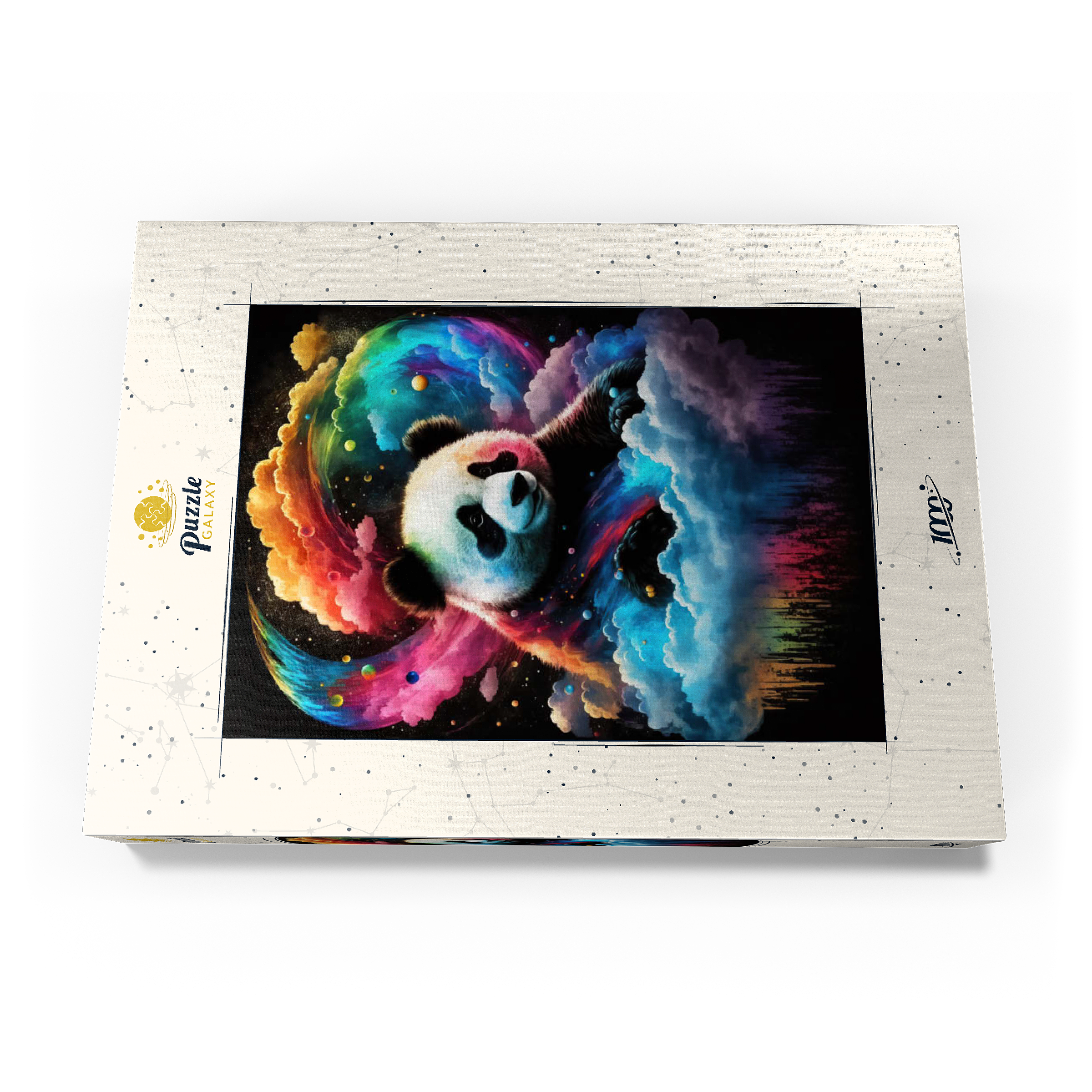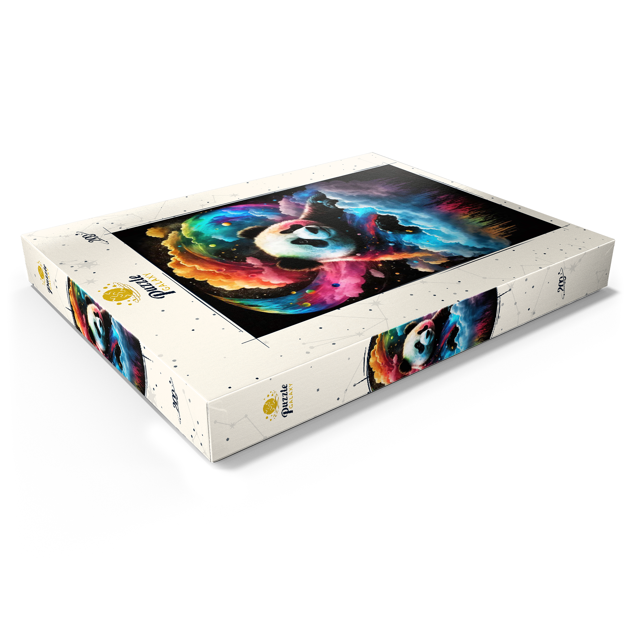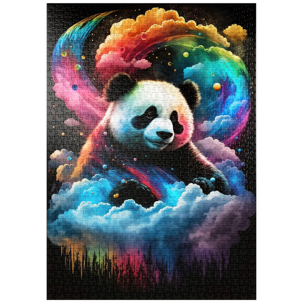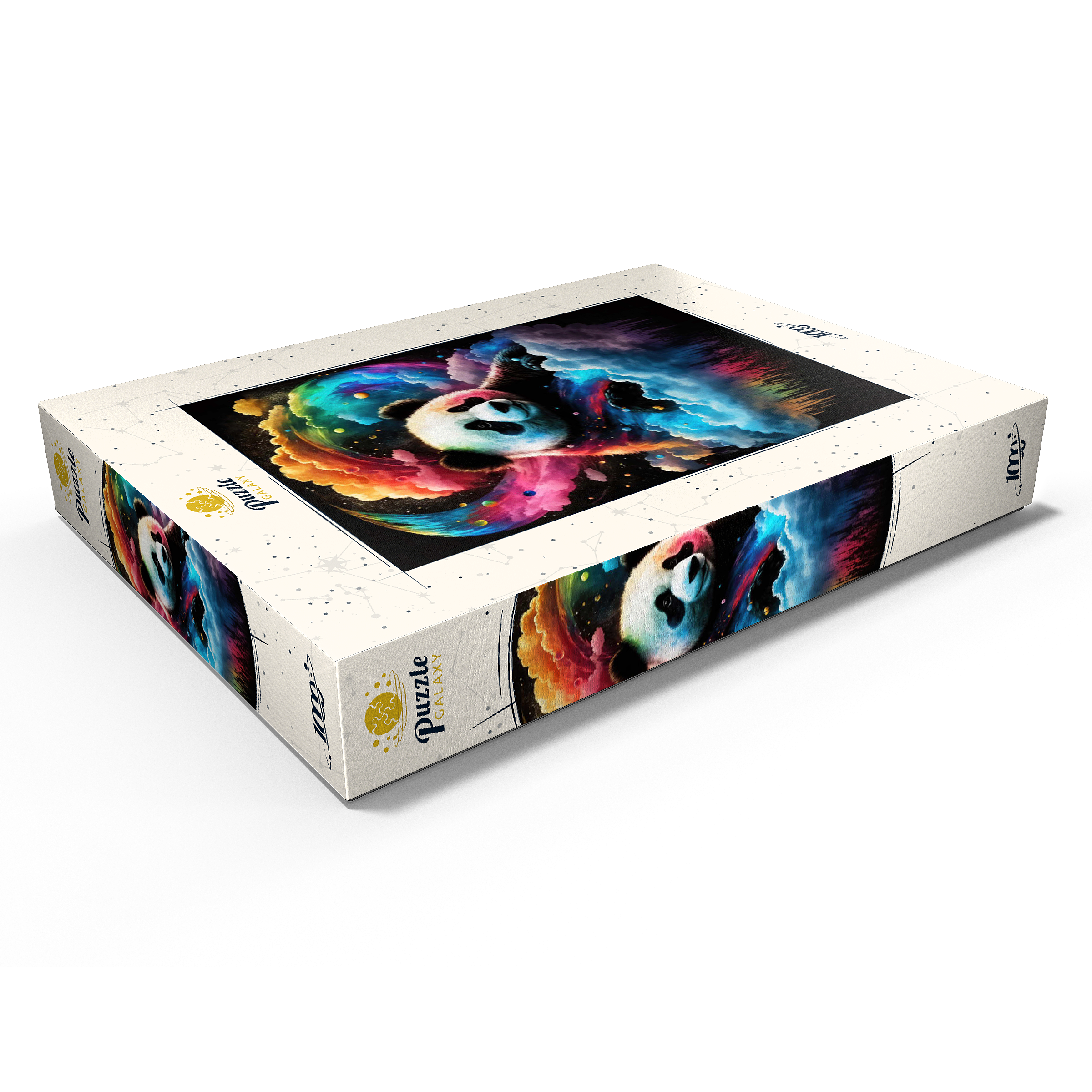 Dieses faszinierende Kunstwerk zeigt einen majestätischen Panda, umgeben von wirbelnden kosmischen Wolken und leuchtenden nebelartigen Farben. Die verträumte Komposition verbindet Fantasie und Surrealismus, wobei der Panda durch ein himmlisches Reich aus strahlendem Blau, feurigem Orange und tiefem Violett zu schweben scheint. Ätherisches Licht und schwebende Planeten verstärken die magische, jenseitige Atmosphäre und schaffen ein visuell beeindruckendes Meisterwerk. Dieses Werk ist perfekt für Liebhaber kosmischer Kunst, skurriler Illustrationen von Wildtieren und für alle, die sich von der mystischen Schönheit der Natur in Verbindung mit Fantasie angezogen fühlen.