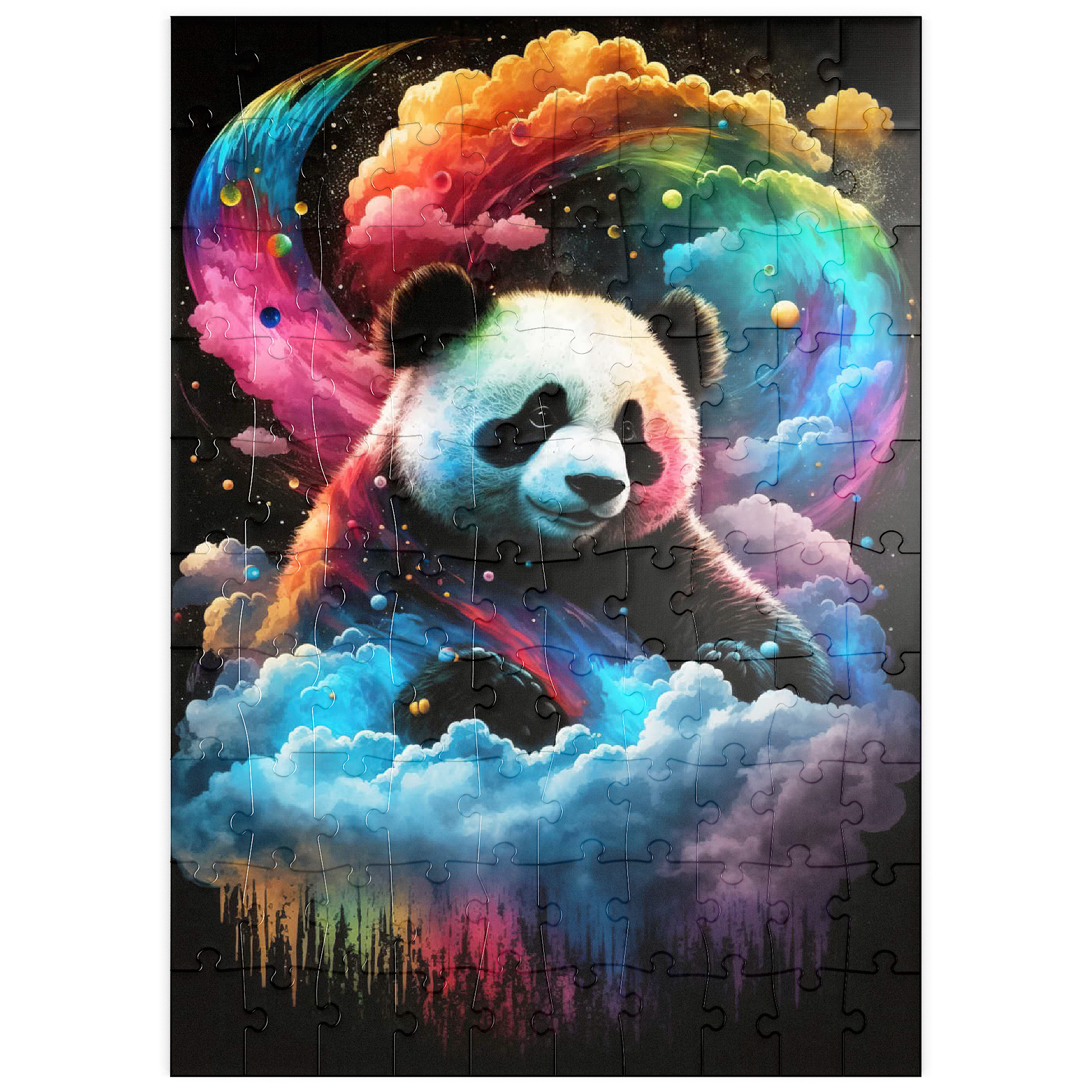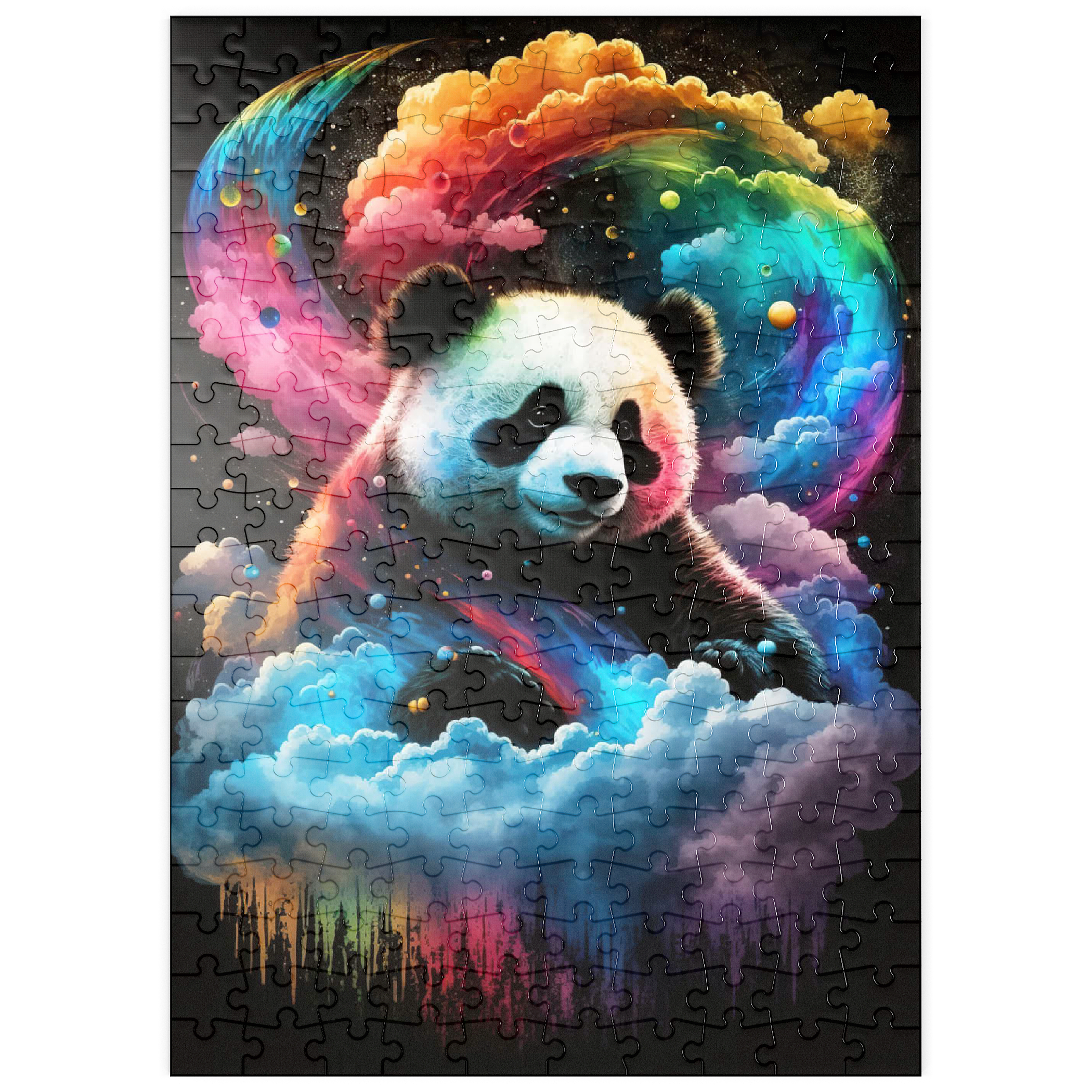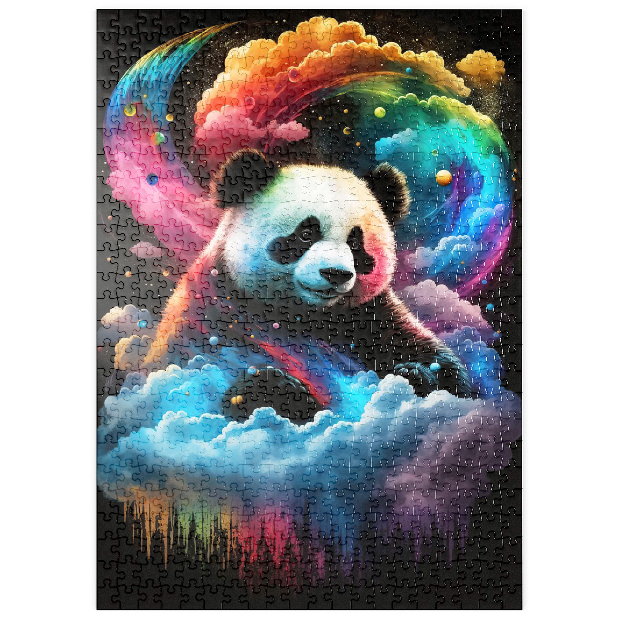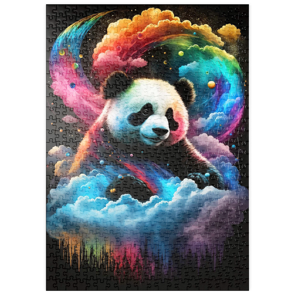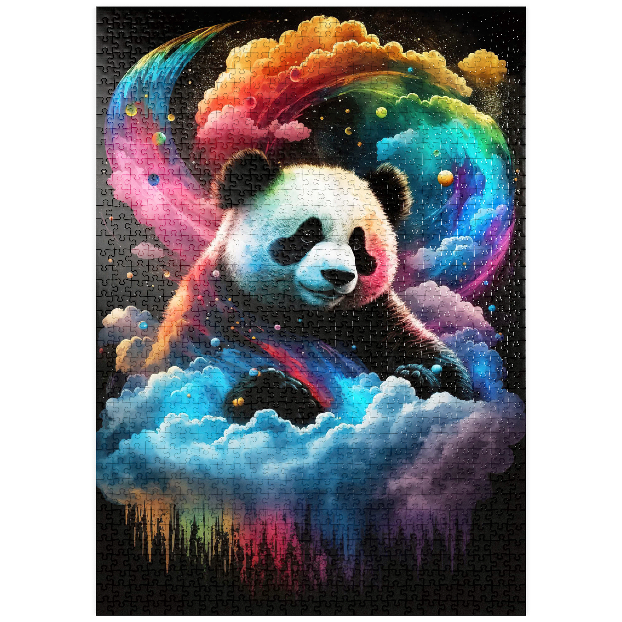 Dieses faszinierende Kunstwerk zeigt einen majestätischen Panda, umgeben von wirbelnden kosmischen Wolken und leuchtenden nebelartigen Farben. Die verträumte Komposition verbindet Fantasie und Surrealismus, wobei der Panda durch ein himmlisches Reich aus strahlendem Blau, feurigem Orange und tiefem Violett zu schweben scheint. Ätherisches Licht und schwebende Planeten verstärken die magische, jenseitige Atmosphäre und schaffen ein visuell beeindruckendes Meisterwerk. Dieses Werk ist perfekt für Liebhaber kosmischer Kunst, skurriler Illustrationen von Wildtieren und für alle, die sich von der mystischen Schönheit der Natur in Verbindung mit Fantasie angezogen fühlen.