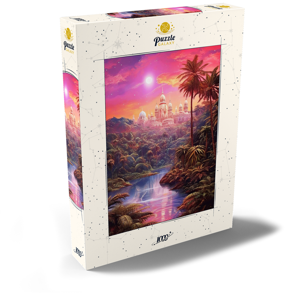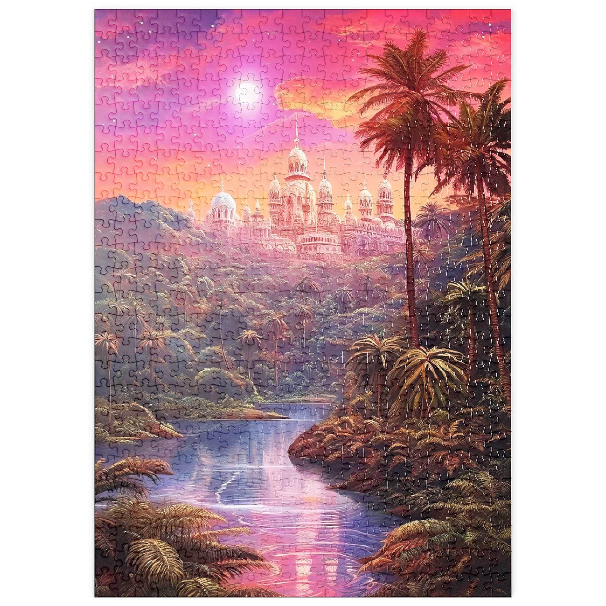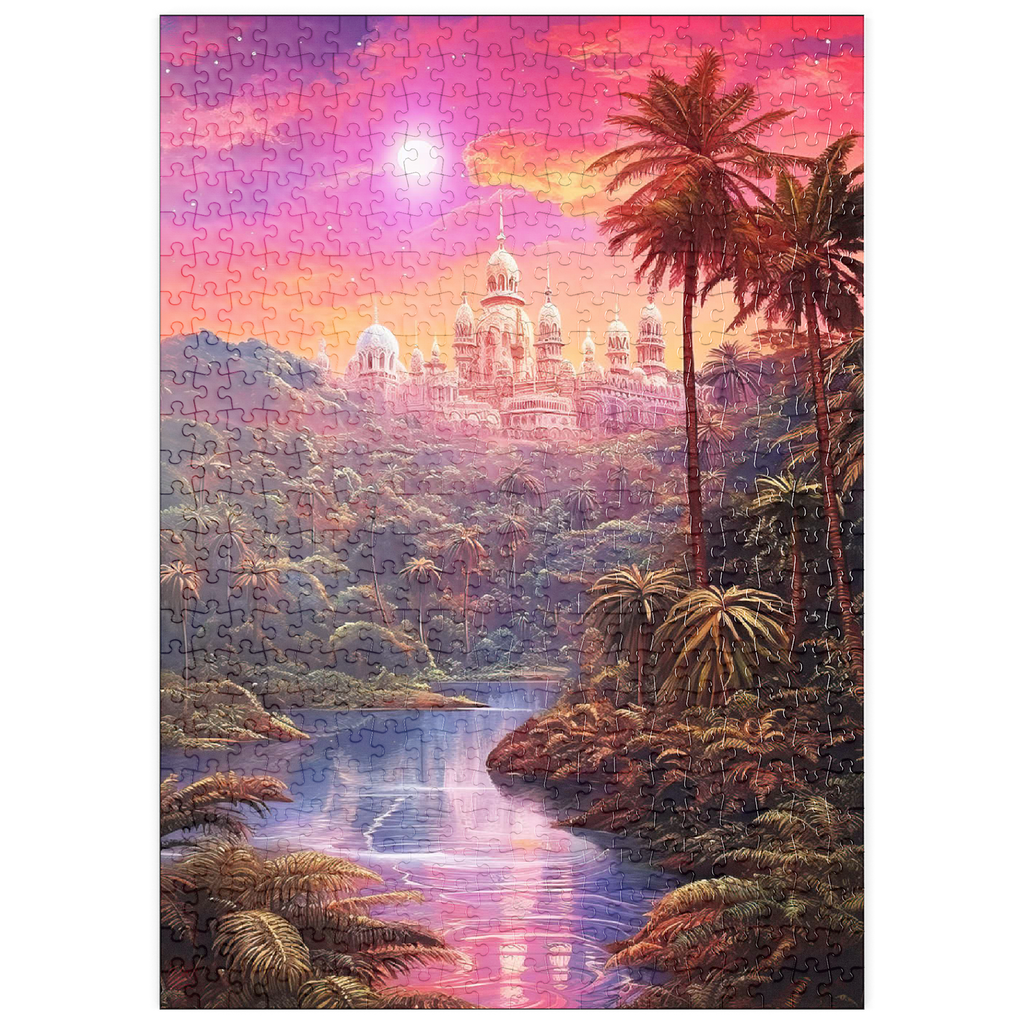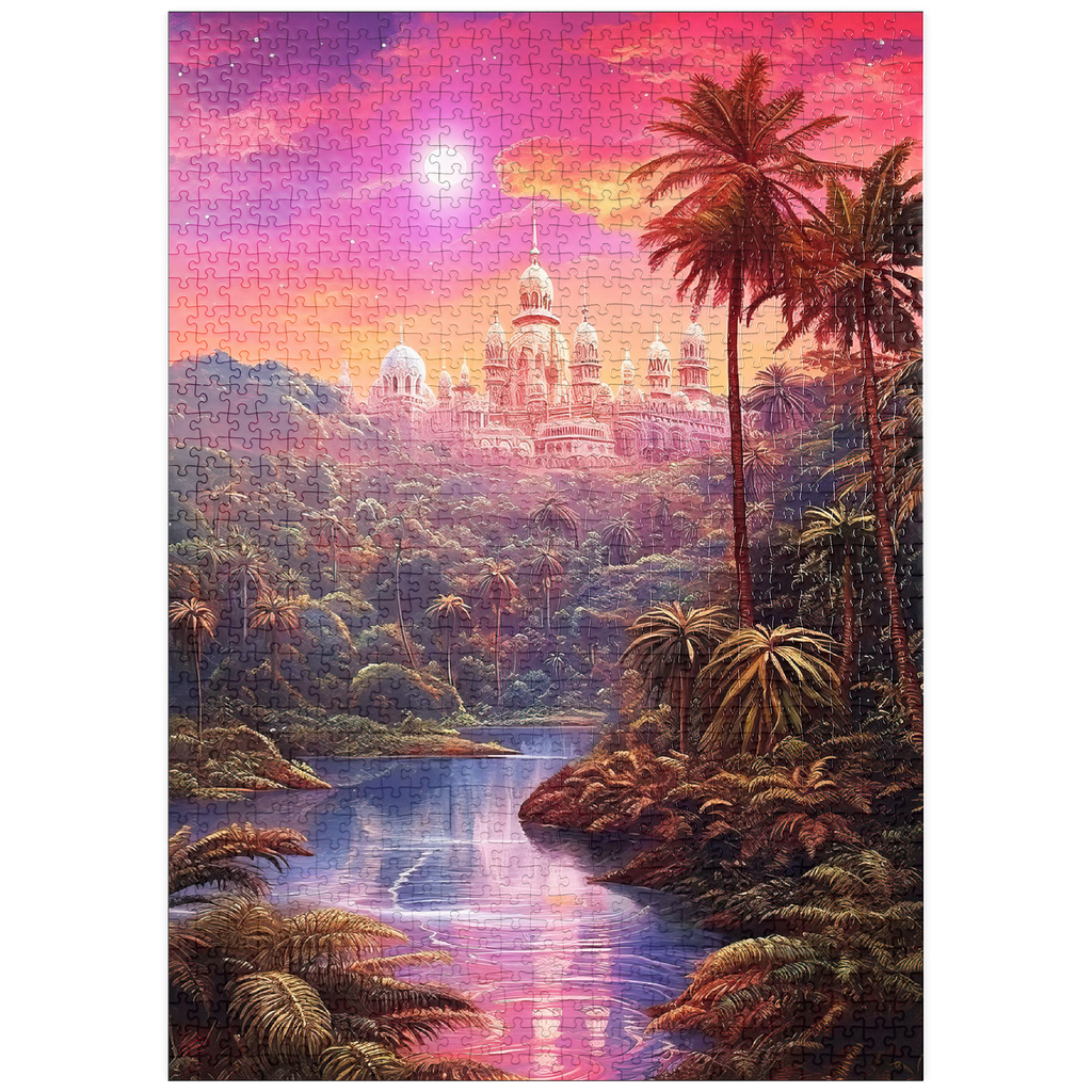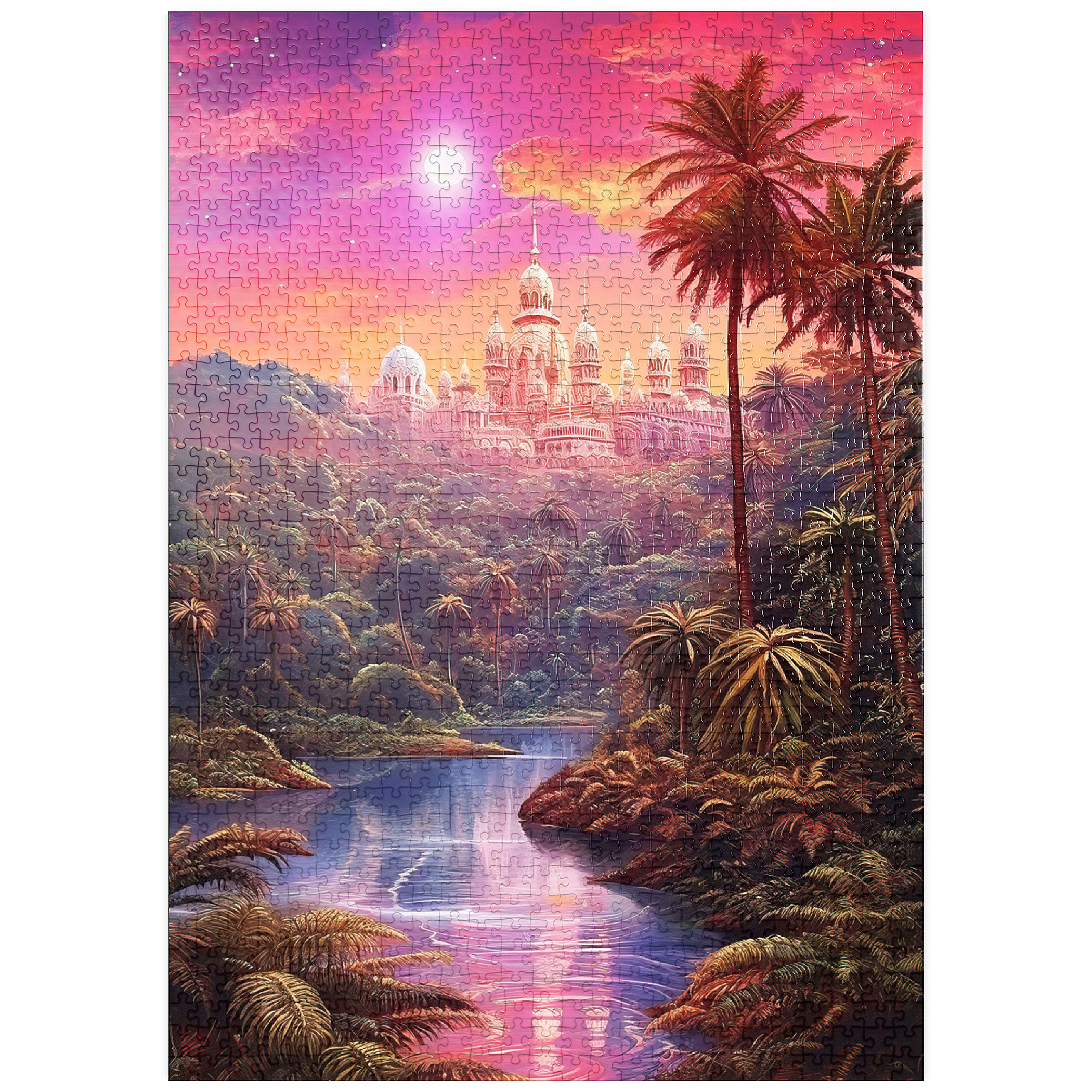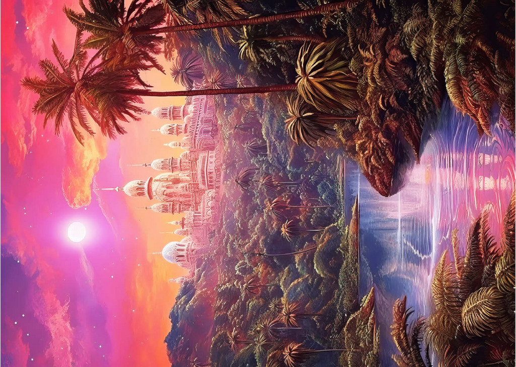 Tauchen Sie ein in eine atemberaubende Fantasieszene mit einem großen Palast, der tief in einem üppigen tropischen Dschungel liegt. Hoch aufragende Palmen und dichtes Grün umgeben das prächtige Bauwerk, dessen verschlungene Kuppeln und Türme im sanften Licht eines mystischen Mondes erstrahlen. Der ruhige Fluss spiegelt die warmen Farben eines traumhaften Sonnenuntergangs wider und schafft eine bezaubernde Atmosphäre, die an ein verlorenes Königreich oder ein mythisches Paradies erinnert. Dieses atemberaubende digitale Kunstwerk ist perfekt für alle, die exotische Architektur, Fantasielandschaften und mystische Welten bewundern. Es weckt ein Gefühl des Staunens, des Abenteuers und des Geheimnisses.
