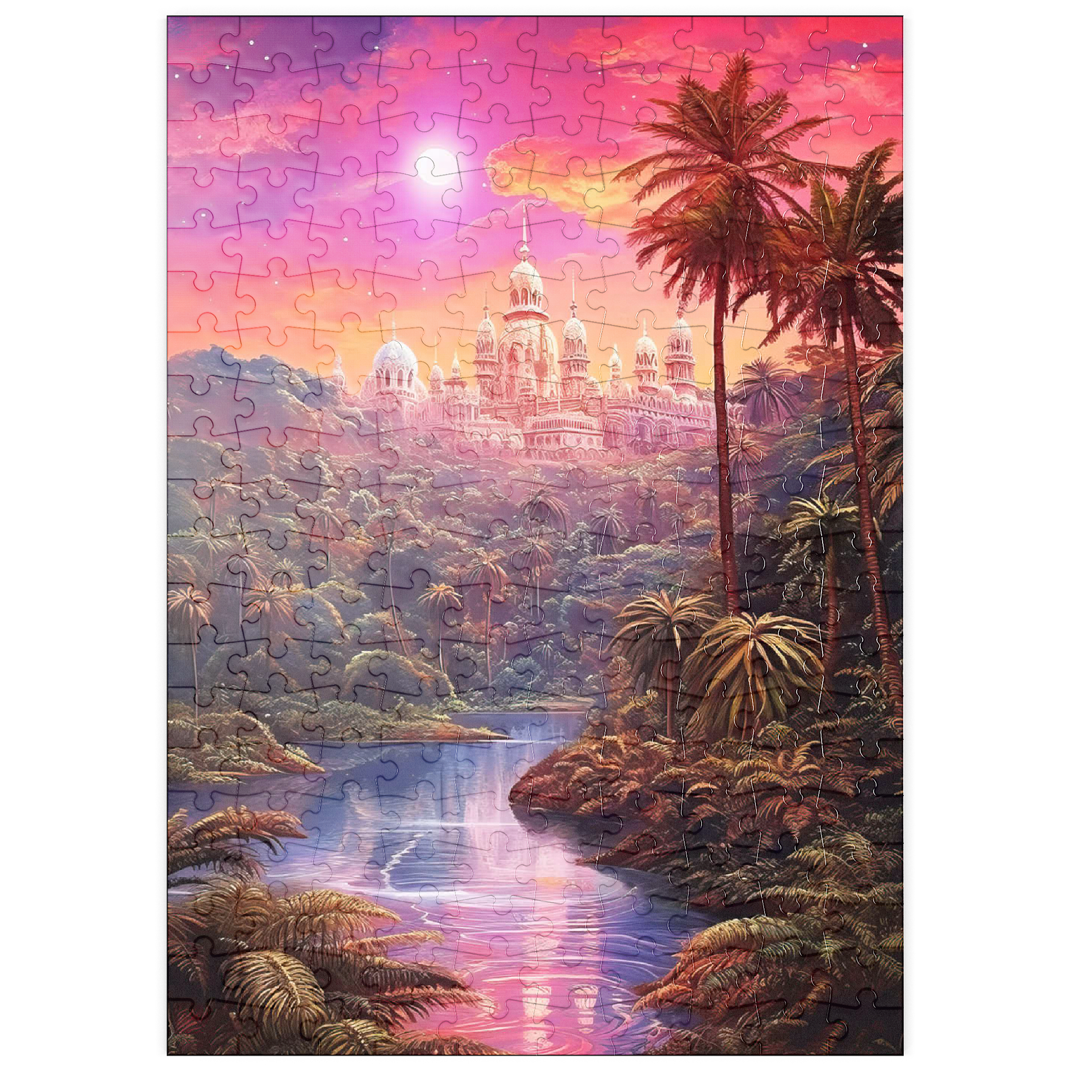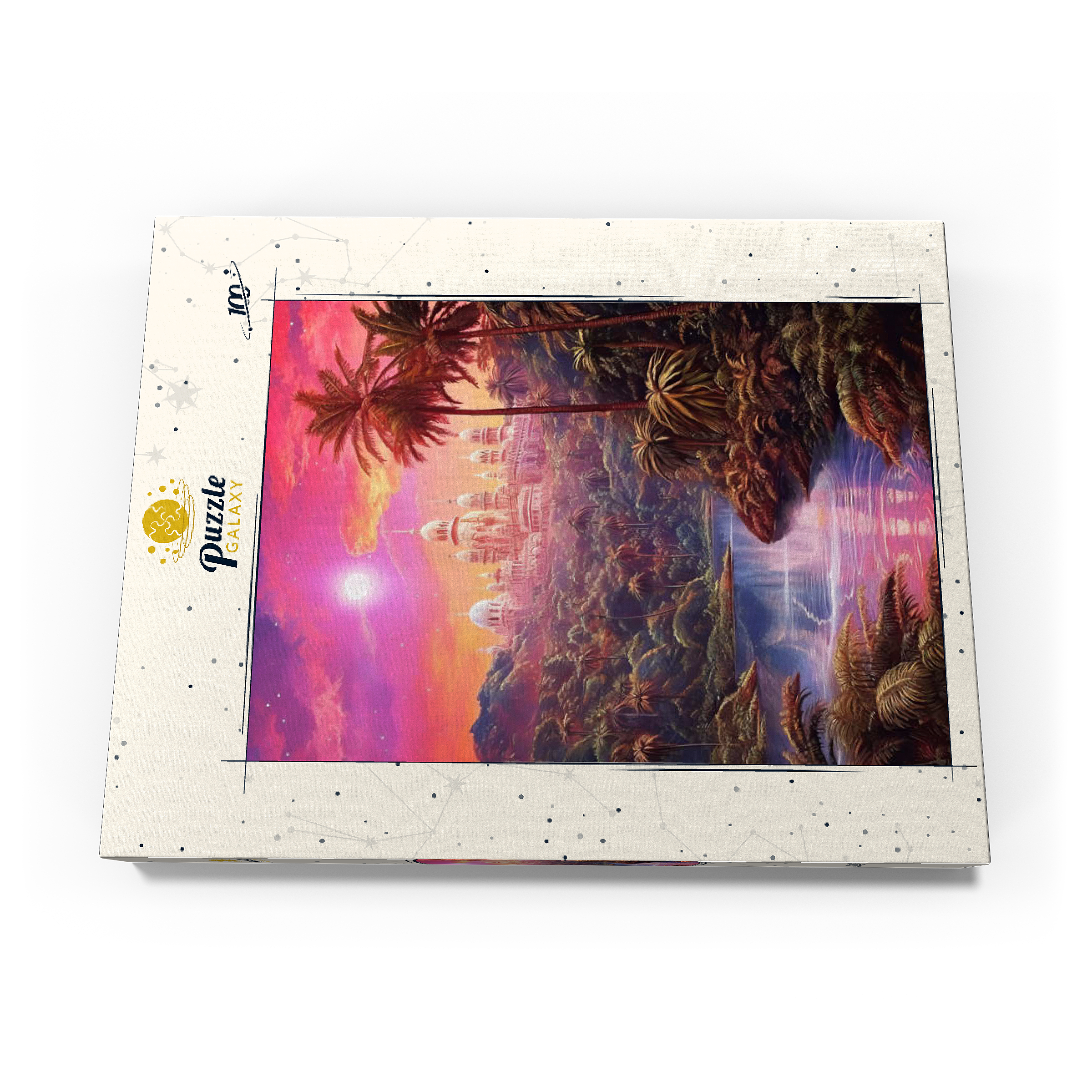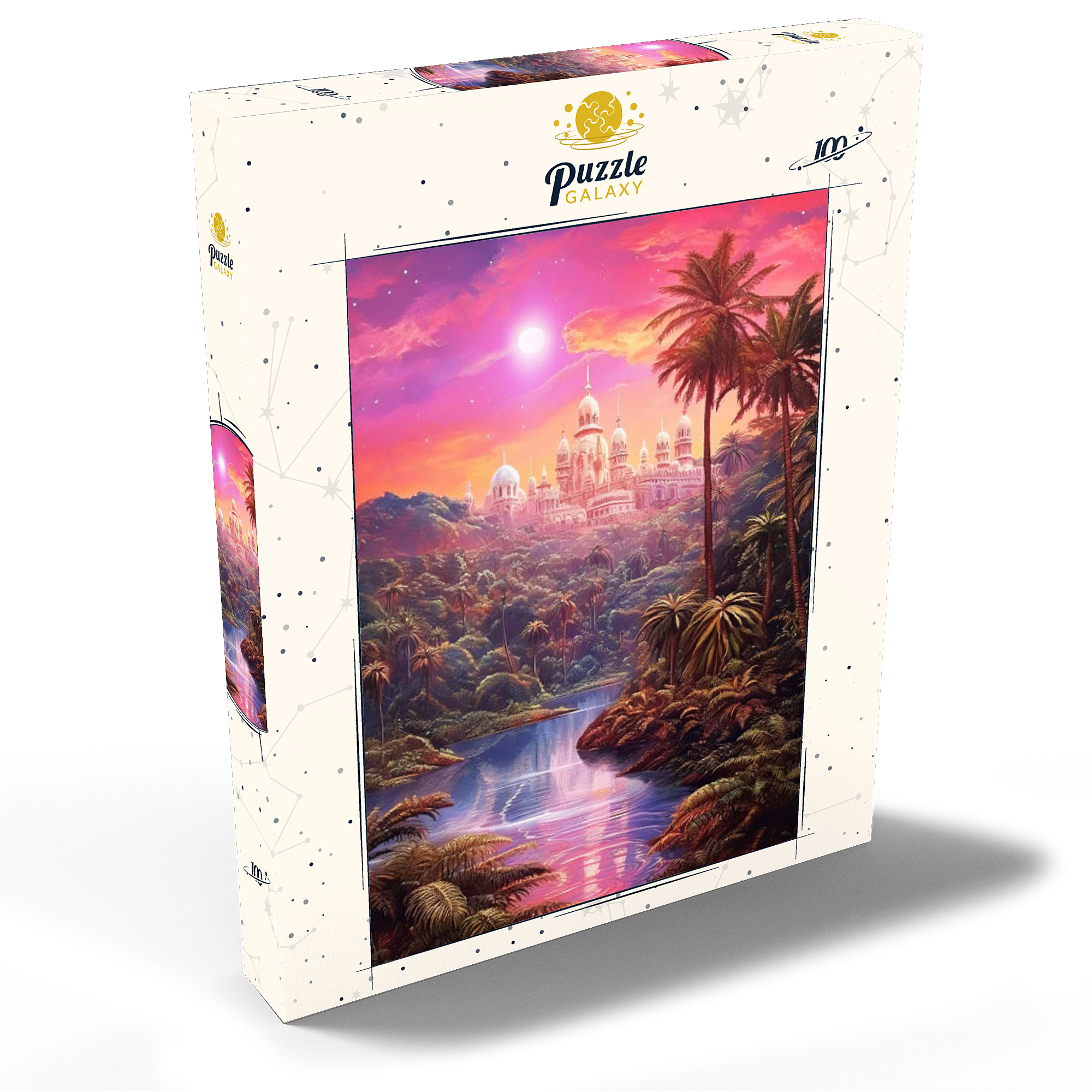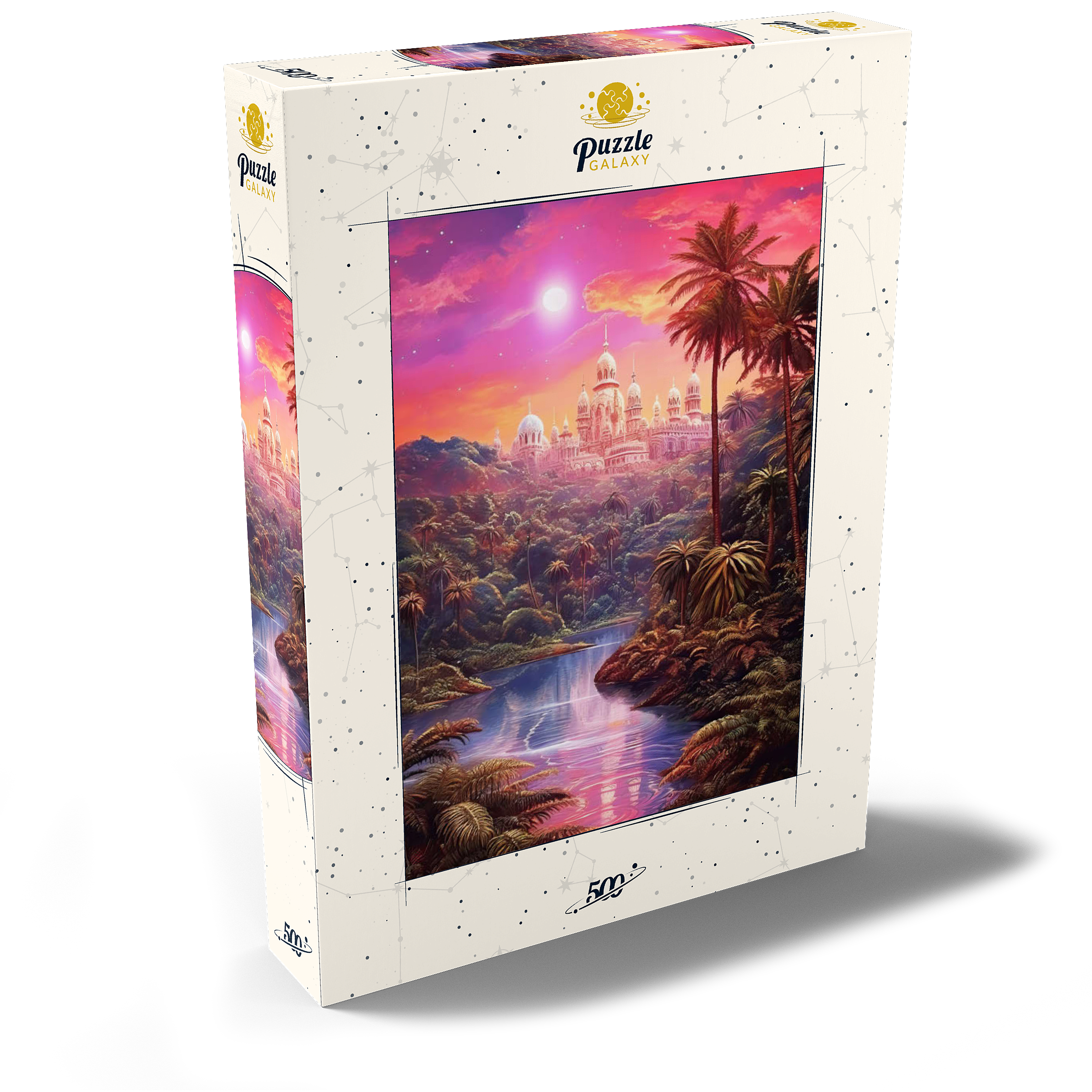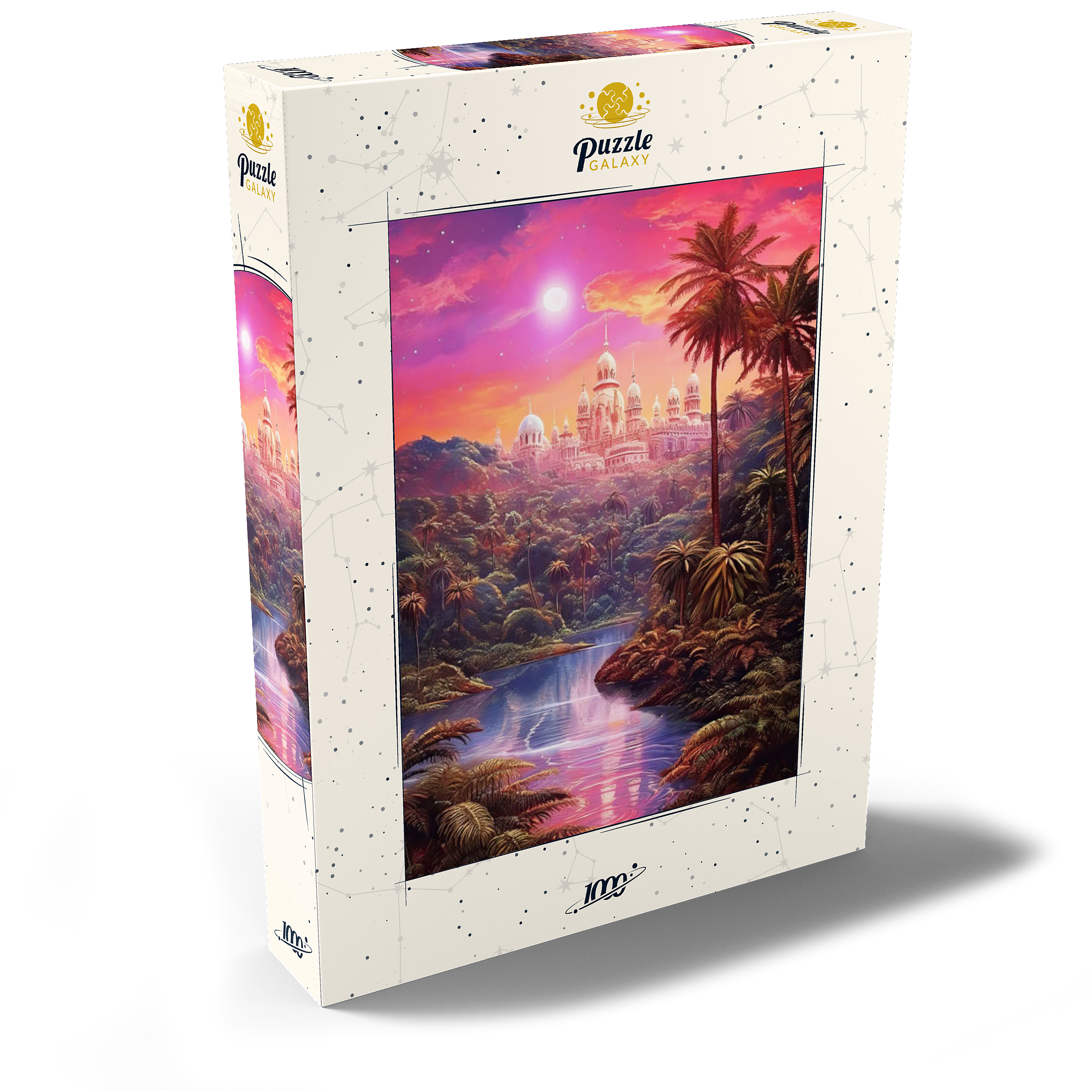 Tauchen Sie ein in eine atemberaubende Fantasieszene mit einem großen Palast, der tief in einem üppigen tropischen Dschungel liegt. Hoch aufragende Palmen und dichtes Grün umgeben das prächtige Bauwerk, dessen verschlungene Kuppeln und Türme im sanften Licht eines mystischen Mondes erstrahlen. Der ruhige Fluss spiegelt die warmen Farben eines traumhaften Sonnenuntergangs wider und schafft eine bezaubernde Atmosphäre, die an ein verlorenes Königreich oder ein mythisches Paradies erinnert. Dieses atemberaubende digitale Kunstwerk ist perfekt für alle, die exotische Architektur, Fantasielandschaften und mystische Welten bewundern. Es weckt ein Gefühl des Staunens, des Abenteuers und des Geheimnisses.