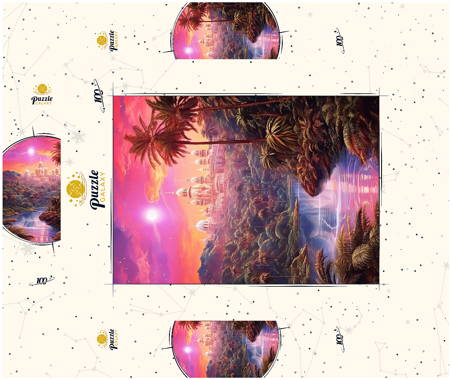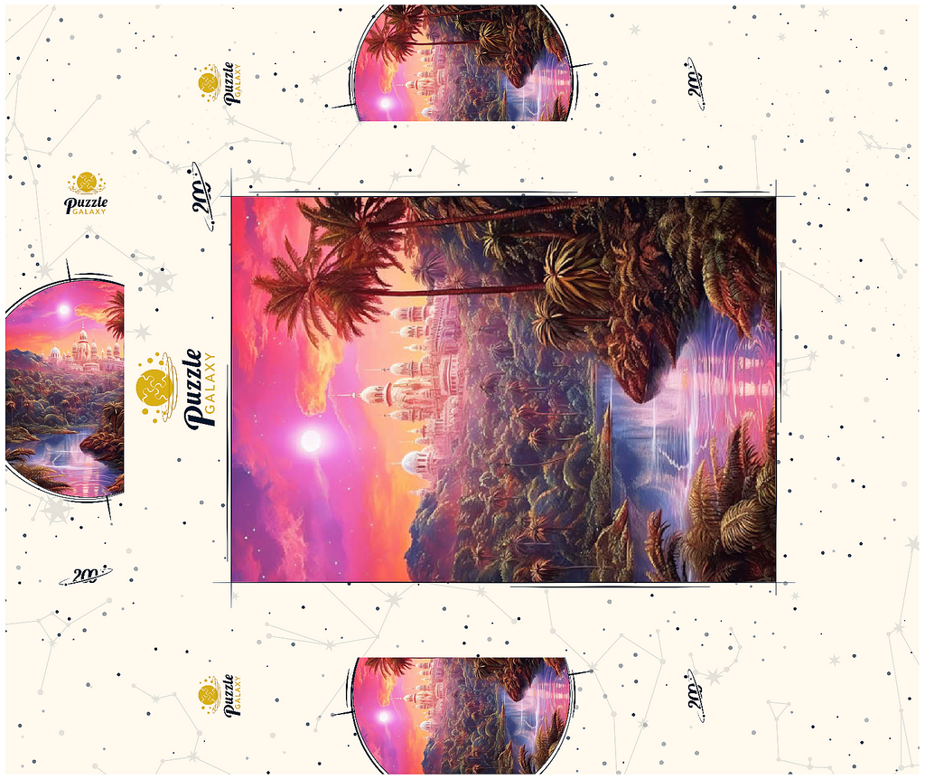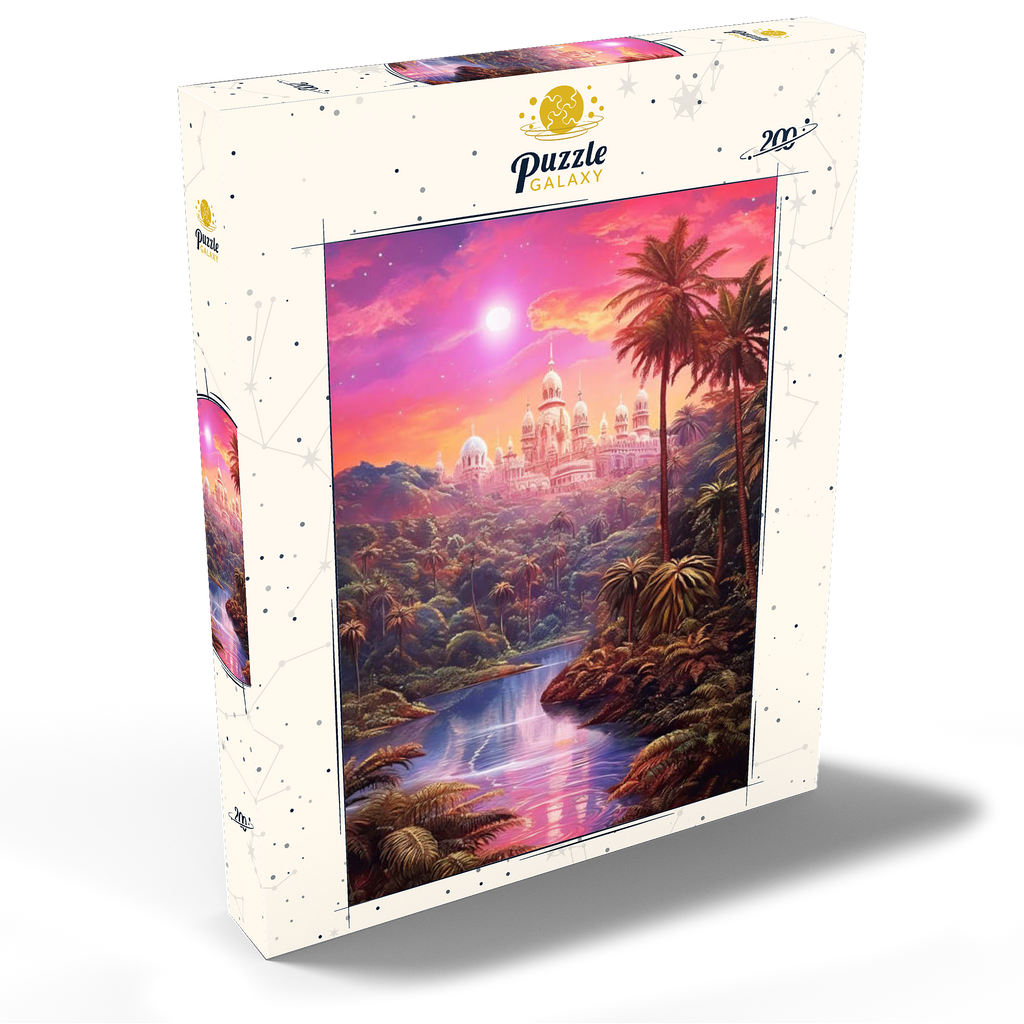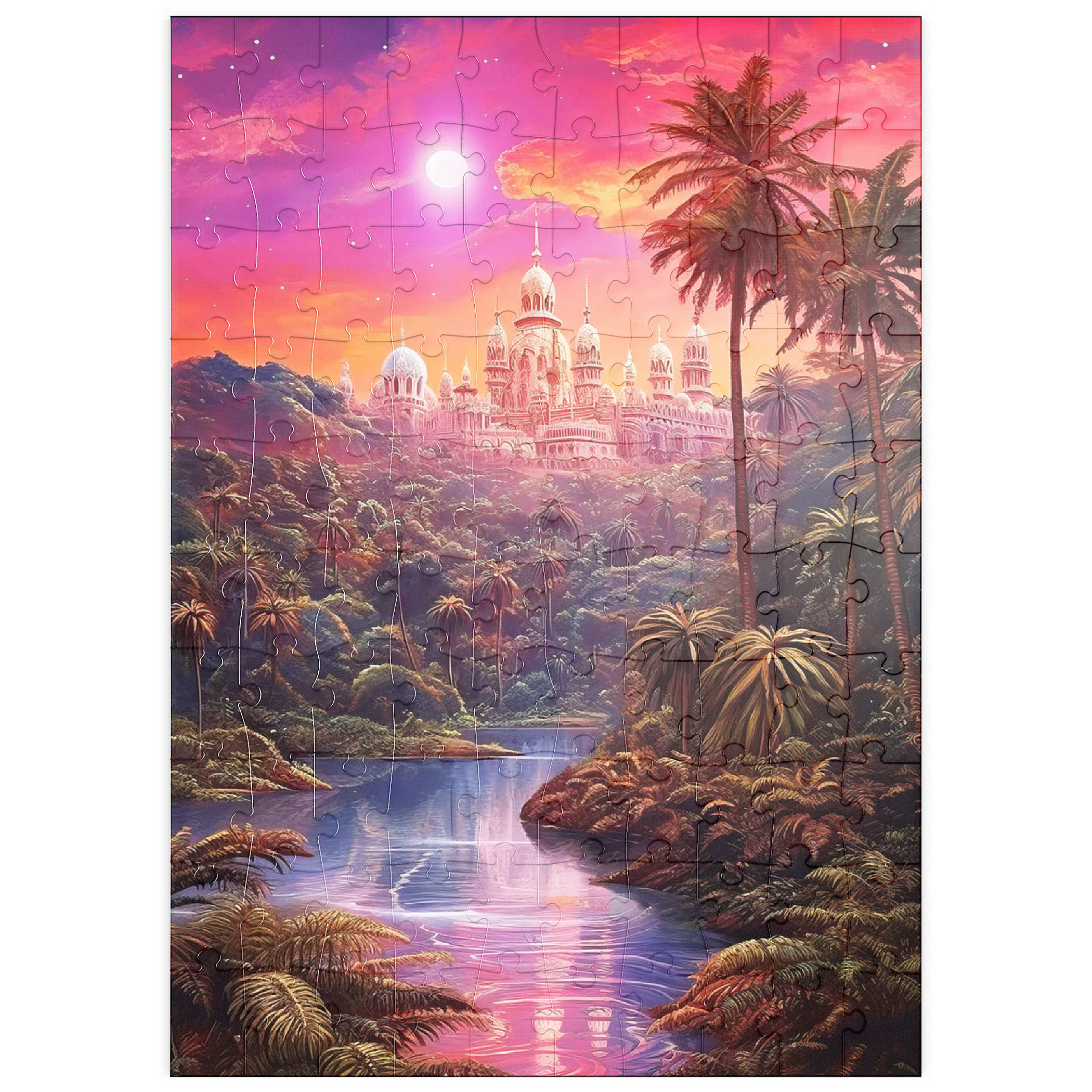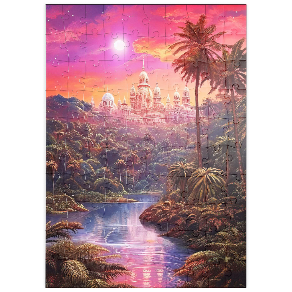 Tauchen Sie ein in eine atemberaubende Fantasieszene mit einem großen Palast, der tief in einem üppigen tropischen Dschungel liegt. Hoch aufragende Palmen und dichtes Grün umgeben das prächtige Bauwerk, dessen verschlungene Kuppeln und Türme im sanften Licht eines mystischen Mondes erstrahlen. Der ruhige Fluss spiegelt die warmen Farben eines traumhaften Sonnenuntergangs wider und schafft eine bezaubernde Atmosphäre, die an ein verlorenes Königreich oder ein mythisches Paradies erinnert. Dieses atemberaubende digitale Kunstwerk ist perfekt für alle, die exotische Architektur, Fantasielandschaften und mystische Welten bewundern. Es weckt ein Gefühl des Staunens, des Abenteuers und des Geheimnisses.