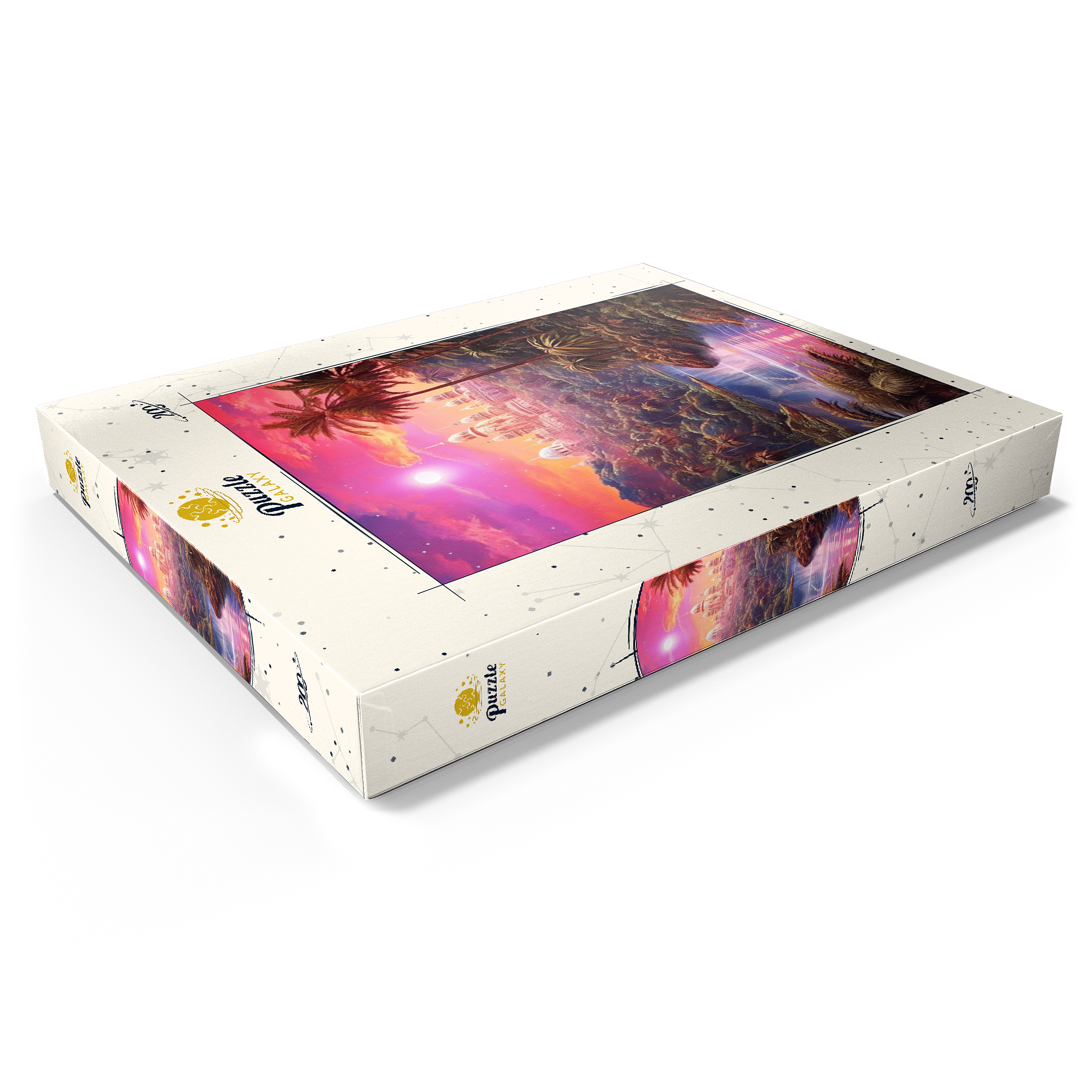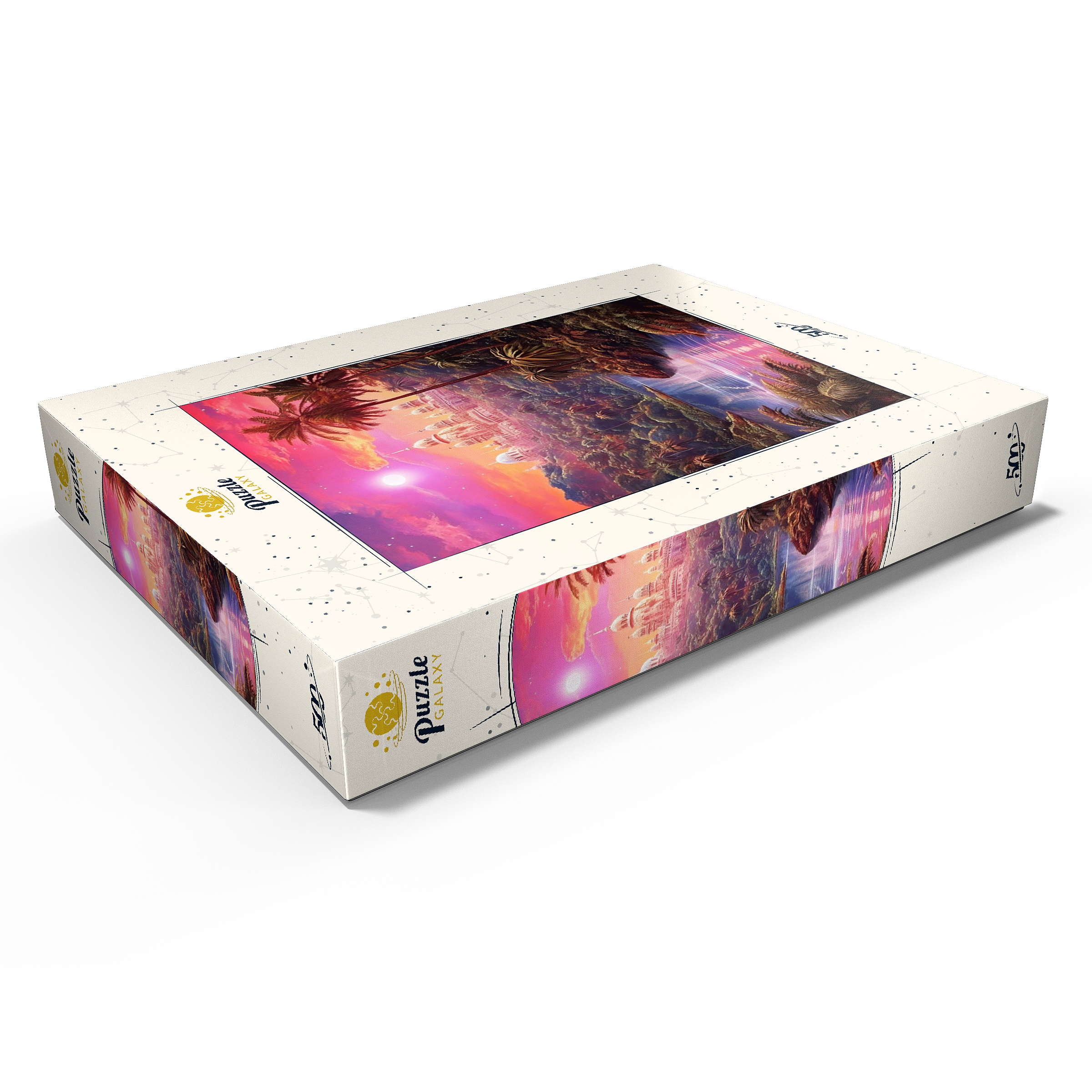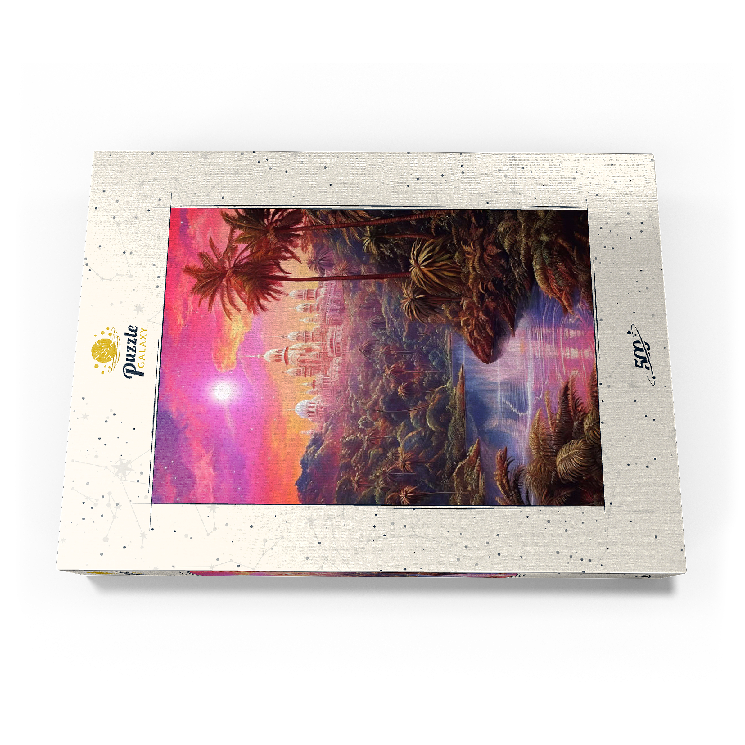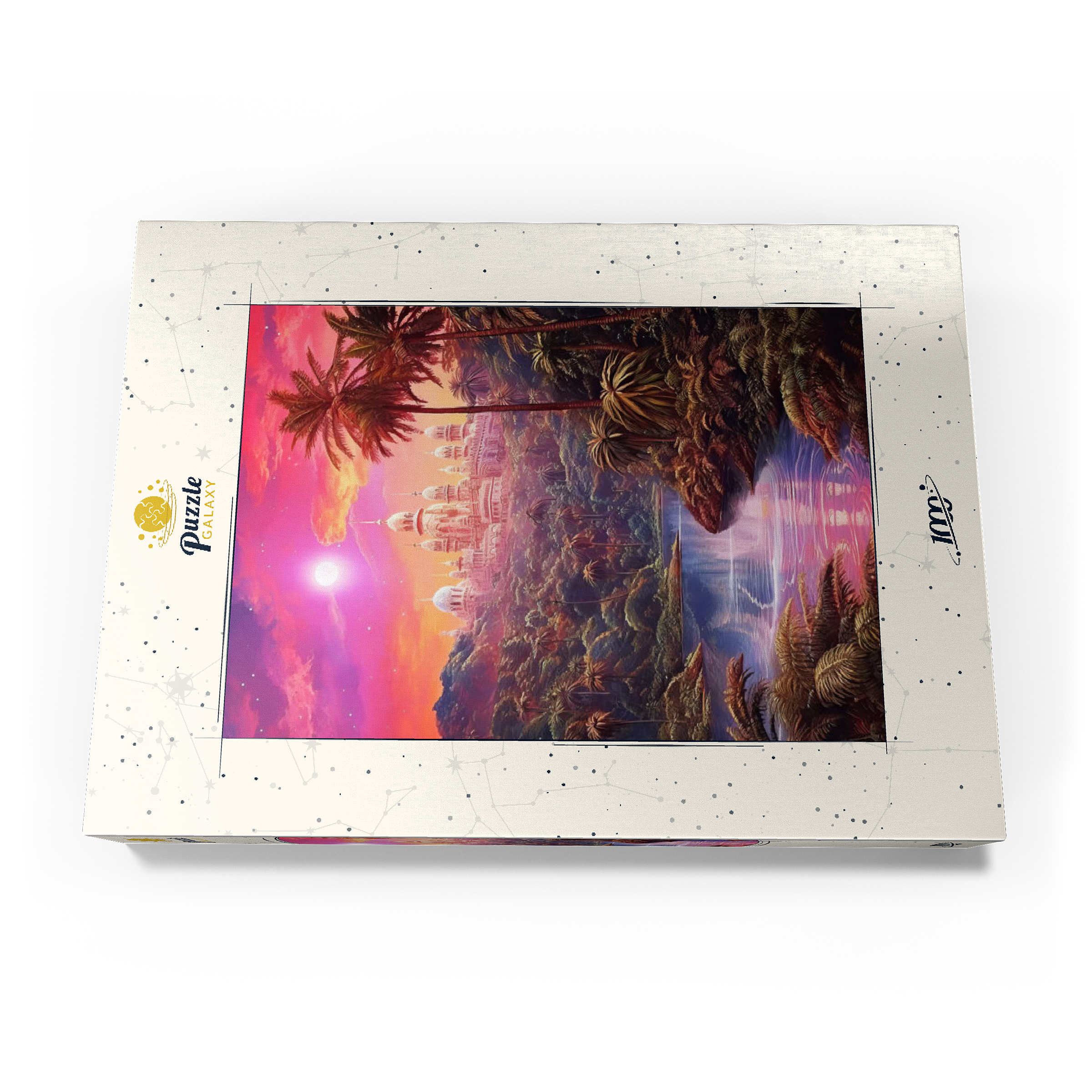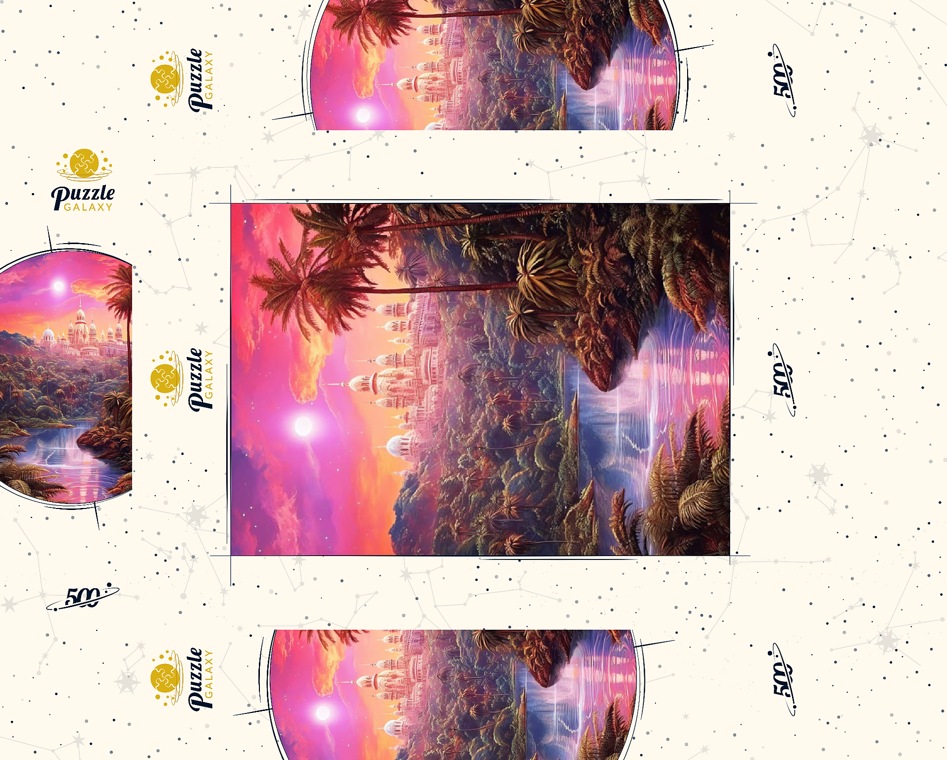 Tauchen Sie ein in eine atemberaubende Fantasieszene mit einem großen Palast, der tief in einem üppigen tropischen Dschungel liegt. Hoch aufragende Palmen und dichtes Grün umgeben das prächtige Bauwerk, dessen verschlungene Kuppeln und Türme im sanften Licht eines mystischen Mondes erstrahlen. Der ruhige Fluss spiegelt die warmen Farben eines traumhaften Sonnenuntergangs wider und schafft eine bezaubernde Atmosphäre, die an ein verlorenes Königreich oder ein mythisches Paradies erinnert. Dieses atemberaubende digitale Kunstwerk ist perfekt für alle, die exotische Architektur, Fantasielandschaften und mystische Welten bewundern. Es weckt ein Gefühl des Staunens, des Abenteuers und des Geheimnisses.